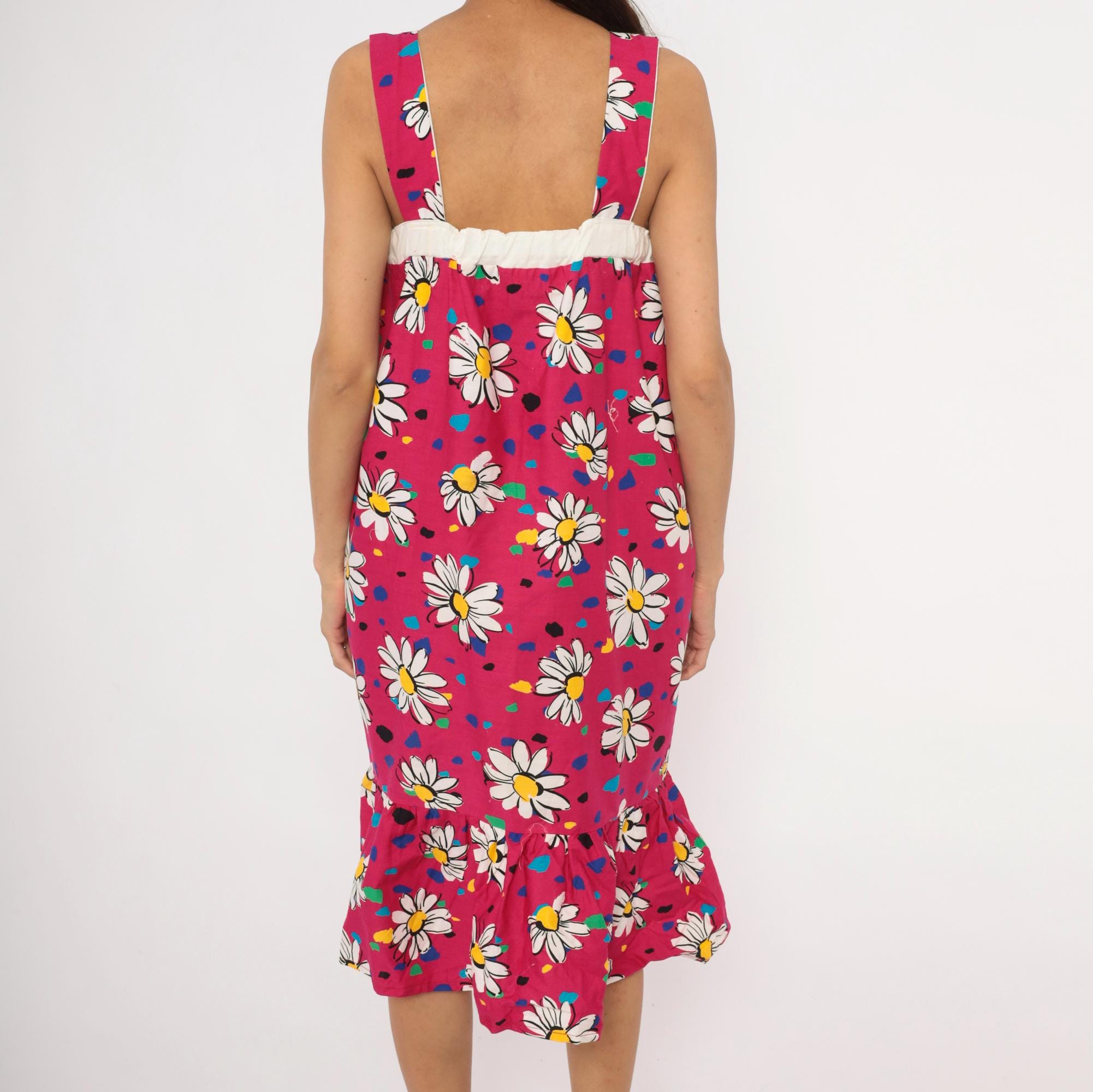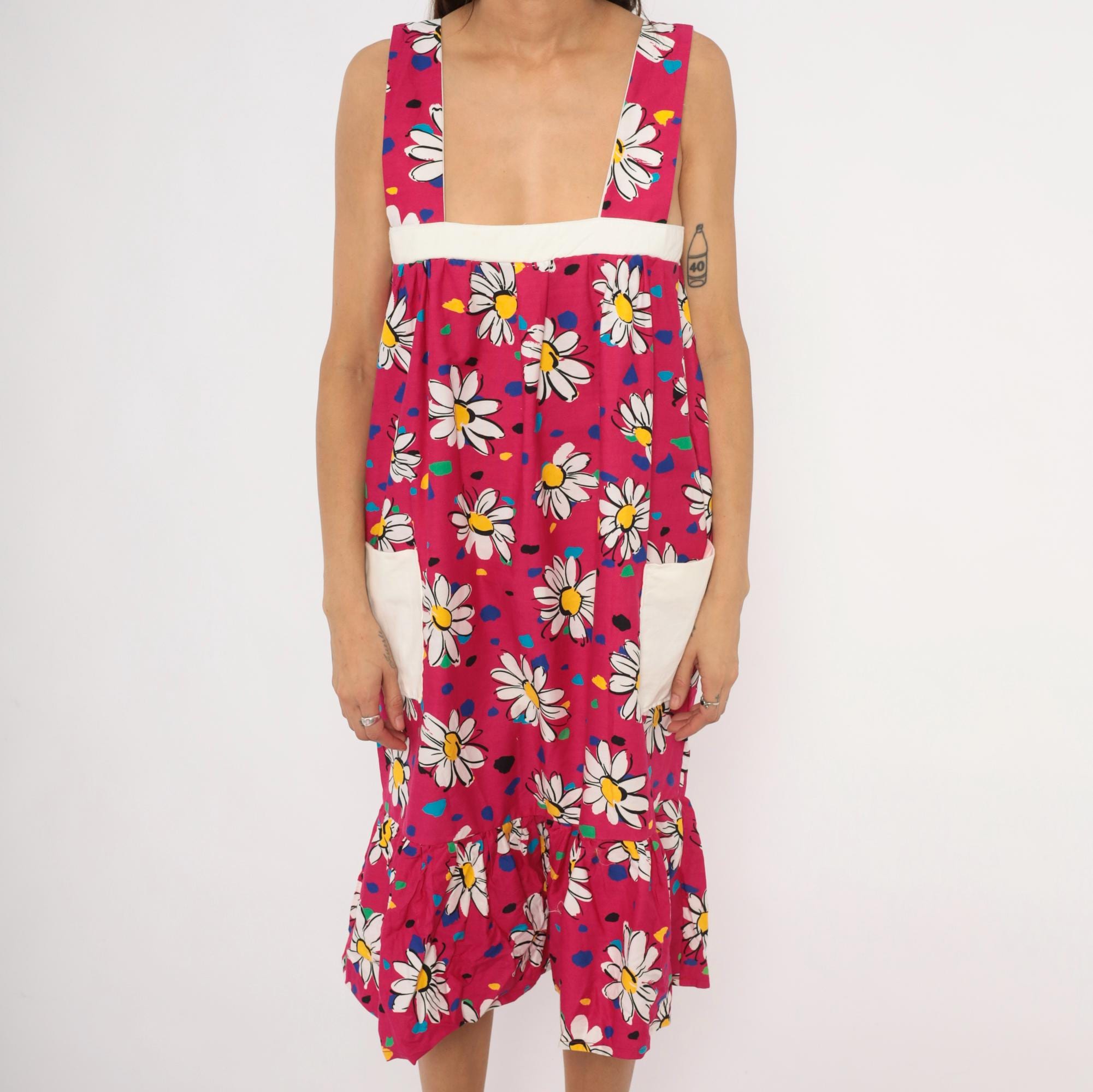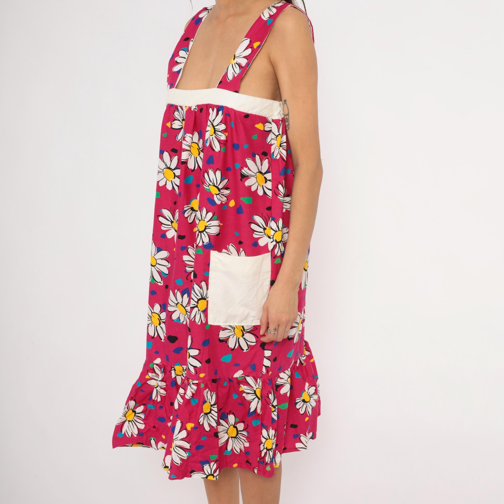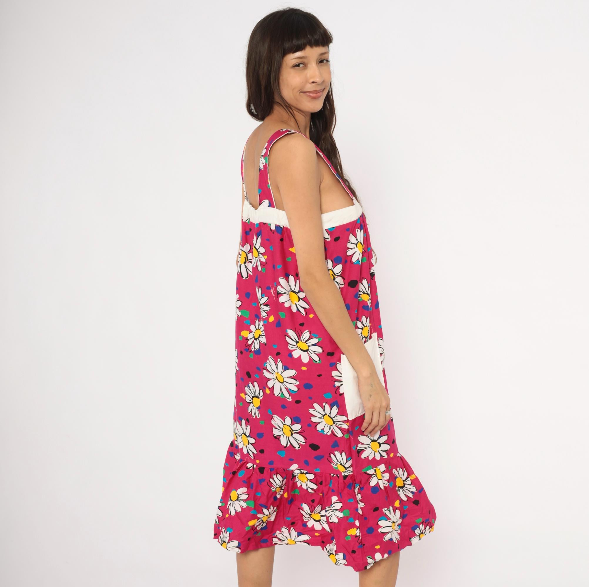 90s fuchsia sundress with a scattered white daisy print accented by multicolor confetti-like spots in blue, teal, green, yellow, and black. Wide square neckline with thick shoulder straps, white contrast band at the empire bust, and gathered body below. Two white front patch pockets sit at the hips, and a gathered ruffle tier runs along the bottom hem. Pullover construction with no closures.