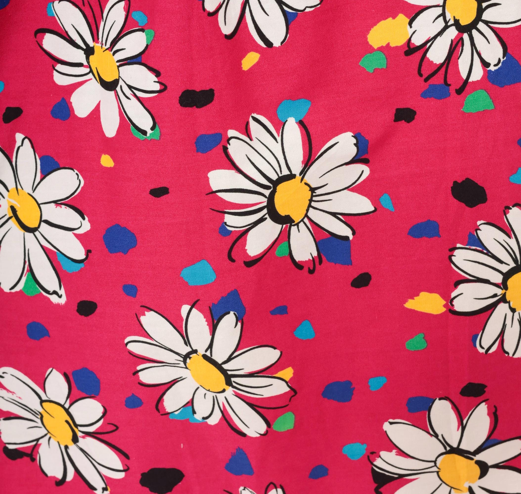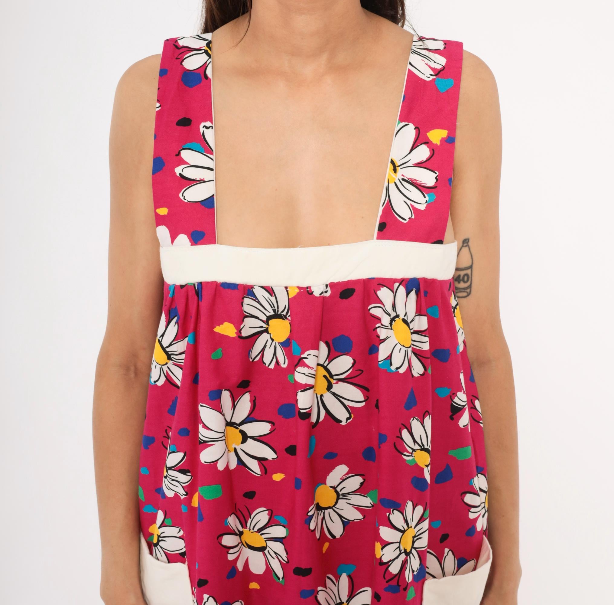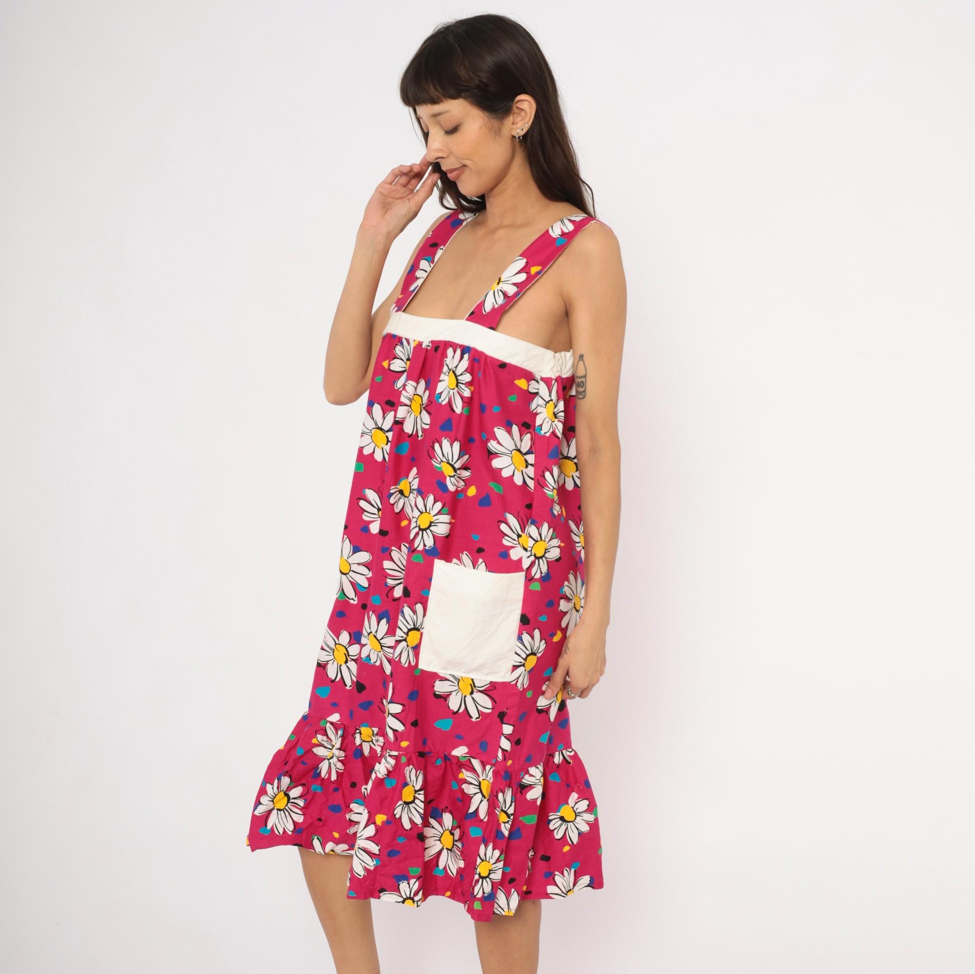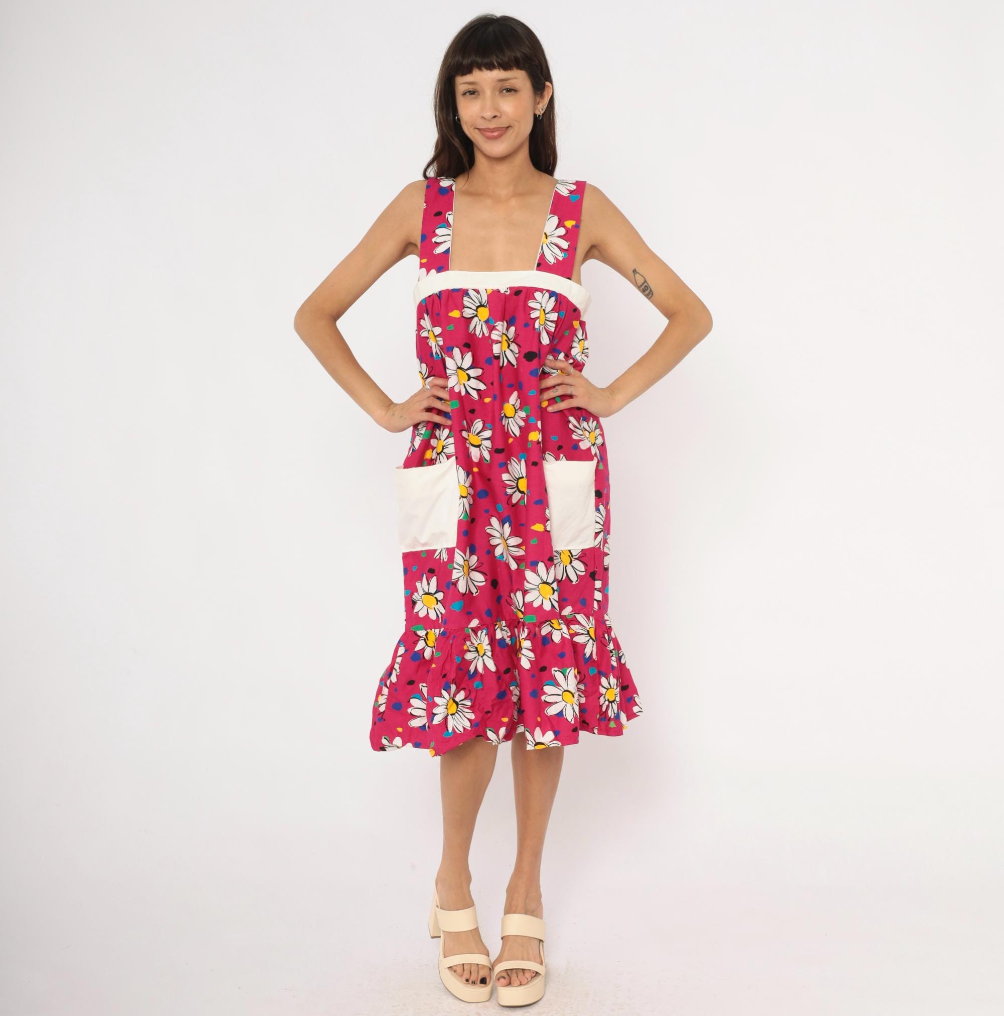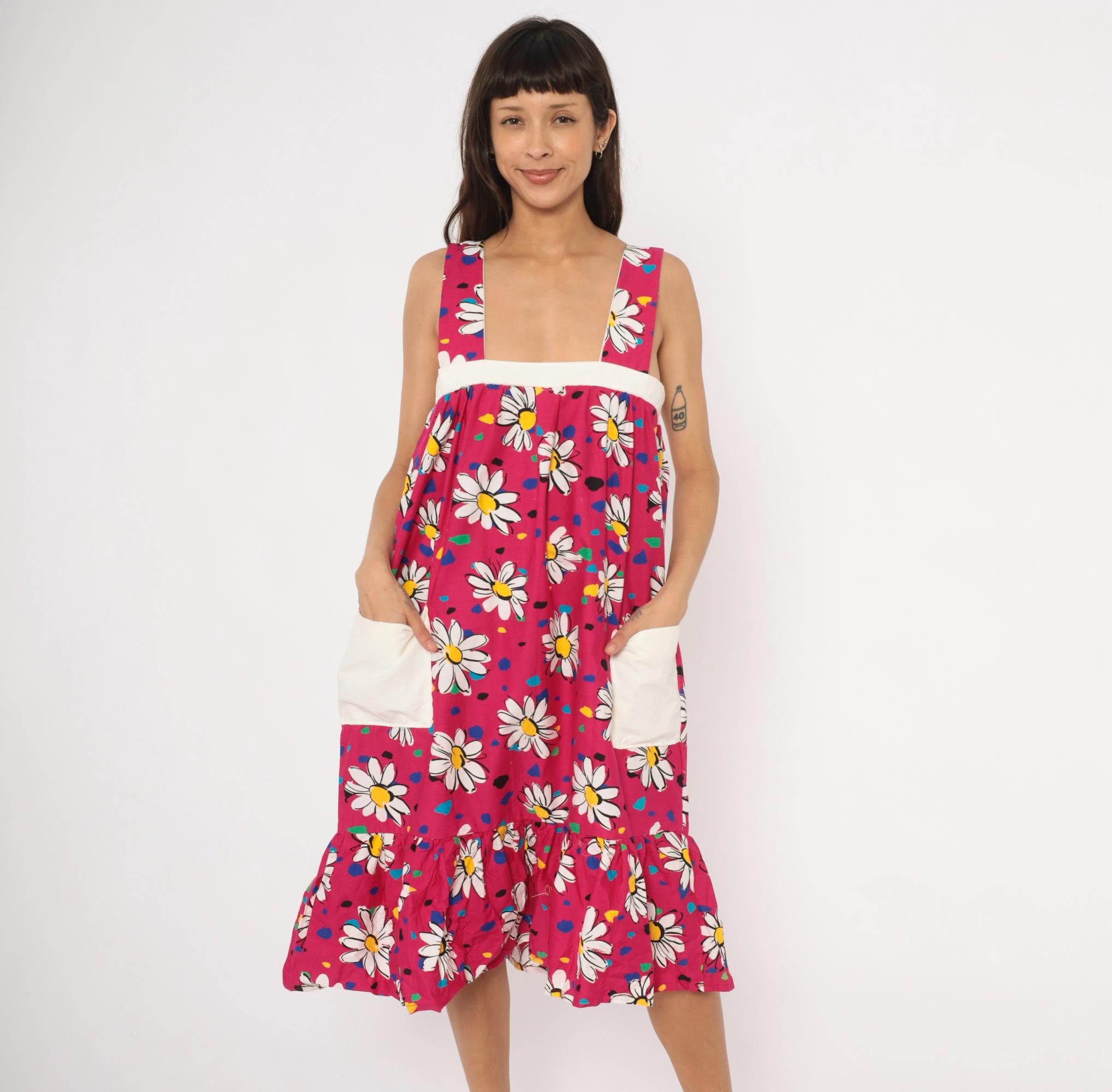 90s fuchsia sundress with a scattered white daisy print accented by multicolor confetti-like spots in blue, teal, green, yellow, and black. Wide square neckline with thick shoulder straps, white contrast band at the empire bust, and gathered body below. Two white front patch pockets sit at the hips, and a gathered ruffle tier runs along the bottom hem. Pullover construction with no closures.