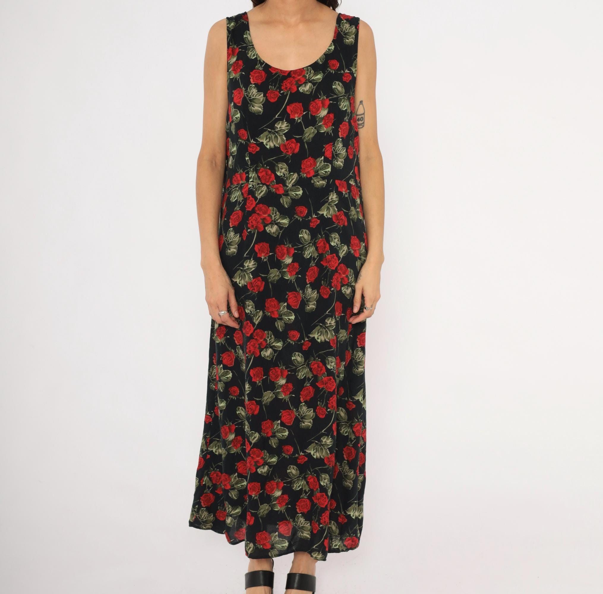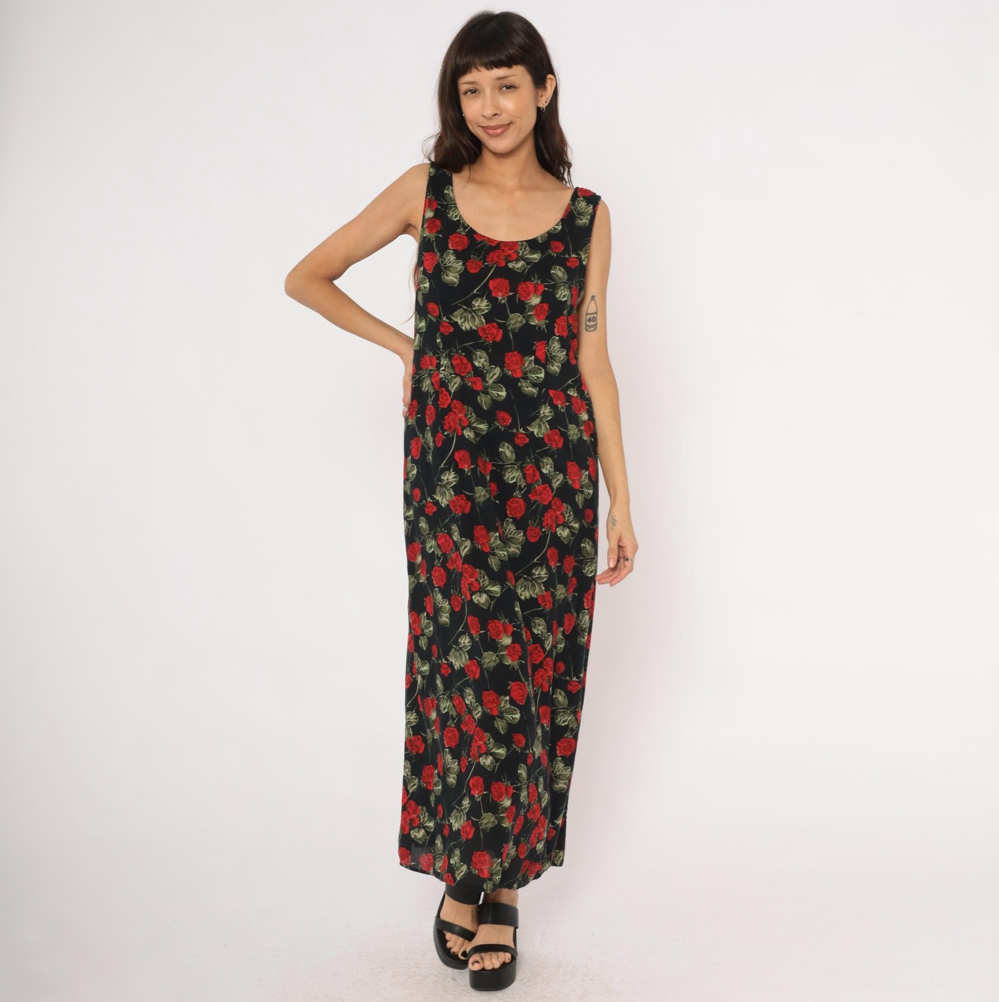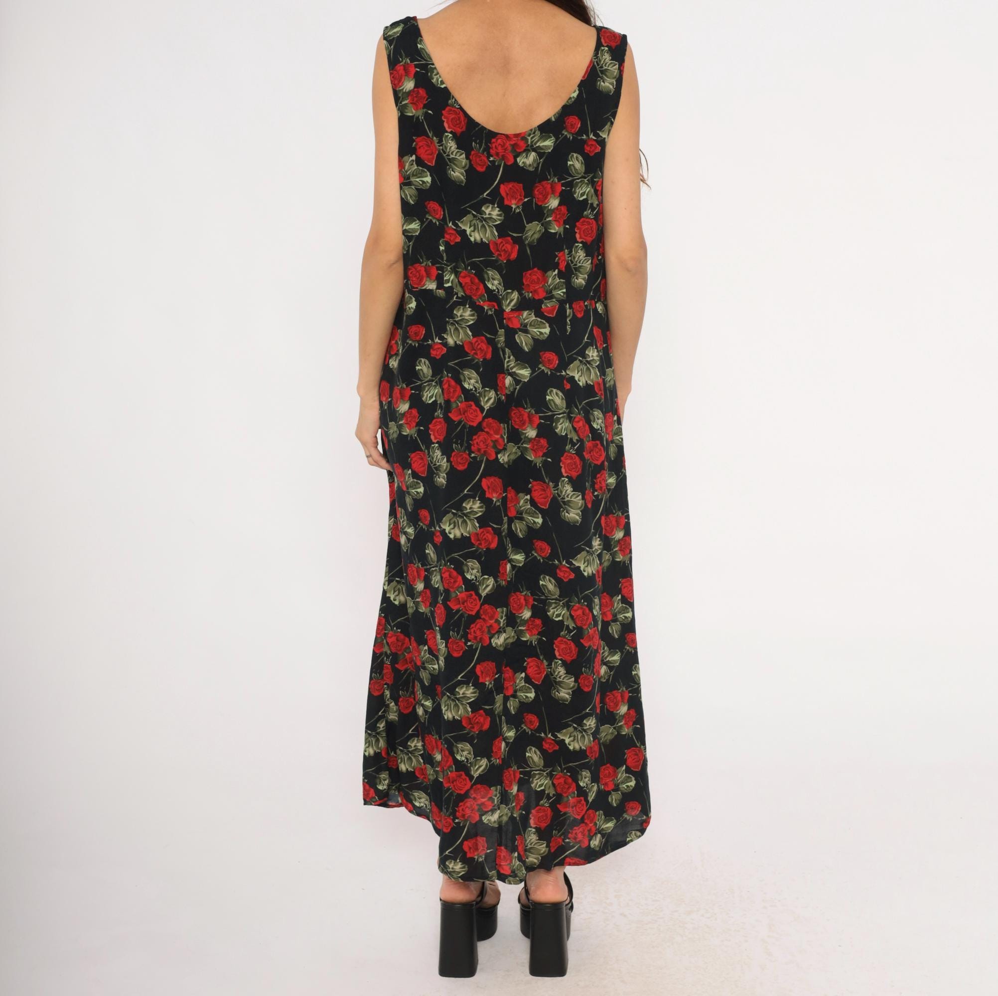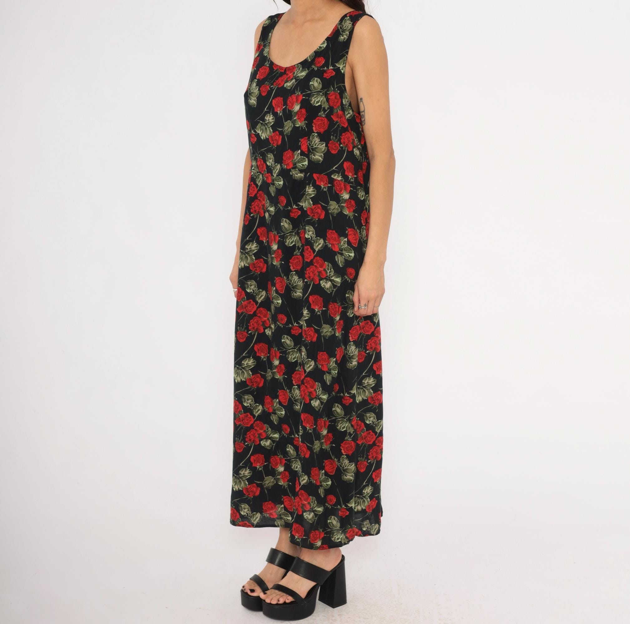 90s black maxi dress with an allover red rose and green leaf print on a dark background. Sleeveless tank silhouette with a scoop neckline on both the front and back, pullover style with no closure. A-line body that widens gradually from the bust to the ankle-length hem.