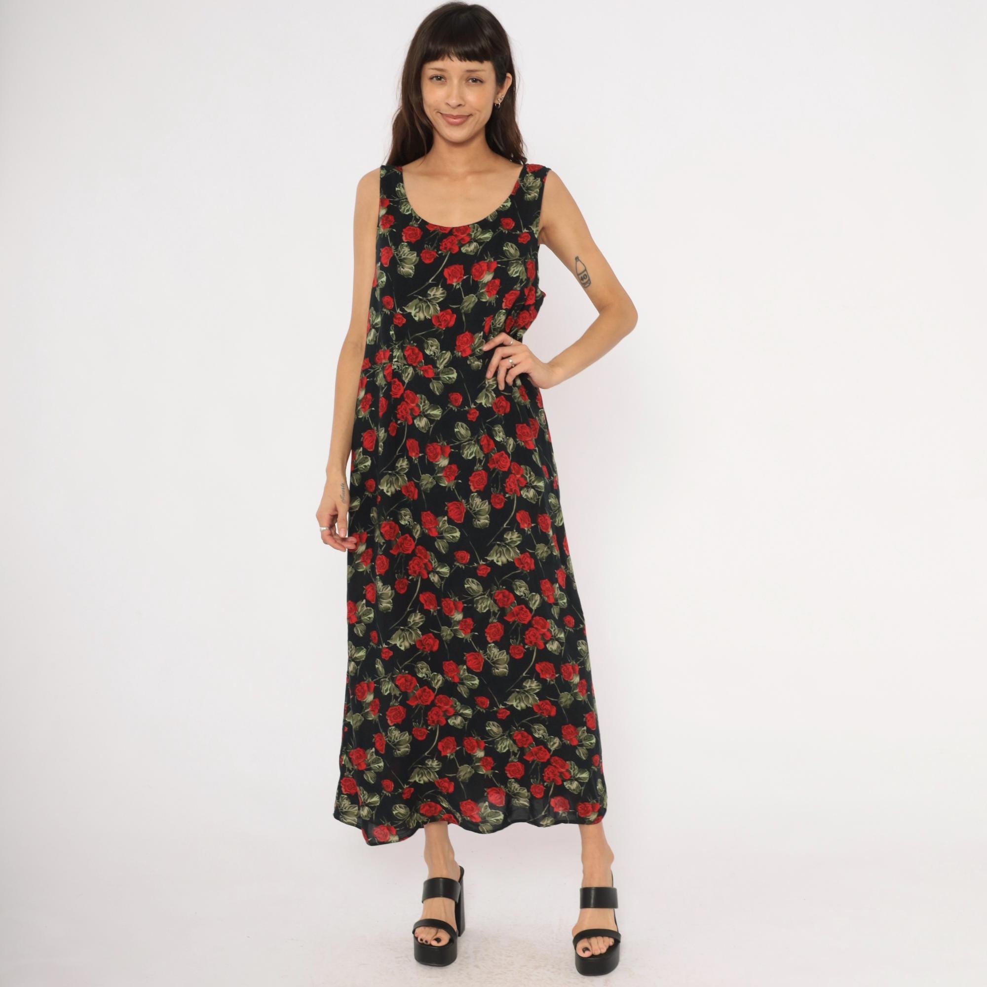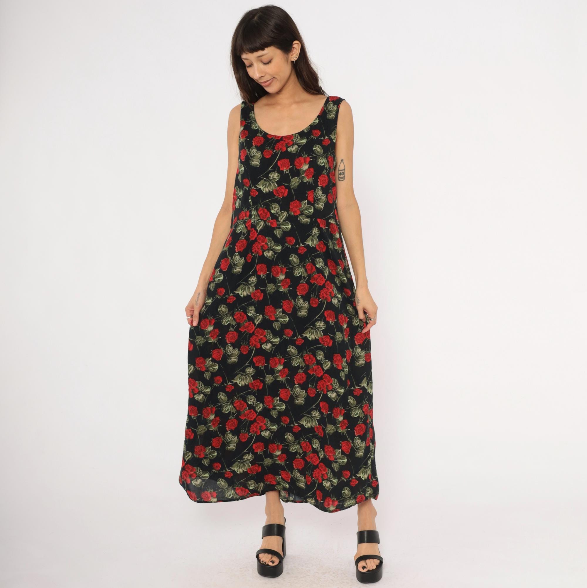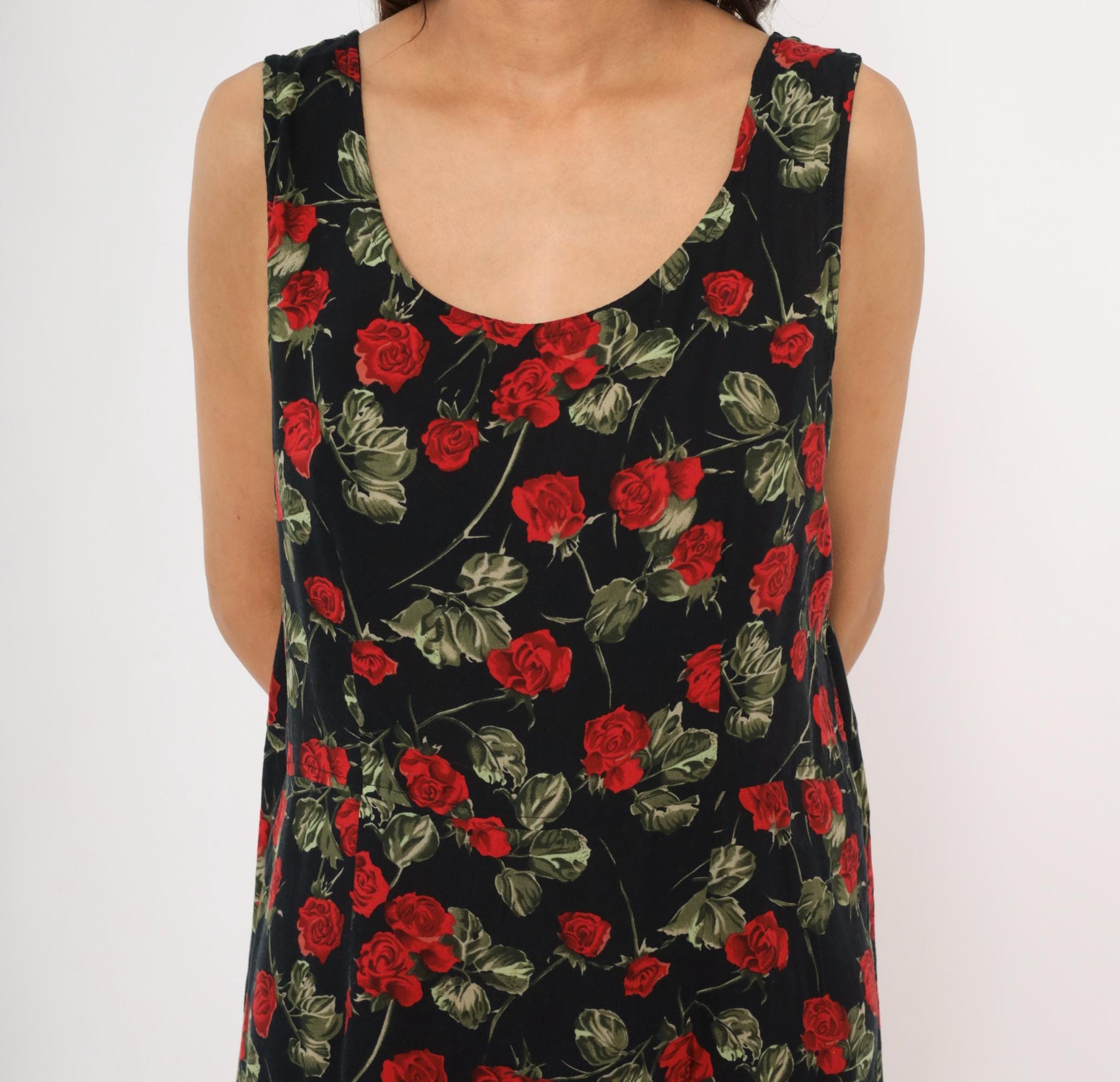 90s black maxi dress with an allover red rose and green leaf print on a dark background. Sleeveless tank silhouette with a scoop neckline on both the front and back, pullover style with no closure. A-line body that widens gradually from the bust to the ankle-length hem.