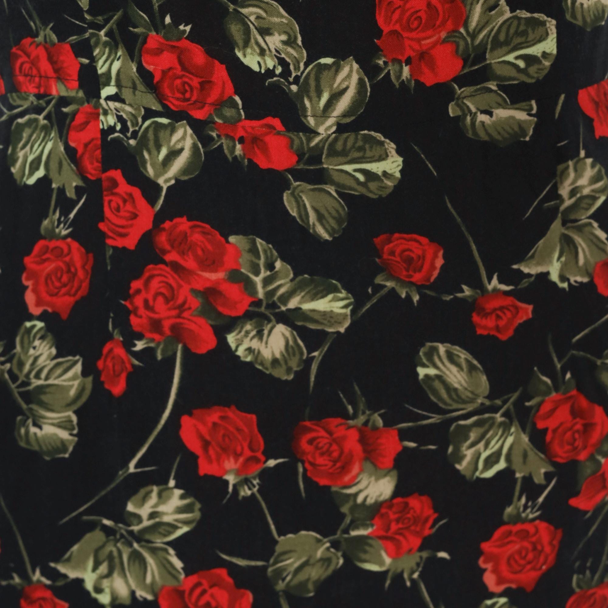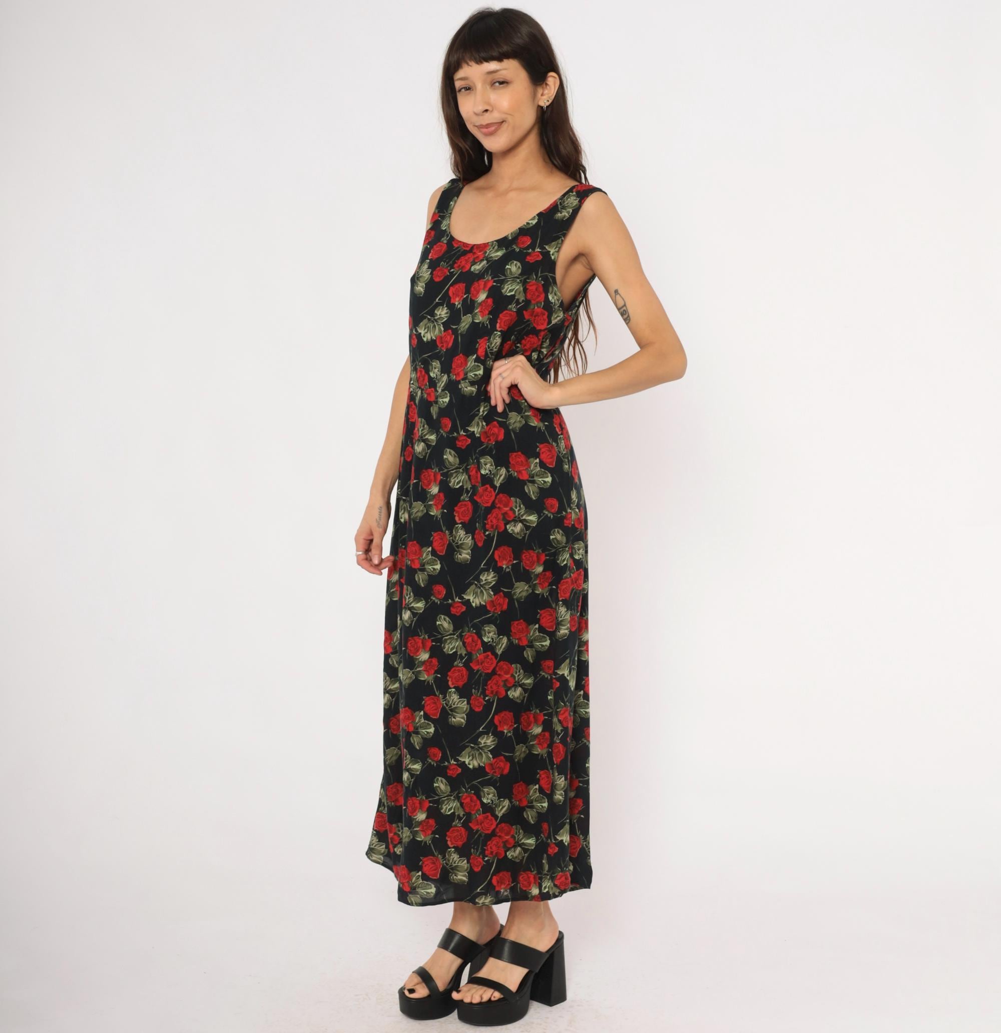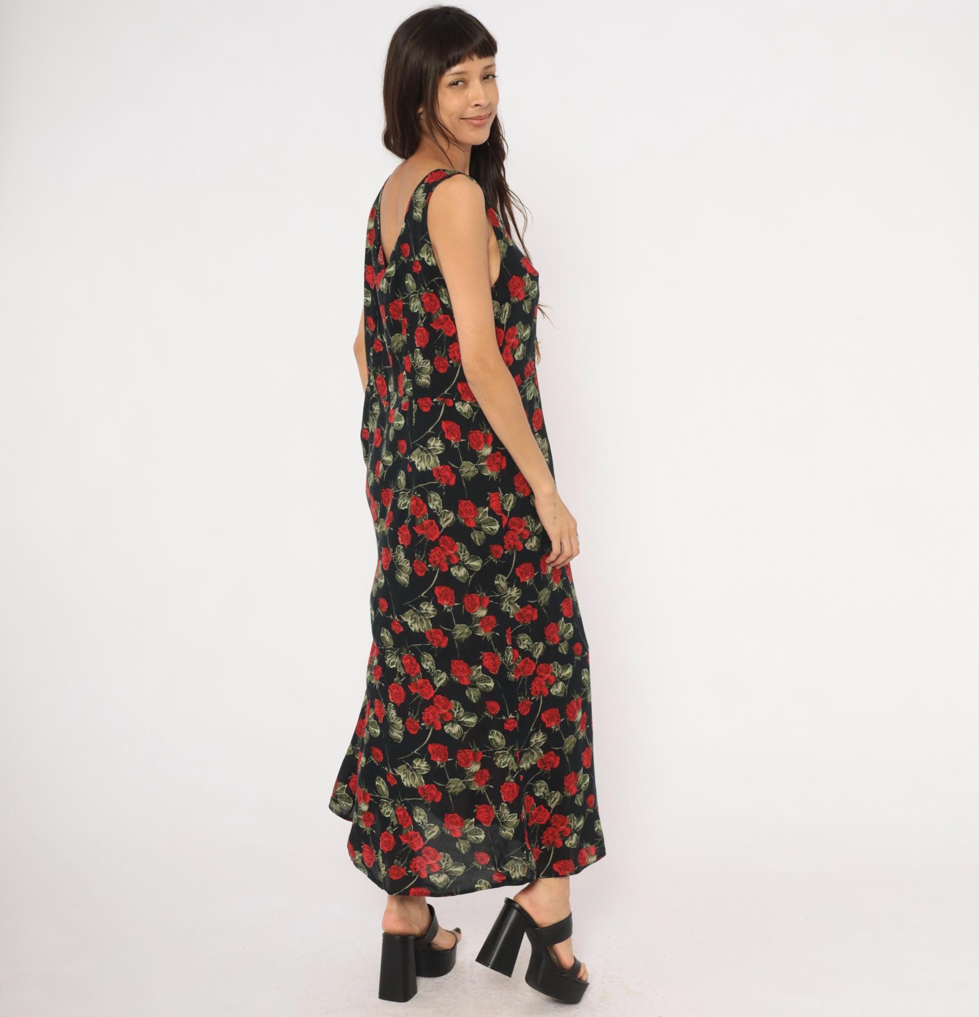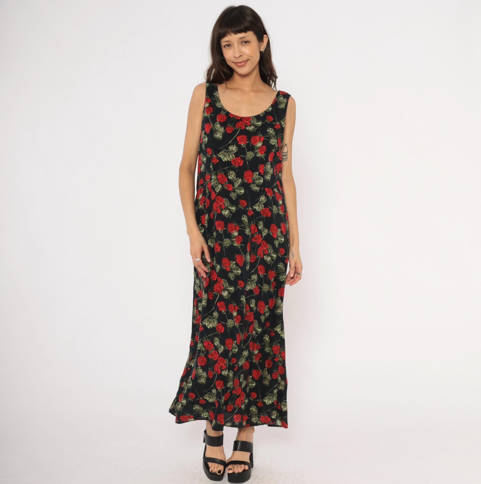 90s black maxi dress with an allover red rose and green leaf print on a dark background. Sleeveless tank silhouette with a scoop neckline on both the front and back, pullover style with no closure. A-line body that widens gradually from the bust to the ankle-length hem.