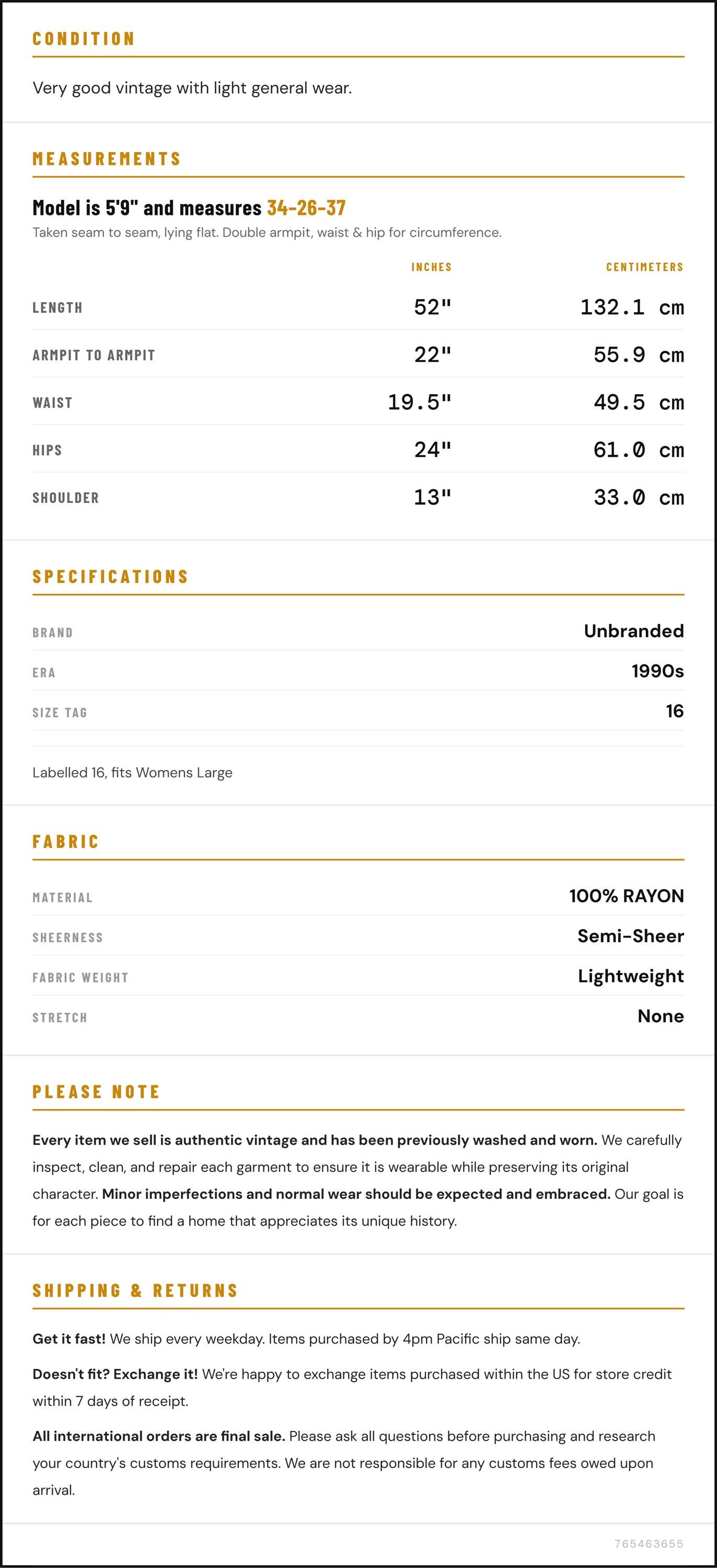 Taken from seam to seam while the garment is lying flat. Double the armpit, waist, and hip measurements.