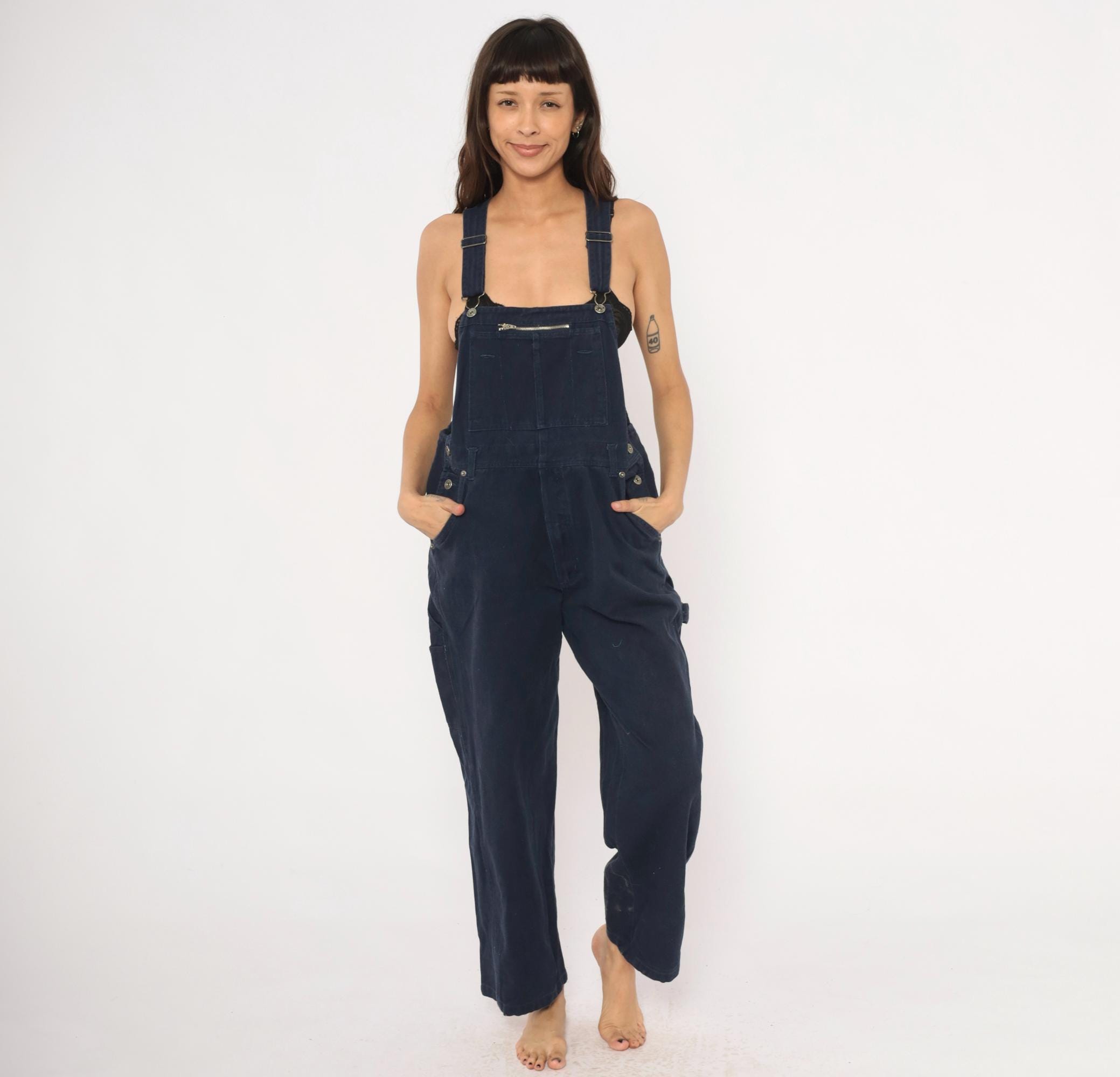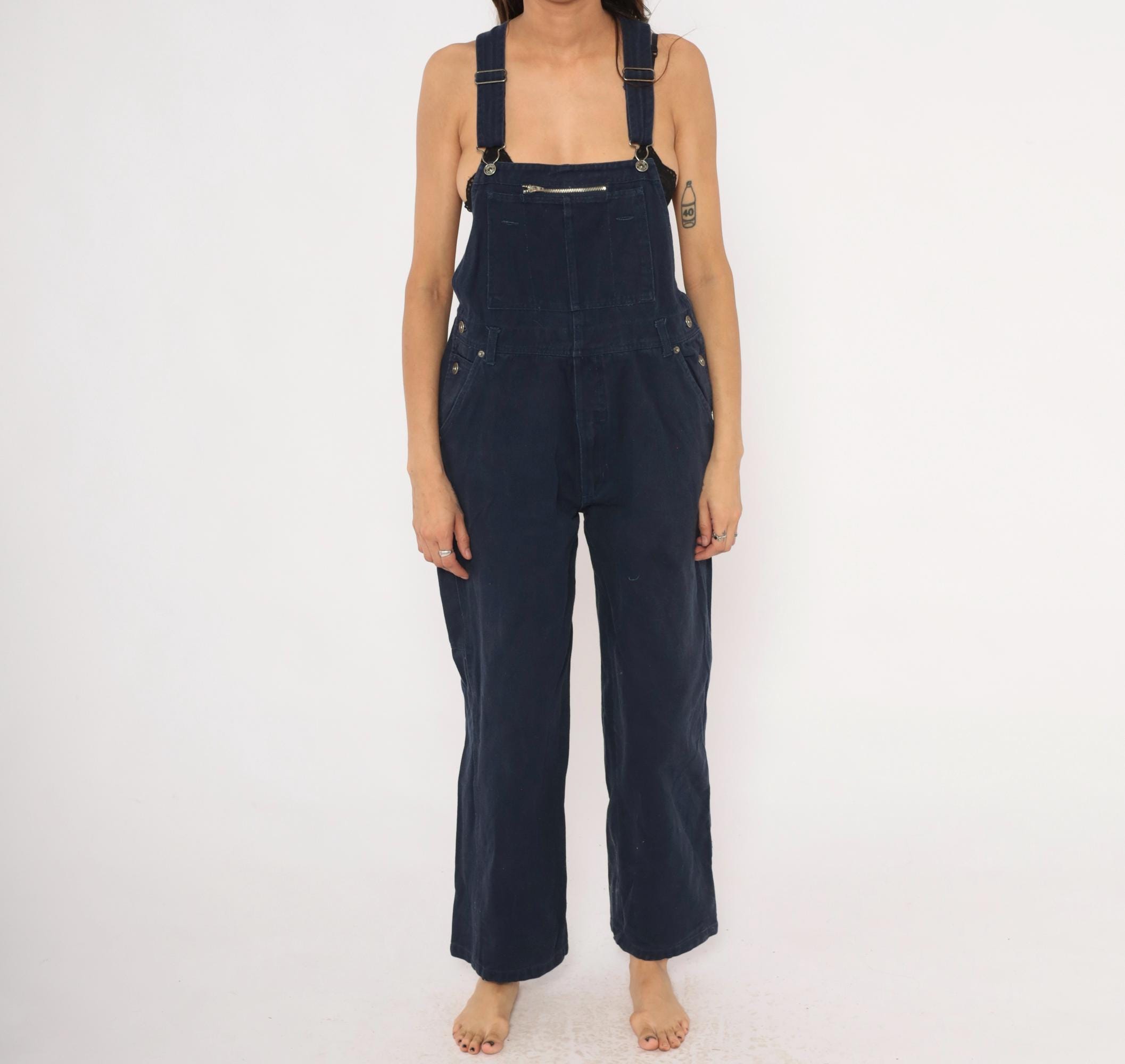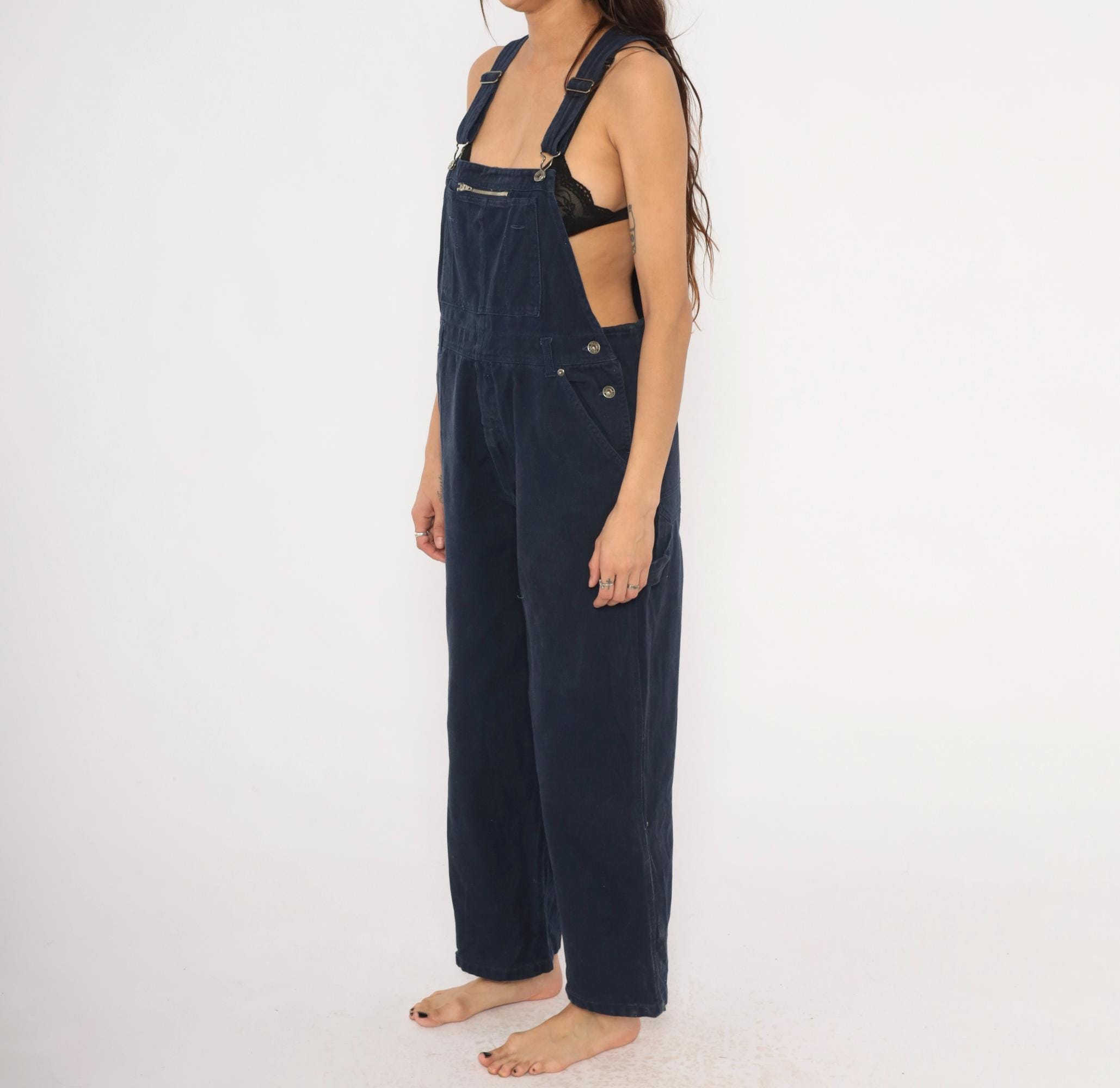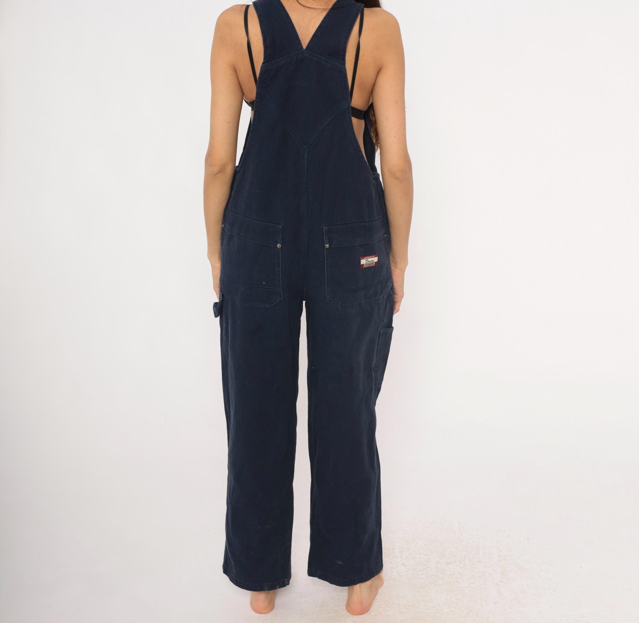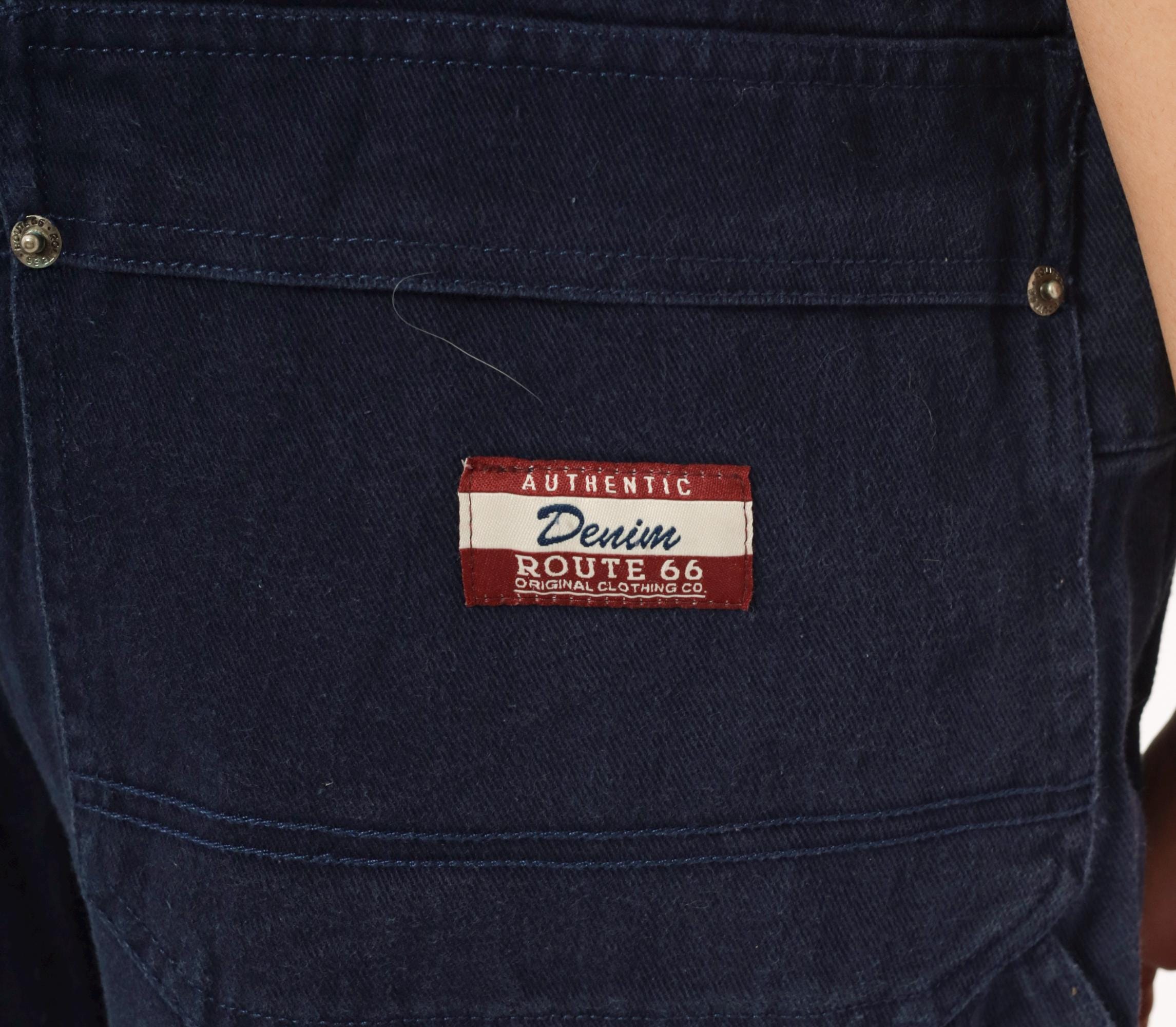 Dark navy denim bib overalls from Route 66 Original Clothing Co., circa 2000s. Adjustable shoulder straps with metal slider buckles, zippered chest pocket, and side button closures at the waist. Two back pockets with snap closures, side seam hip pockets, and carpenter-style leg pockets. Wide straight legs with a cropped ankle-length inseam, crossback strap design.