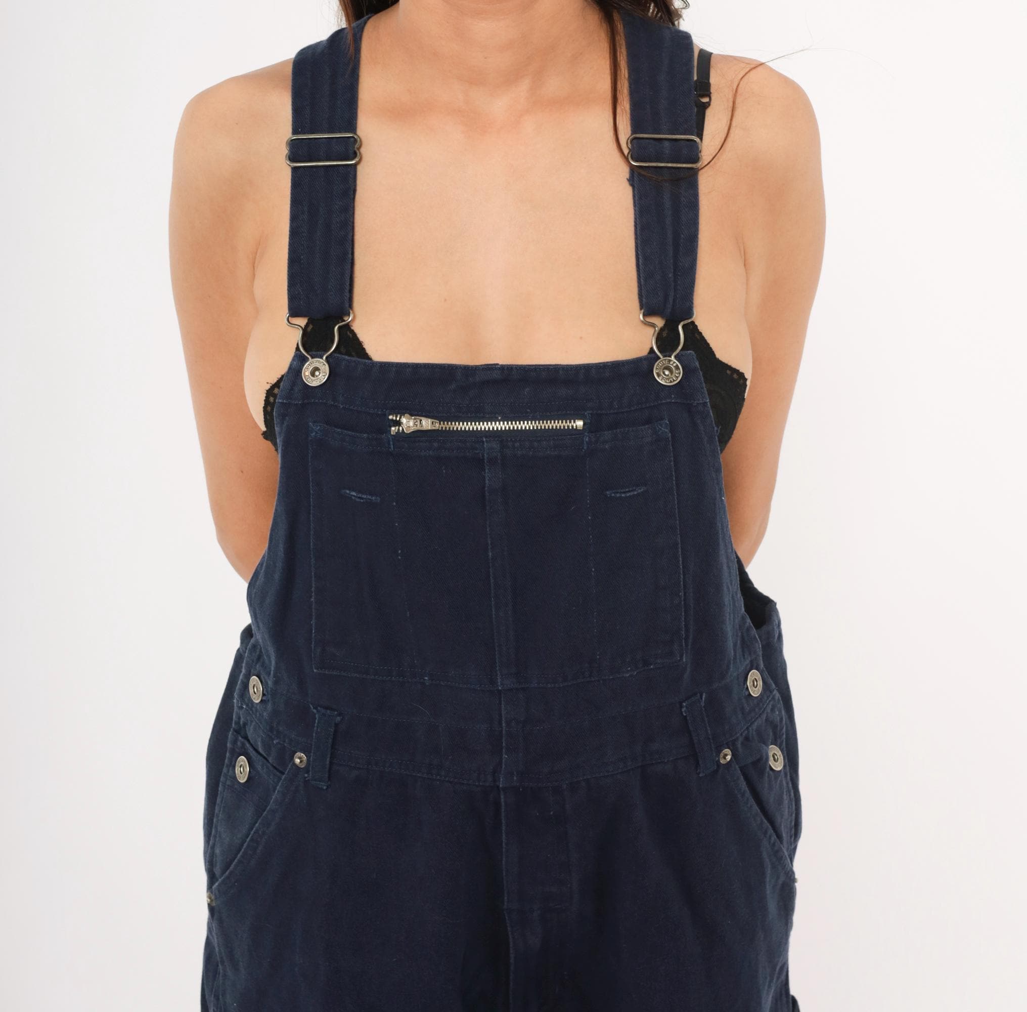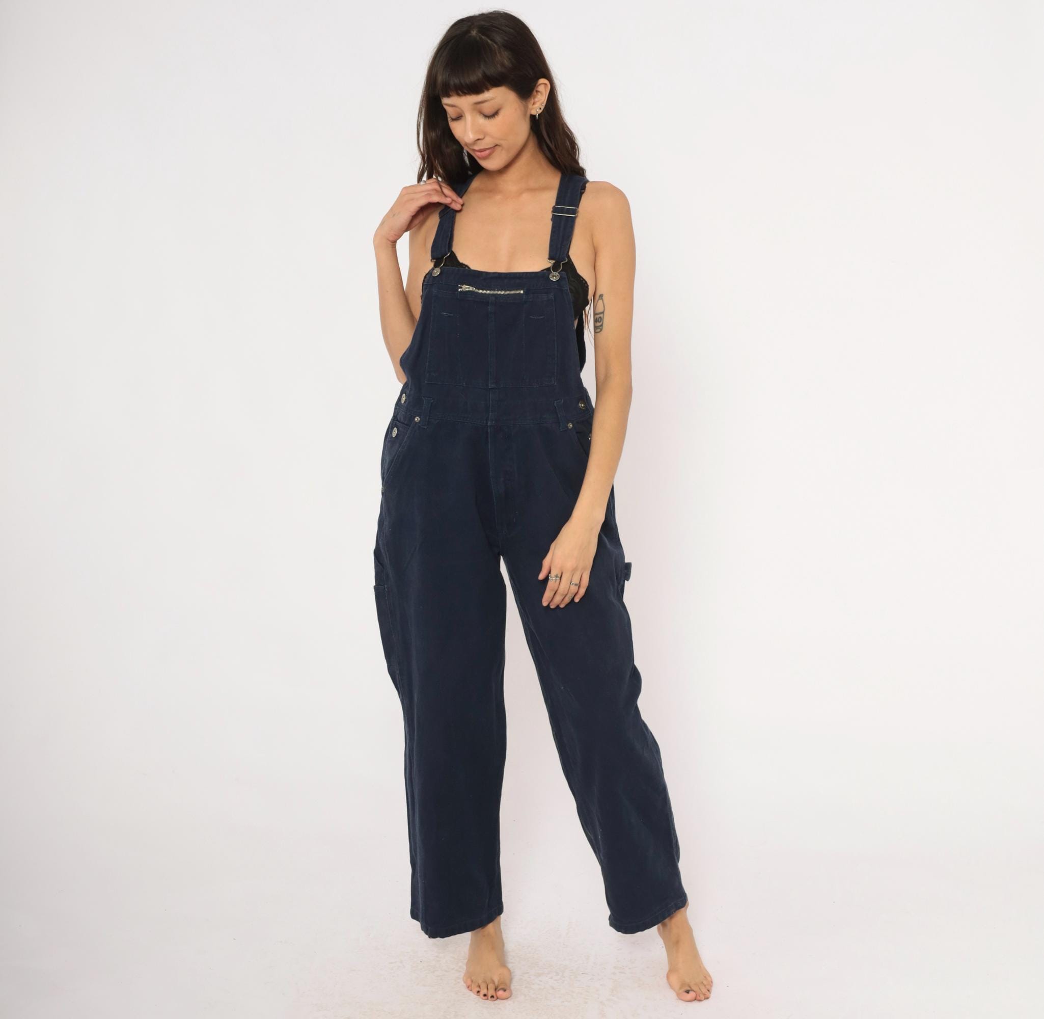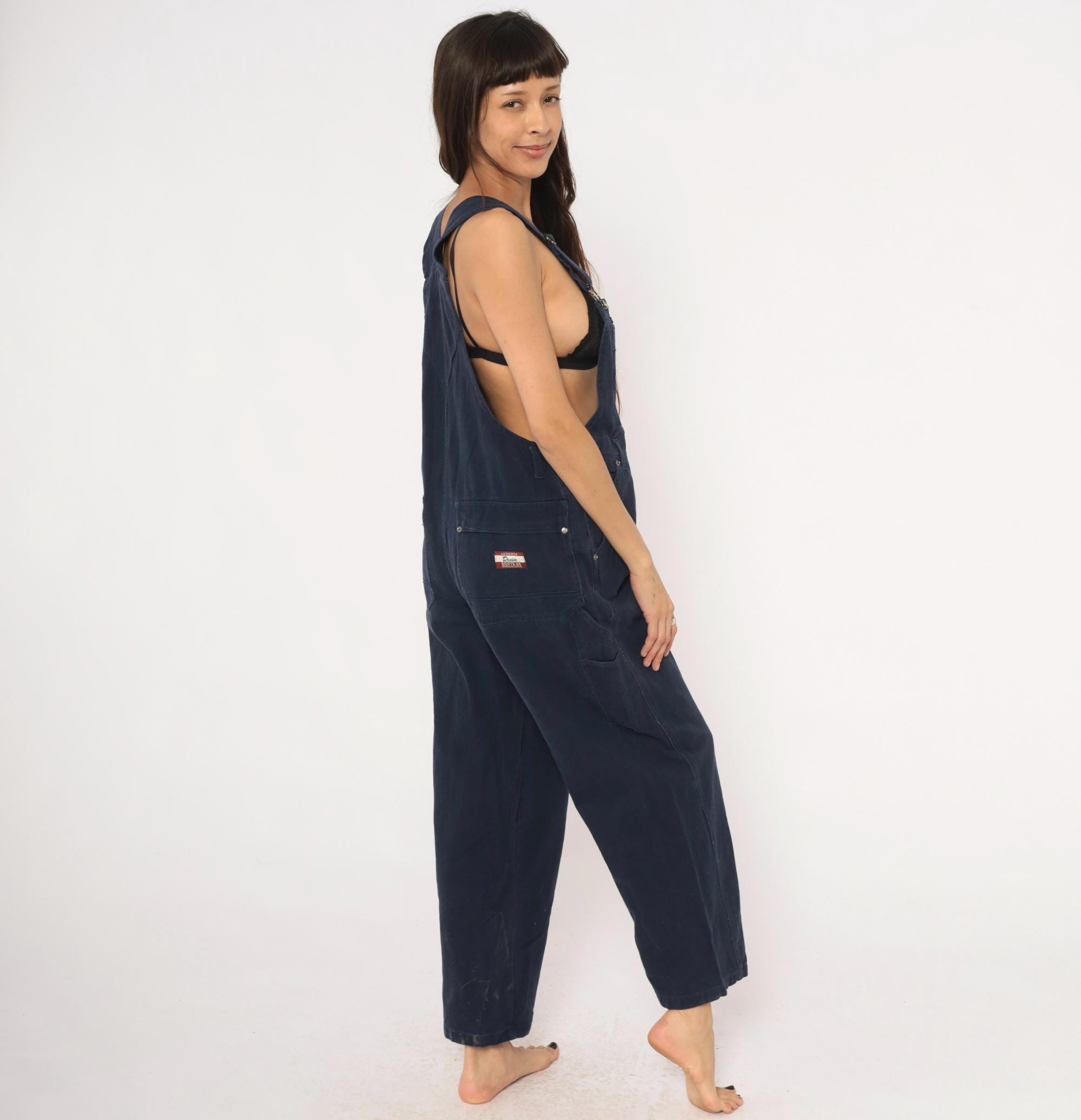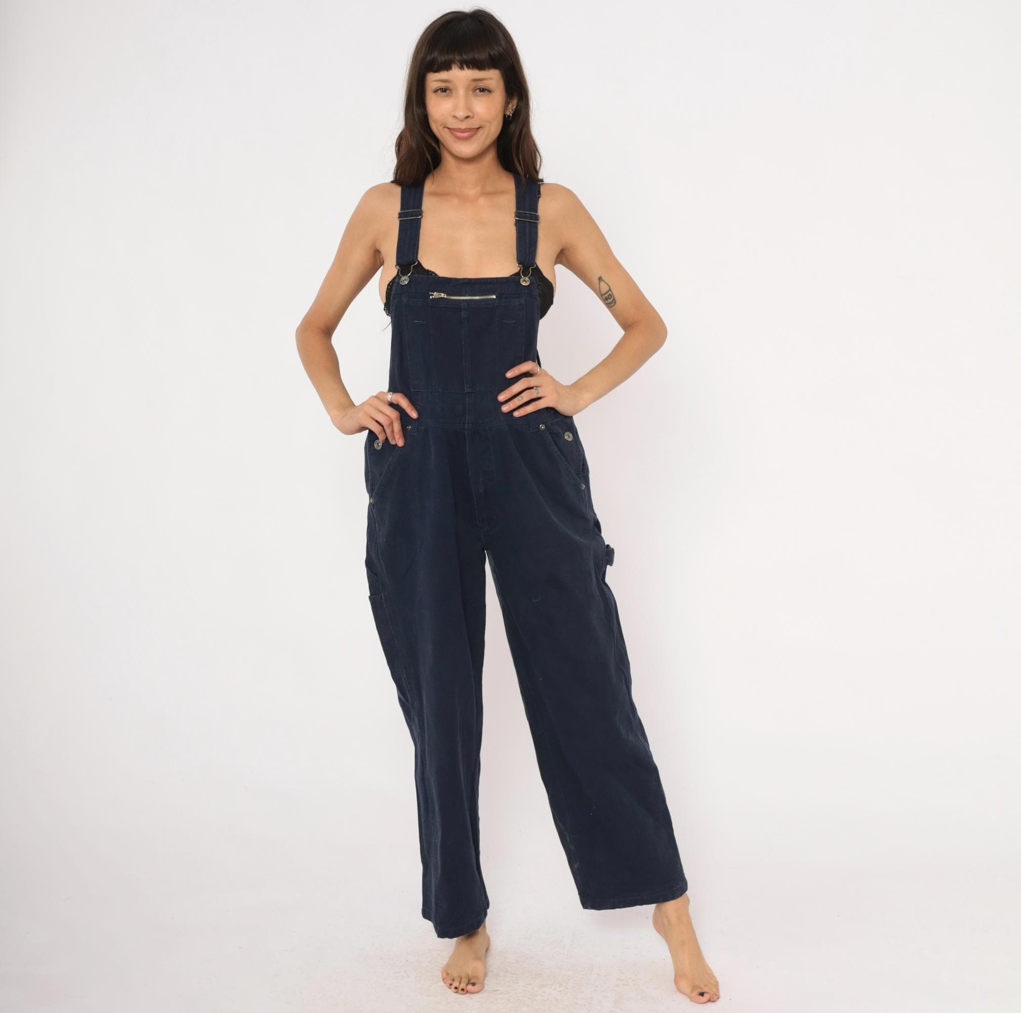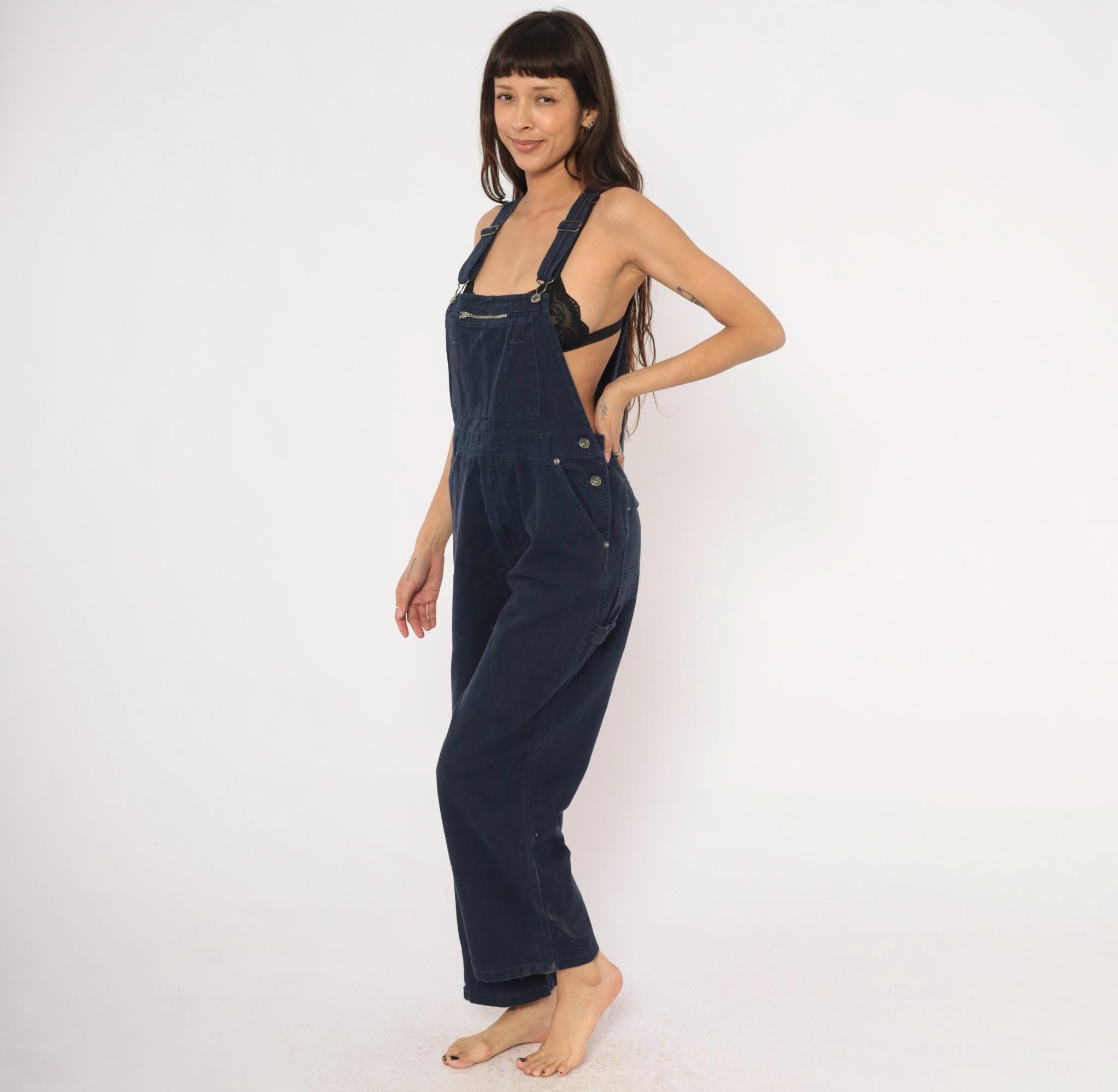 Dark navy denim bib overalls from Route 66 Original Clothing Co., circa 2000s. Adjustable shoulder straps with metal slider buckles, zippered chest pocket, and side button closures at the waist. Two back pockets with snap closures, side seam hip pockets, and carpenter-style leg pockets. Wide straight legs with a cropped ankle-length inseam, crossback strap design.
