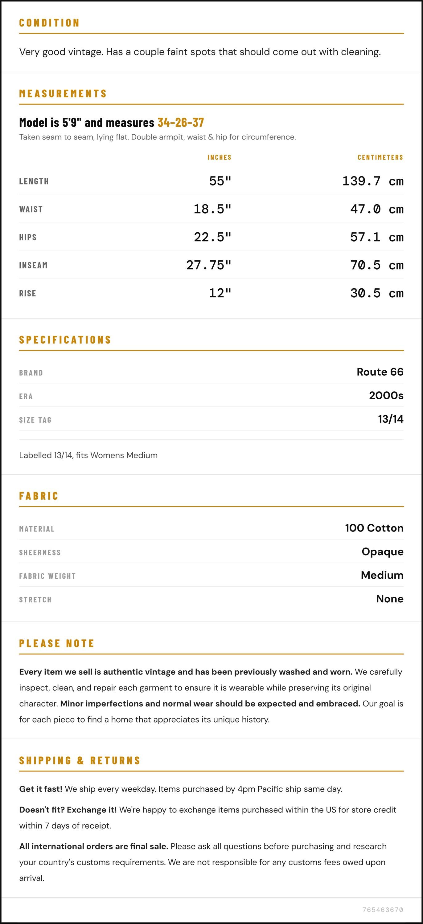 Vintage denim was usually made without any stretch, unlike modern jeans. Check the measurements to ensure proper fit, and remember to give yourself a little wiggle room in the waist and hips, depending on your preferred fit.