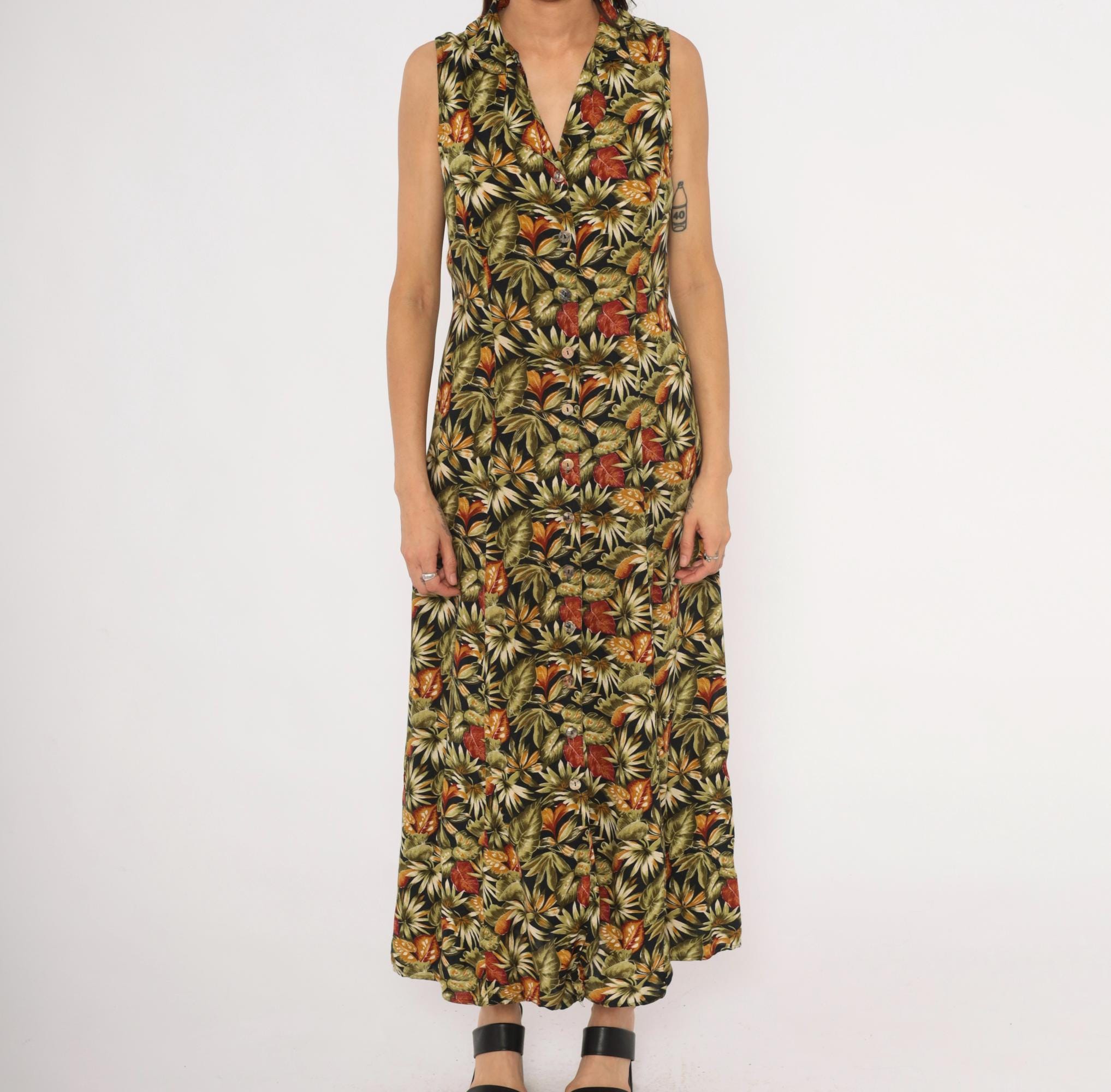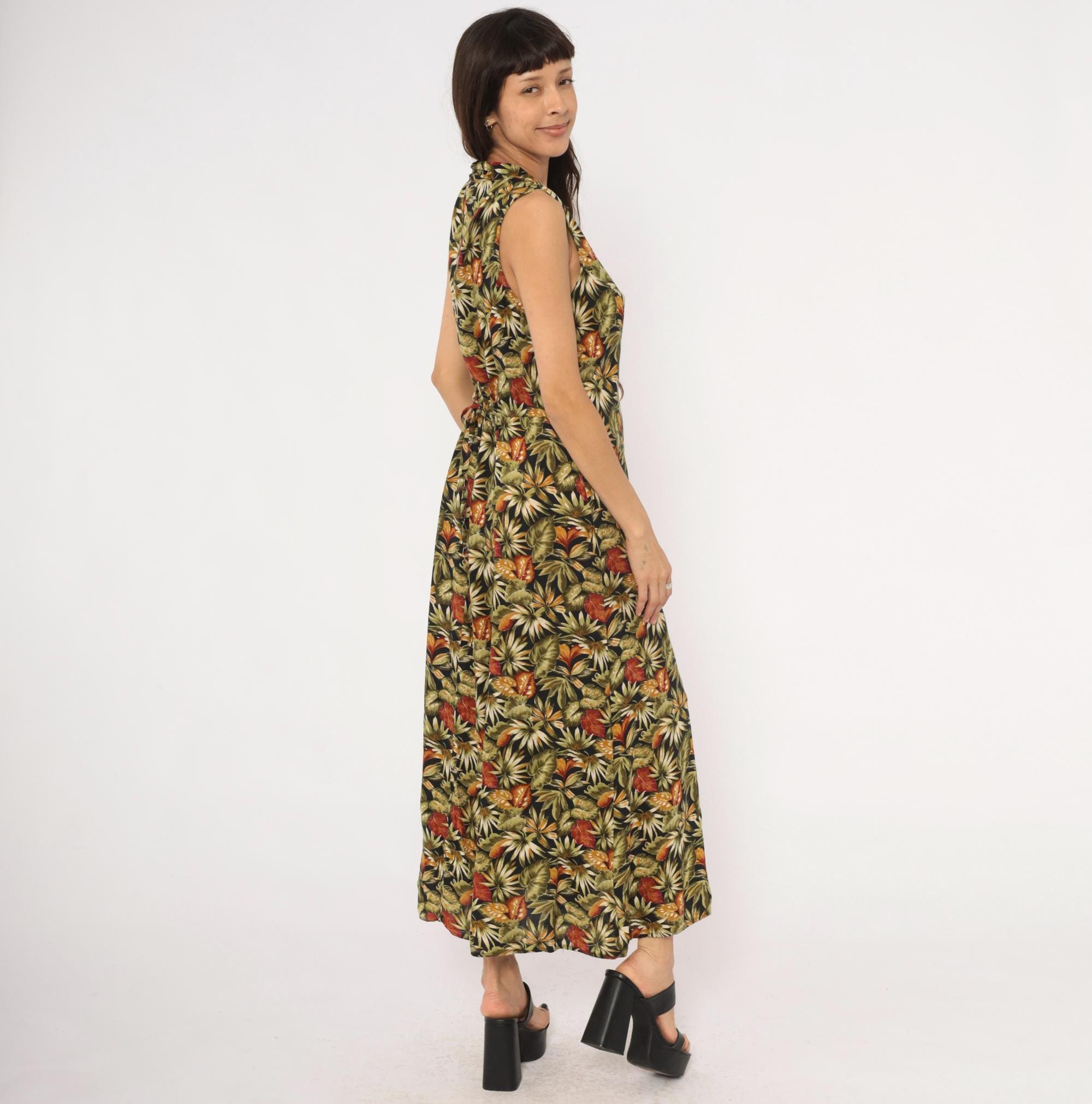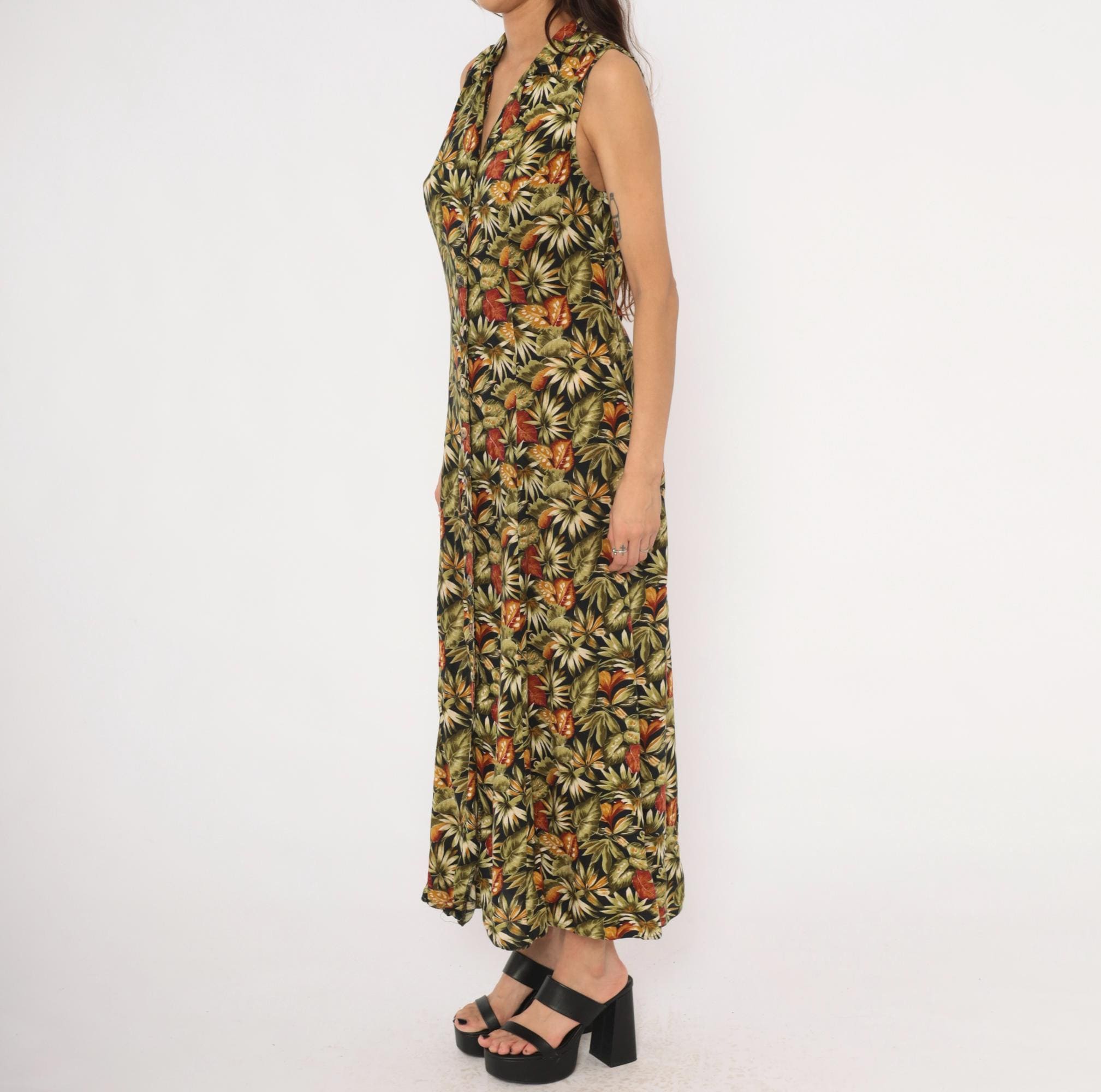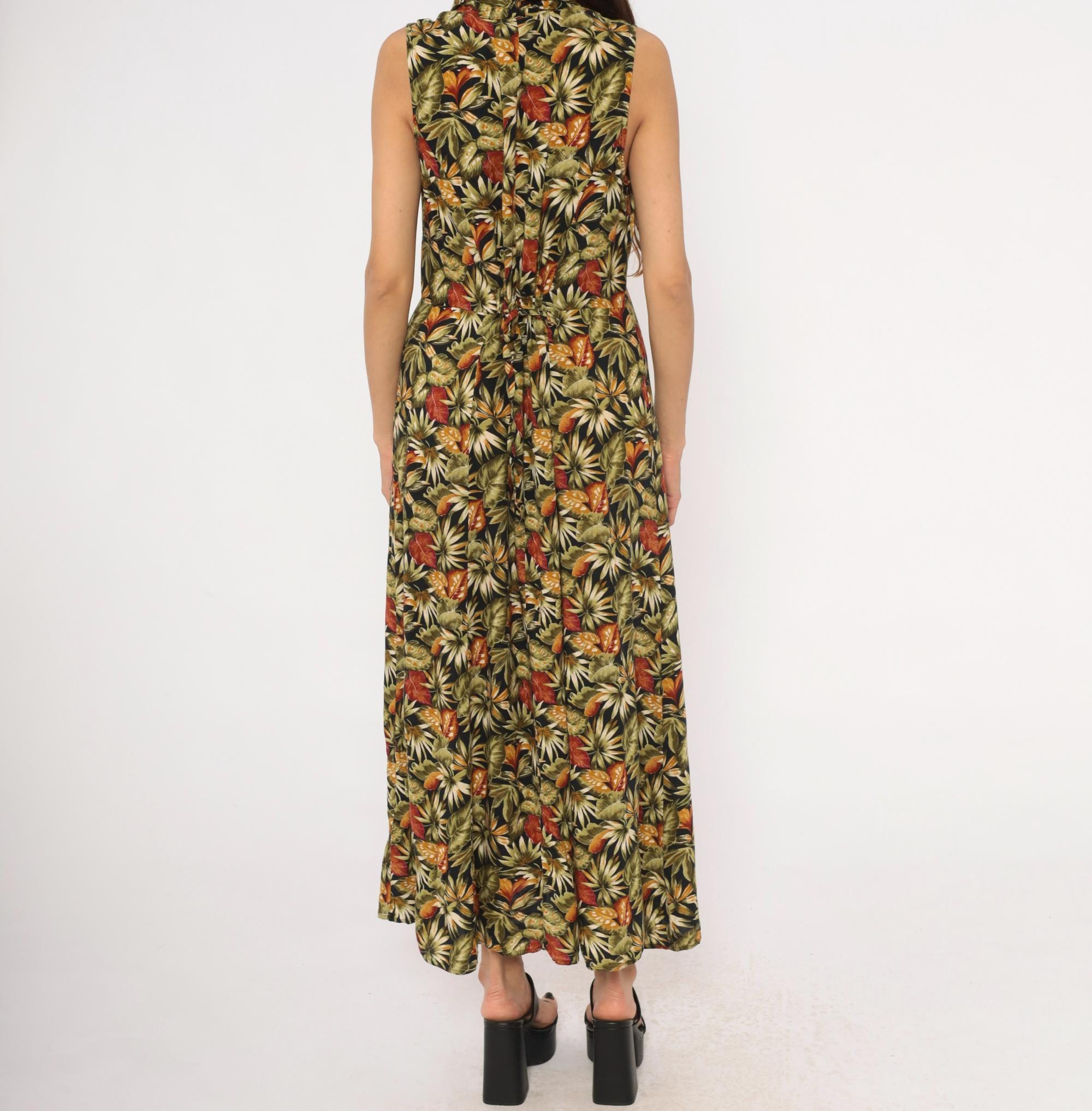 90s sleeveless maxi dress from Teddi with an allover tropical leaf print in olive, rust, orange, cream, and black. V-neckline with a notched collar and full button front closure from neckline to hem. Tie back at the waist, A-line skirt falling to ankle length.