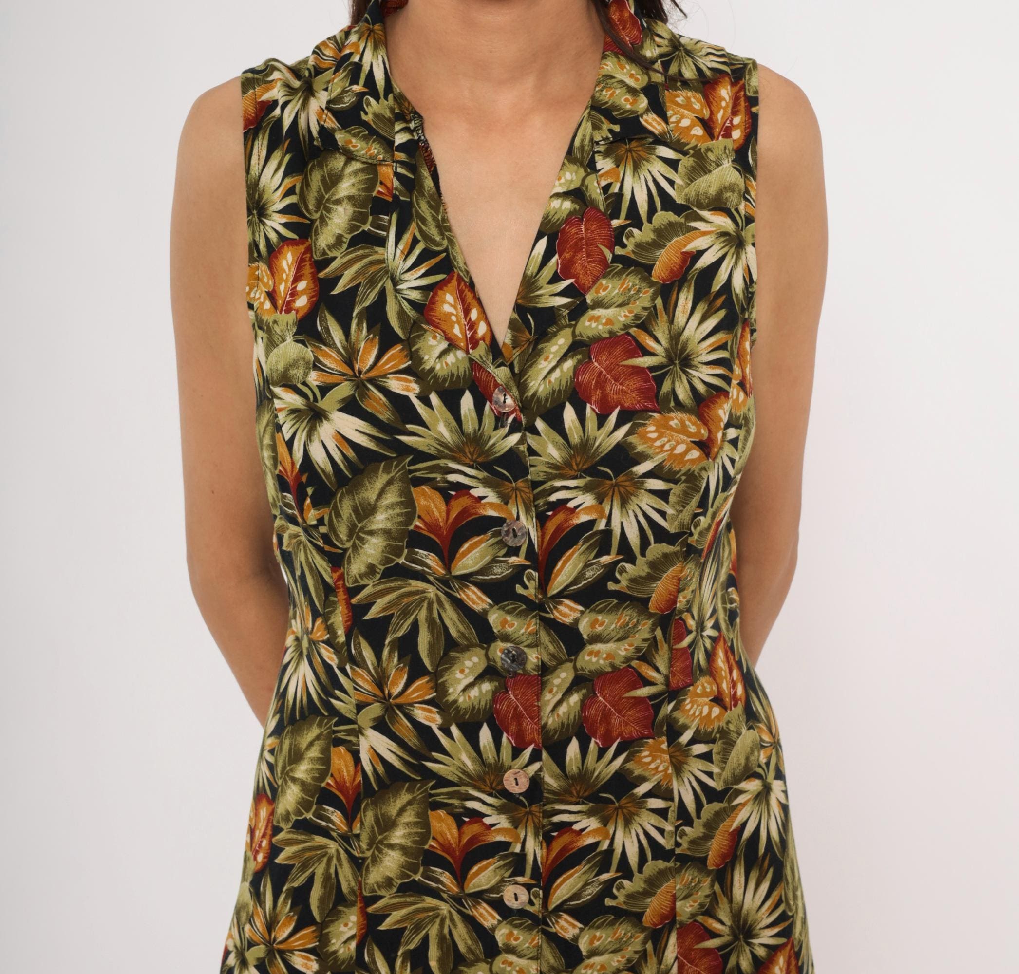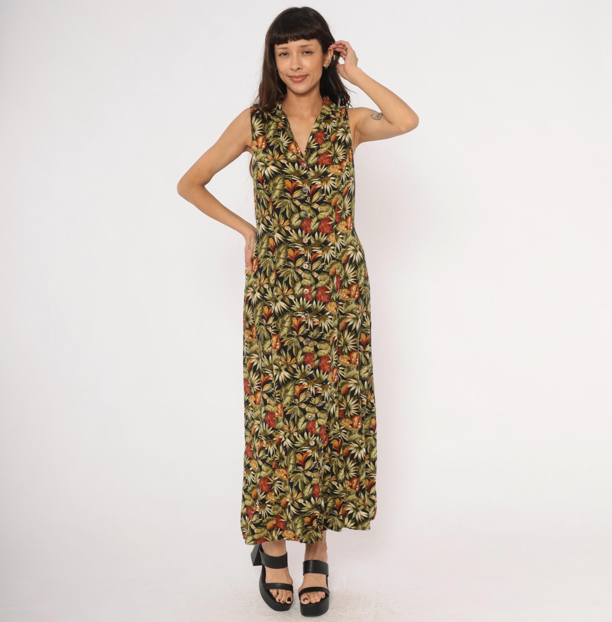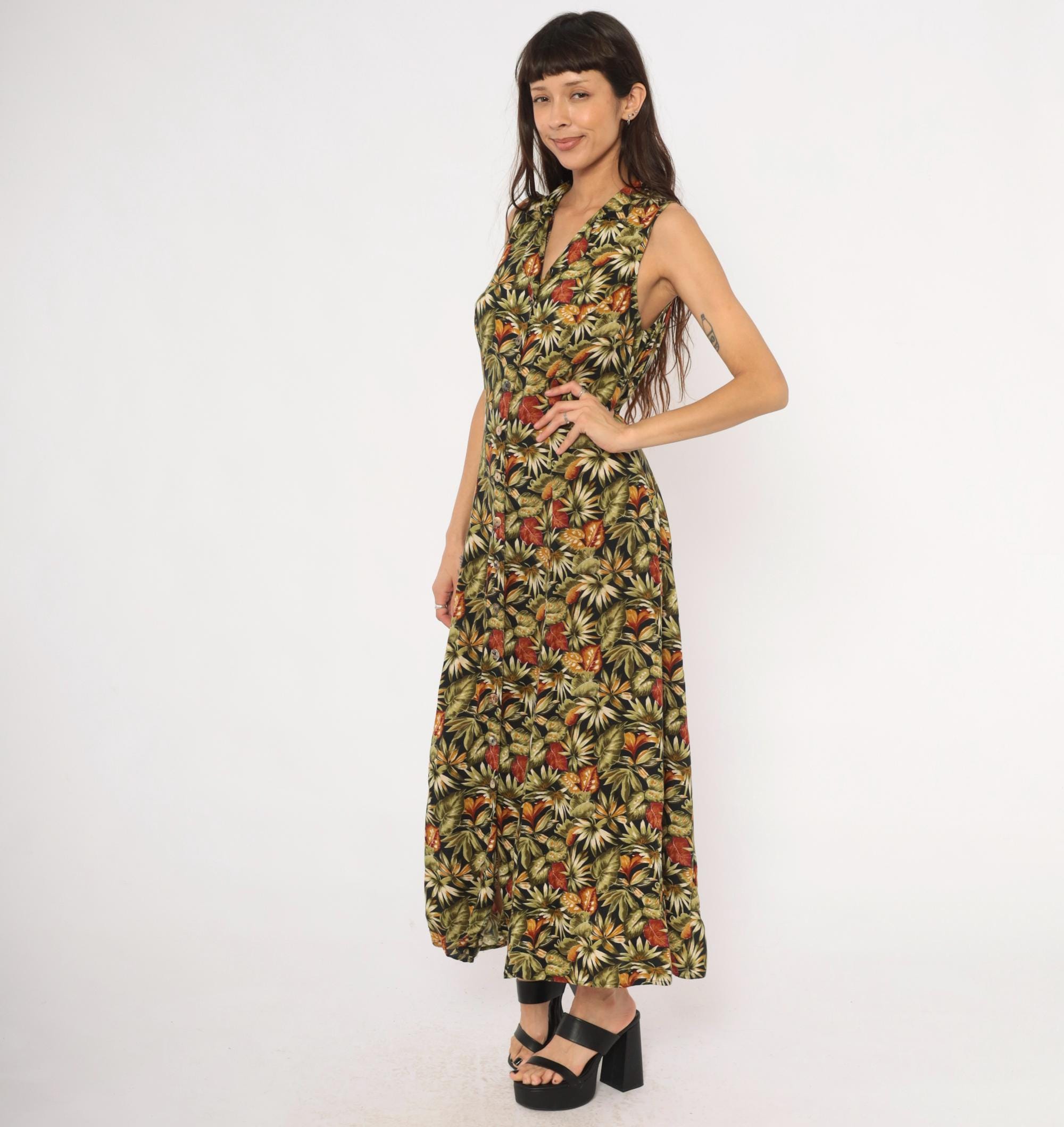 90s sleeveless maxi dress from Teddi with an allover tropical leaf print in olive, rust, orange, cream, and black. V-neckline with a notched collar and full button front closure from neckline to hem. Tie back at the waist, A-line skirt falling to ankle length.
