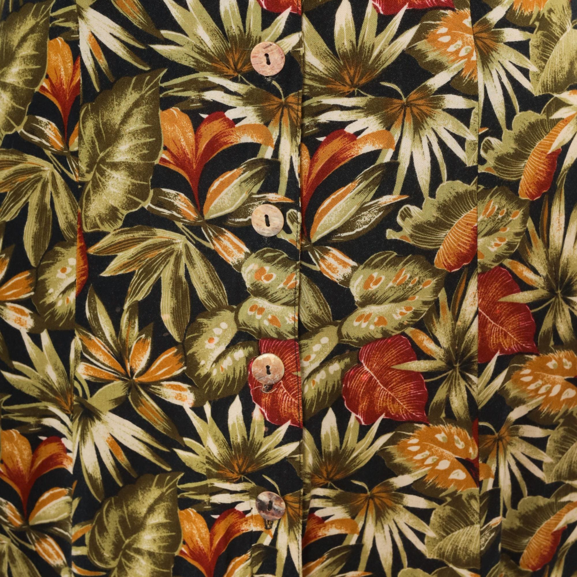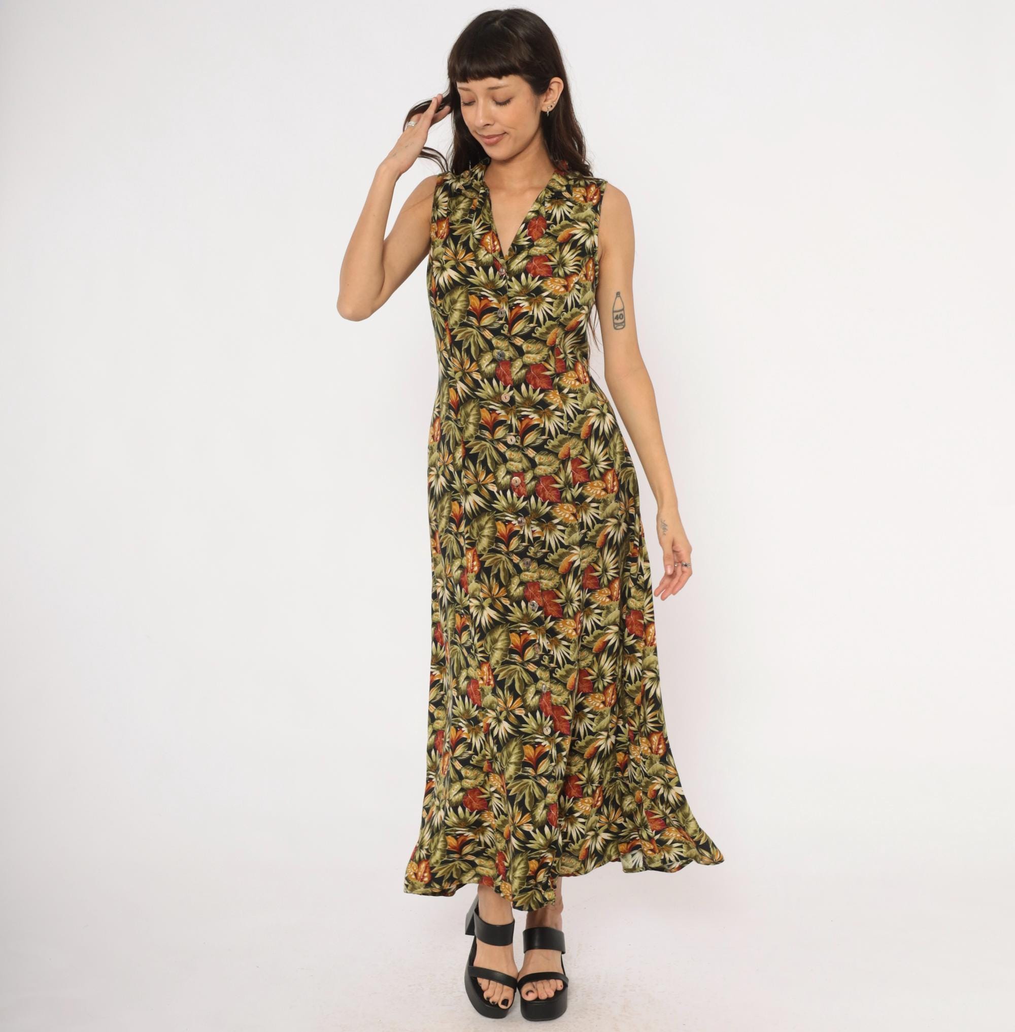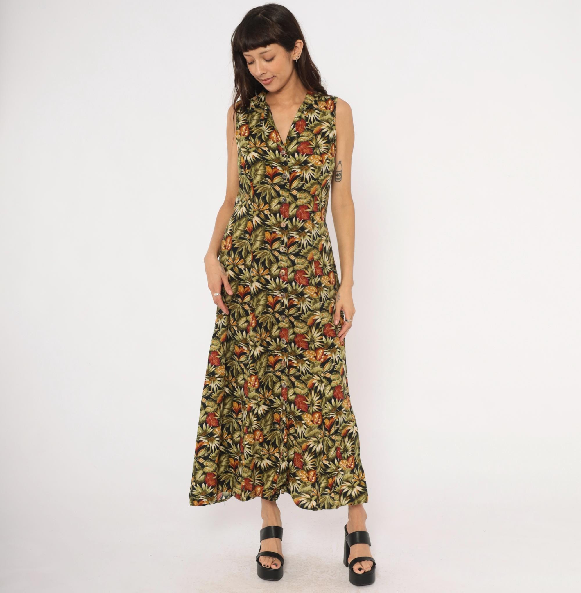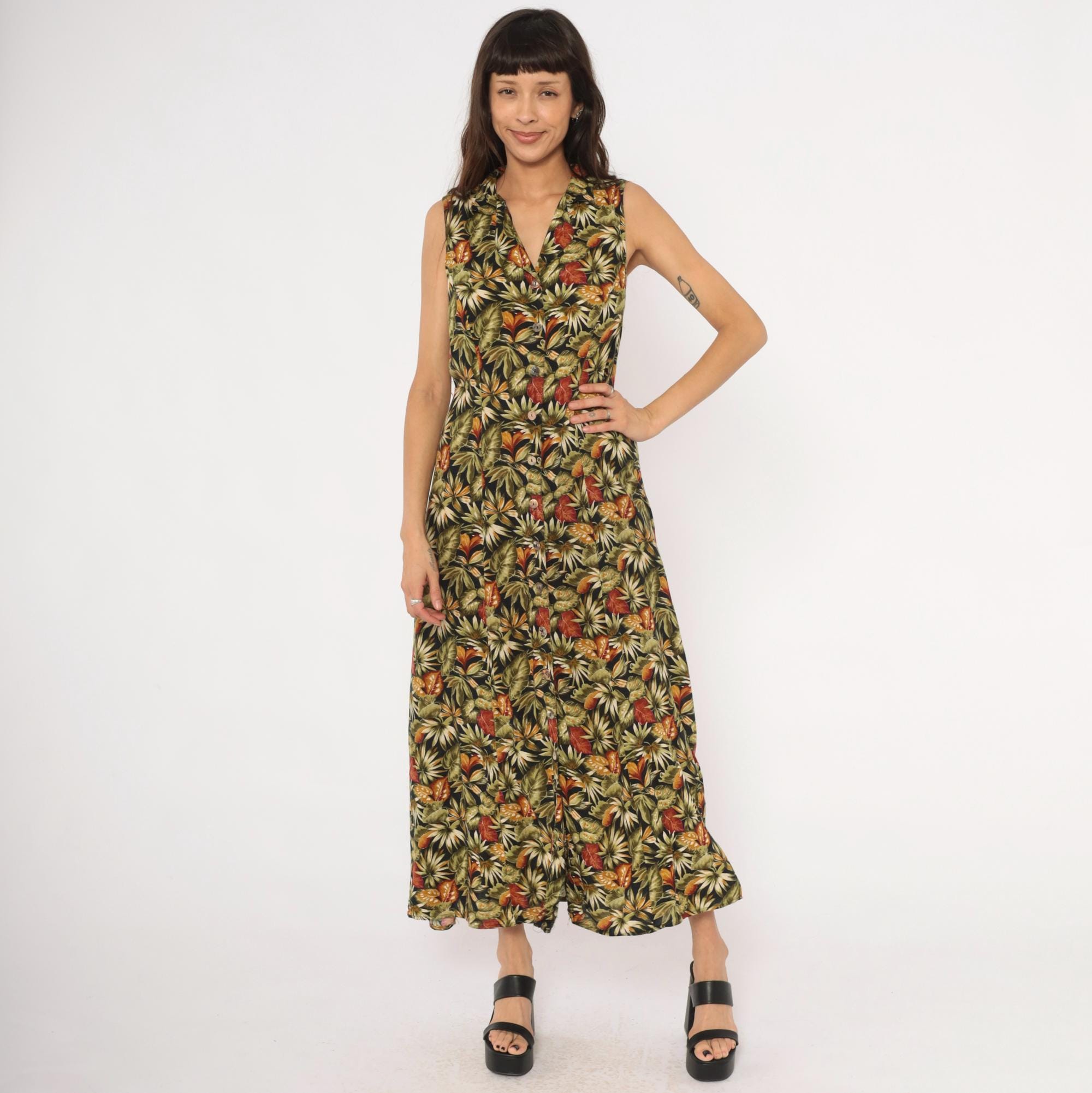 90s sleeveless maxi dress from Teddi with an allover tropical leaf print in olive, rust, orange, cream, and black. V-neckline with a notched collar and full button front closure from neckline to hem. Tie back at the waist, A-line skirt falling to ankle length.