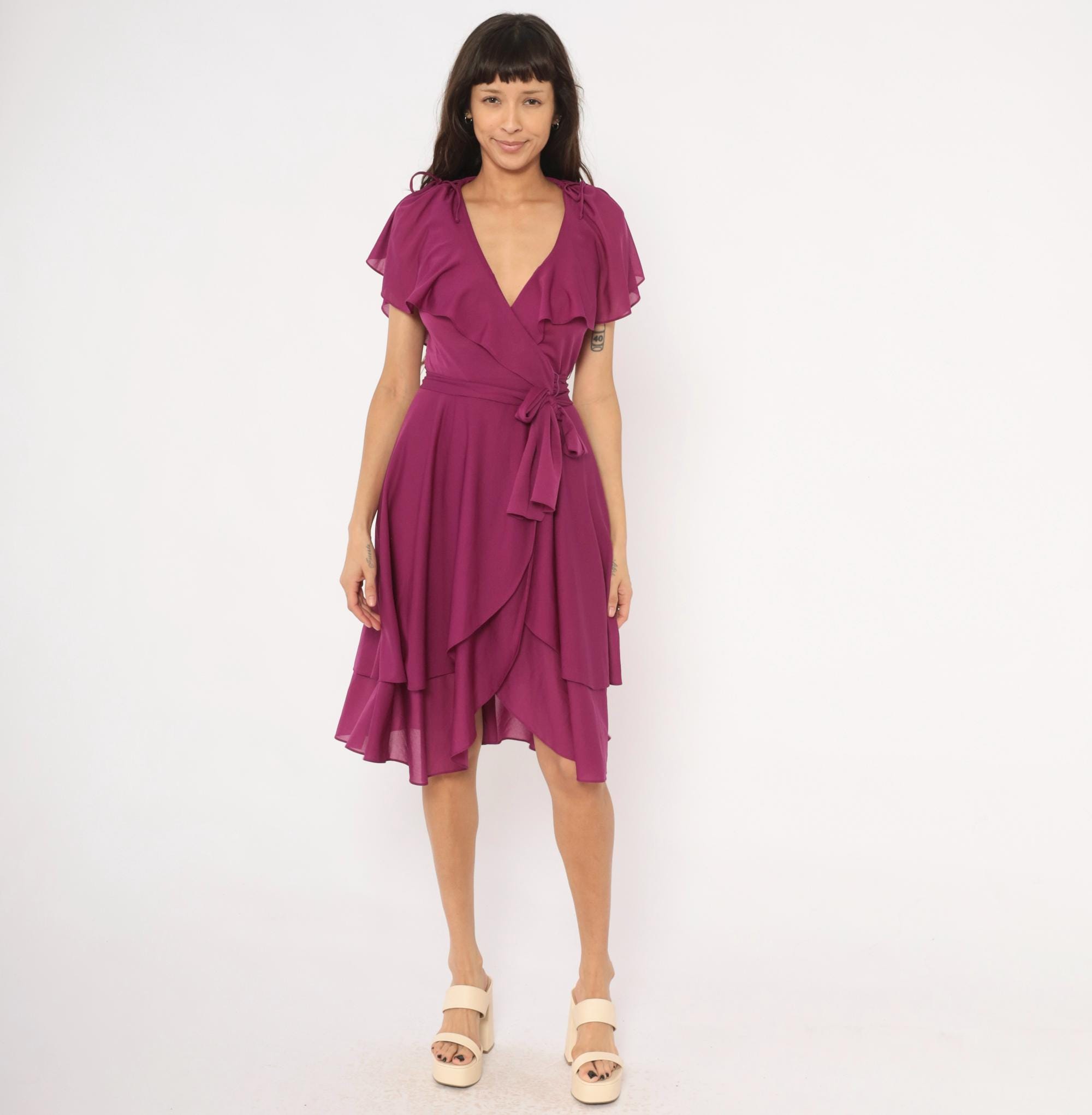 80s plum wrap dress from Samuel Blue Petite with a deep V neckline, flutter ruffle sleeves, and tie closures at both shoulders. Wrap bodice with a wide self-tie sash at the waist, semi-sheer chiffon fabric throughout. Layered asymmetrical skirt with a double-tier hem that falls to the knee, and a small tie bow closure at the back neckline.