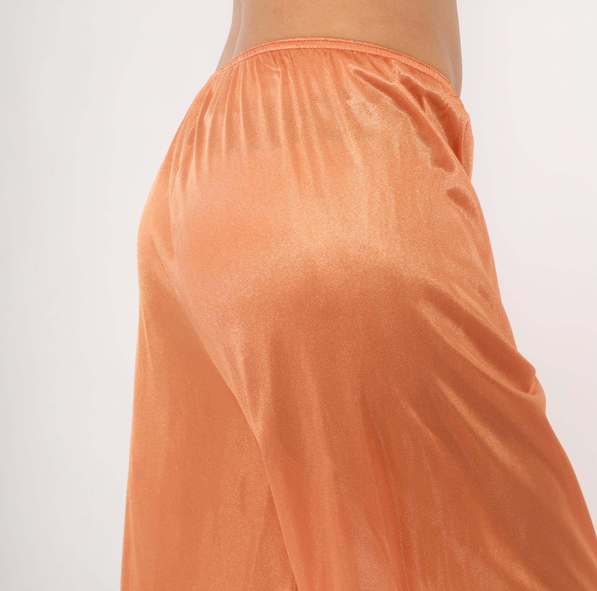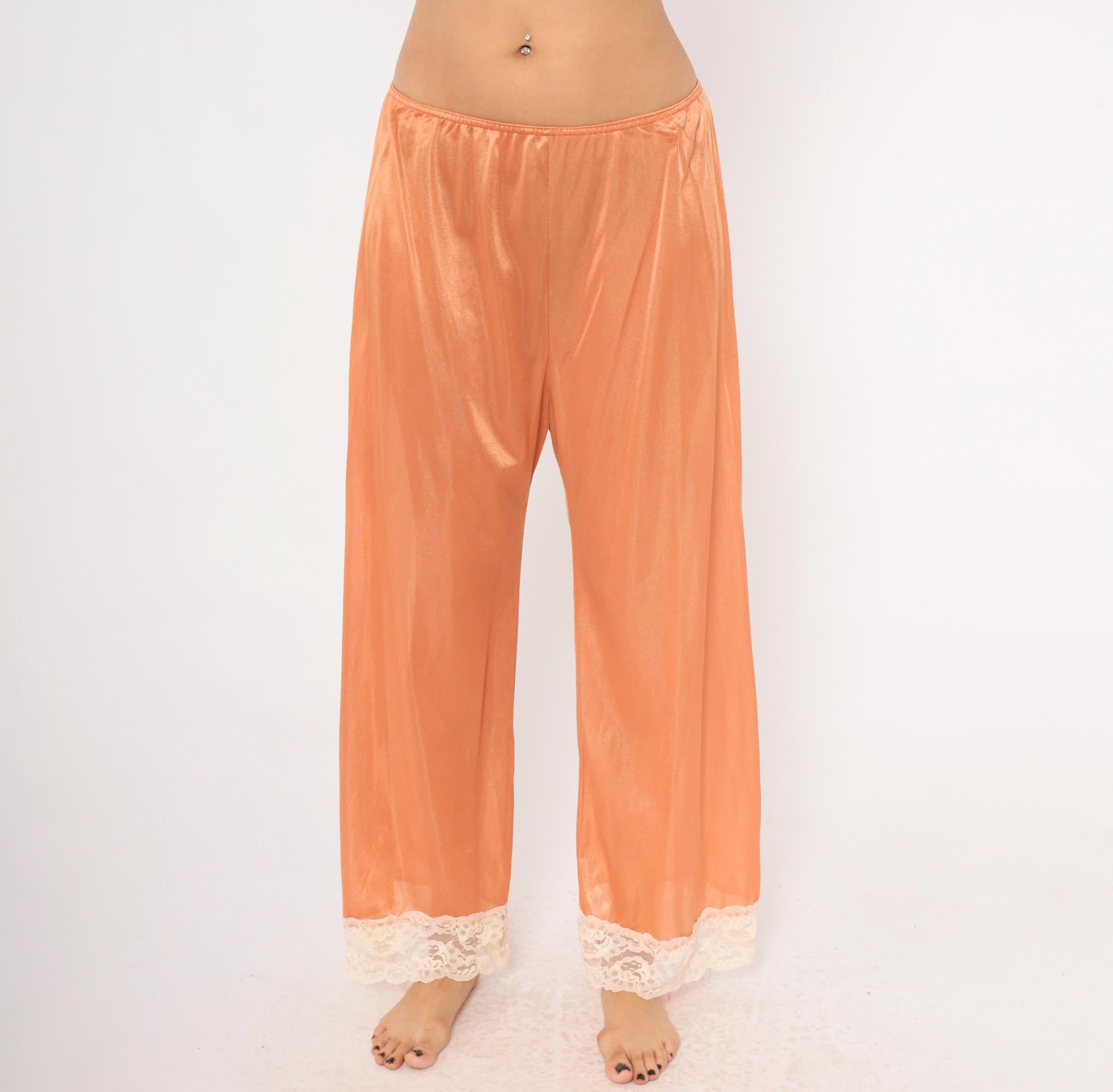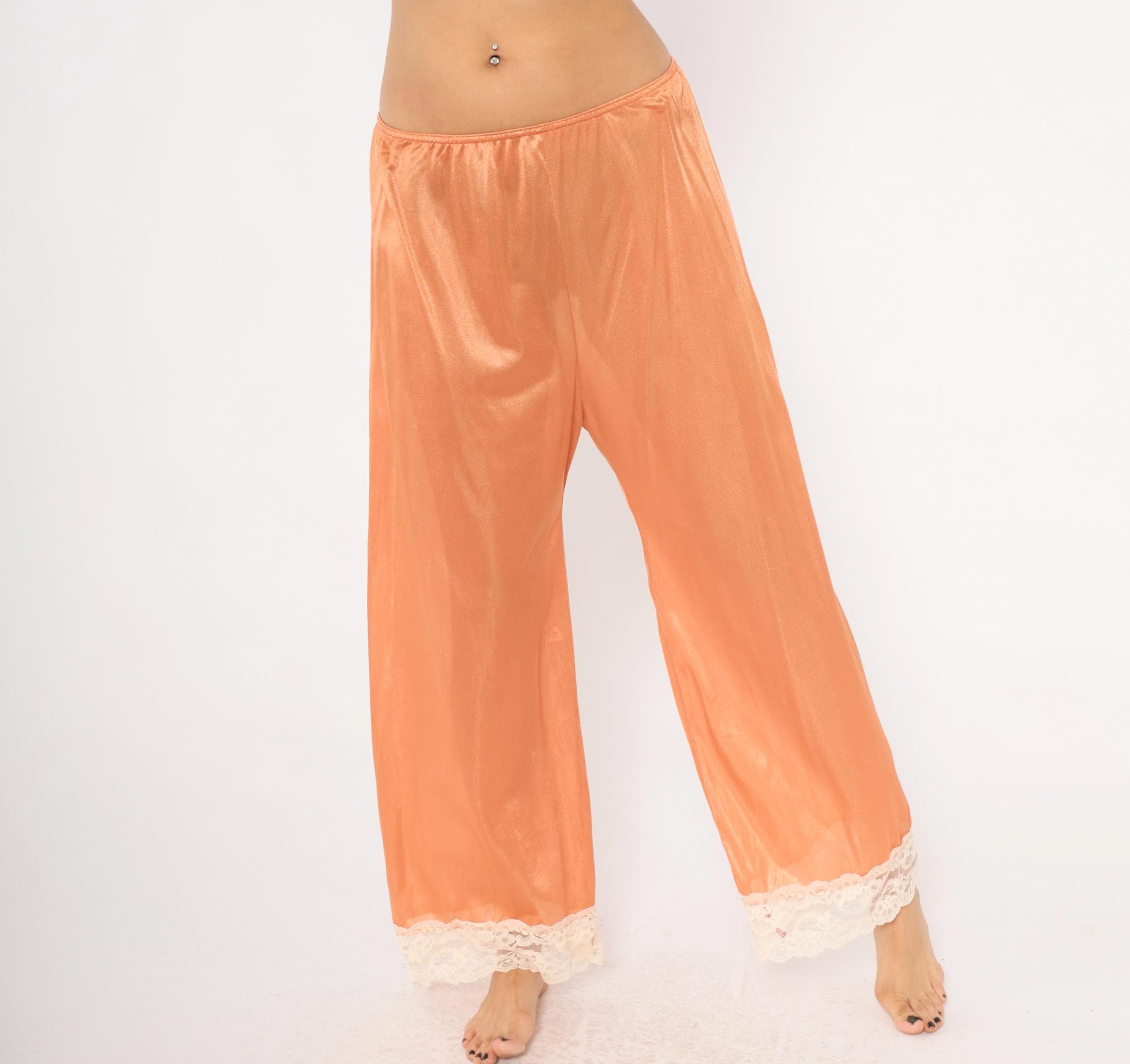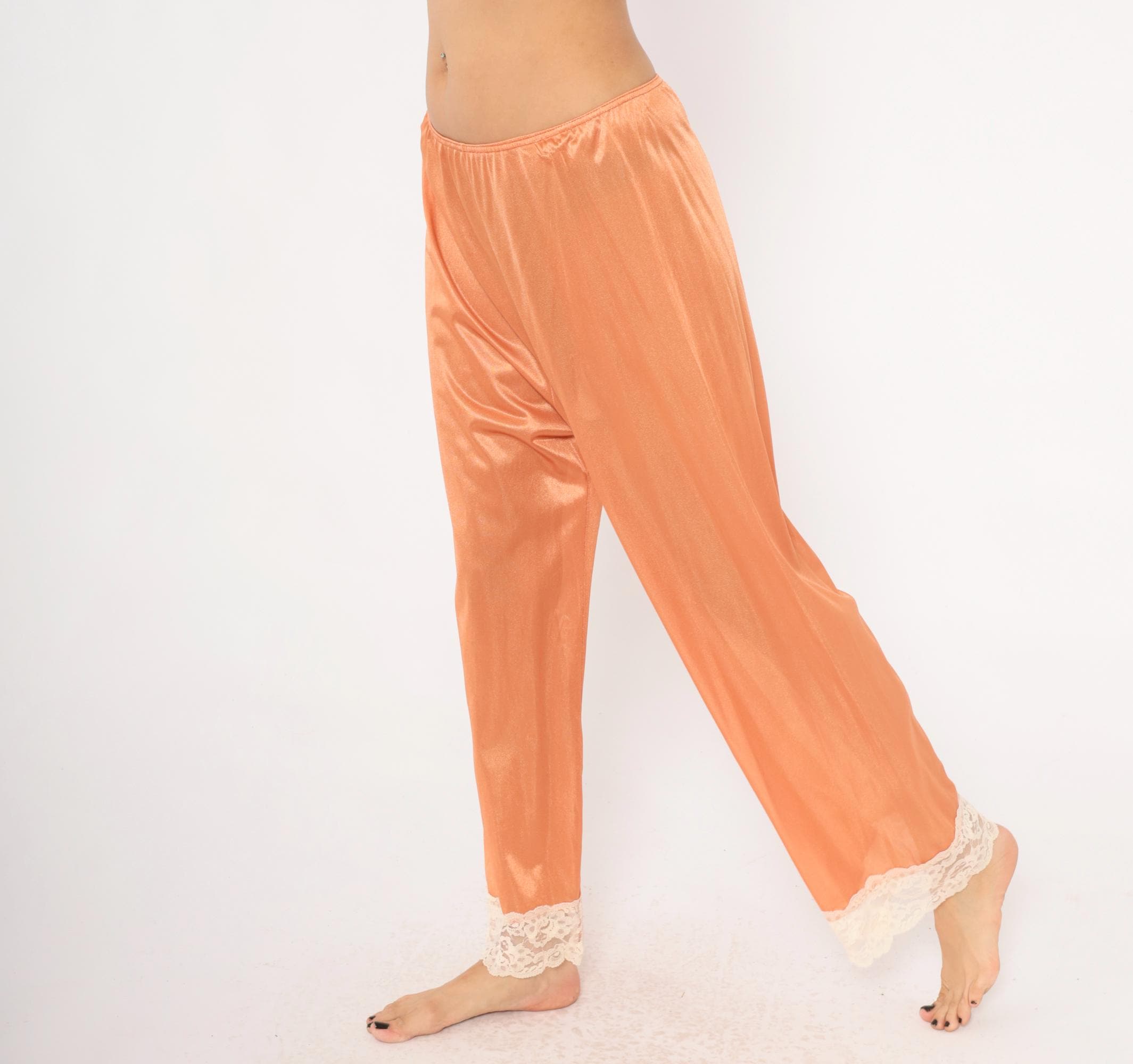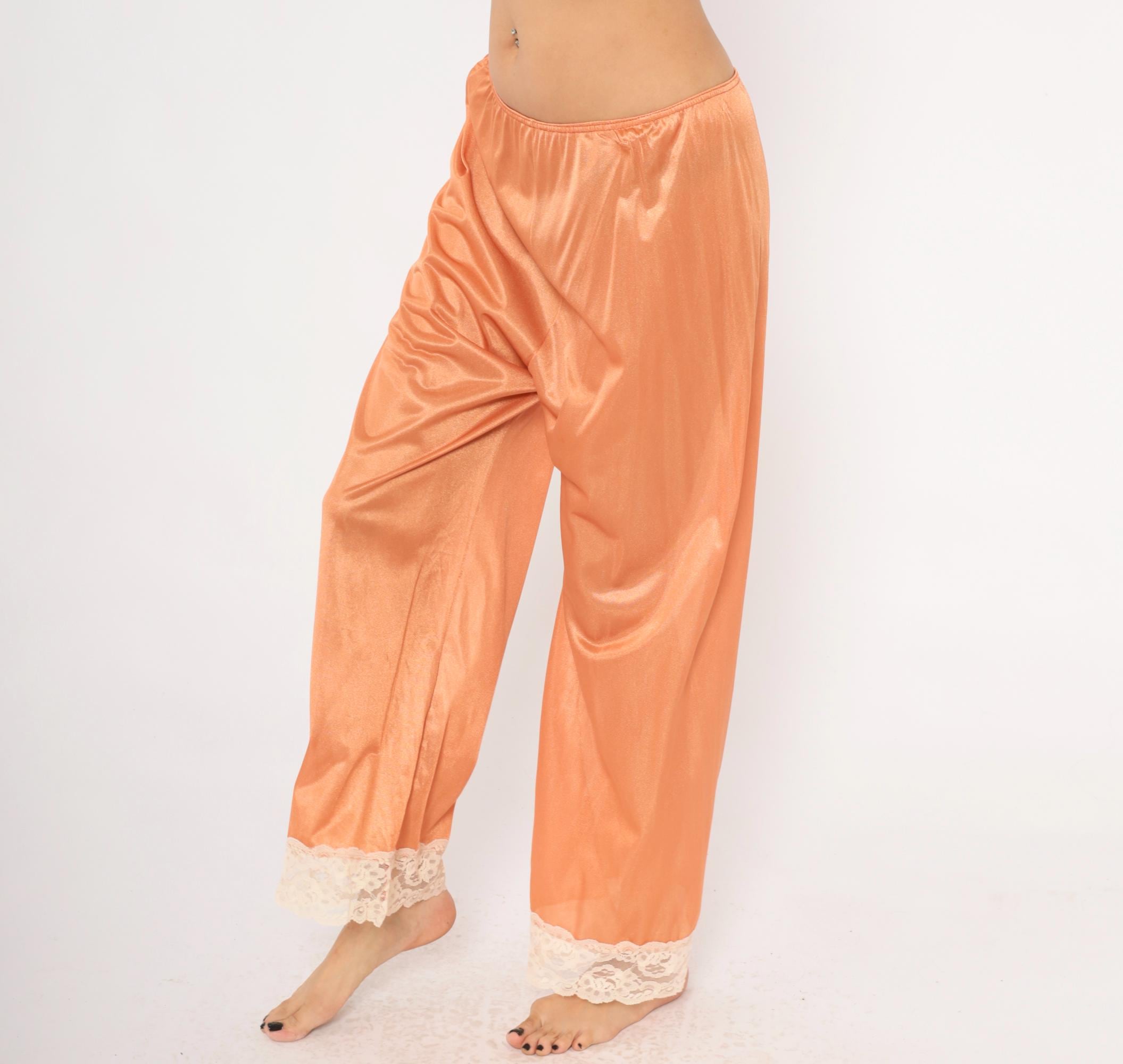 70s peach wide leg pajama pants with an elastic pull-on waist and relaxed straight silhouette through the hip and thigh. Cream lace trim borders each leg opening with a scalloped edge. The satin-finish fabric has a subtle sheen throughout, and the coral-salmon color reads warm and muted.