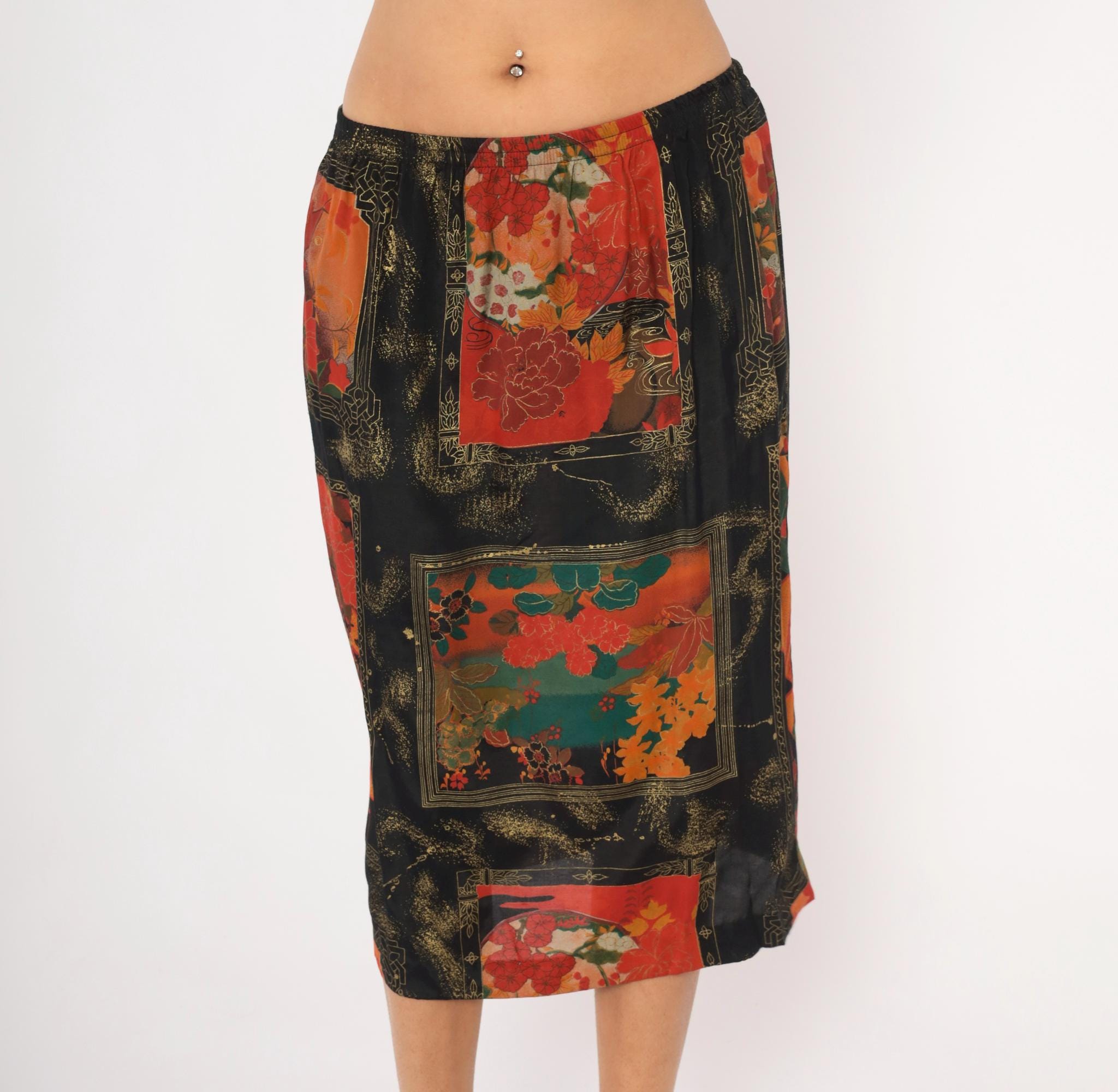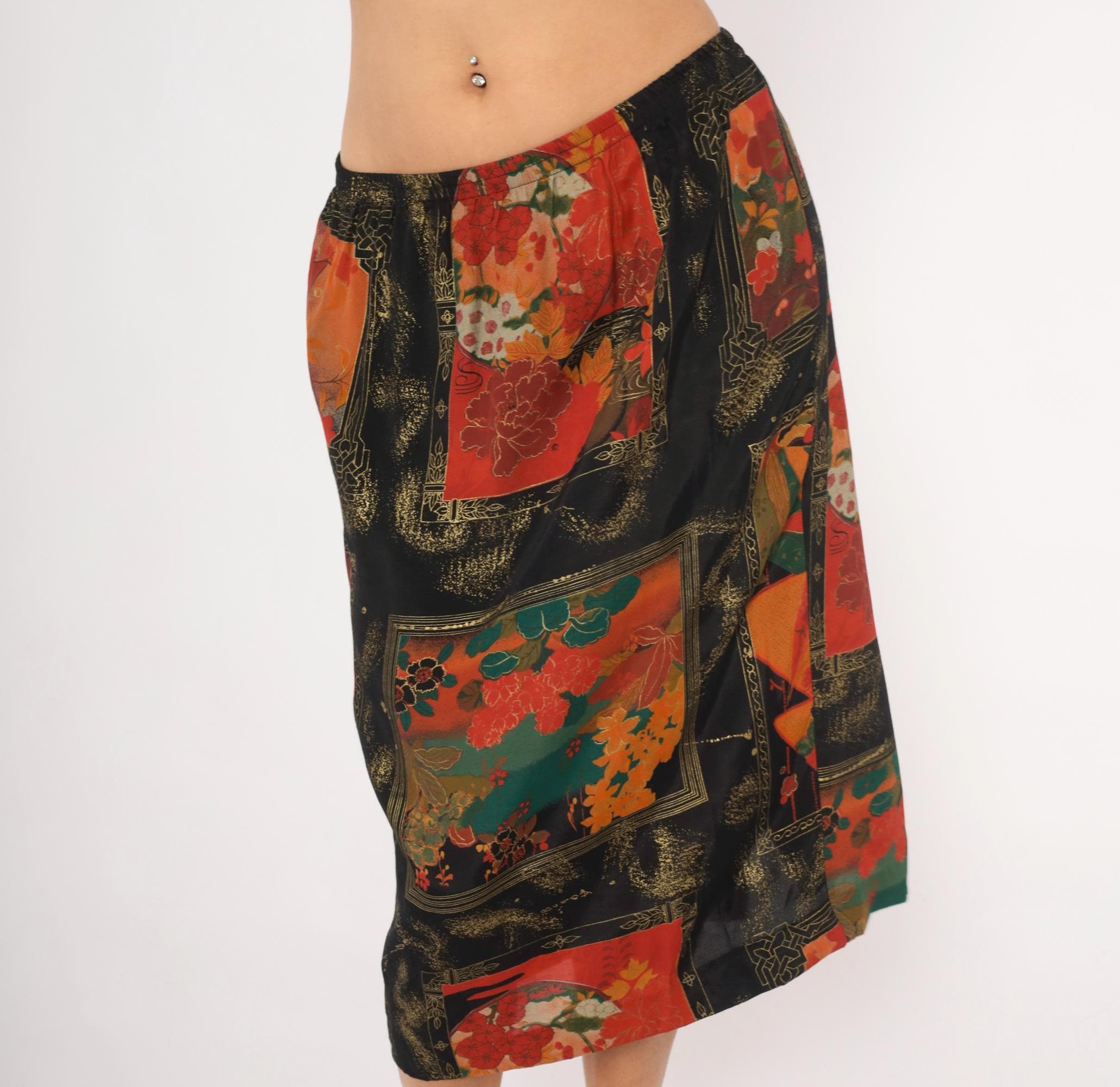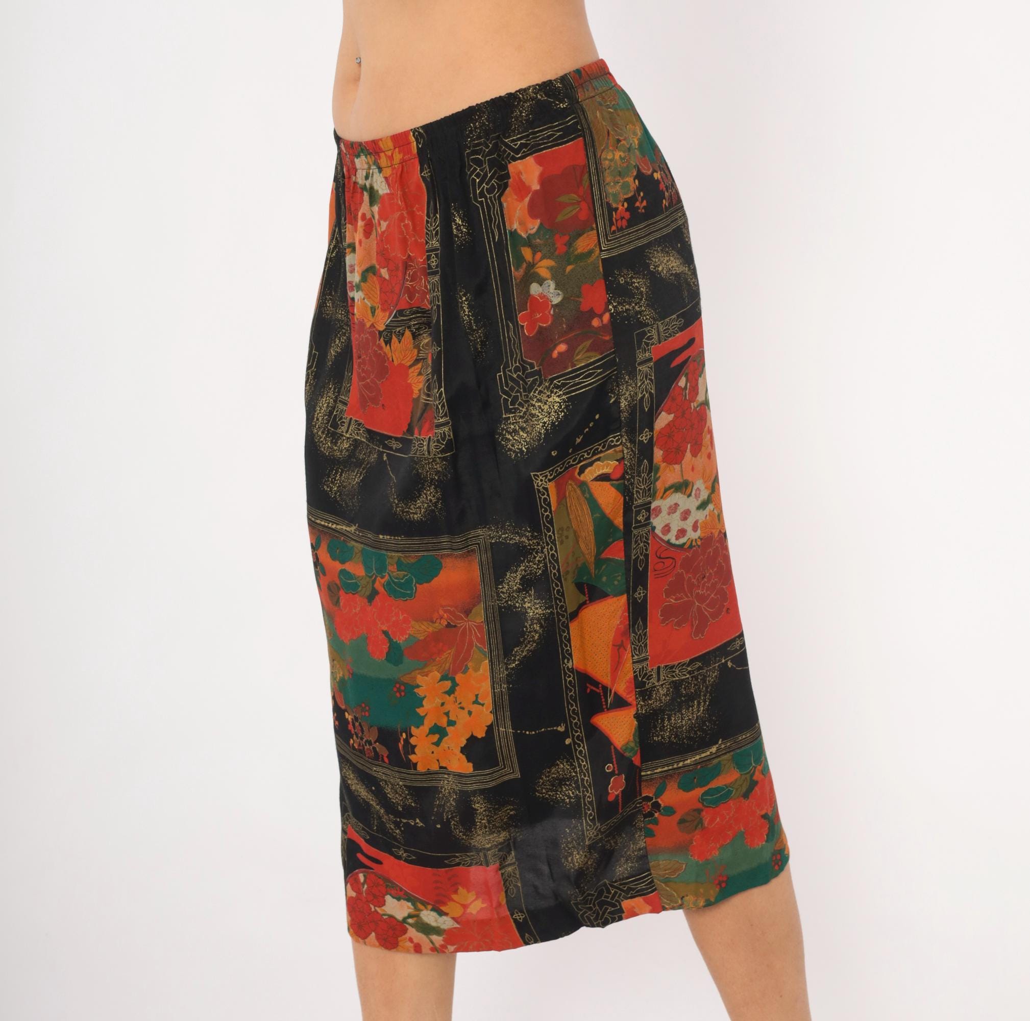 80s black pencil skirt with rectangular panel print depicting Japanese-style peonies, maple leaves, and botanical arrangements in red, teal, orange, and gold against a black ground with scattered gold brushstroke detailing. Elastic waistband at the back with a flat front waist, straight silhouette falling to knee length. Ornamental chain-link and geometric border motifs frame each floral panel across the fabric.