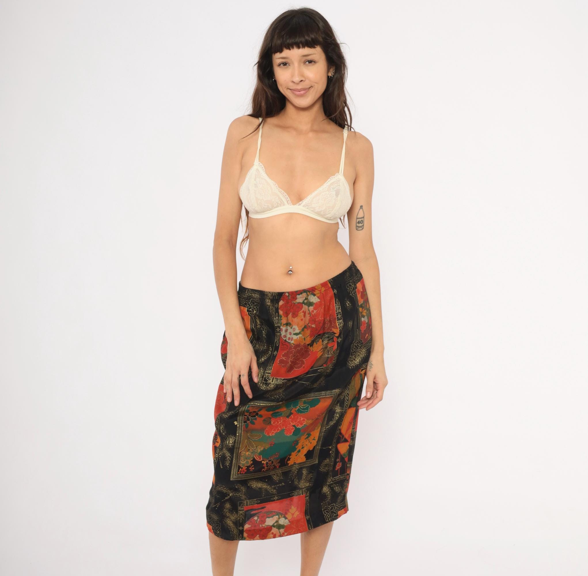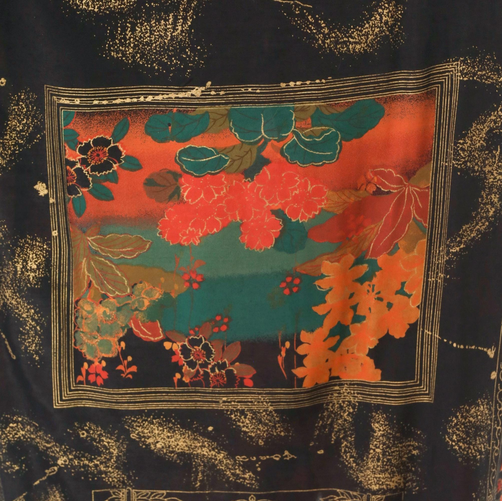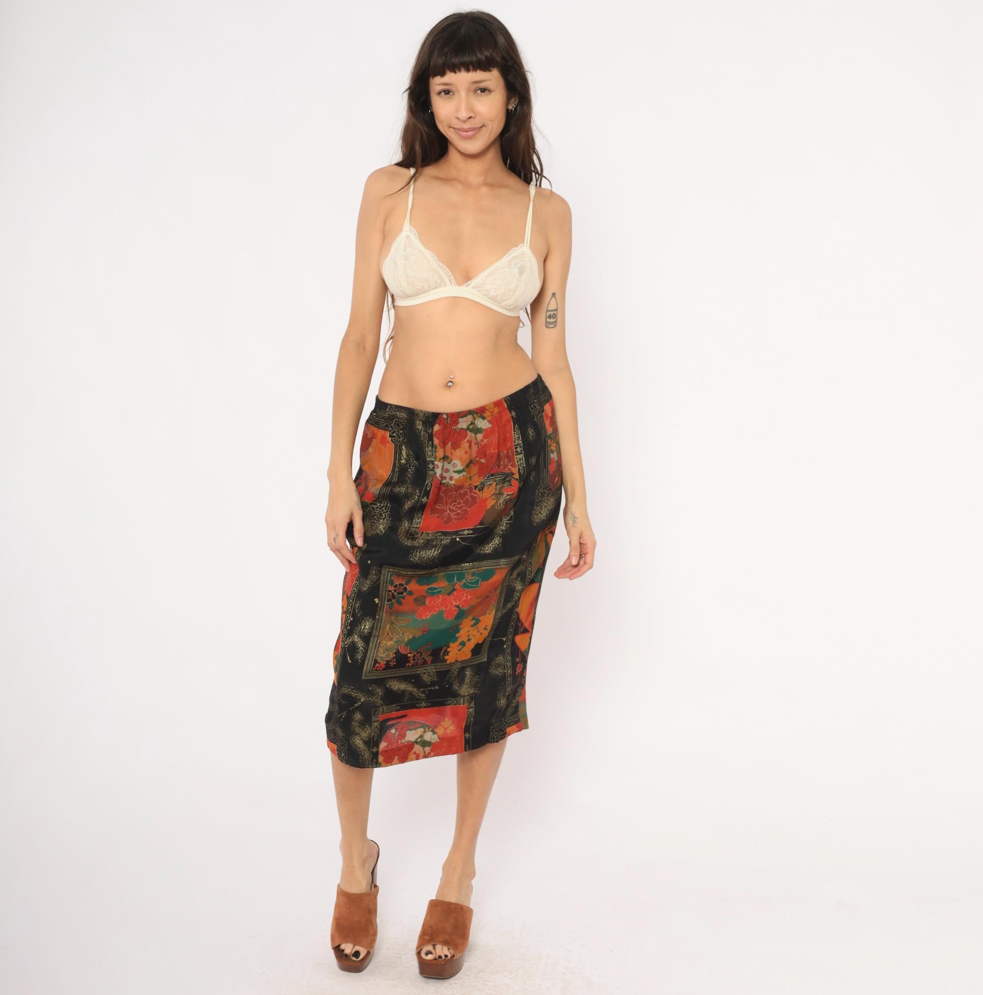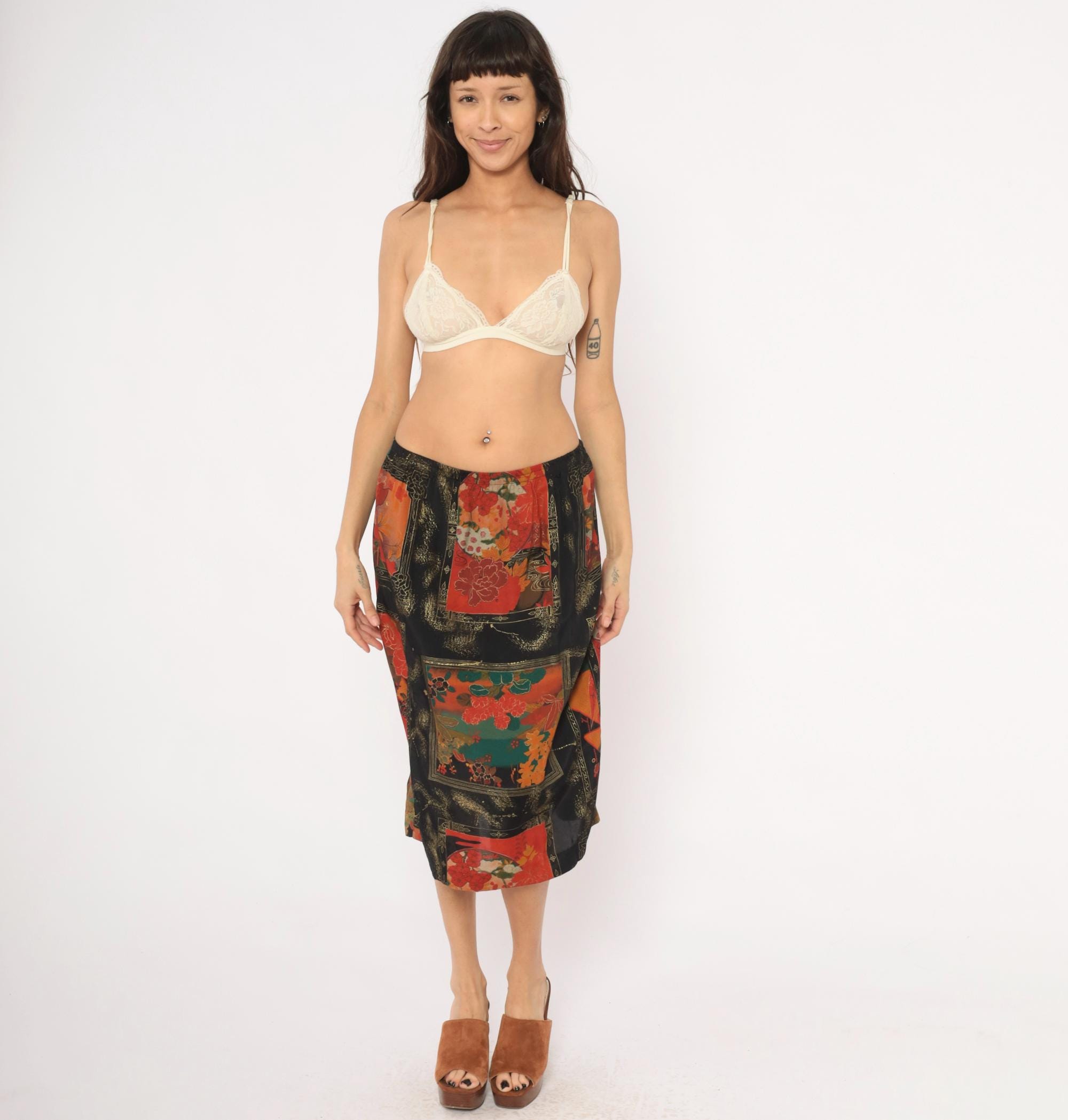 80s black pencil skirt with rectangular panel print depicting Japanese-style peonies, maple leaves, and botanical arrangements in red, teal, orange, and gold against a black ground with scattered gold brushstroke detailing. Elastic waistband at the back with a flat front waist, straight silhouette falling to knee length. Ornamental chain-link and geometric border motifs frame each floral panel across the fabric.