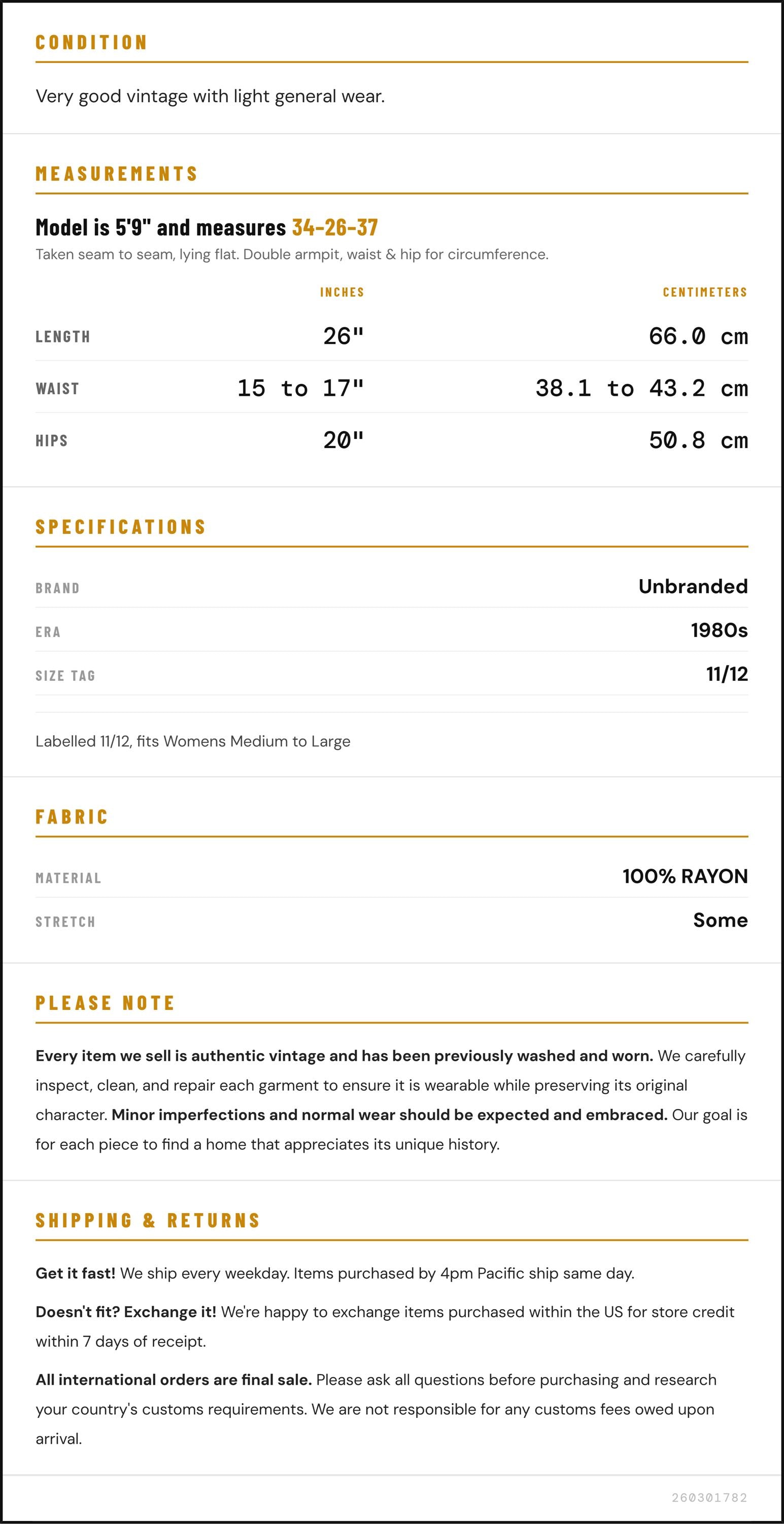 Vintage denim was usually made without any stretch, unlike modern jeans. Check the measurements to ensure proper fit, and remember to give yourself a little wiggle room in the waist and hips, depending on your preferred fit.