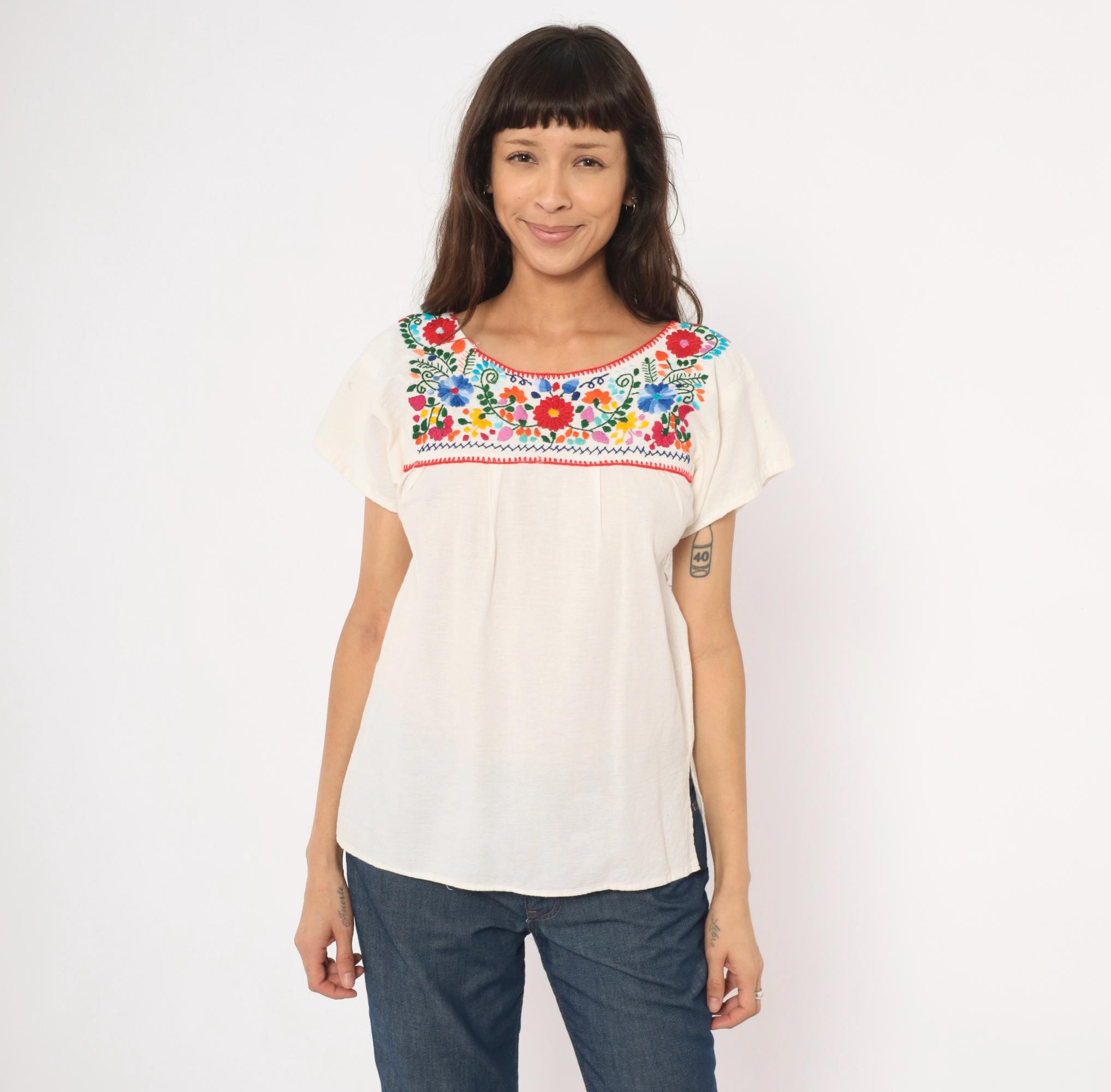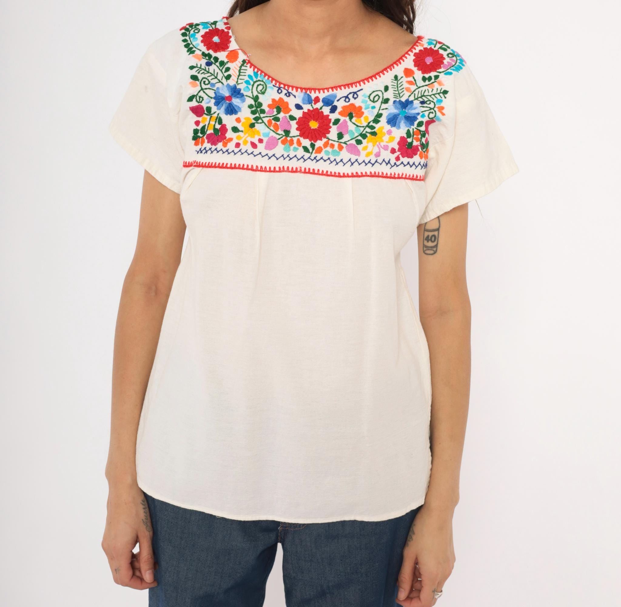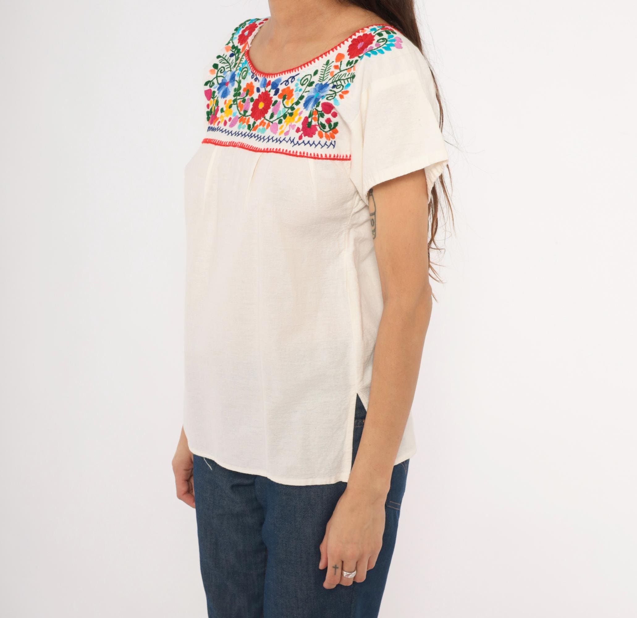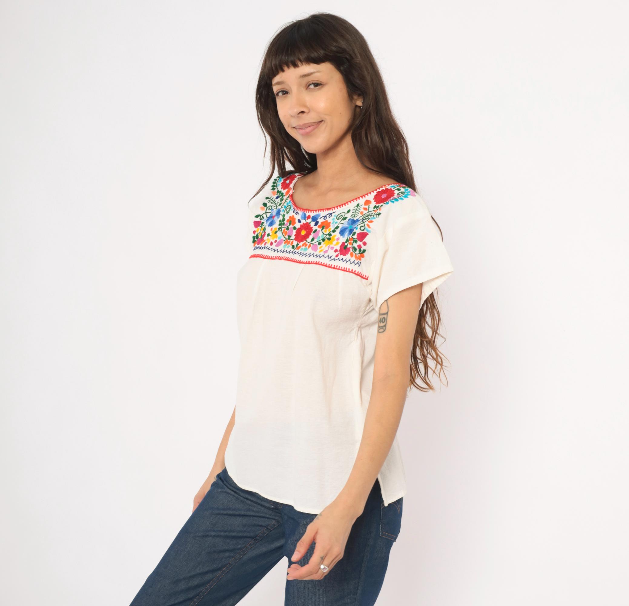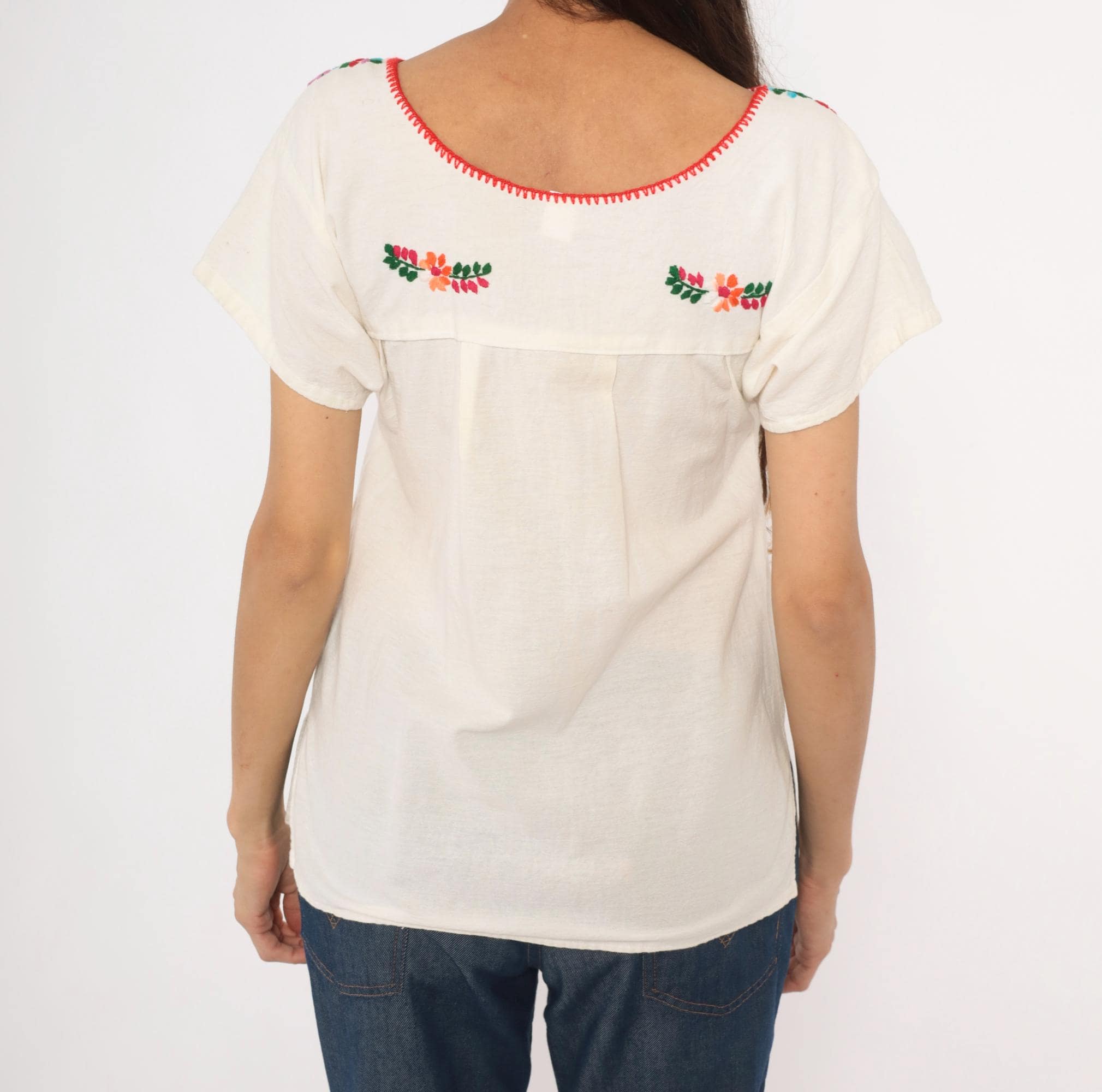 90s Mexican embroidered peasant blouse with a wide scoop neckline and short cap sleeves. Multicolor hand-stitched floral embroidery covers the yoke in red, blue, yellow, pink, green, and turquoise, with a navy zigzag border and red blanket stitch edging. The back yoke has two smaller floral embroidery accents. Relaxed body with side slits at the hem and a pullover construction.