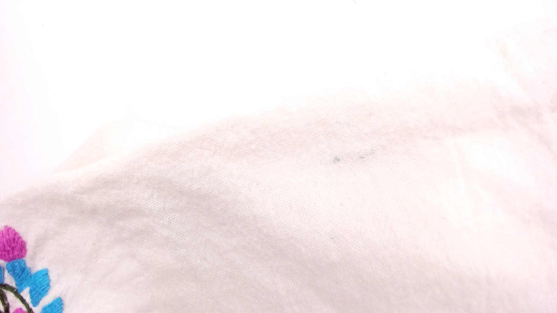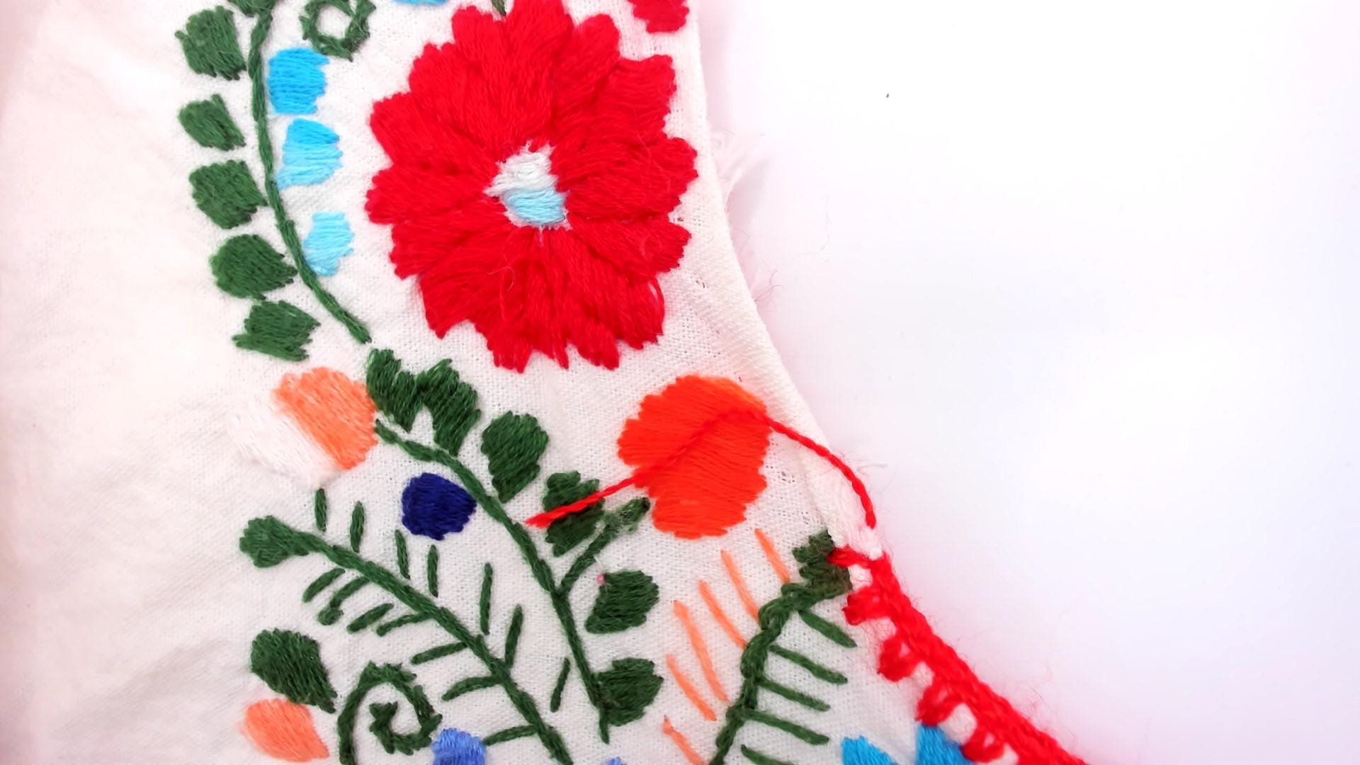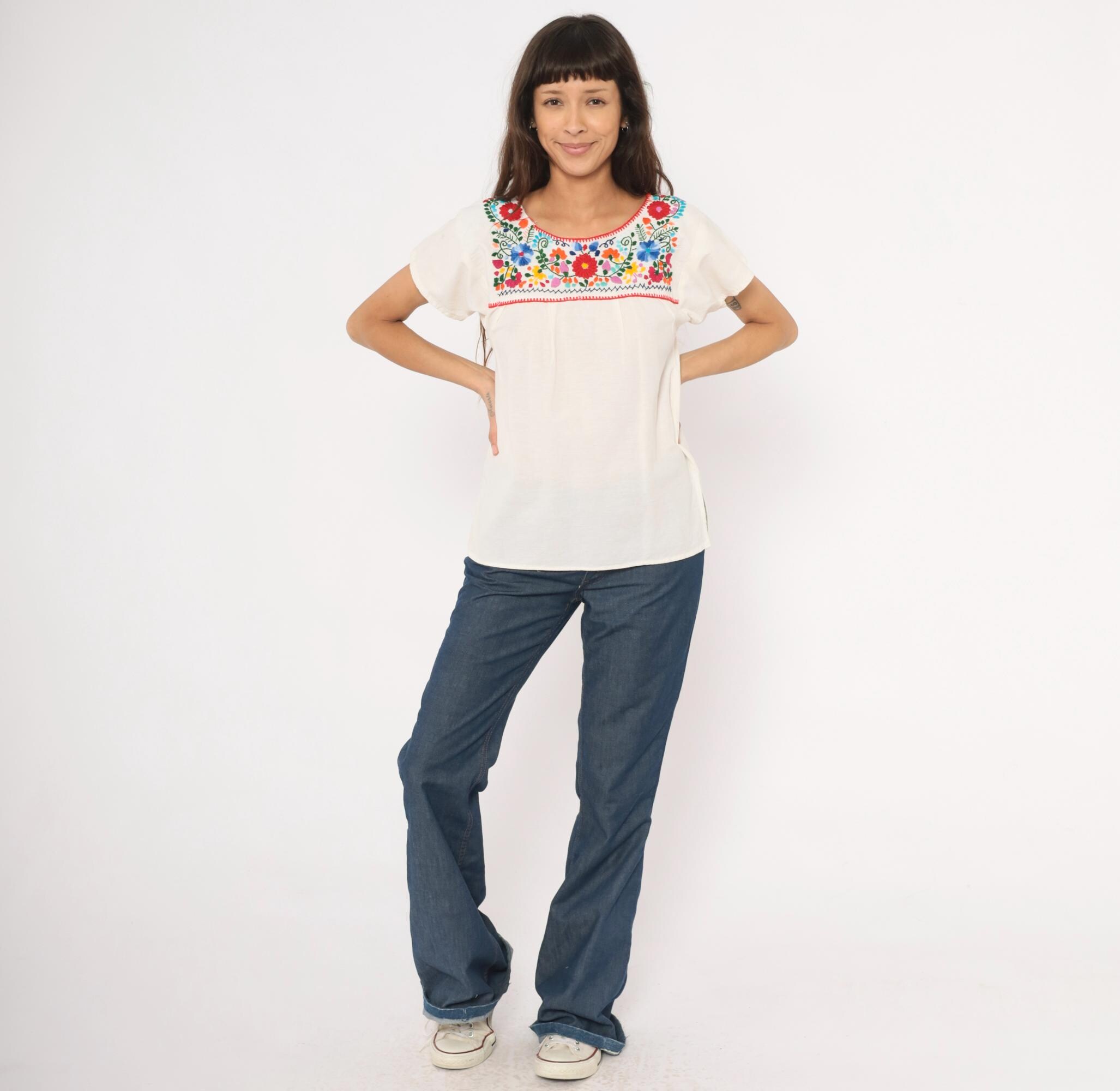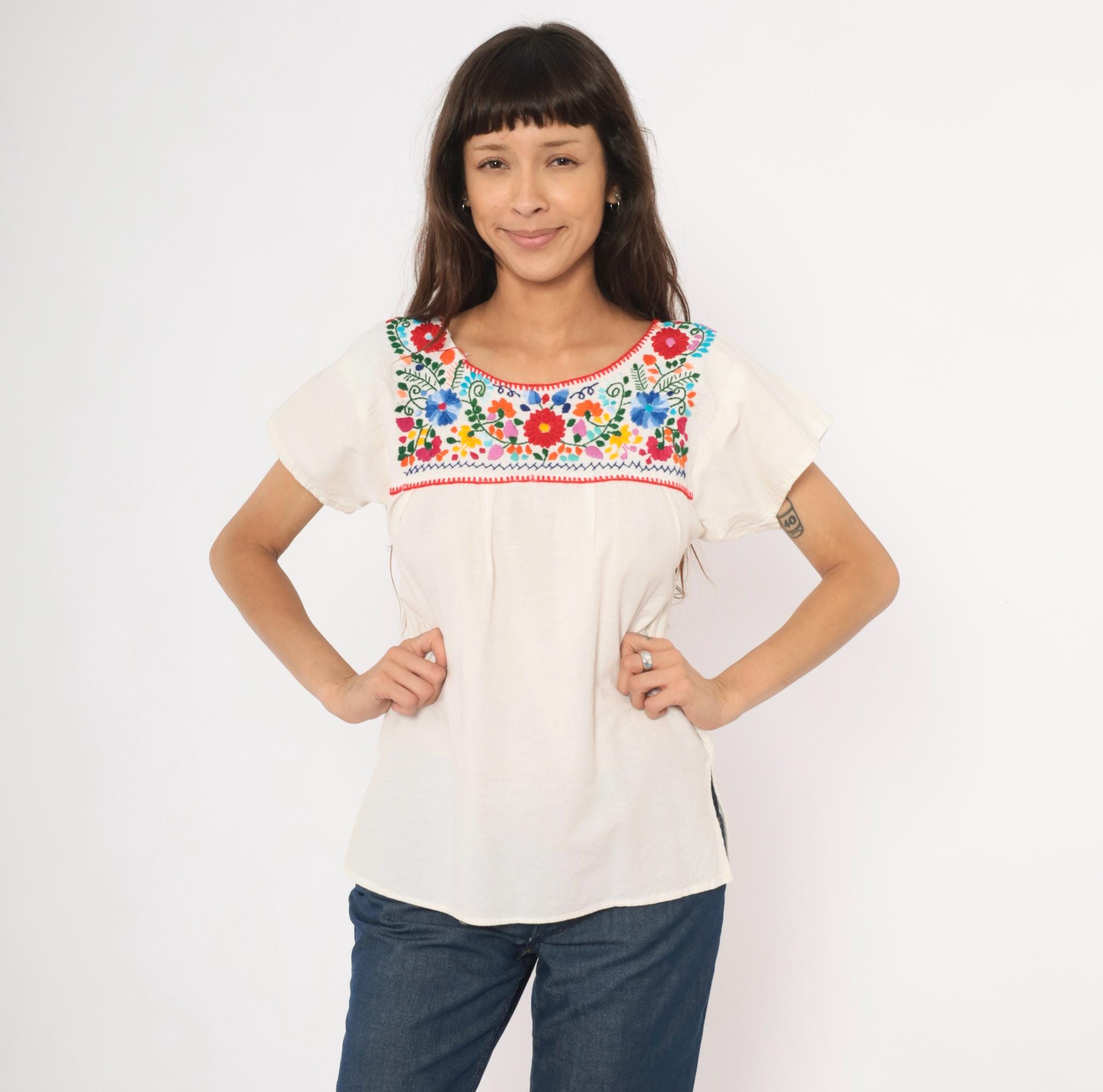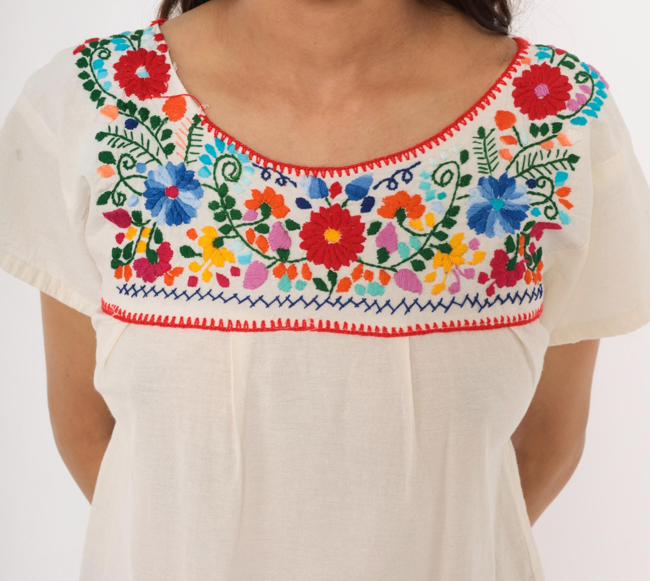 90s Mexican embroidered peasant blouse with a wide scoop neckline and short cap sleeves. Multicolor hand-stitched floral embroidery covers the yoke in red, blue, yellow, pink, green, and turquoise, with a navy zigzag border and red blanket stitch edging. The back yoke has two smaller floral embroidery accents. Relaxed body with side slits at the hem and a pullover construction.