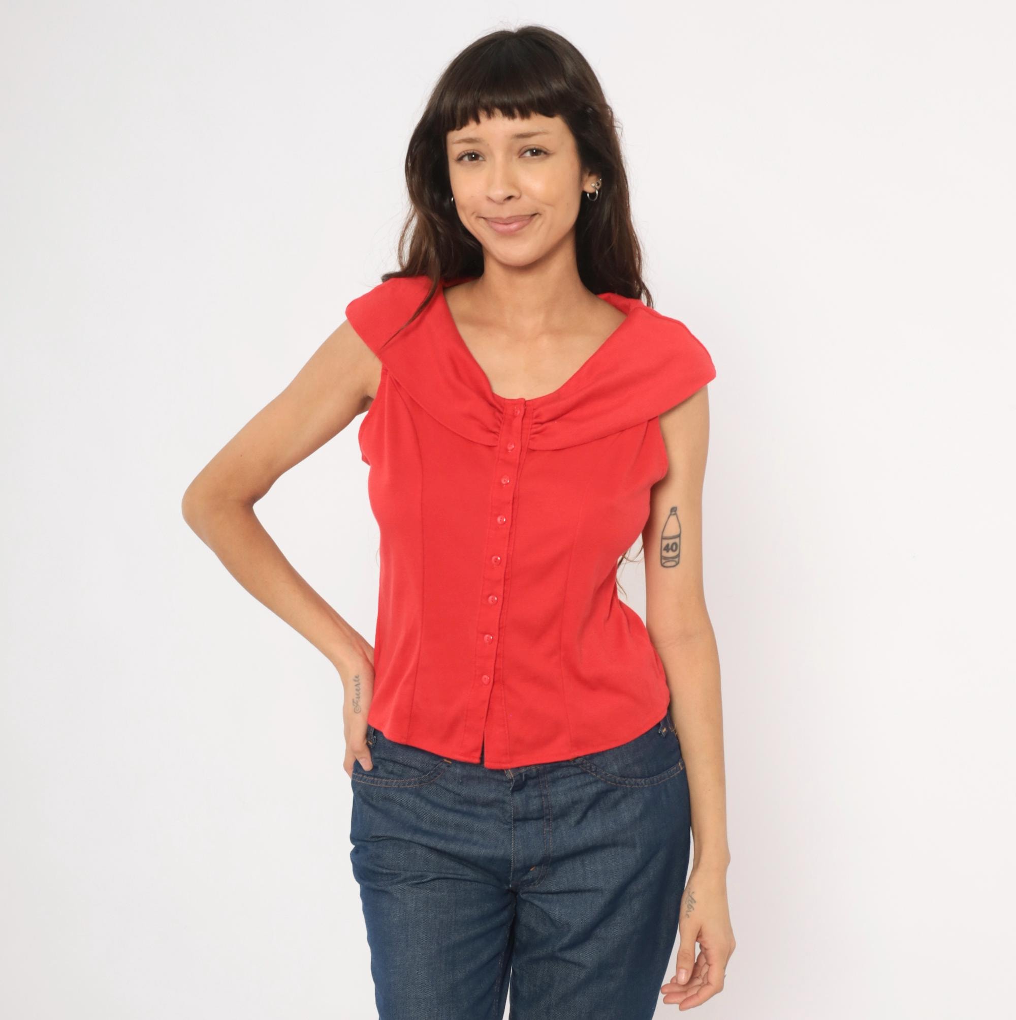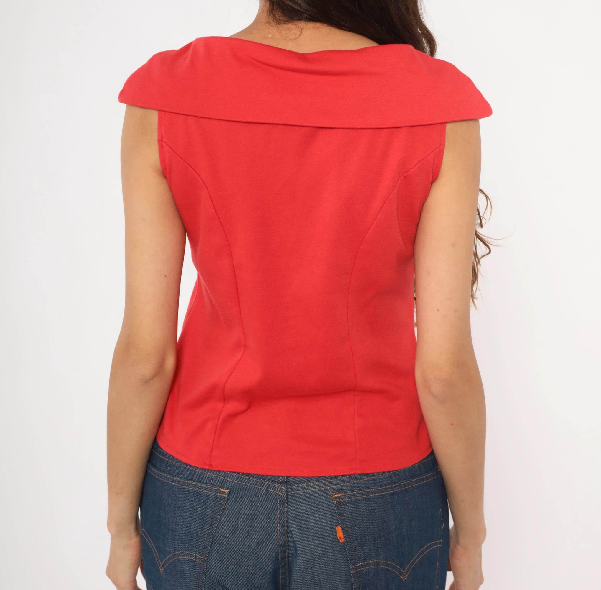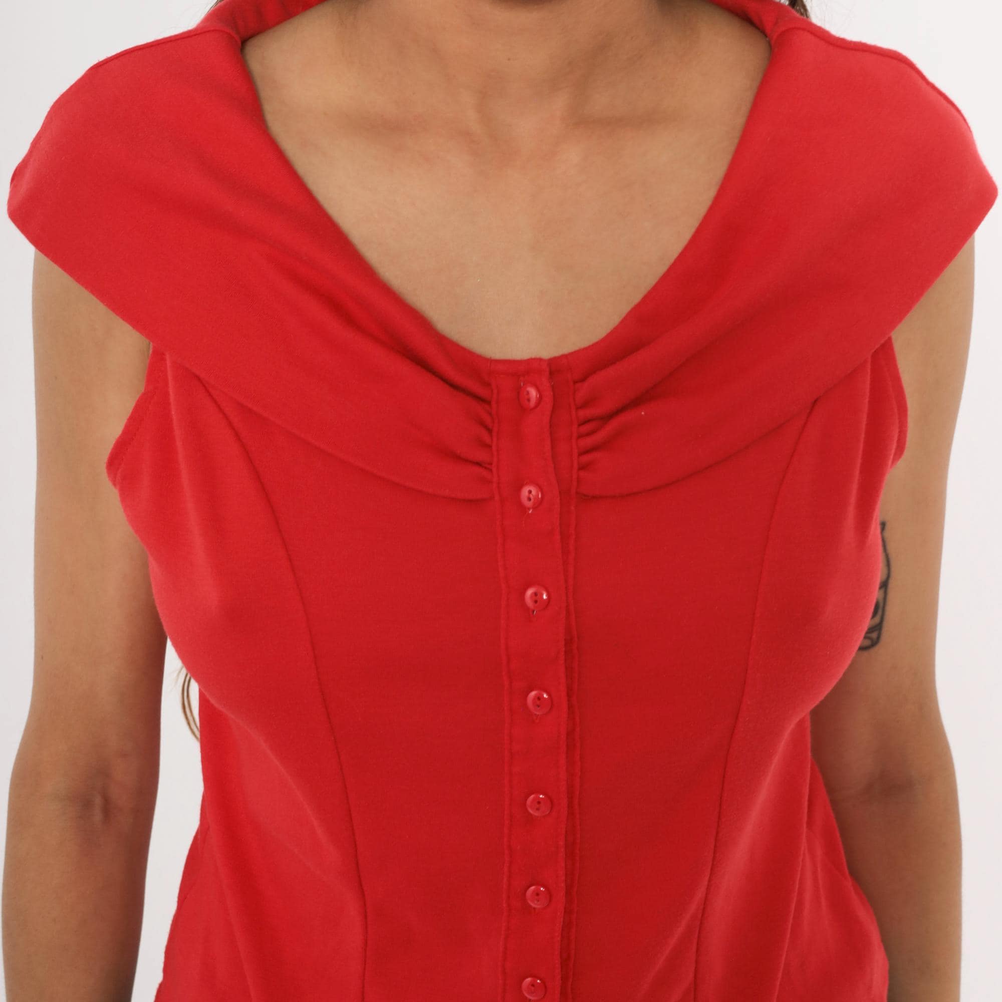 90s red button front blouse from Dirty Dancing with a wide cowl neckline, cap sleeves, and corset-style vertical seaming through the bodice. Small tonal buttons run the full center front, with gathered ruching at the neckline center. The back has a matching cowl collar fold-over and the same fitted panel construction.