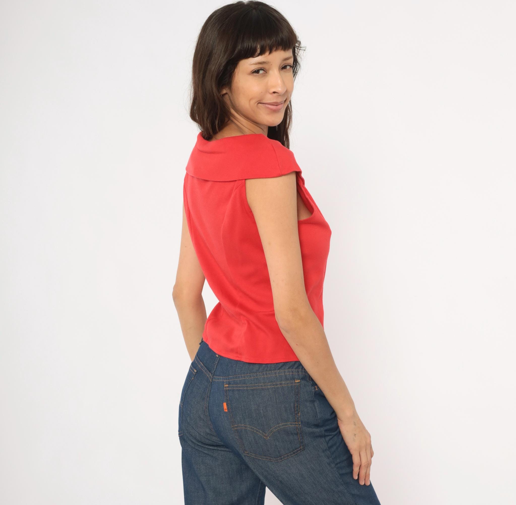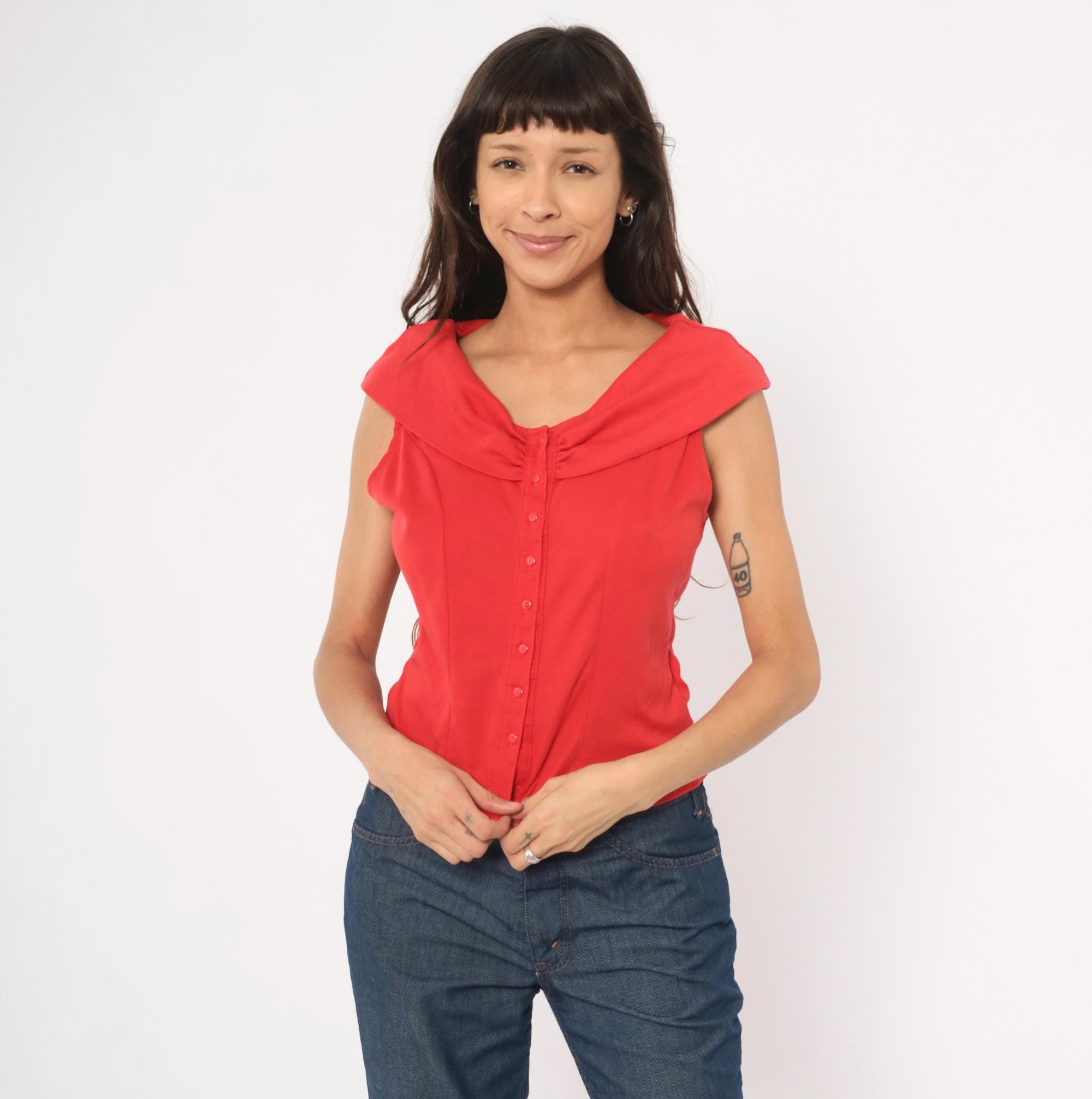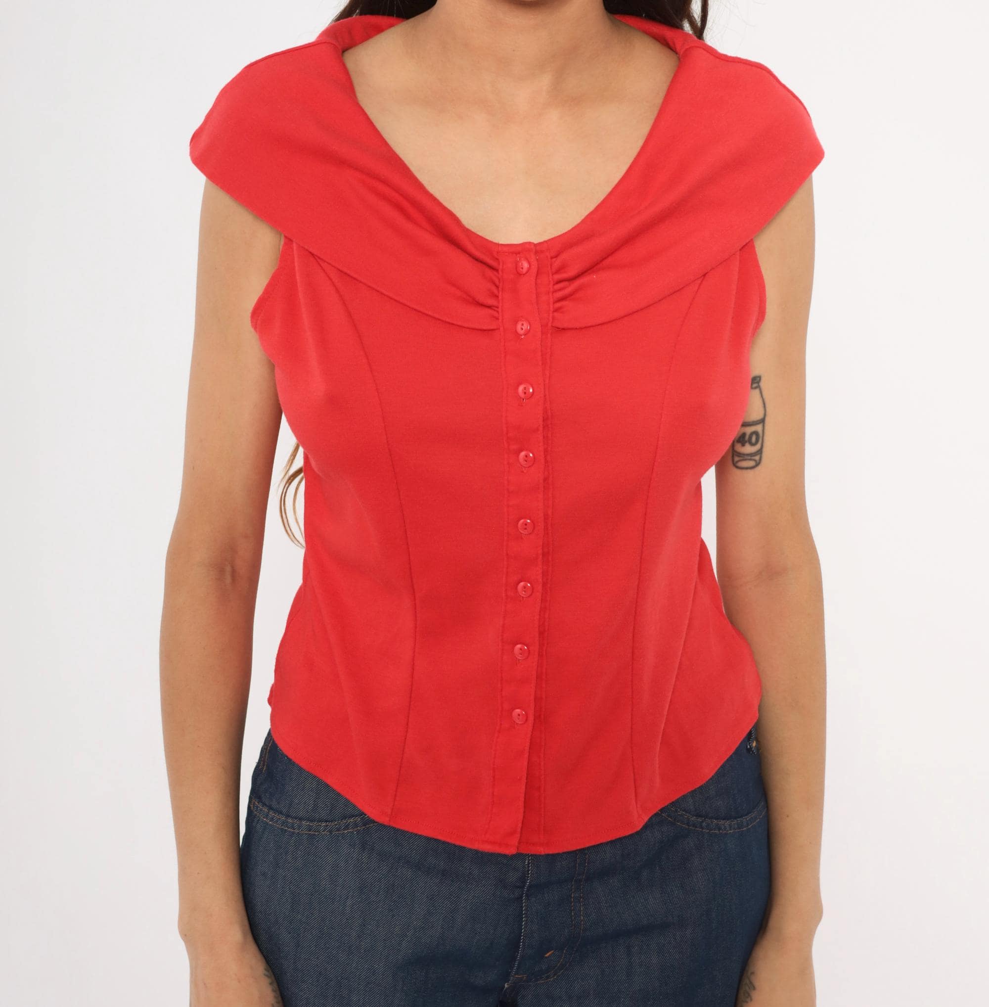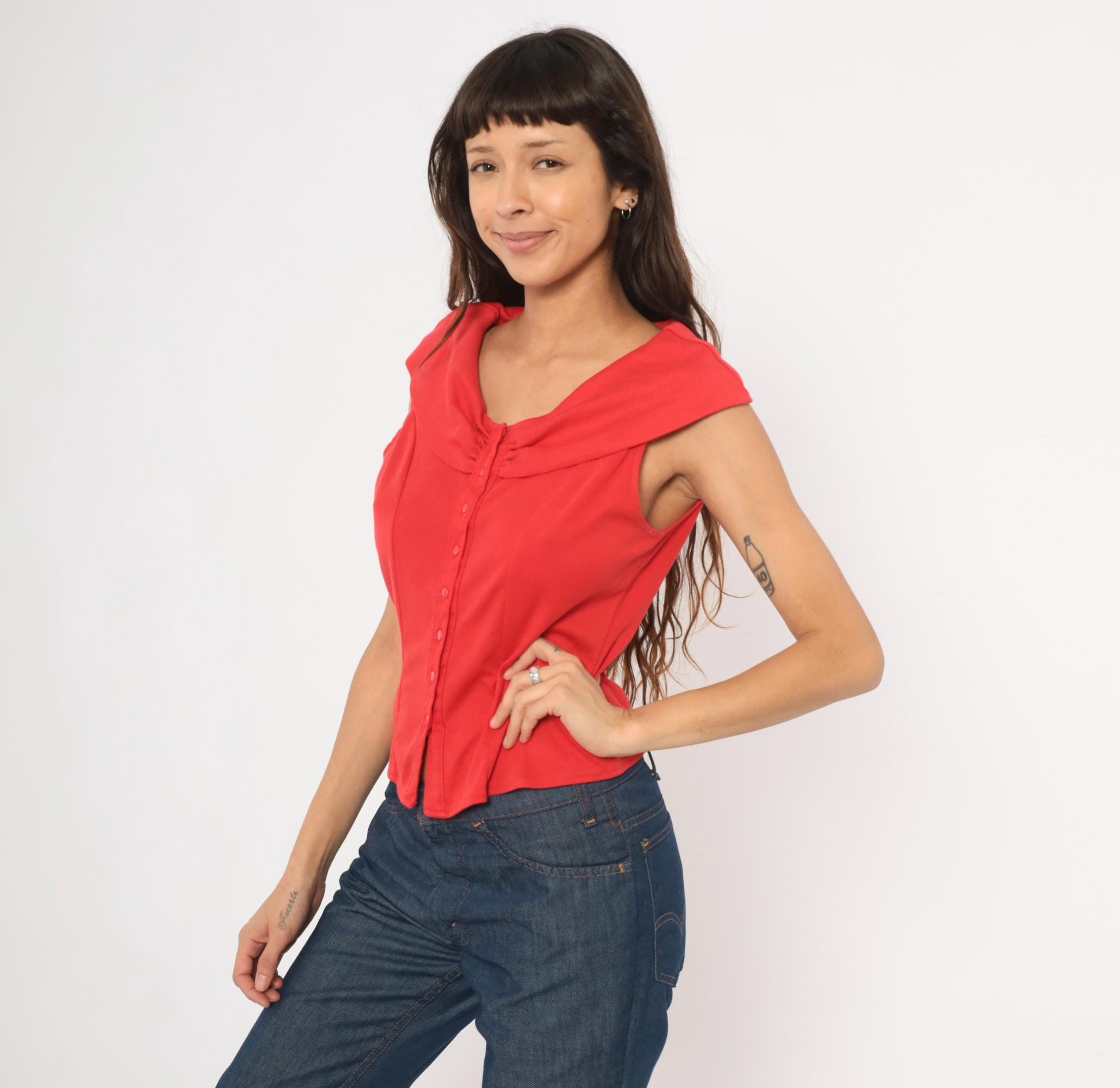 90s red button front blouse from Dirty Dancing with a wide cowl neckline, cap sleeves, and corset-style vertical seaming through the bodice. Small tonal buttons run the full center front, with gathered ruching at the neckline center. The back has a matching cowl collar fold-over and the same fitted panel construction.