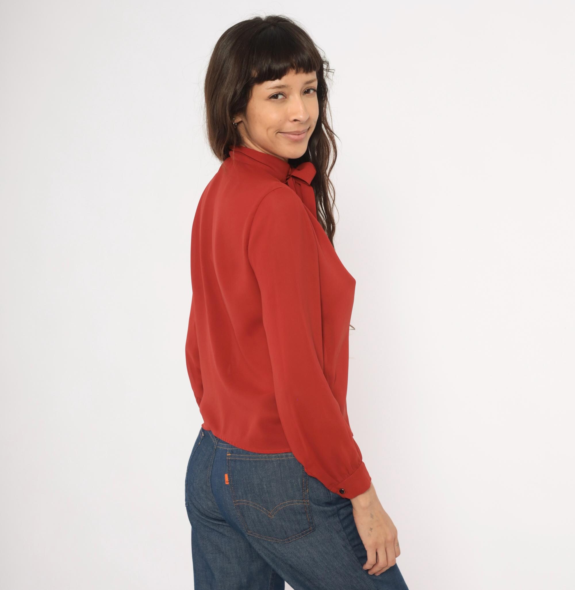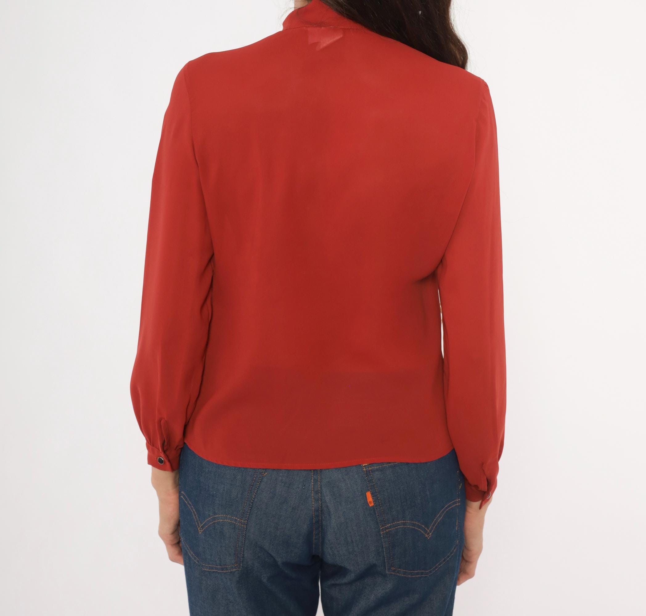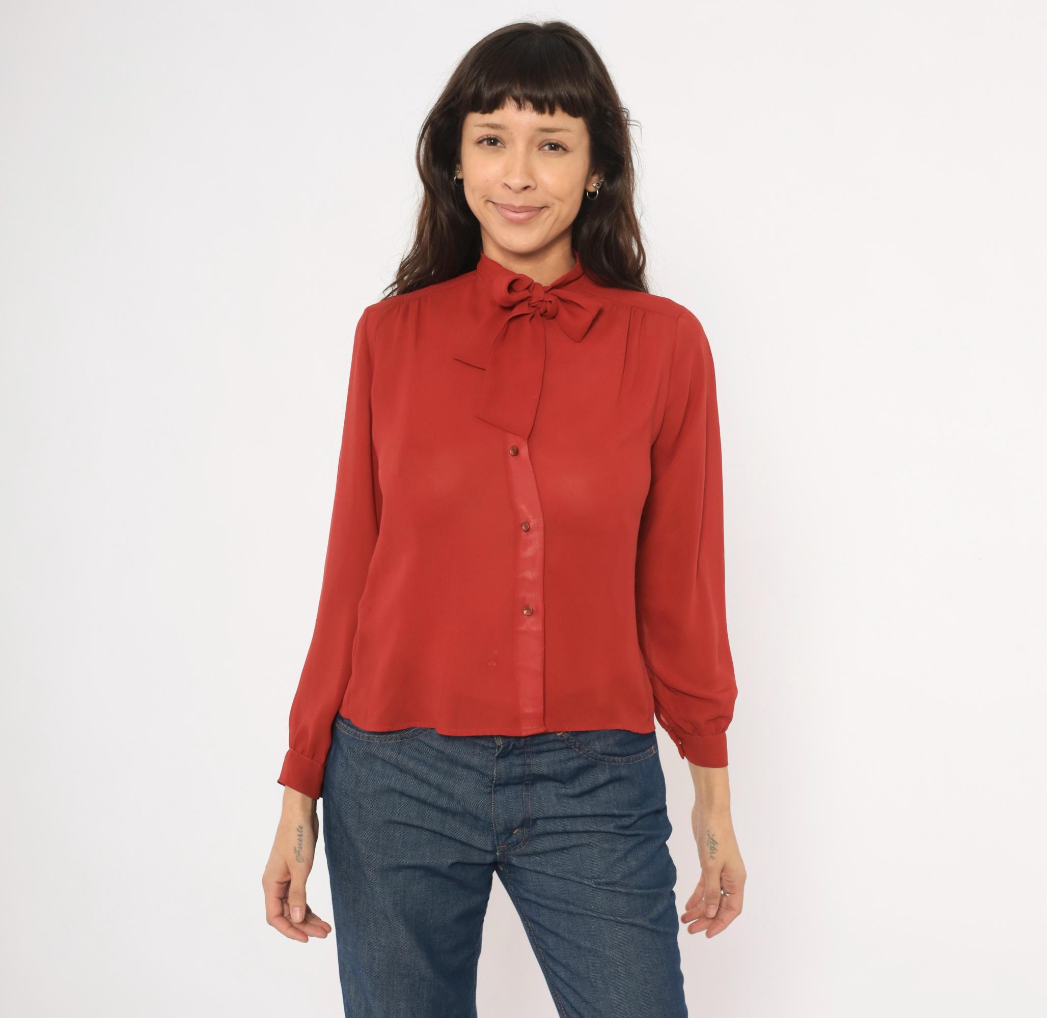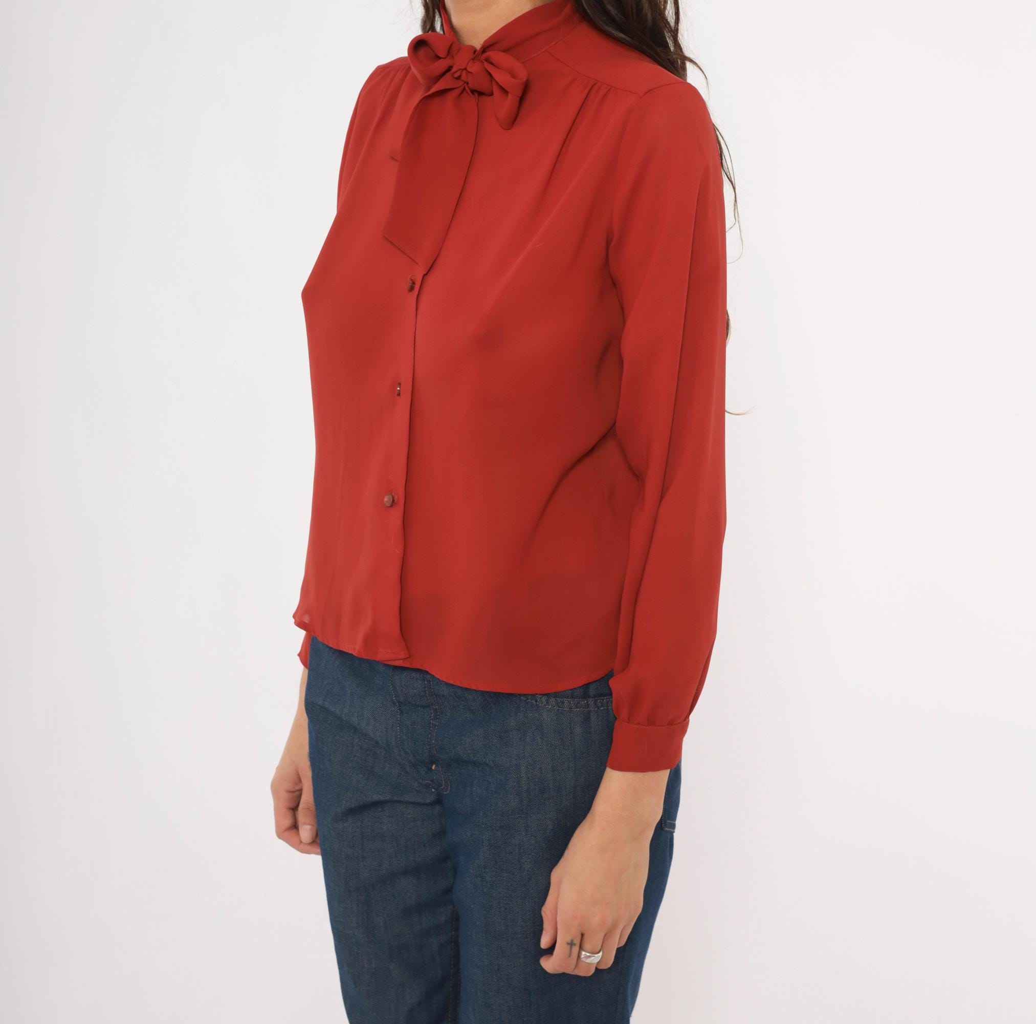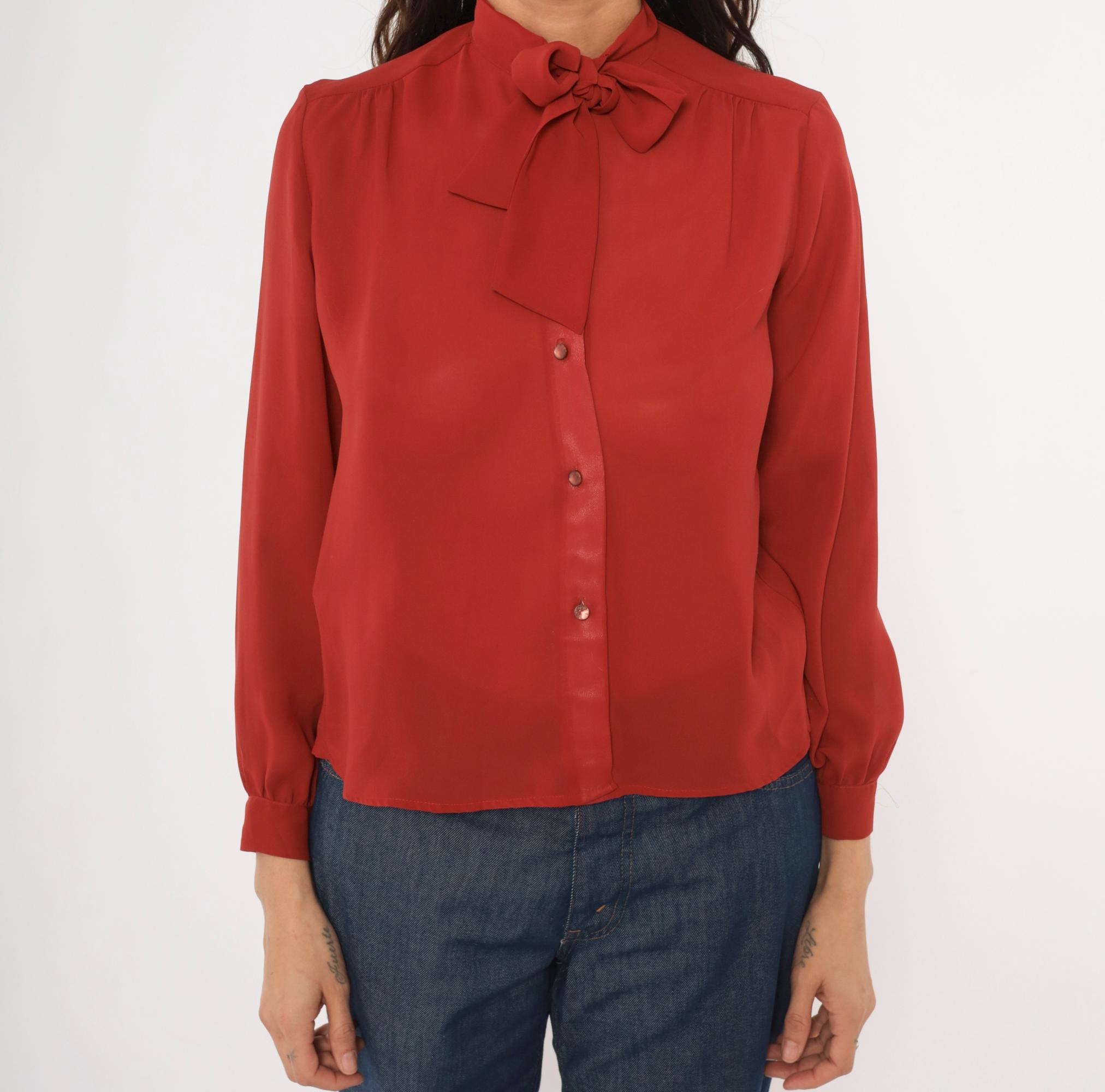 70s rust bow neck blouse from Kanga Petite with a tied pussy bow collar and button front closure. Long gathered sleeves with buttoned cuffs, and soft shoulder gathering across the yoke. Semi-sheer construction in a rich terra cotta copper tone, with tone-on-tone buttons down the center front.