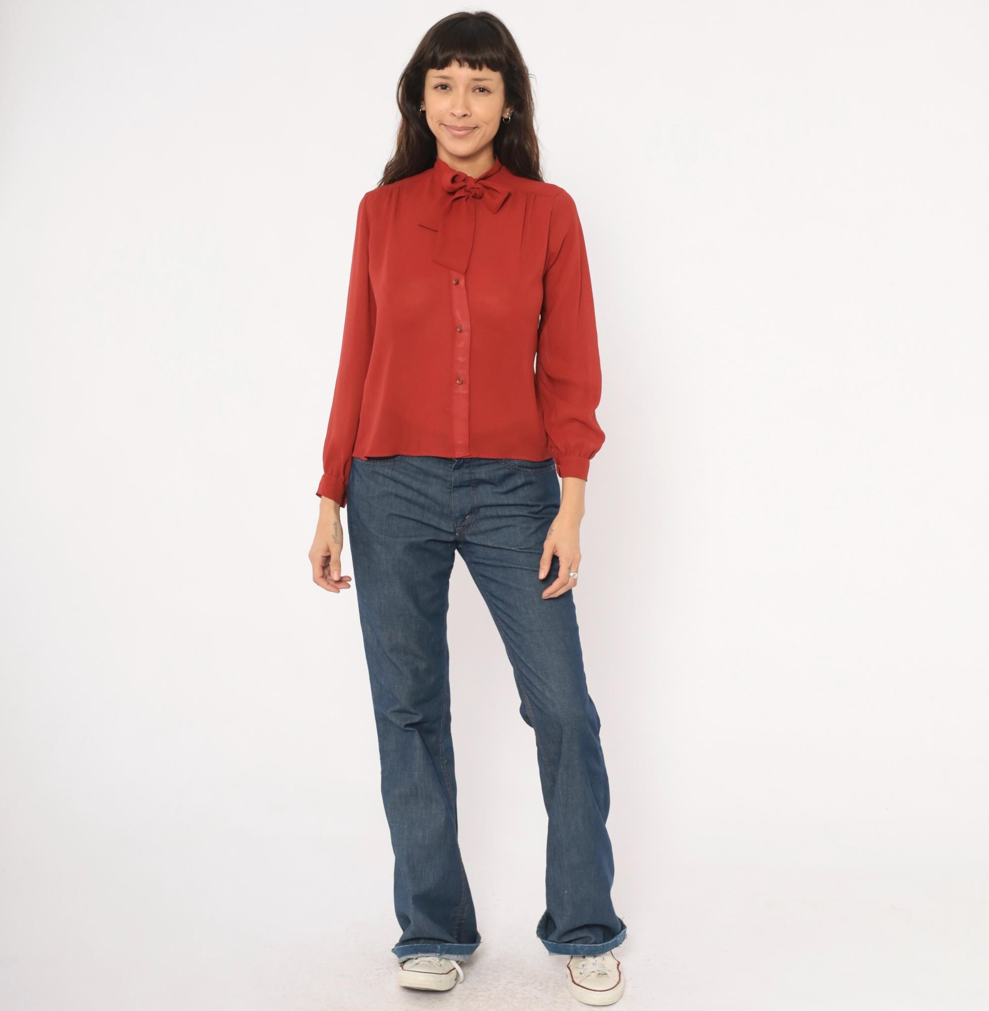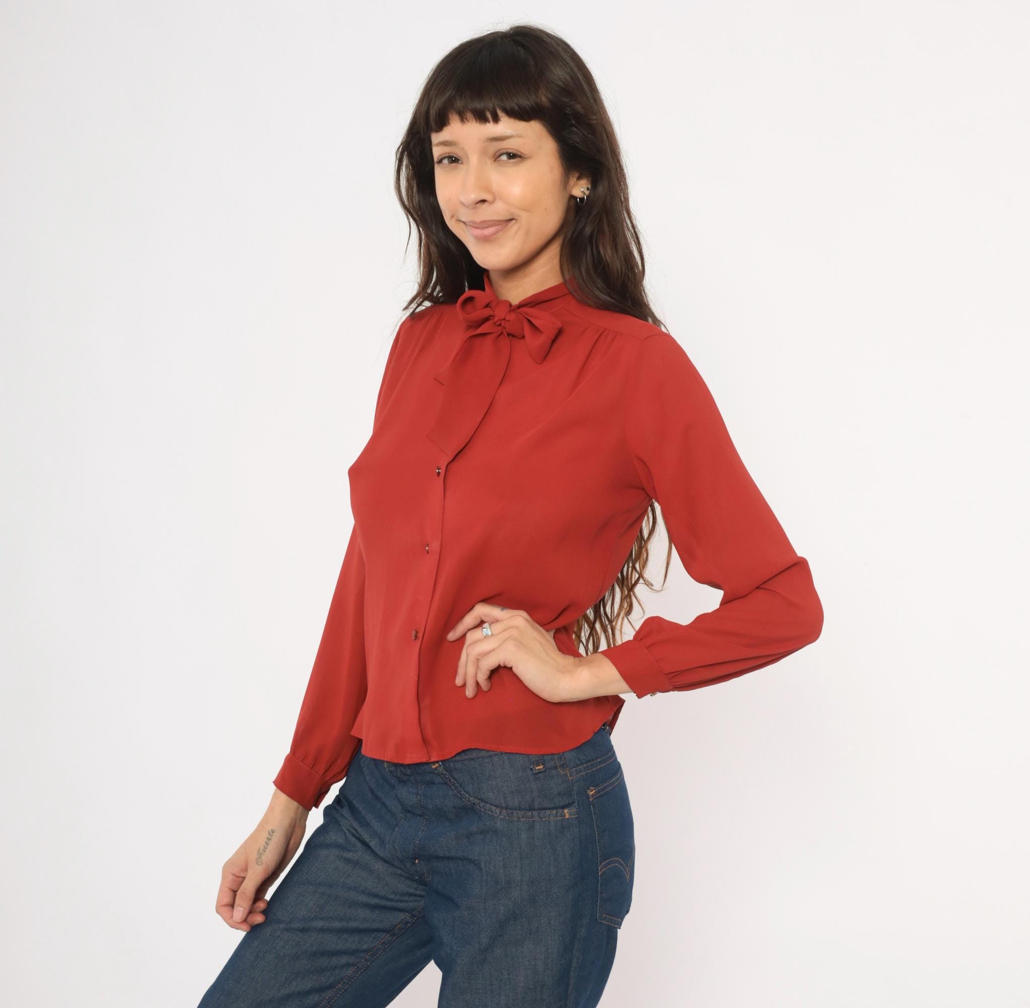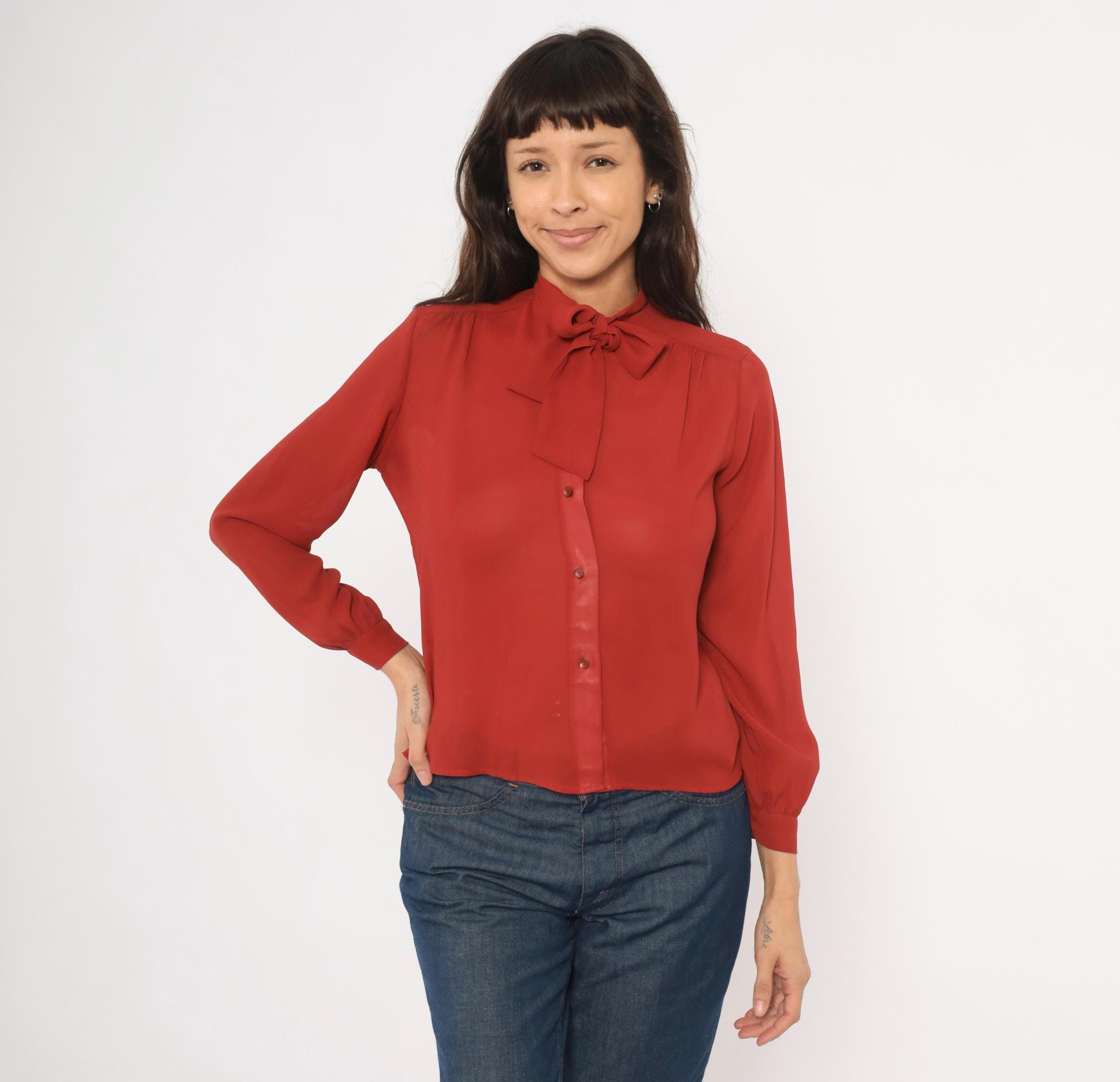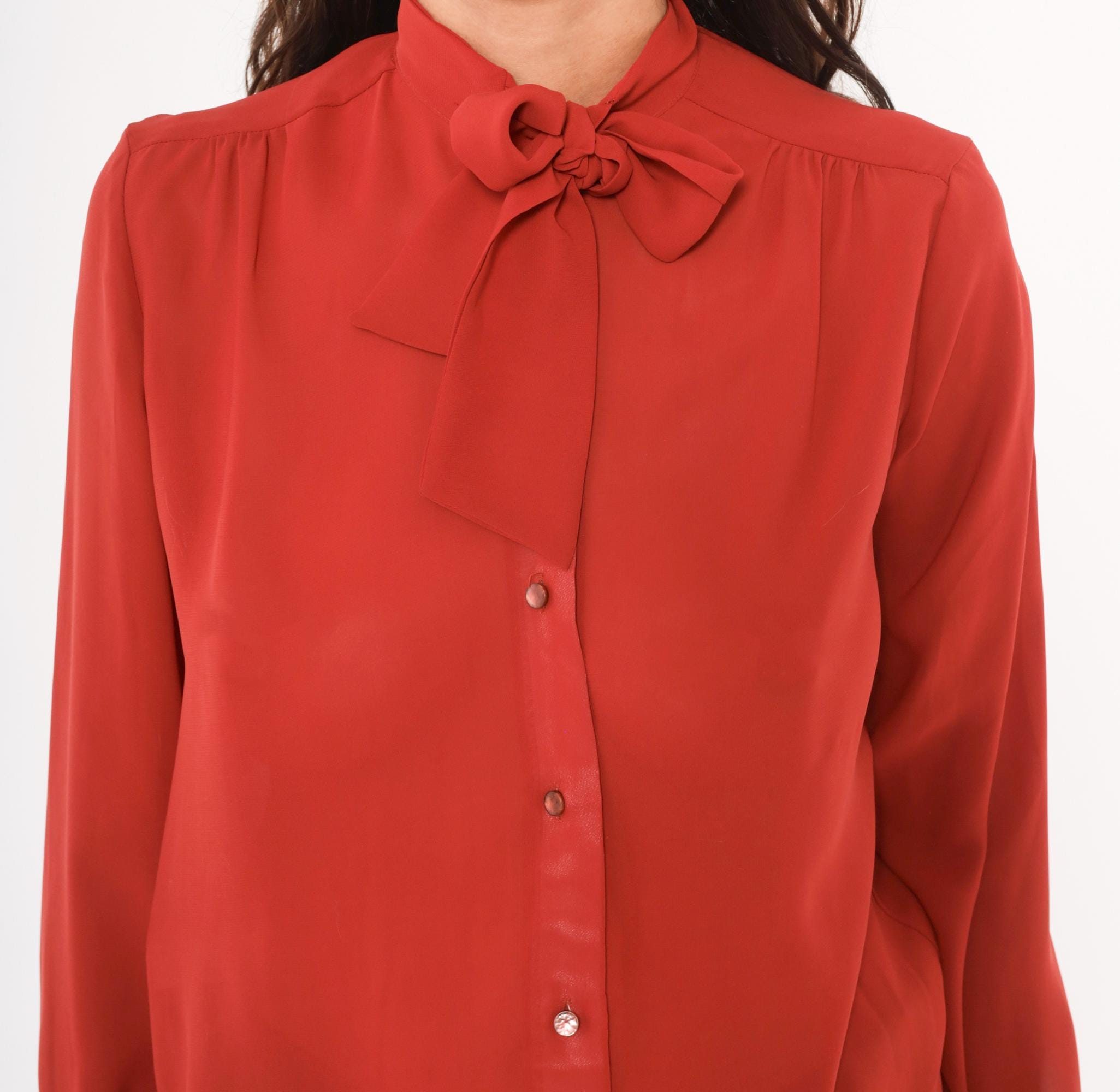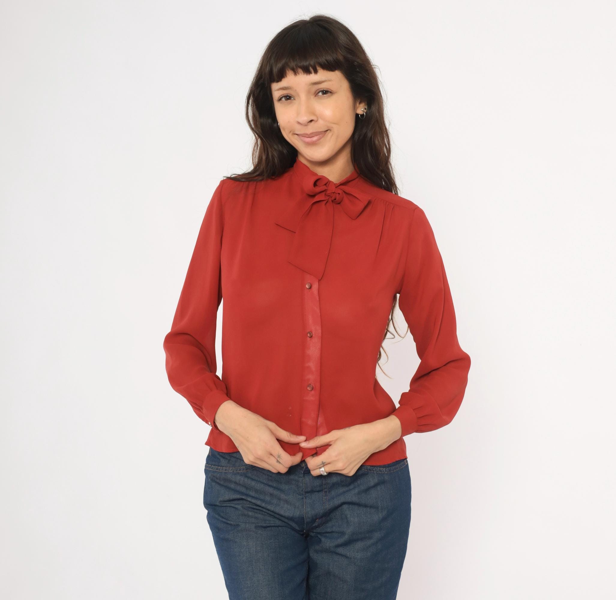 70s rust bow neck blouse from Kanga Petite with a tied pussy bow collar and button front closure. Long gathered sleeves with buttoned cuffs, and soft shoulder gathering across the yoke. Semi-sheer construction in a rich terra cotta copper tone, with tone-on-tone buttons down the center front.