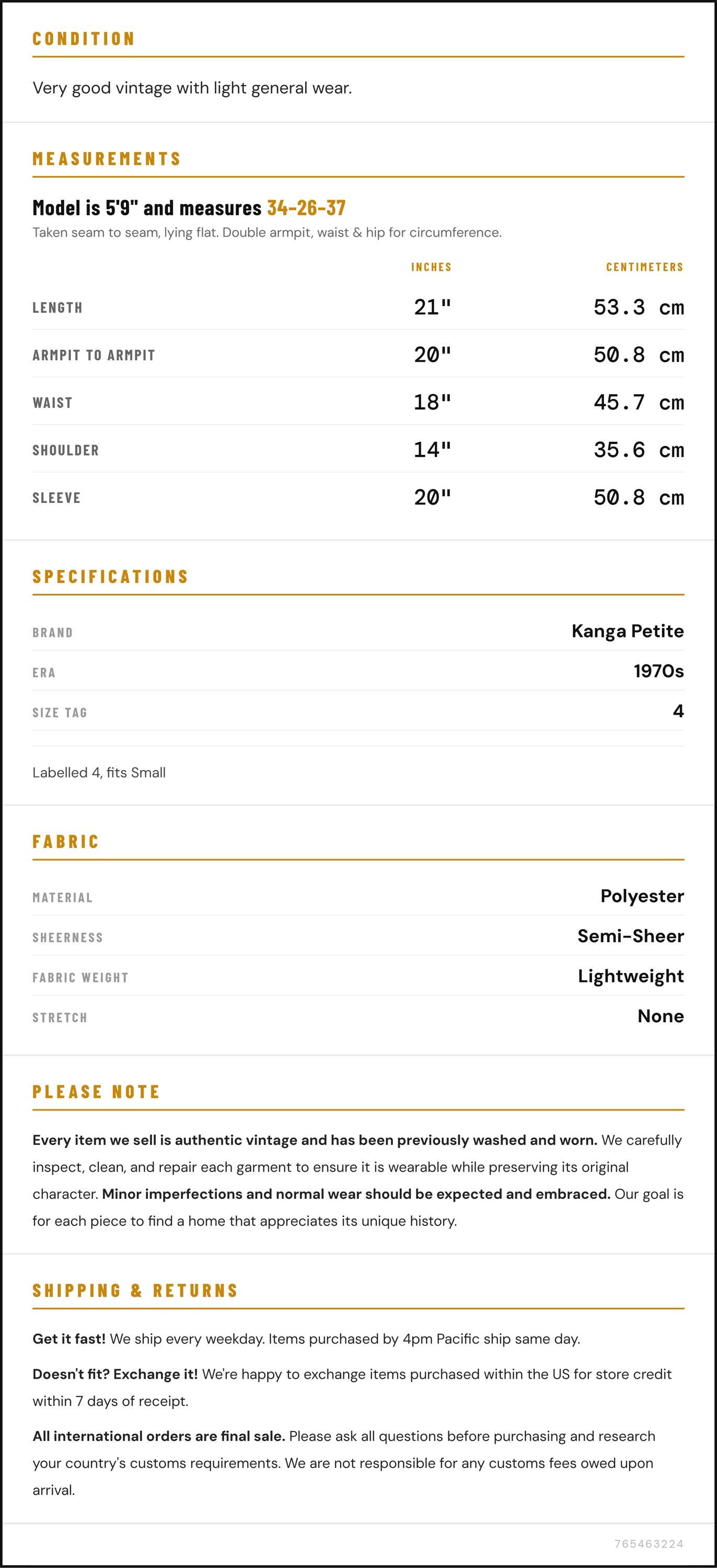 Taken from seam to seam while the garment is lying flat. Double the armpit, waist, and hip measurements.