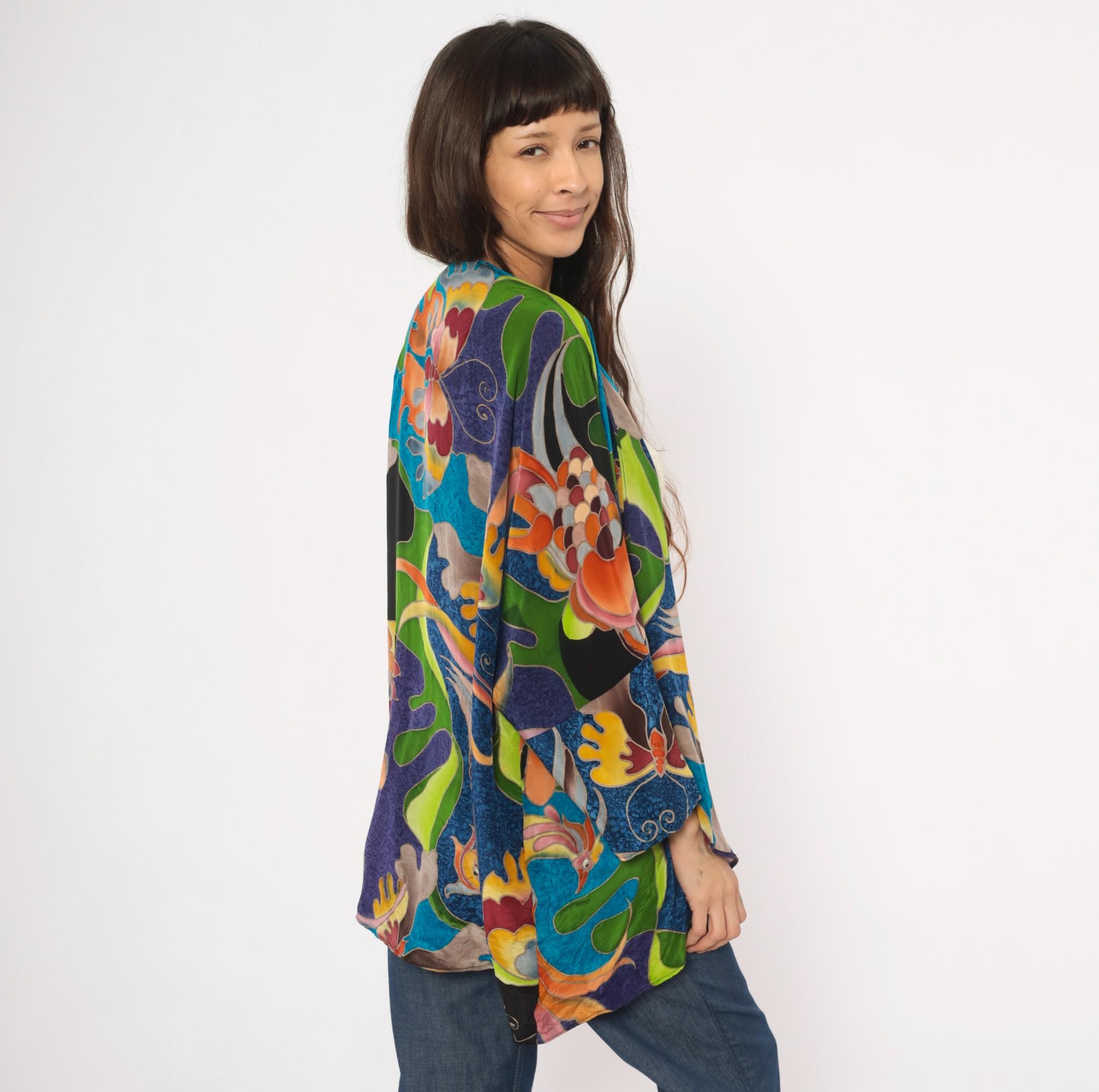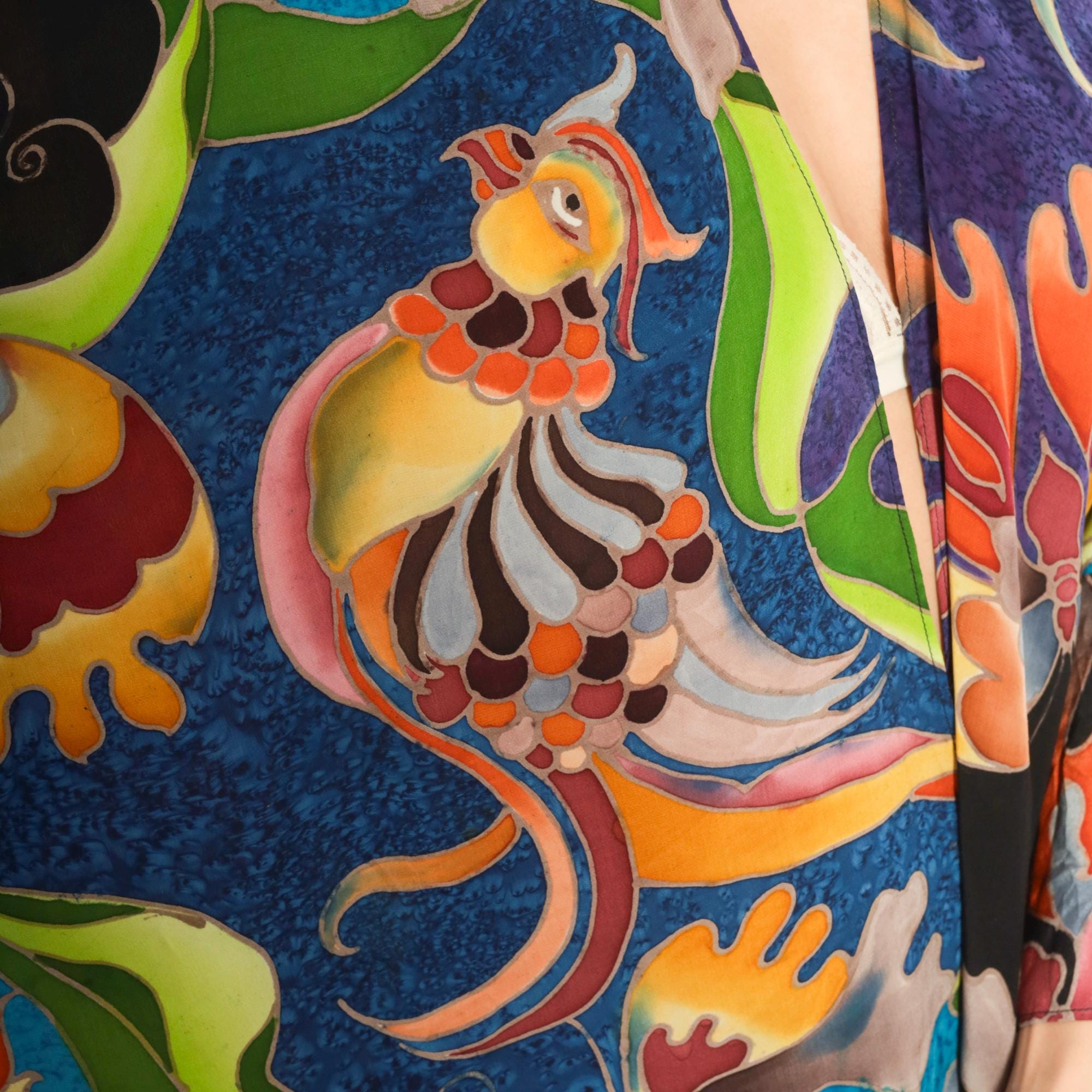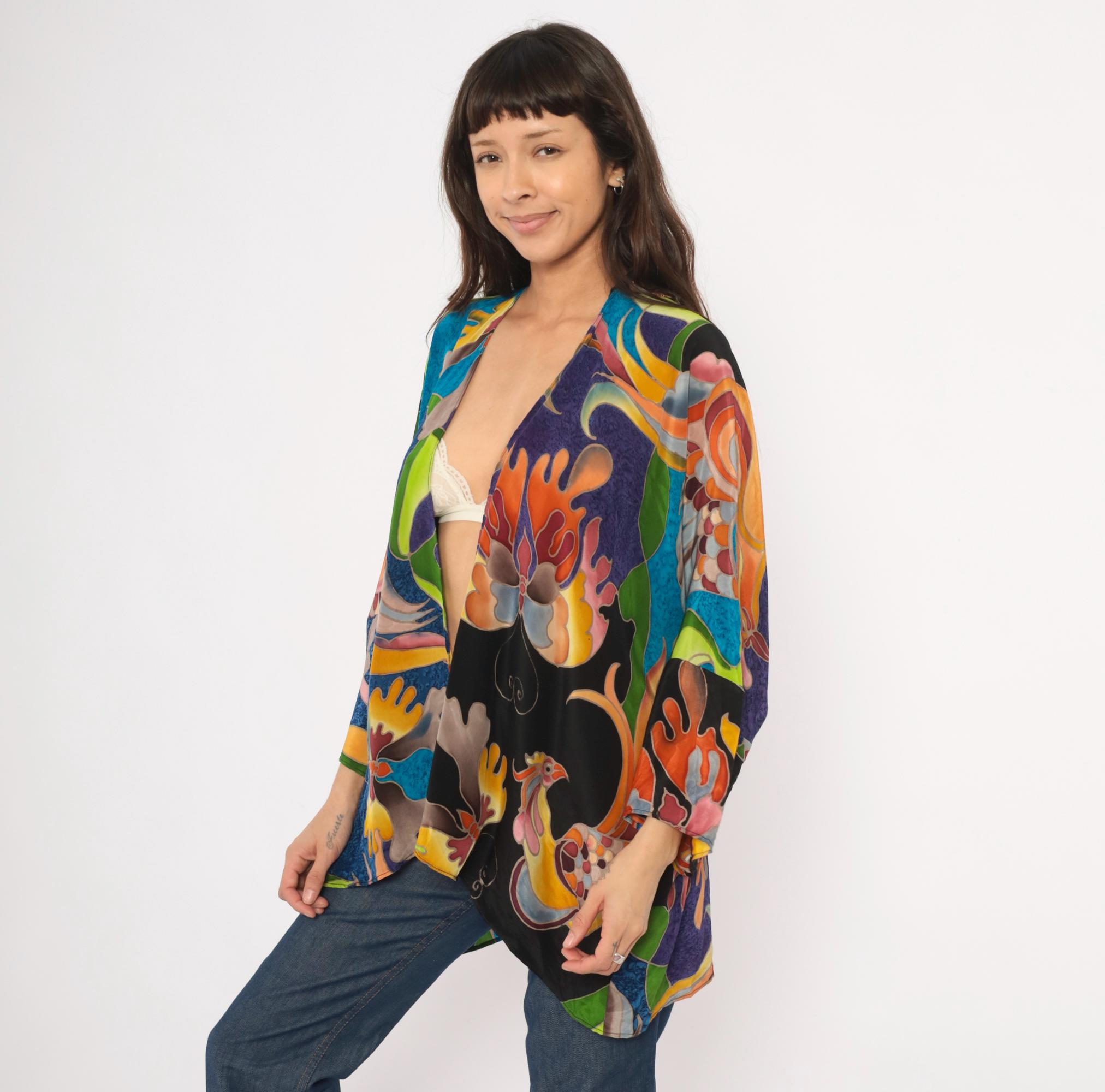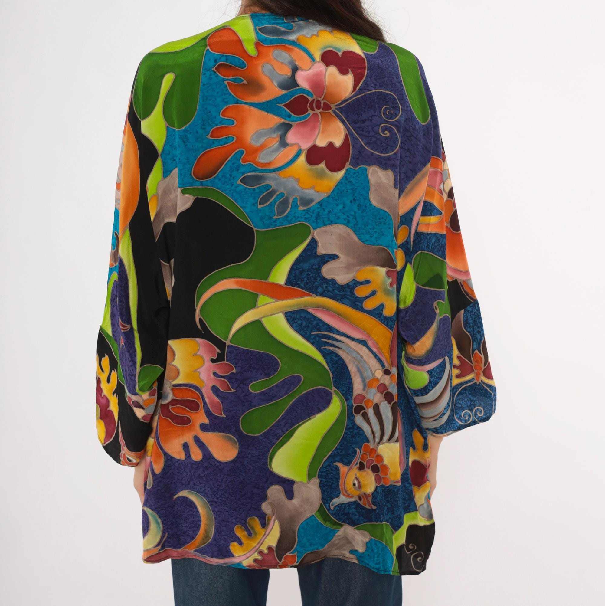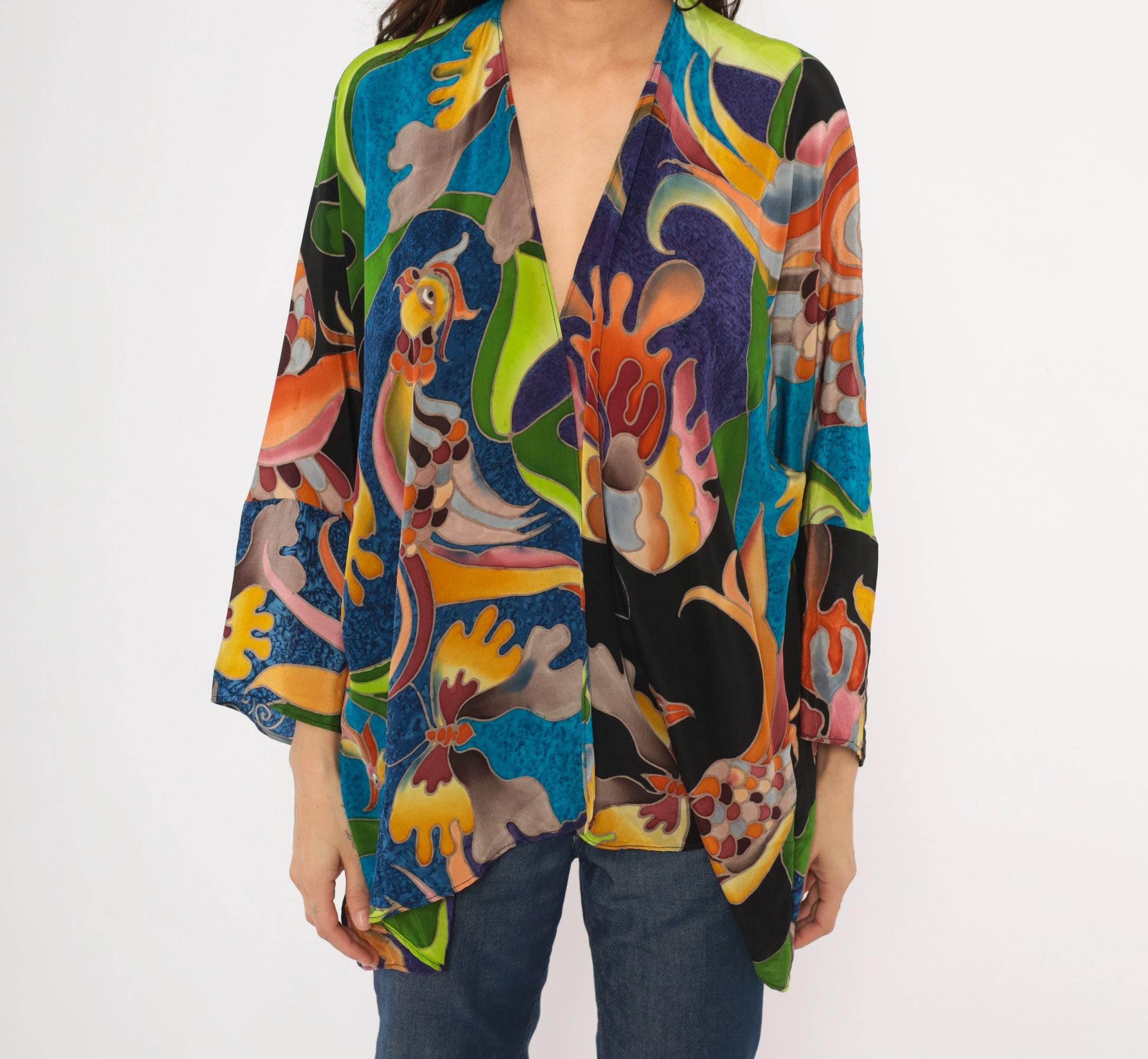 2000s silk kimono jacket from Deeva with an open front, V-neckline, and wide three-quarter-length sleeves. Multicolor abstract design across the entire garment in teal, cobalt, purple, olive, chartreuse, orange, pink, and black, with stylized birds, swirling foliage, and coral-like organic shapes outlined in a batik-style resist technique. Dropped shoulder seams and a relaxed, drapey silhouette with an asymmetric curved hem.
