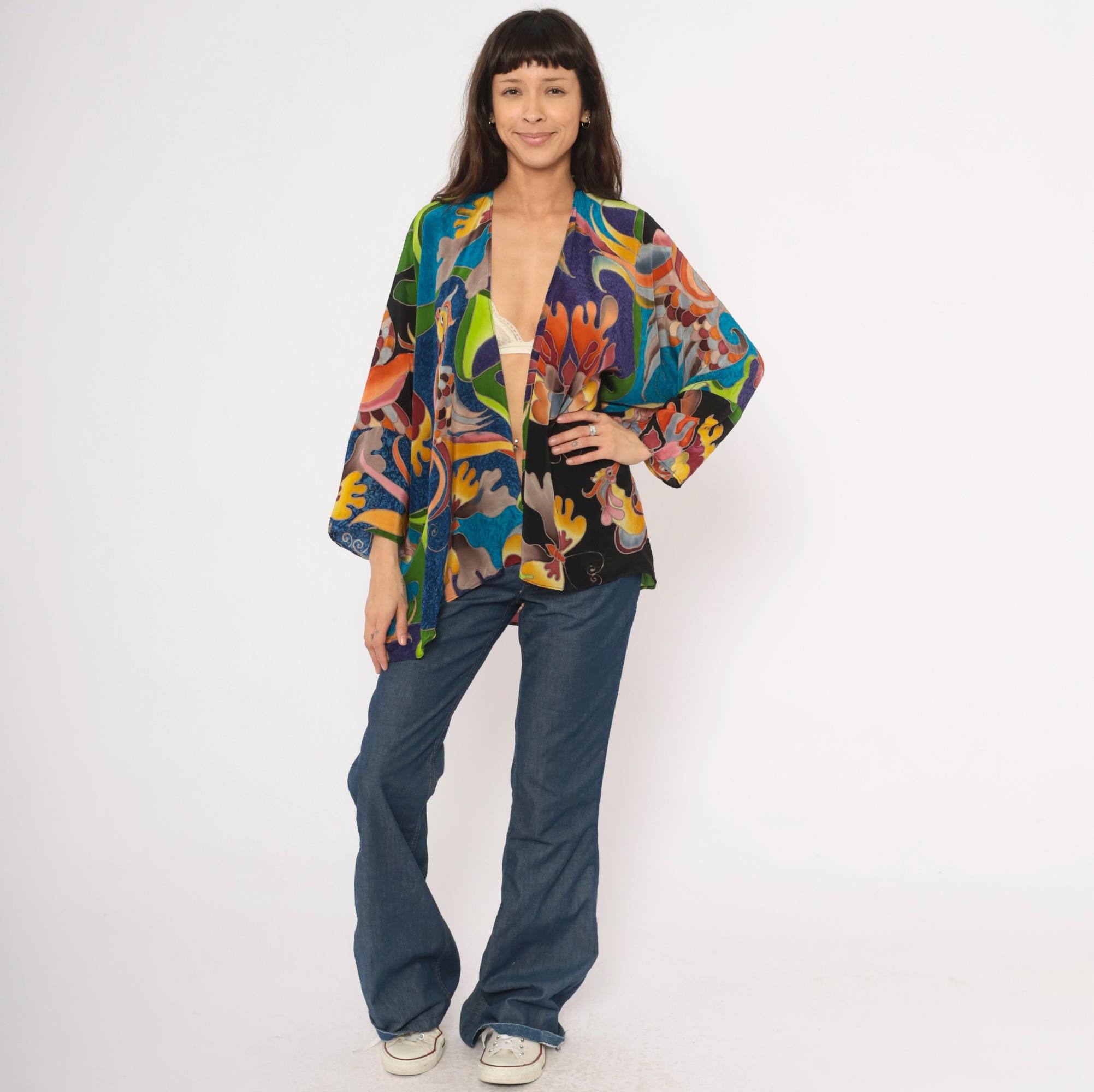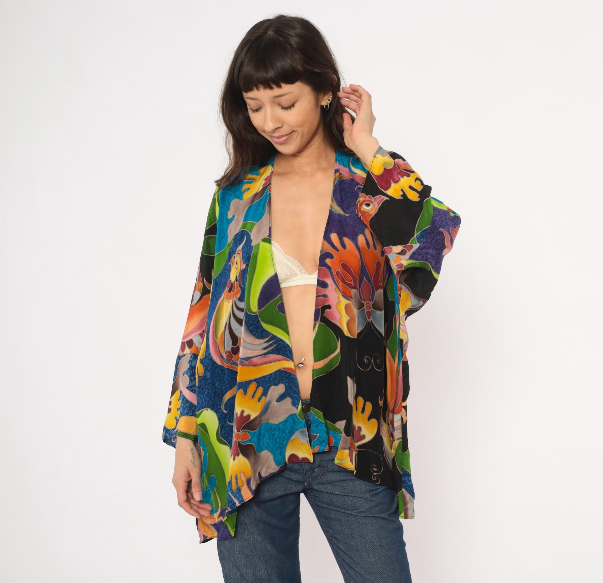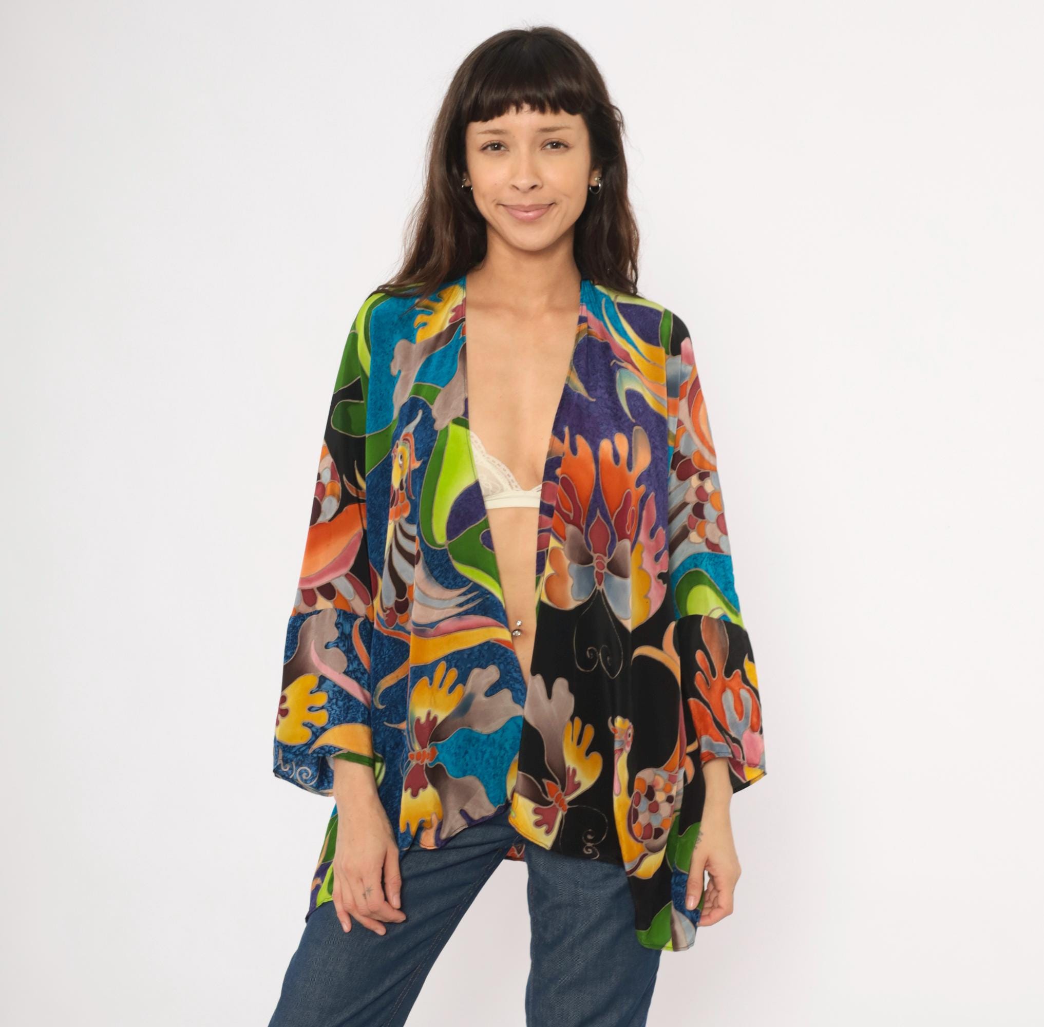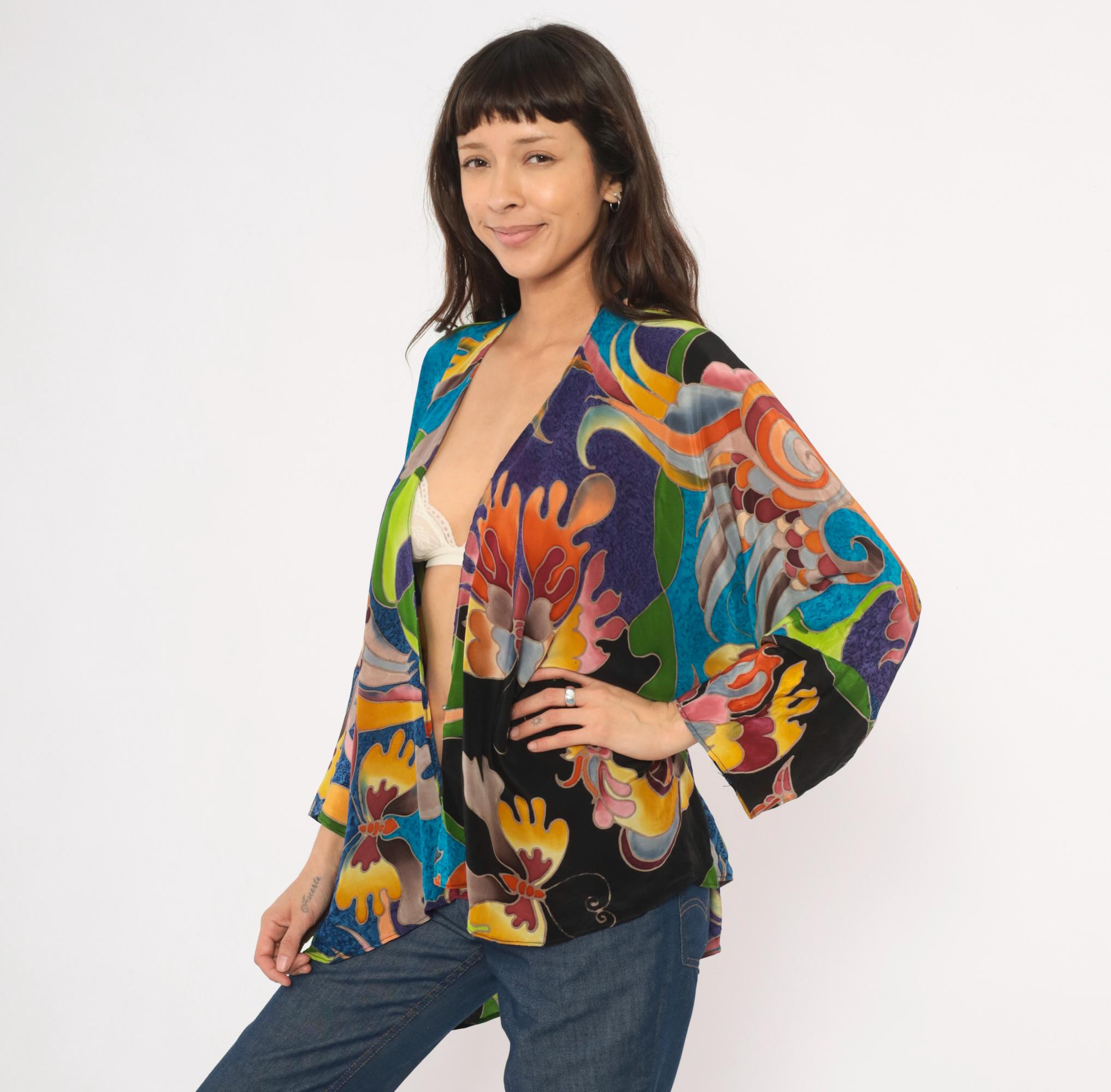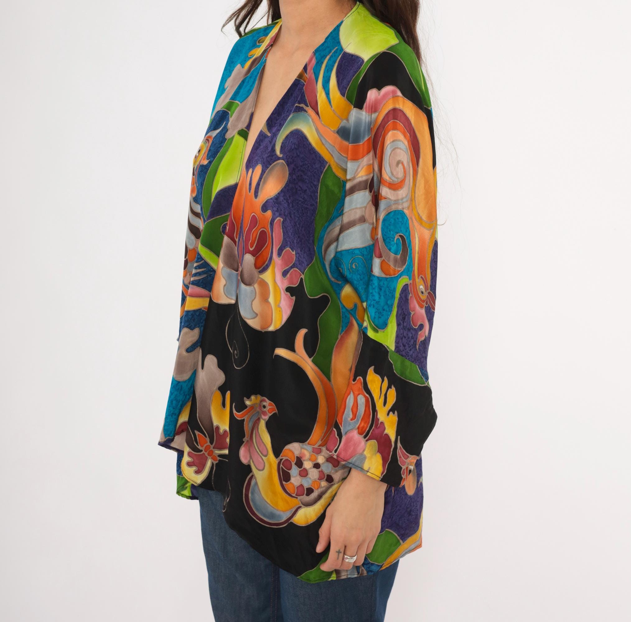2000s silk kimono jacket from Deeva with an open front, V-neckline, and wide three-quarter-length sleeves. Multicolor abstract design across the entire garment in teal, cobalt, purple, olive, chartreuse, orange, pink, and black, with stylized birds, swirling foliage, and coral-like organic shapes outlined in a batik-style resist technique. Dropped shoulder seams and a relaxed, drapey silhouette with an asymmetric curved hem.