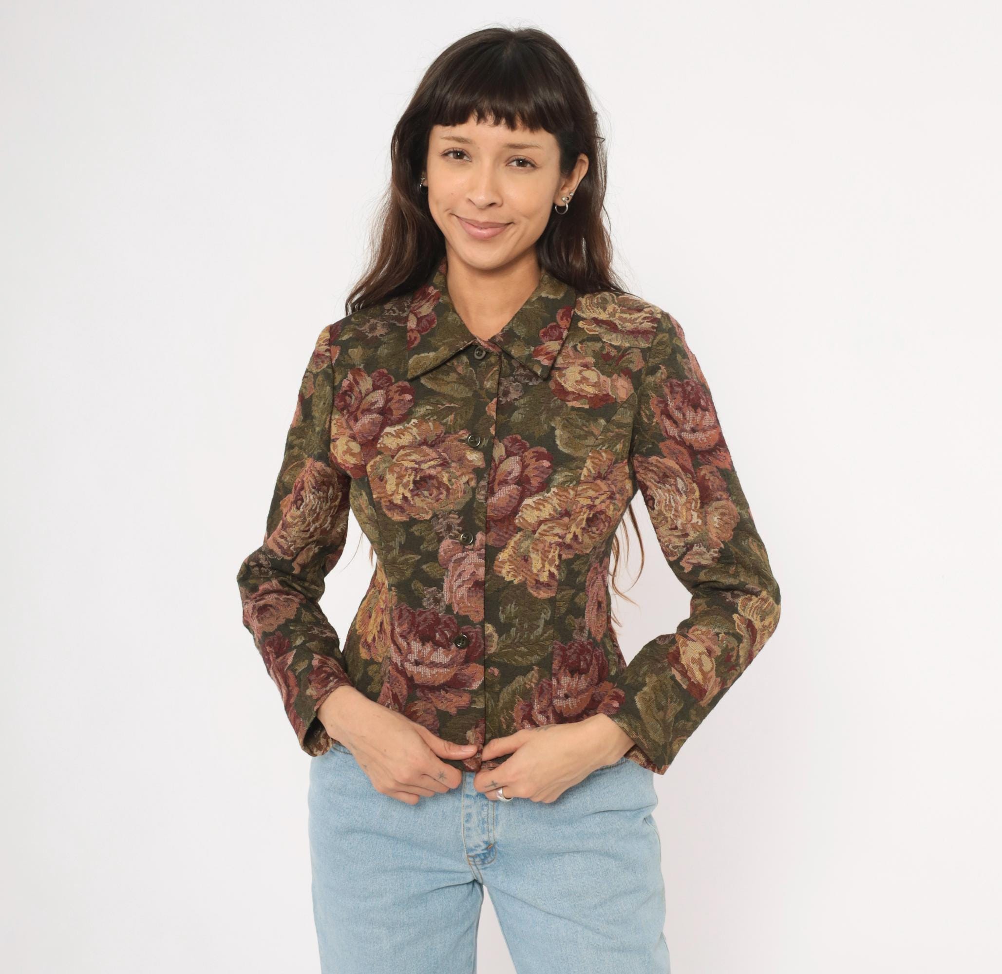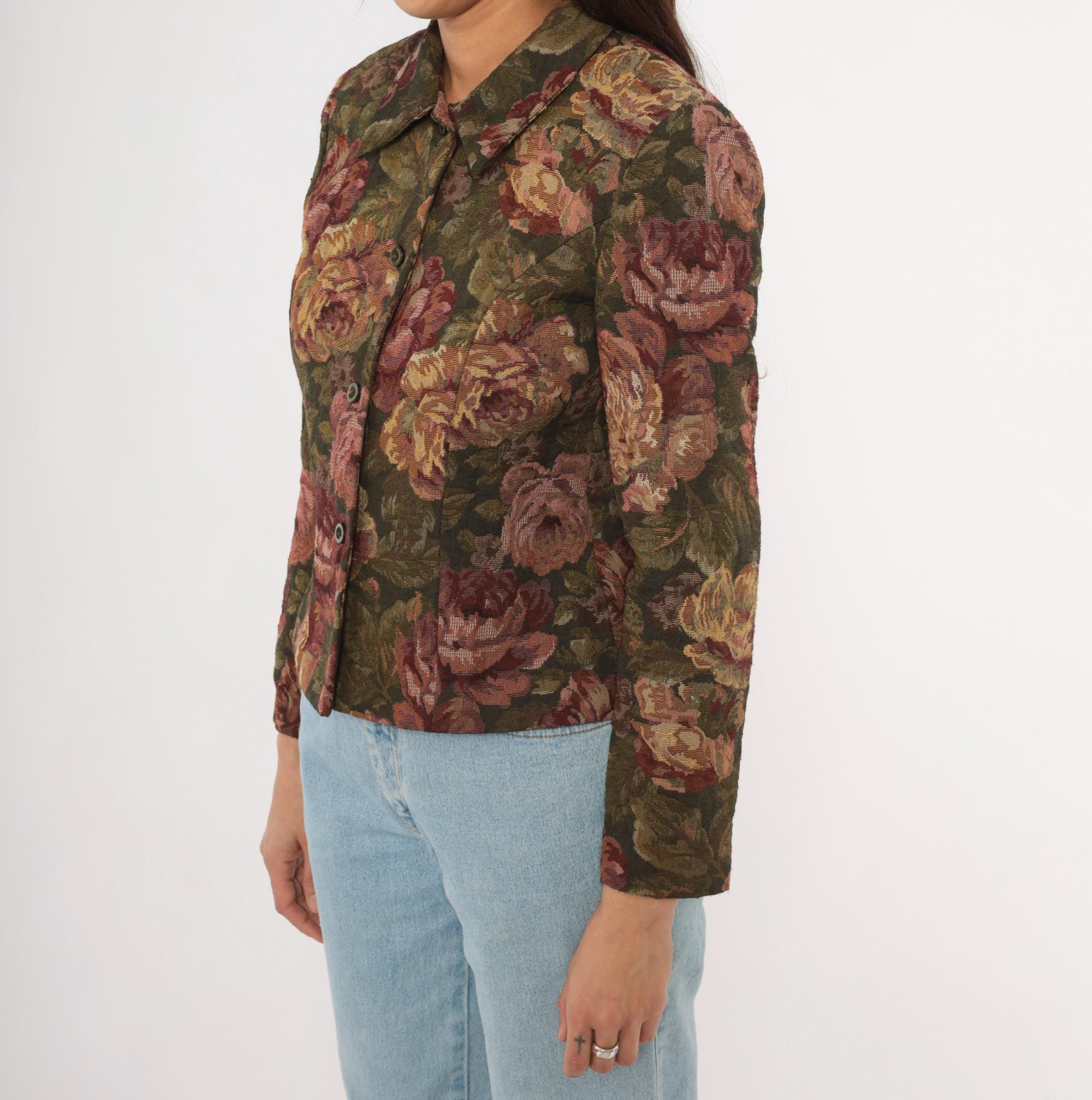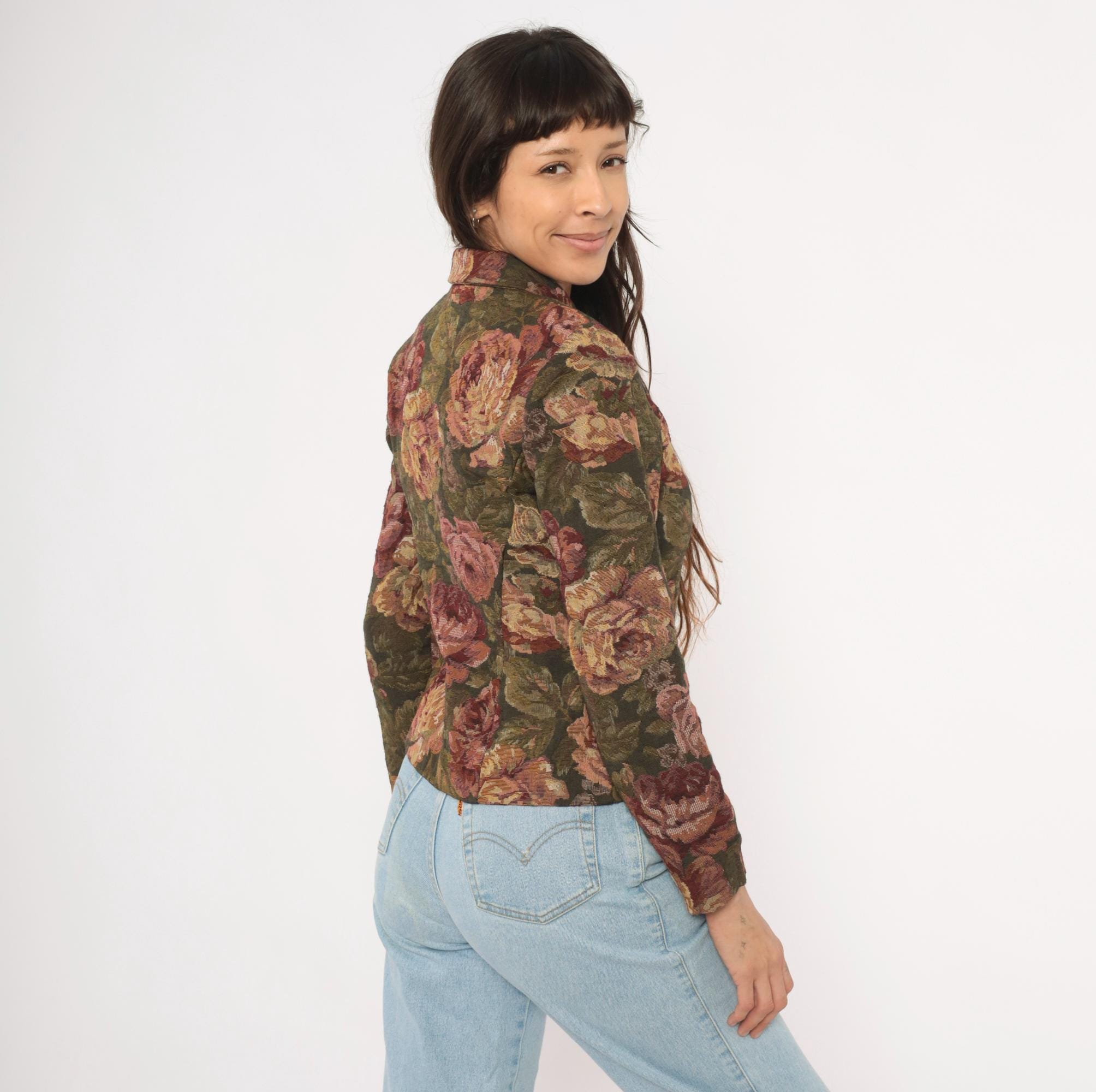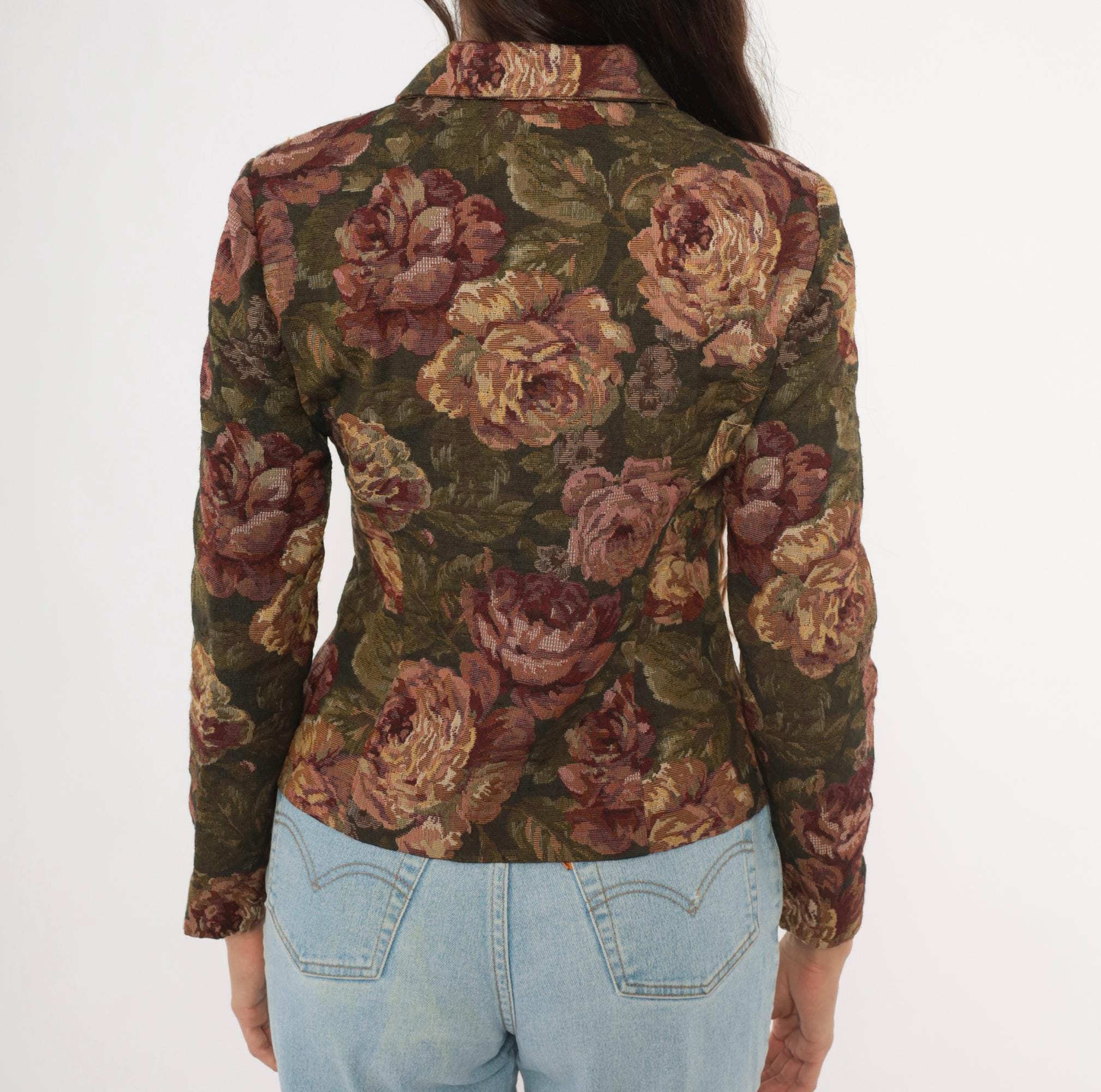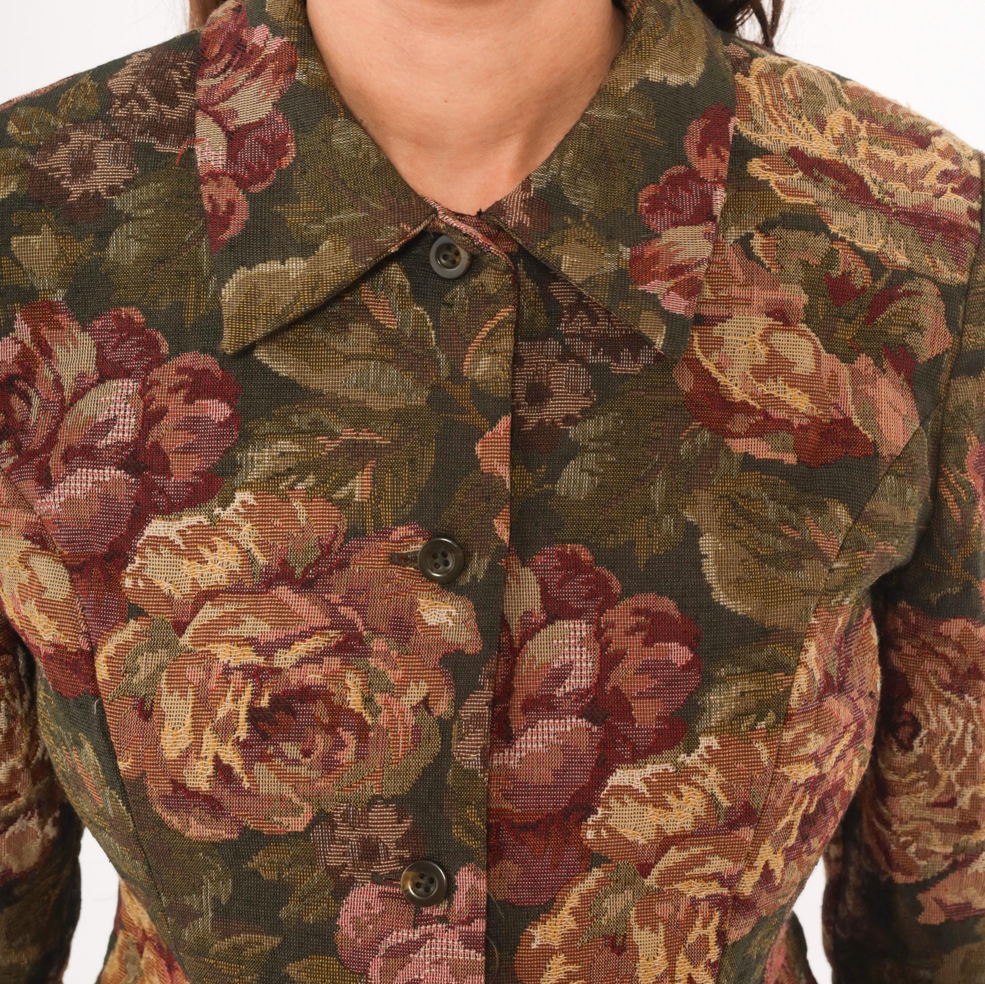 90s floral tapestry jacket from Jessica Howard with a woven rose pattern in burgundy, mauve, gold, and olive green tones. Pointed collar, button front closure with dark buttons, and long sleeves. Fitted silhouette with structured shoulders and a slightly tapered waist.