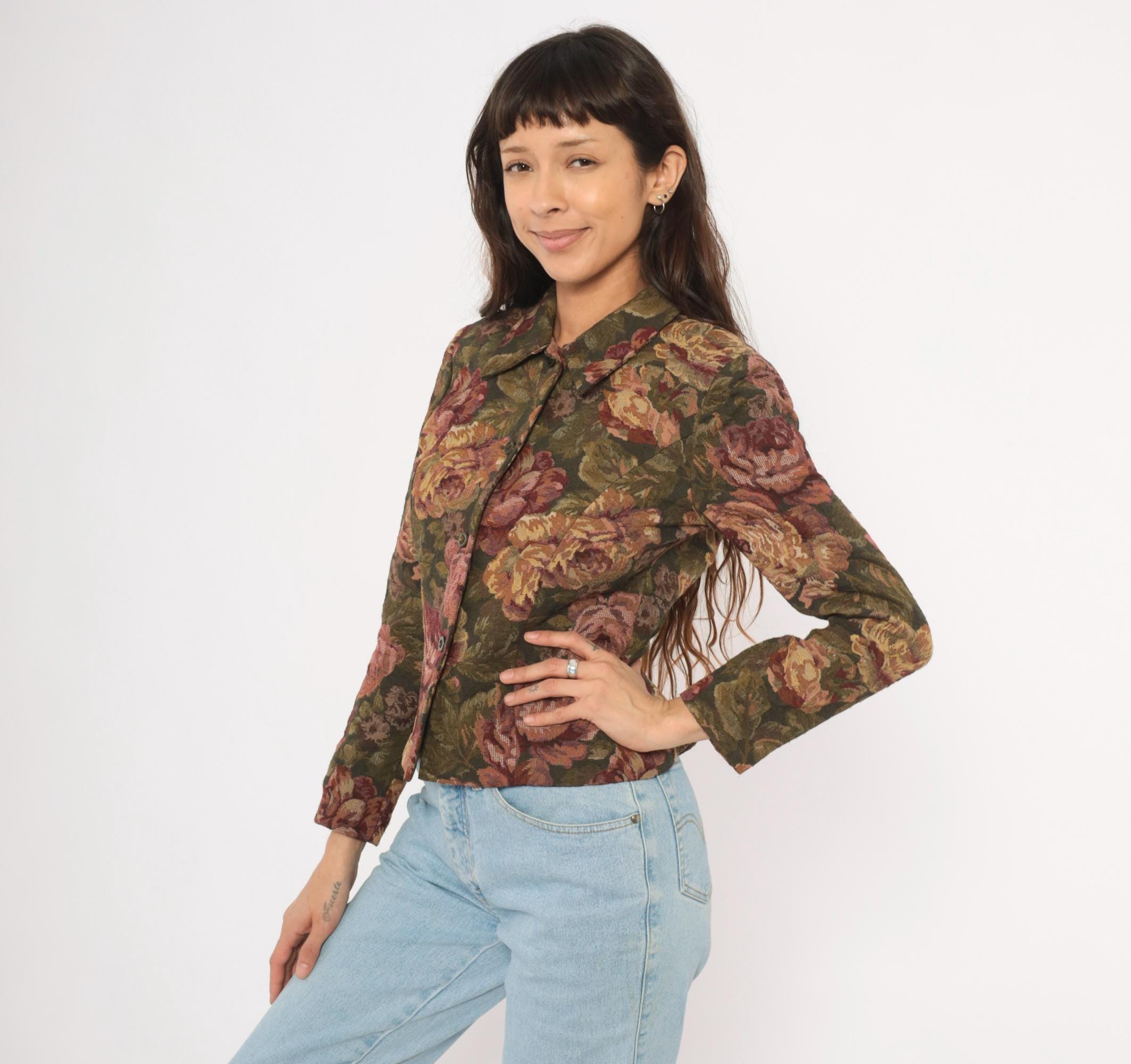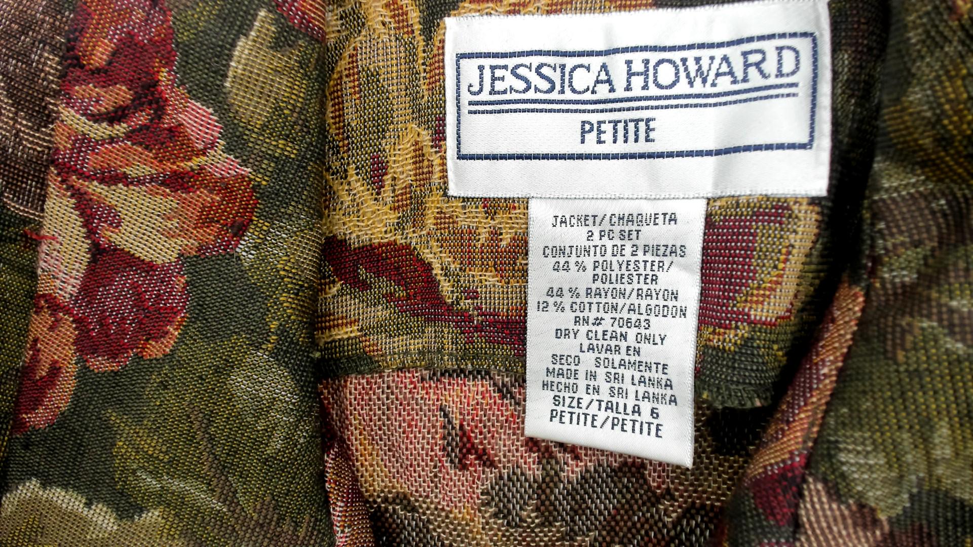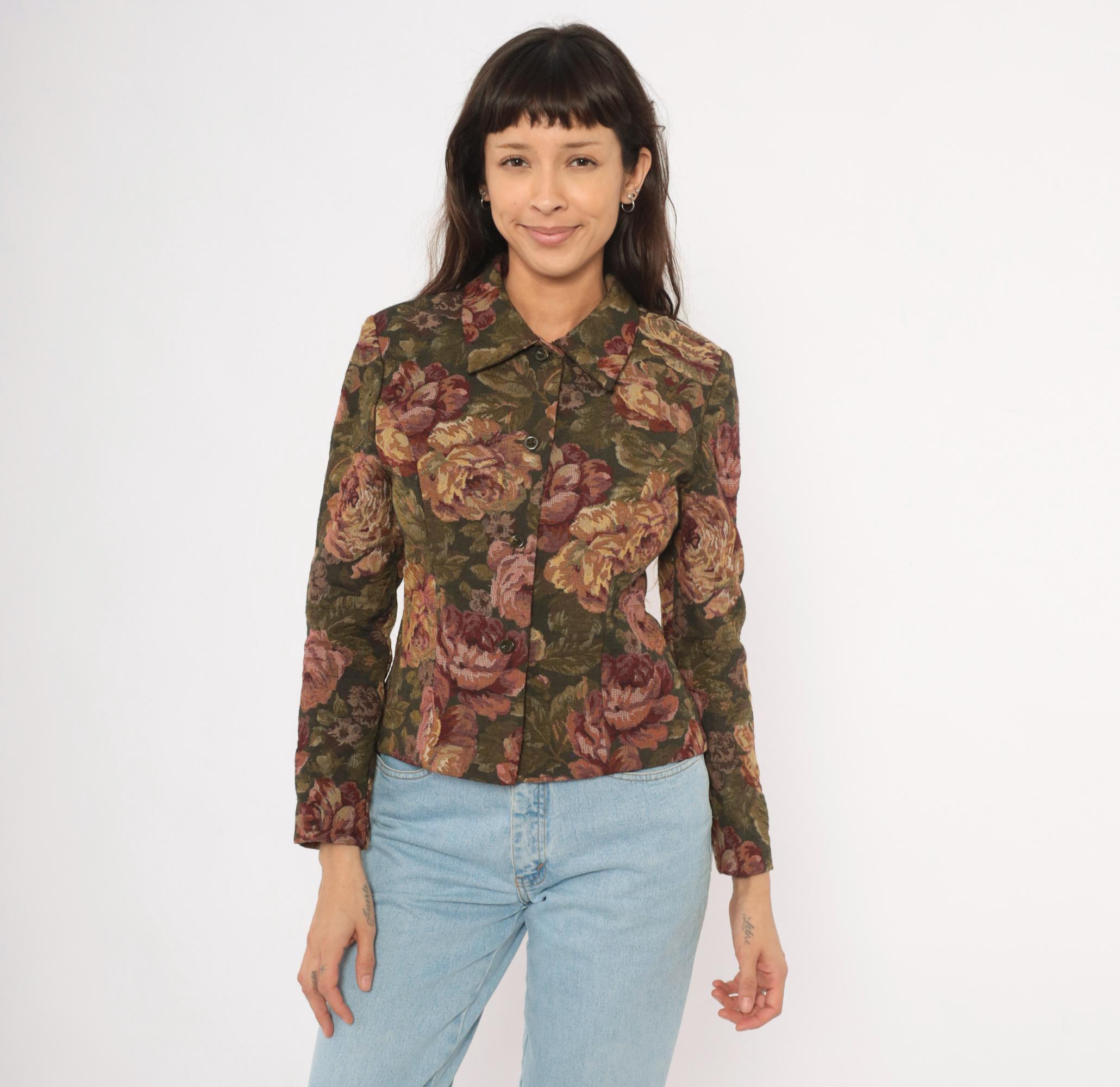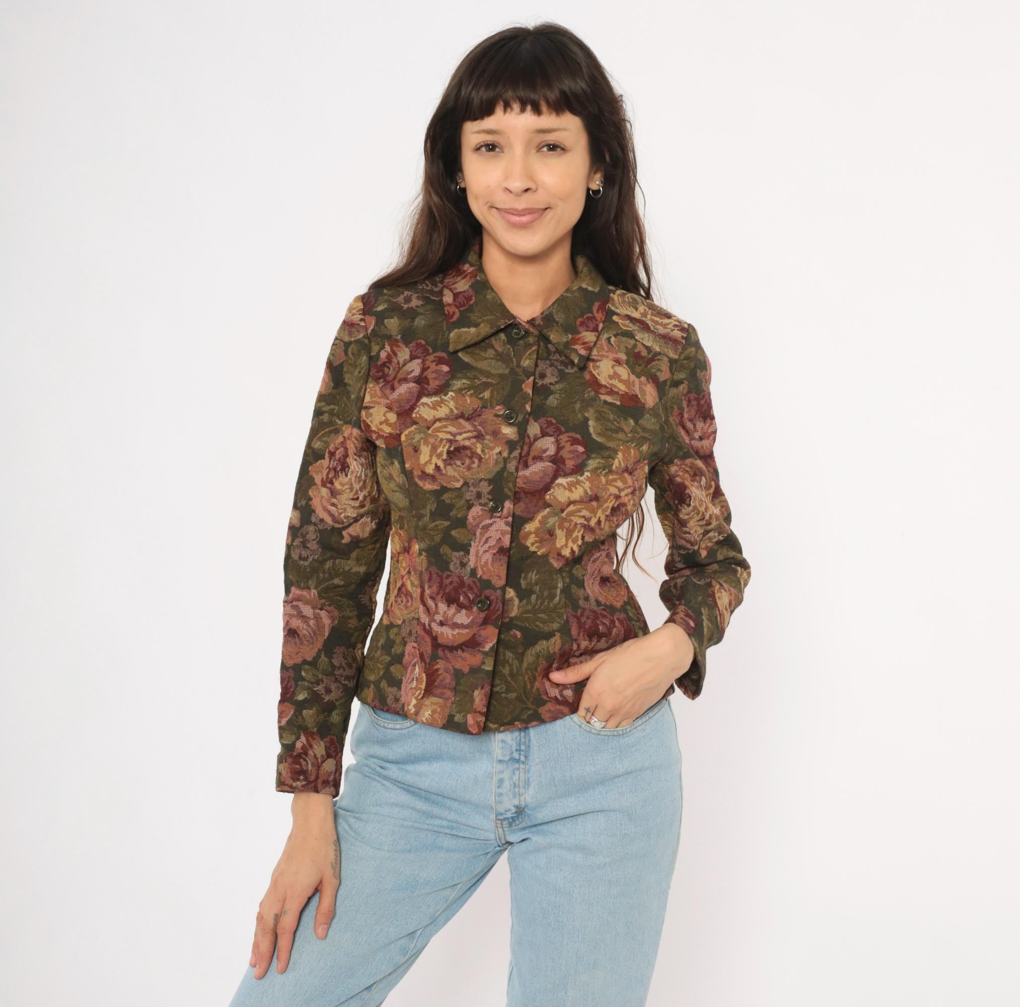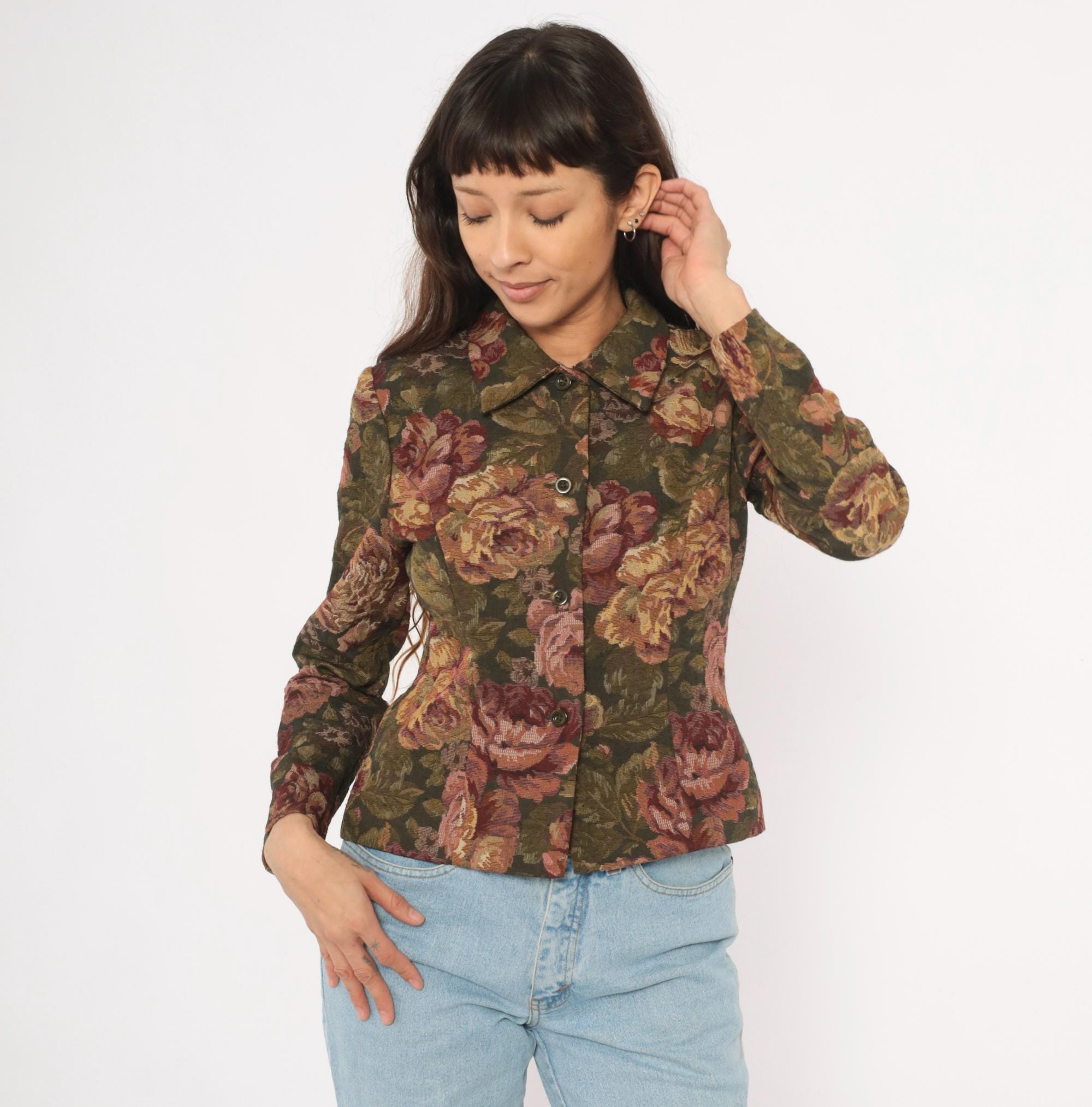 90s floral tapestry jacket from Jessica Howard with a woven rose pattern in burgundy, mauve, gold, and olive green tones. Pointed collar, button front closure with dark buttons, and long sleeves. Fitted silhouette with structured shoulders and a slightly tapered waist.