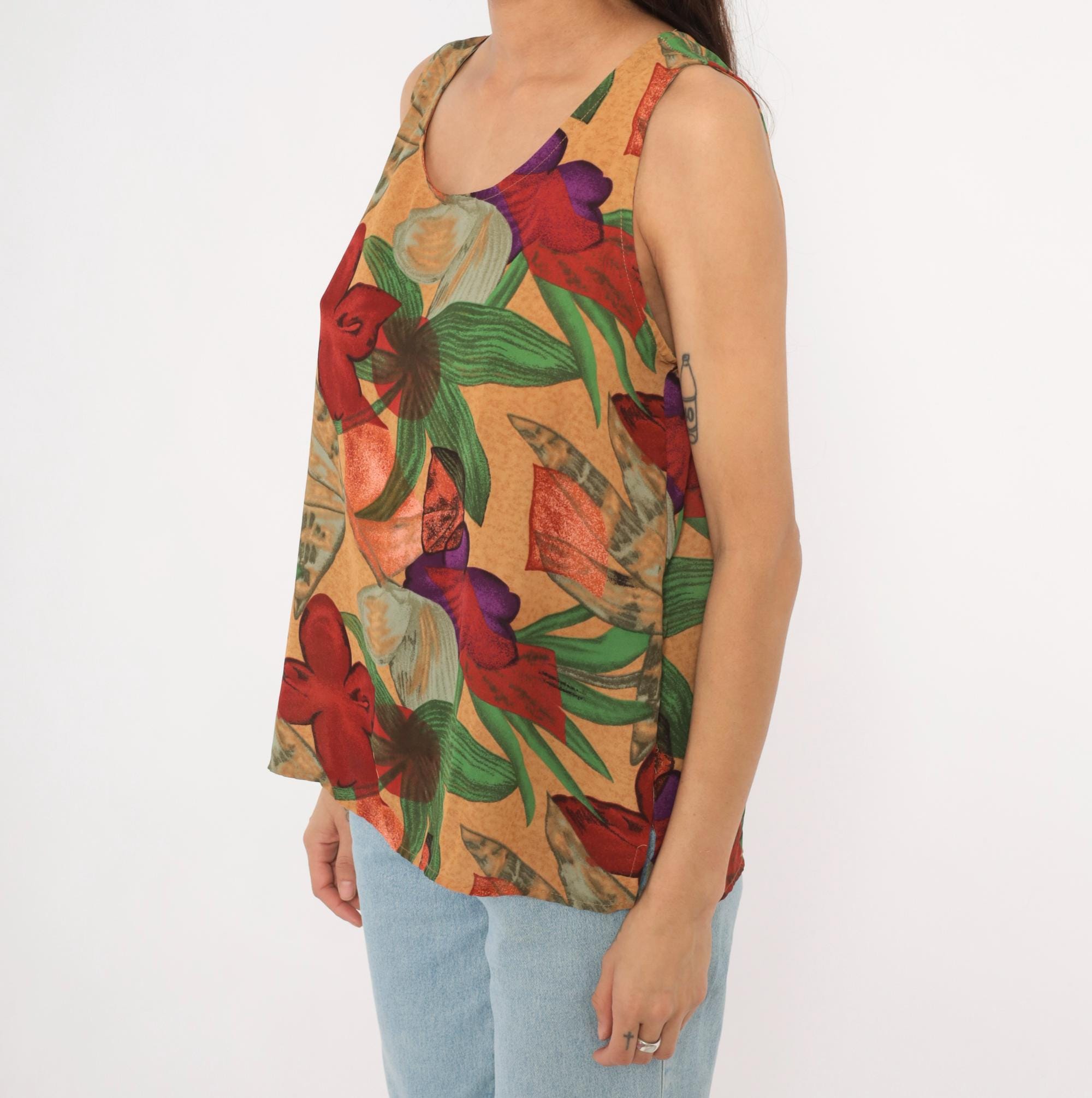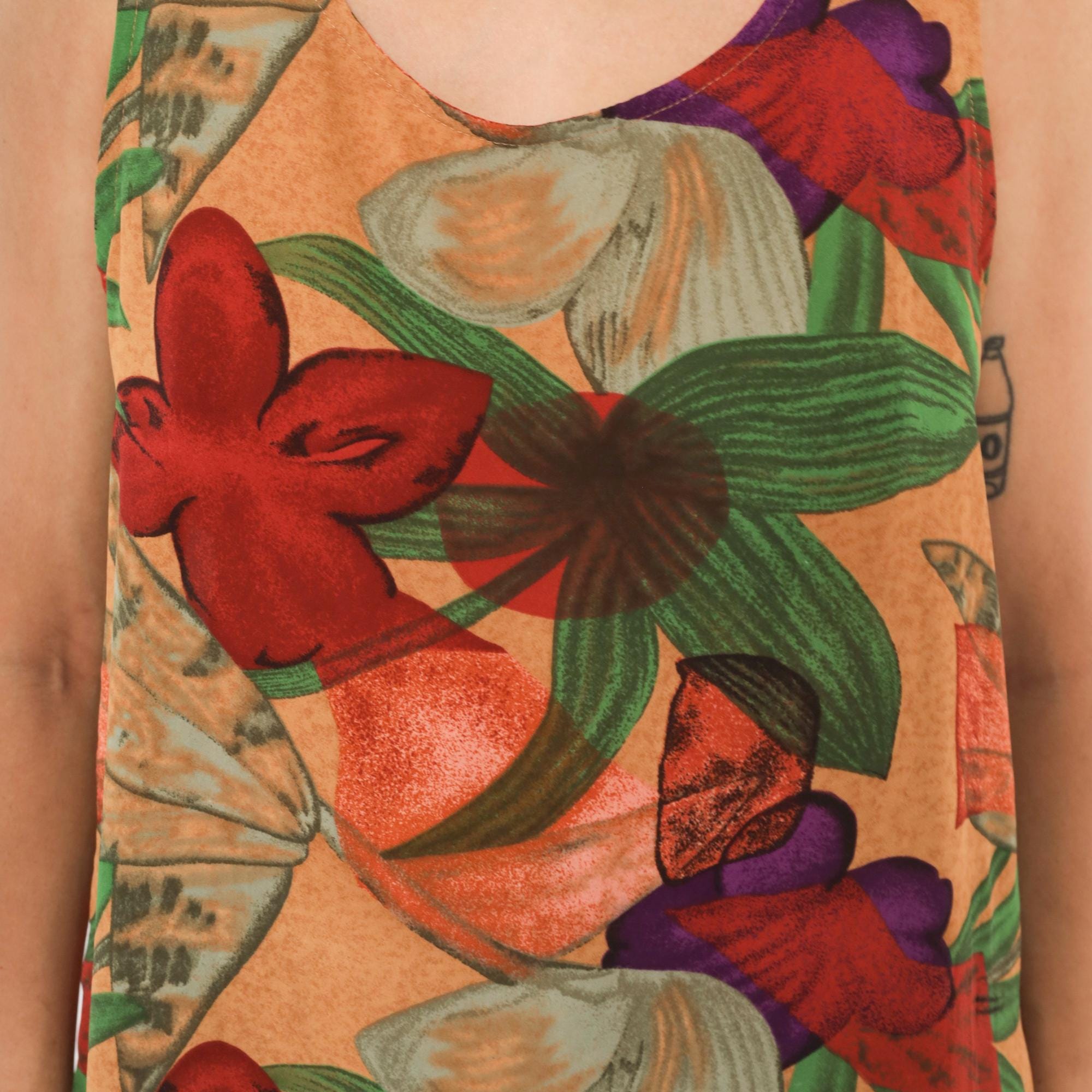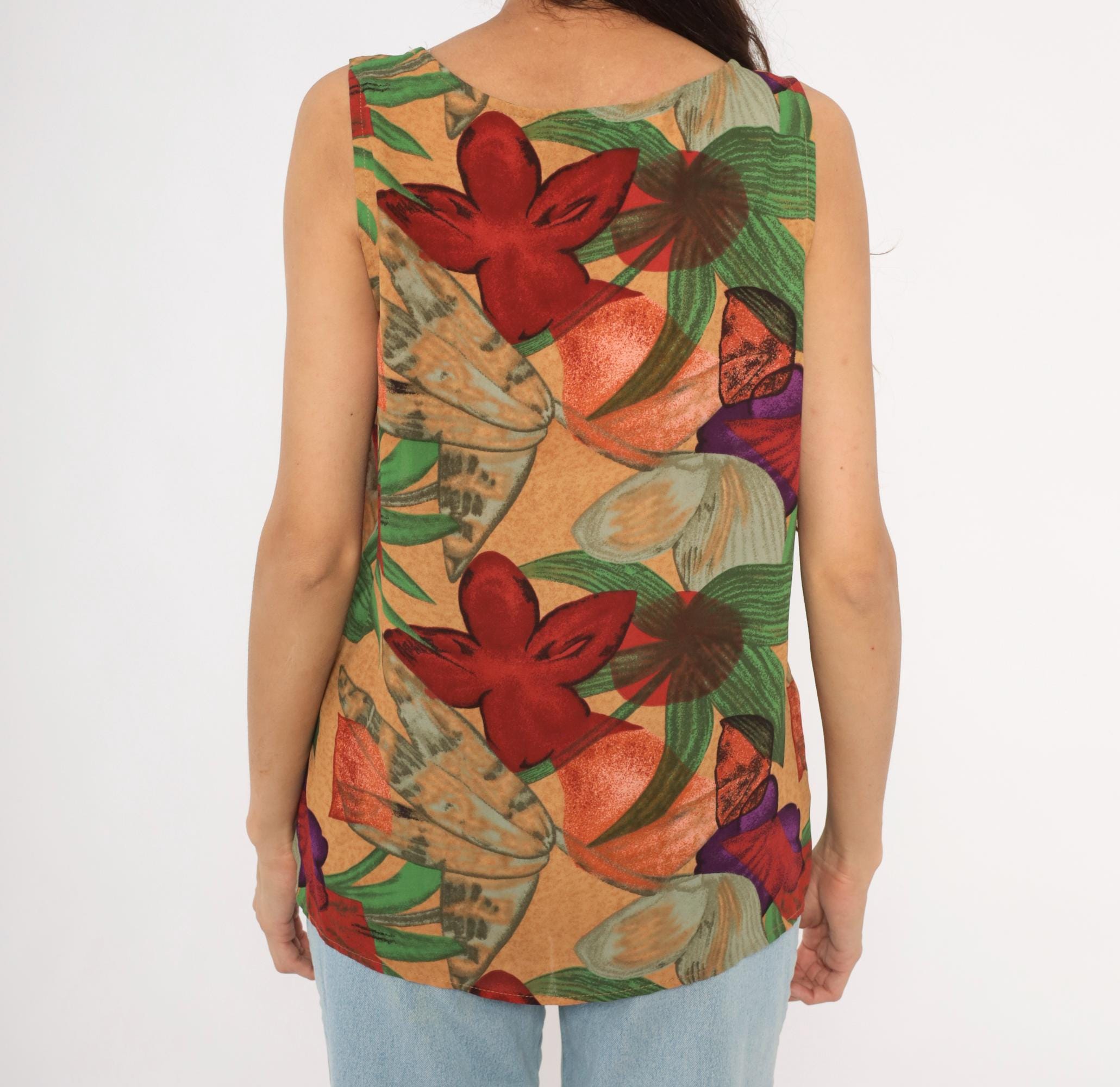 90s Halston sleeveless tank top with a bold tropical floral print in red, crimson, green, purple, and tan tones against a warm sand-colored background. Scoop neckline, pullover style, relaxed A-line body with a curved hem. Large-scale flowers and broad leaves repeat across the entire garment, front and back.