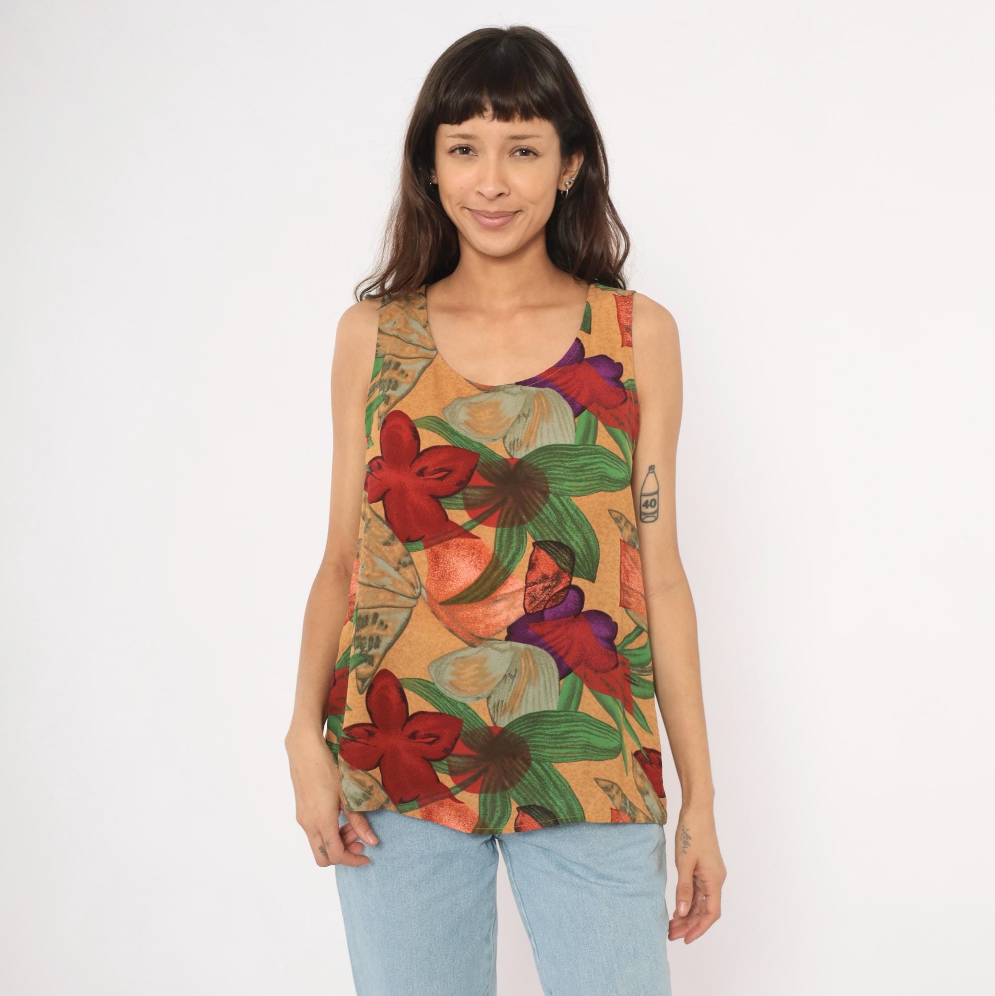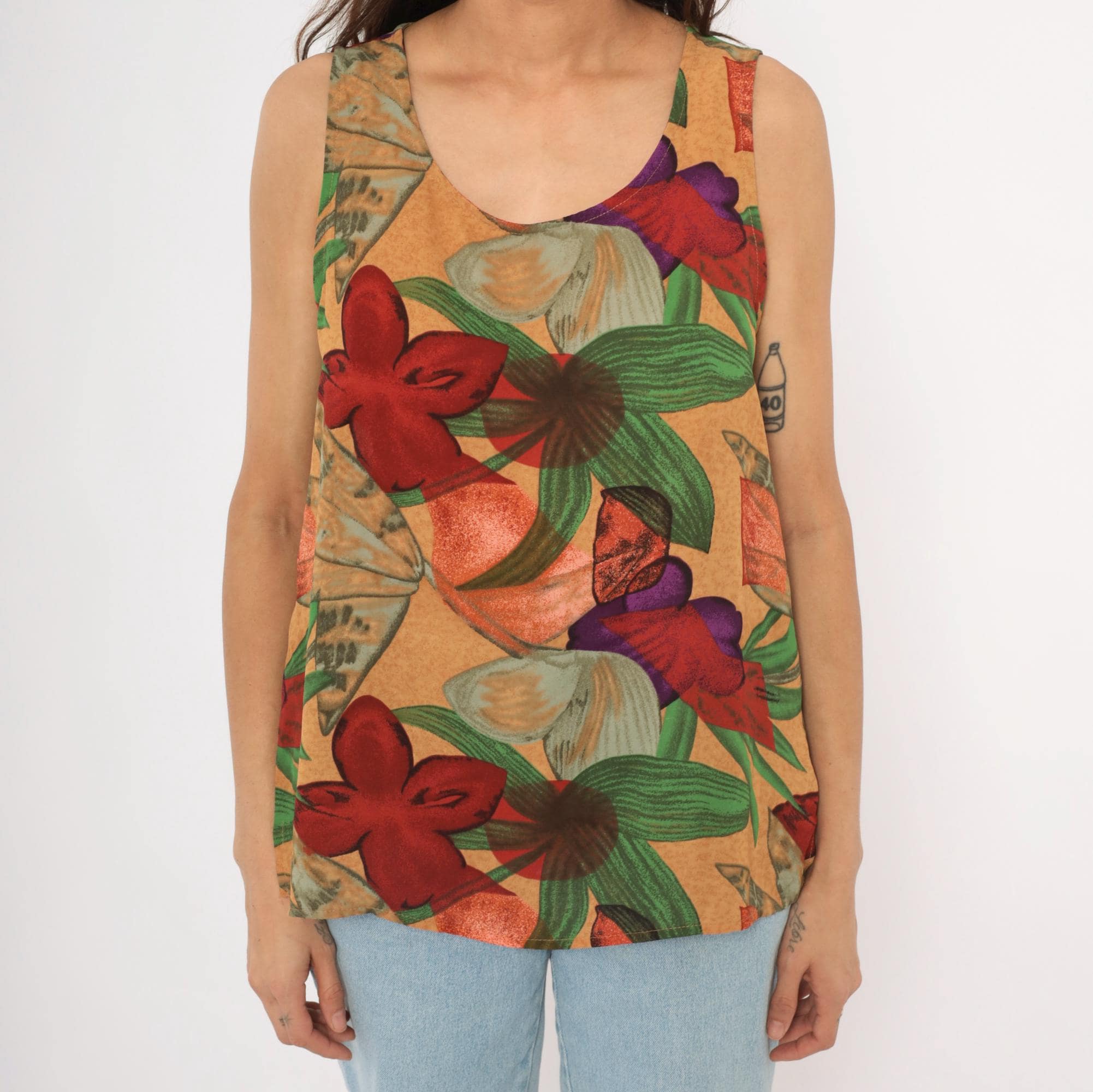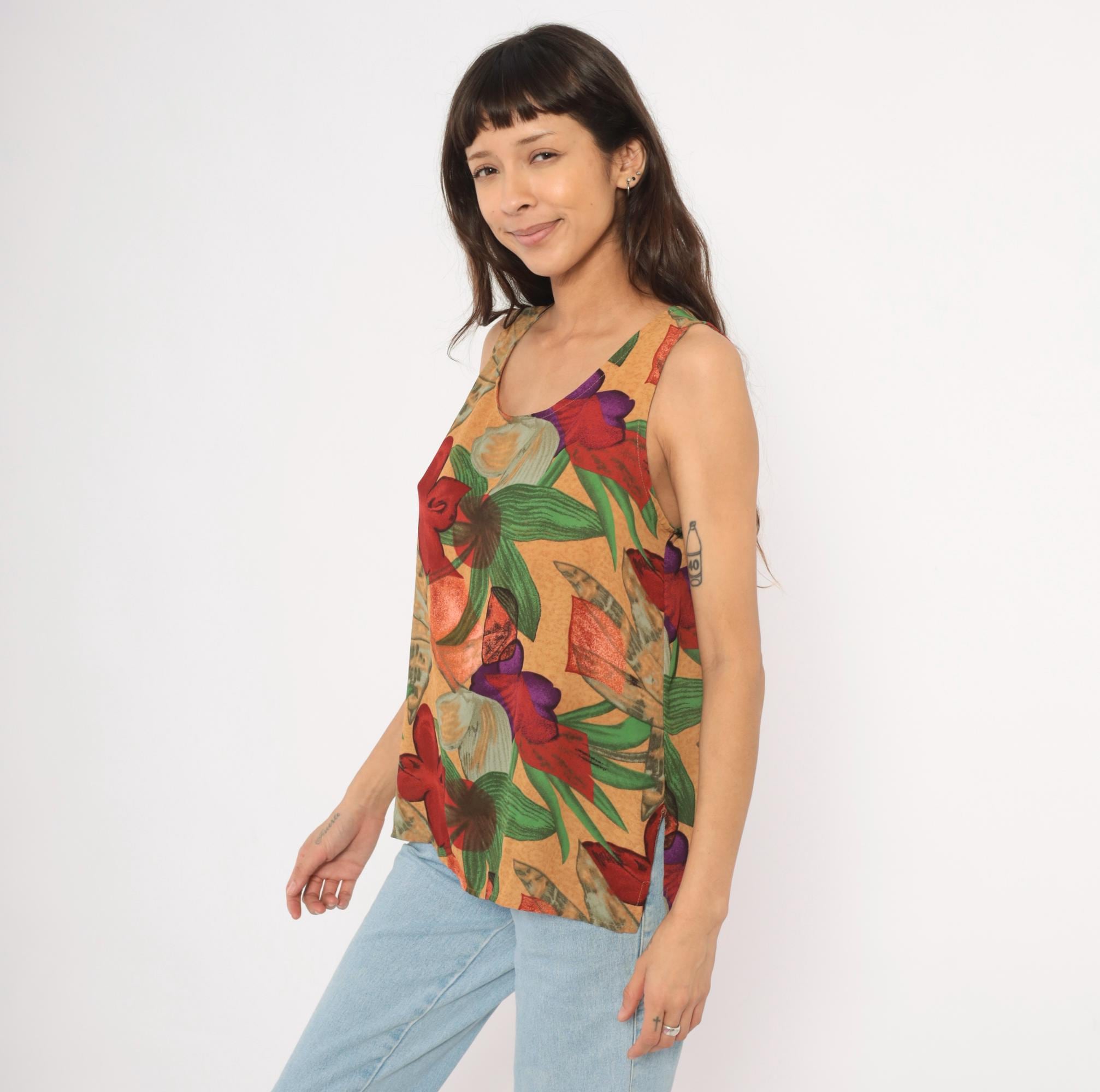 90s Halston sleeveless tank top with a bold tropical floral print in red, crimson, green, purple, and tan tones against a warm sand-colored background. Scoop neckline, pullover style, relaxed A-line body with a curved hem. Large-scale flowers and broad leaves repeat across the entire garment, front and back.