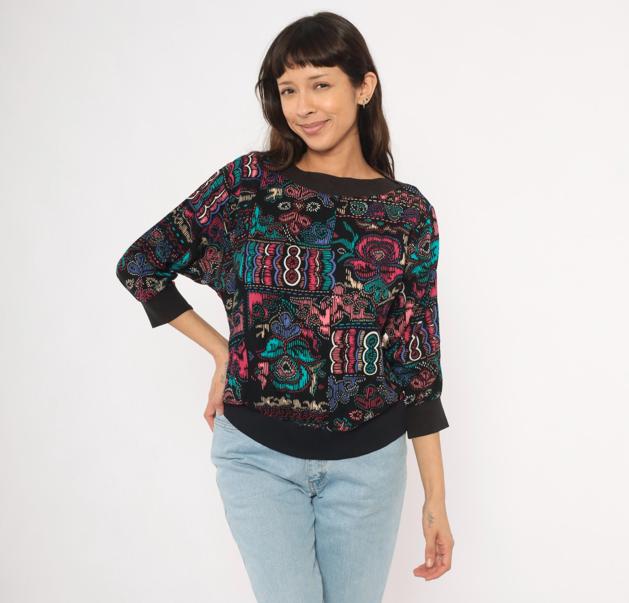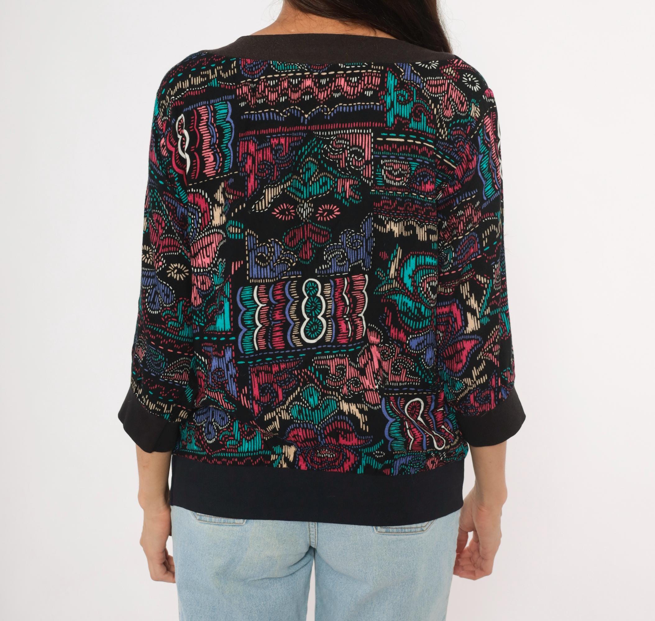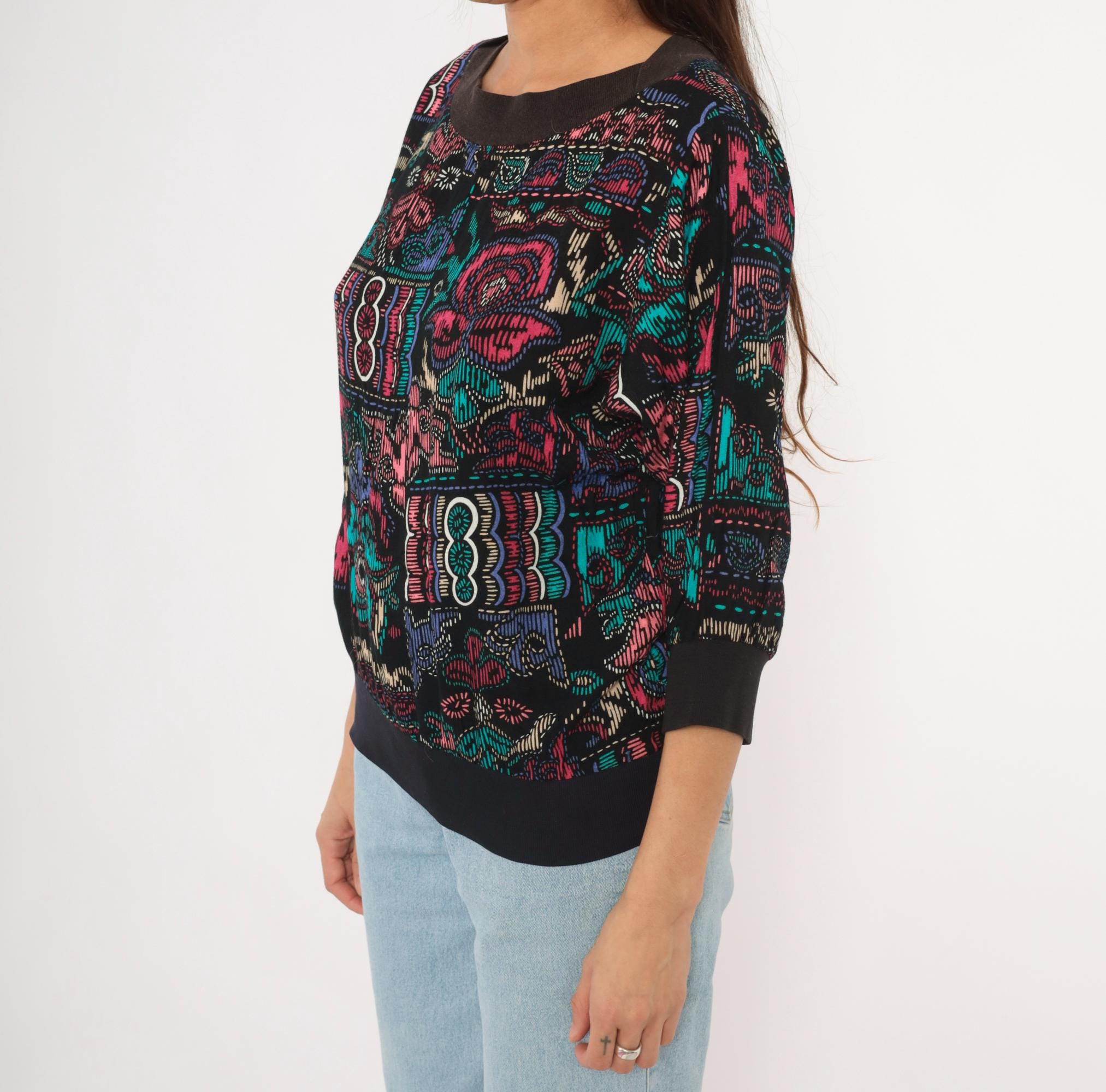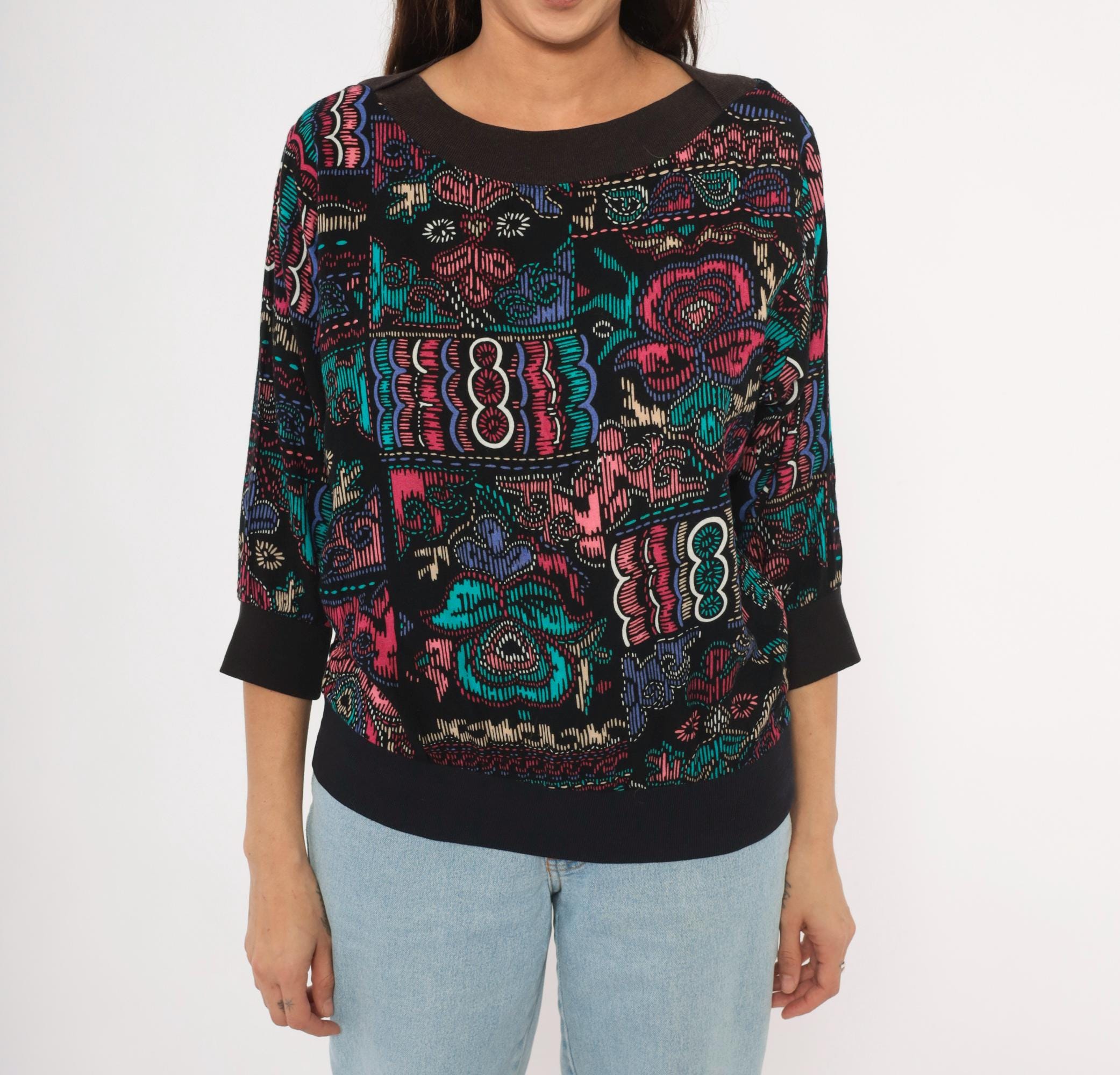 90s abstract pullover top with a wide boat neckline and three-quarter dolman sleeves. Black background with teal, pink, purple, and cream graphic motifs in a faux cross-stitch and embroidery-inspired print arranged in irregular blocks. Ribbed black crew neck trim, ribbed cuffs, and a wide solid black banded hem.