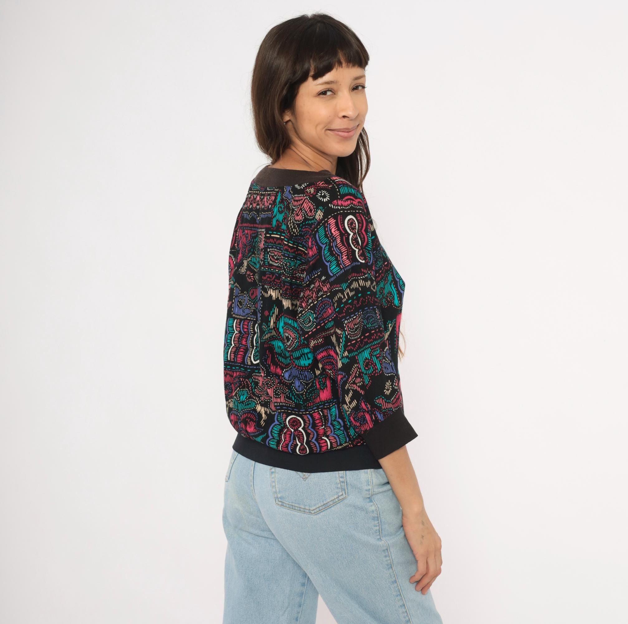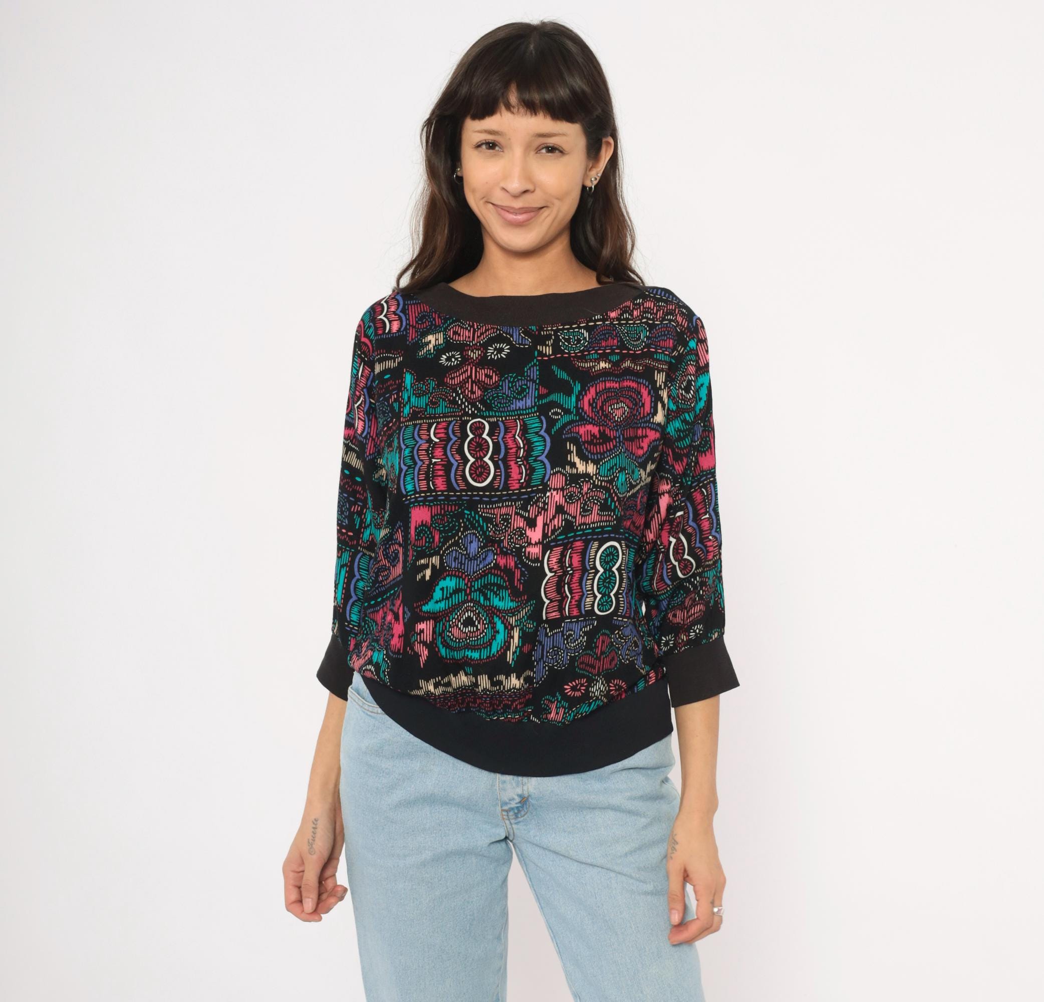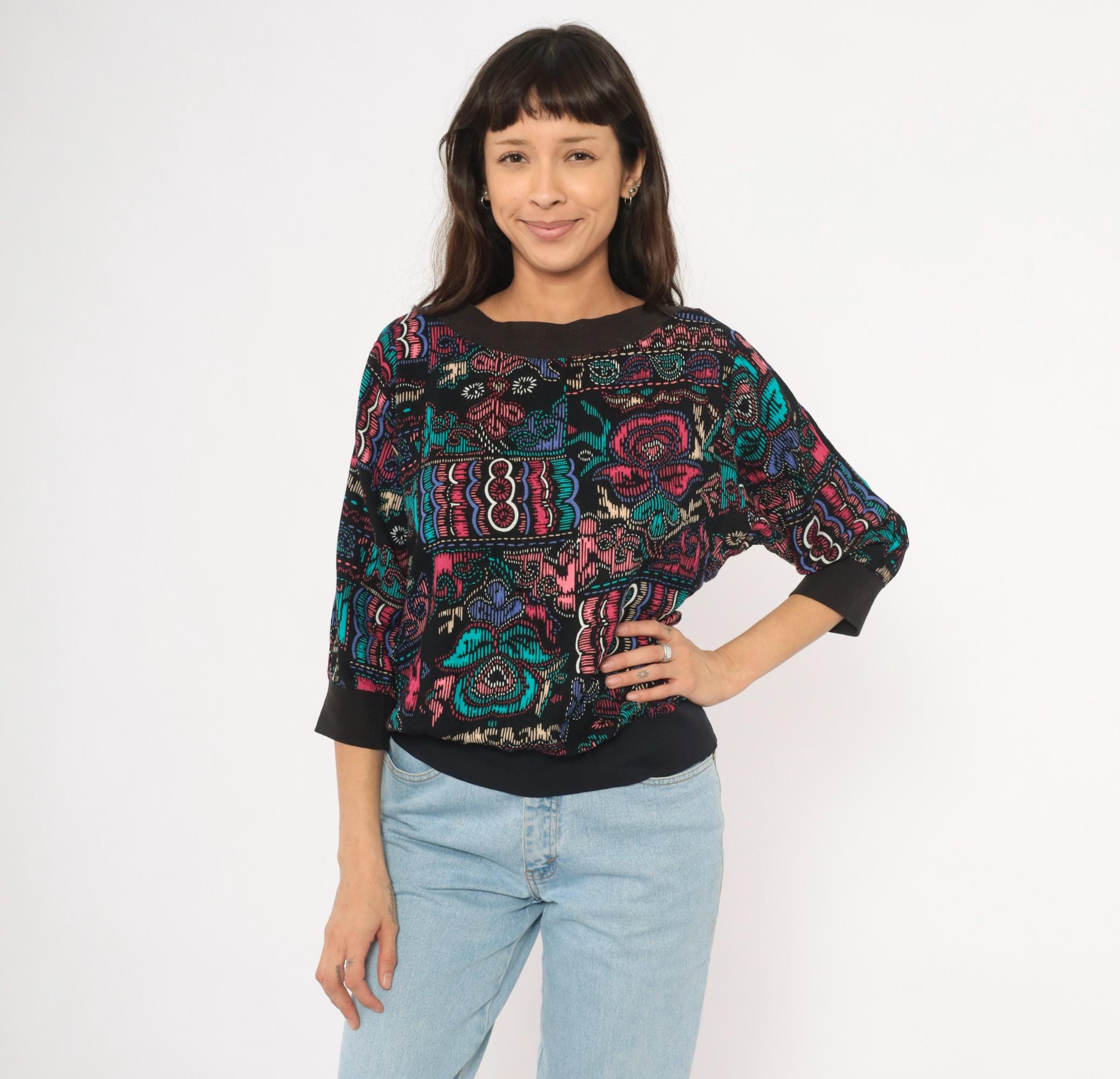 90s abstract pullover top with a wide boat neckline and three-quarter dolman sleeves. Black background with teal, pink, purple, and cream graphic motifs in a faux cross-stitch and embroidery-inspired print arranged in irregular blocks. Ribbed black crew neck trim, ribbed cuffs, and a wide solid black banded hem.