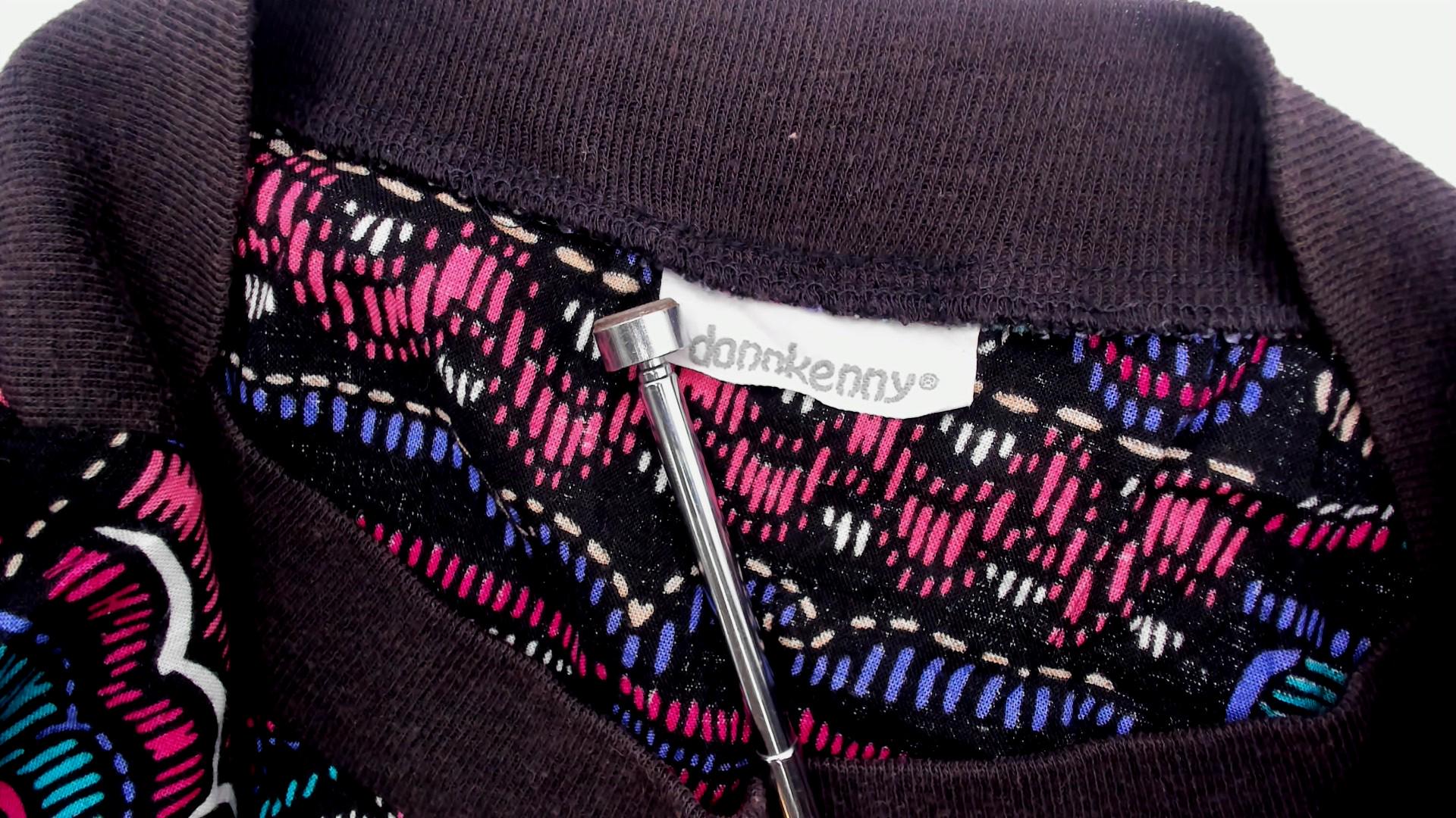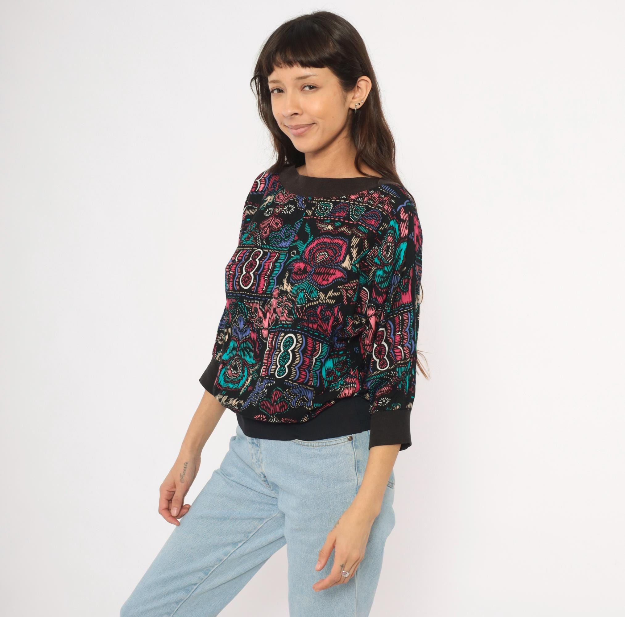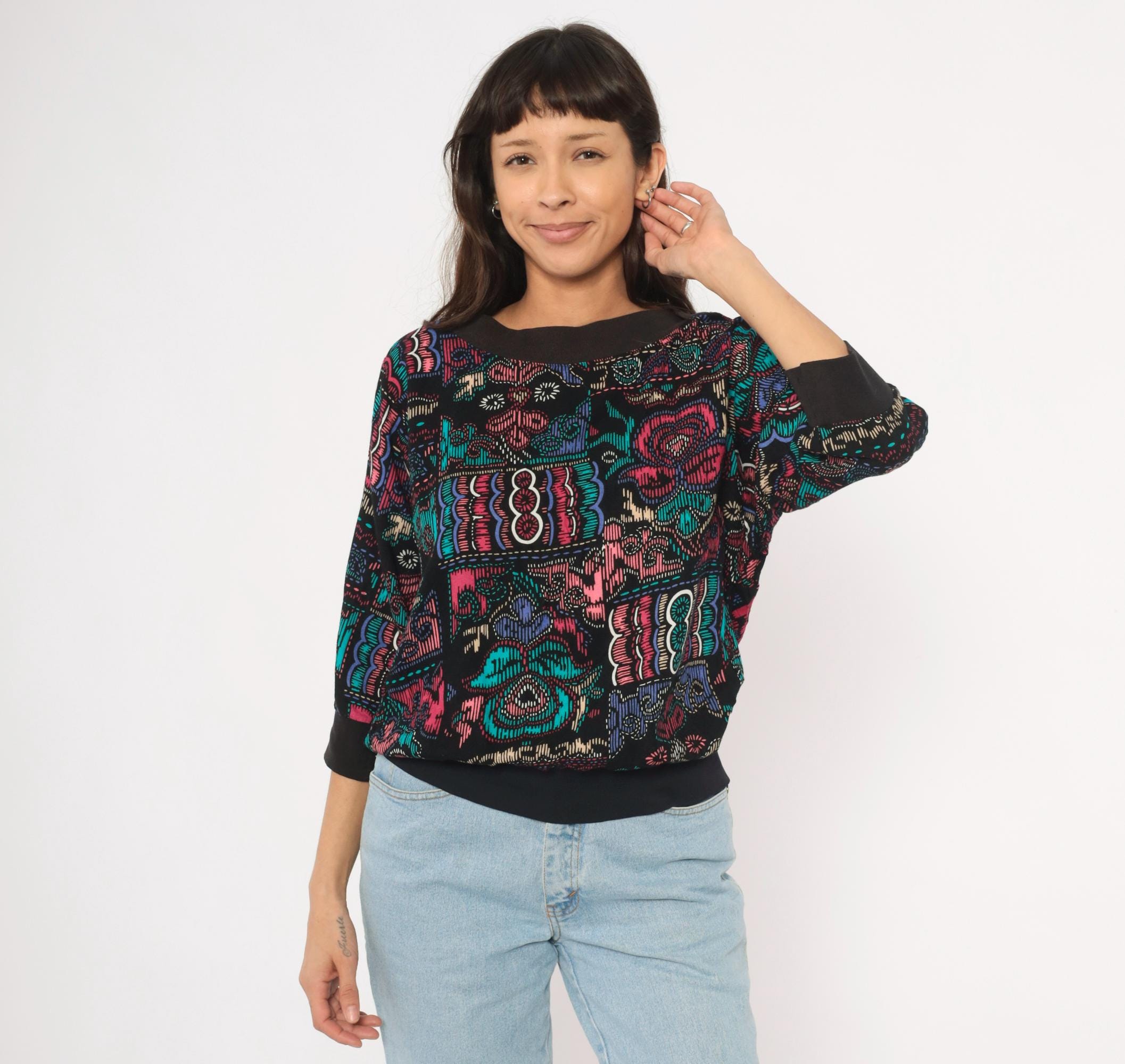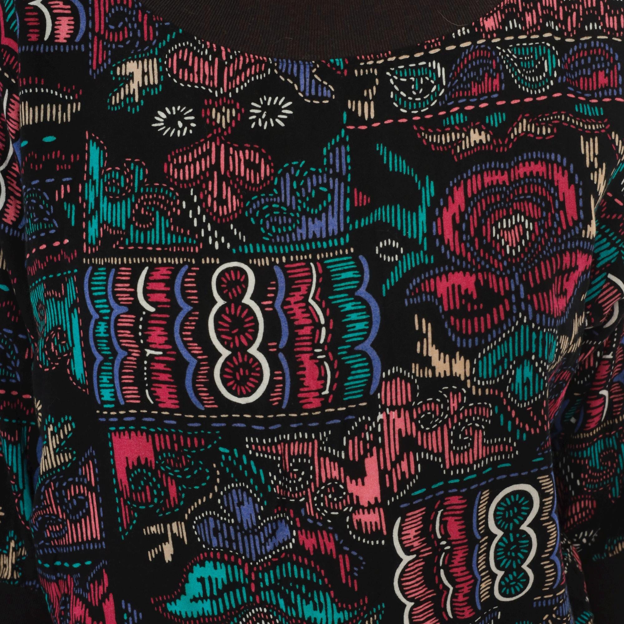 90s abstract pullover top with a wide boat neckline and three-quarter dolman sleeves. Black background with teal, pink, purple, and cream graphic motifs in a faux cross-stitch and embroidery-inspired print arranged in irregular blocks. Ribbed black crew neck trim, ribbed cuffs, and a wide solid black banded hem.