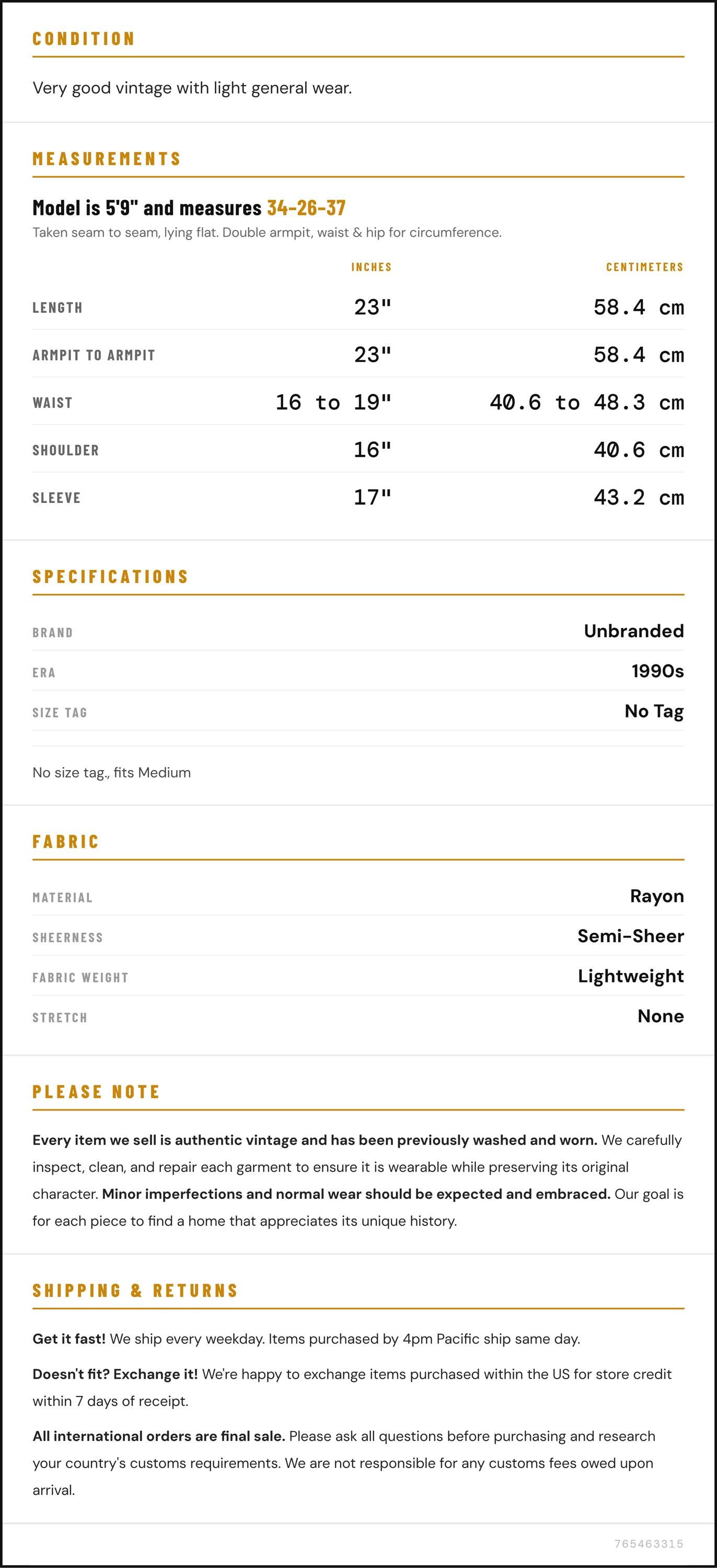 Measurements are taken laying flat and should be doubled where applicable. The "best fits" size is just an estimate, and vintage sizing can vary from modern sizing. Please use measurements to ensure proper fit. The best thing to do is measure a similar item of your own, and compare. When an item has stretch, we will list the unstretched dimensions with the stretched measurement afterwards.