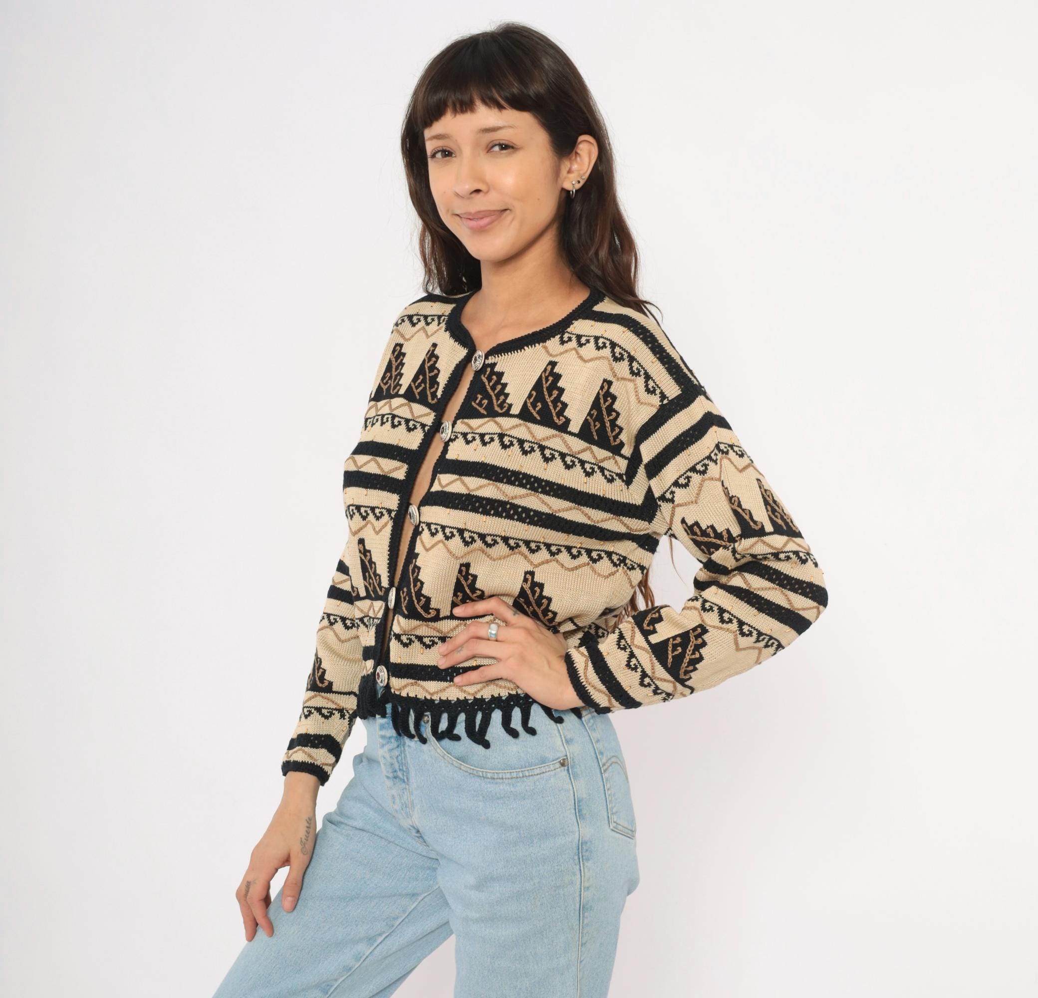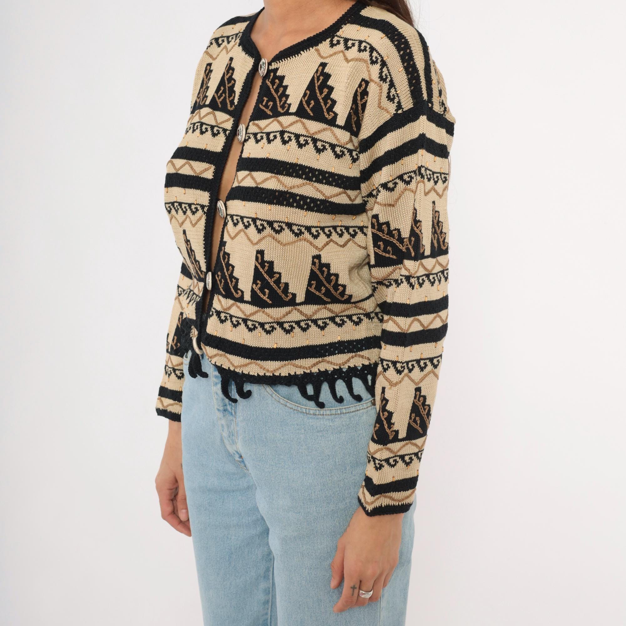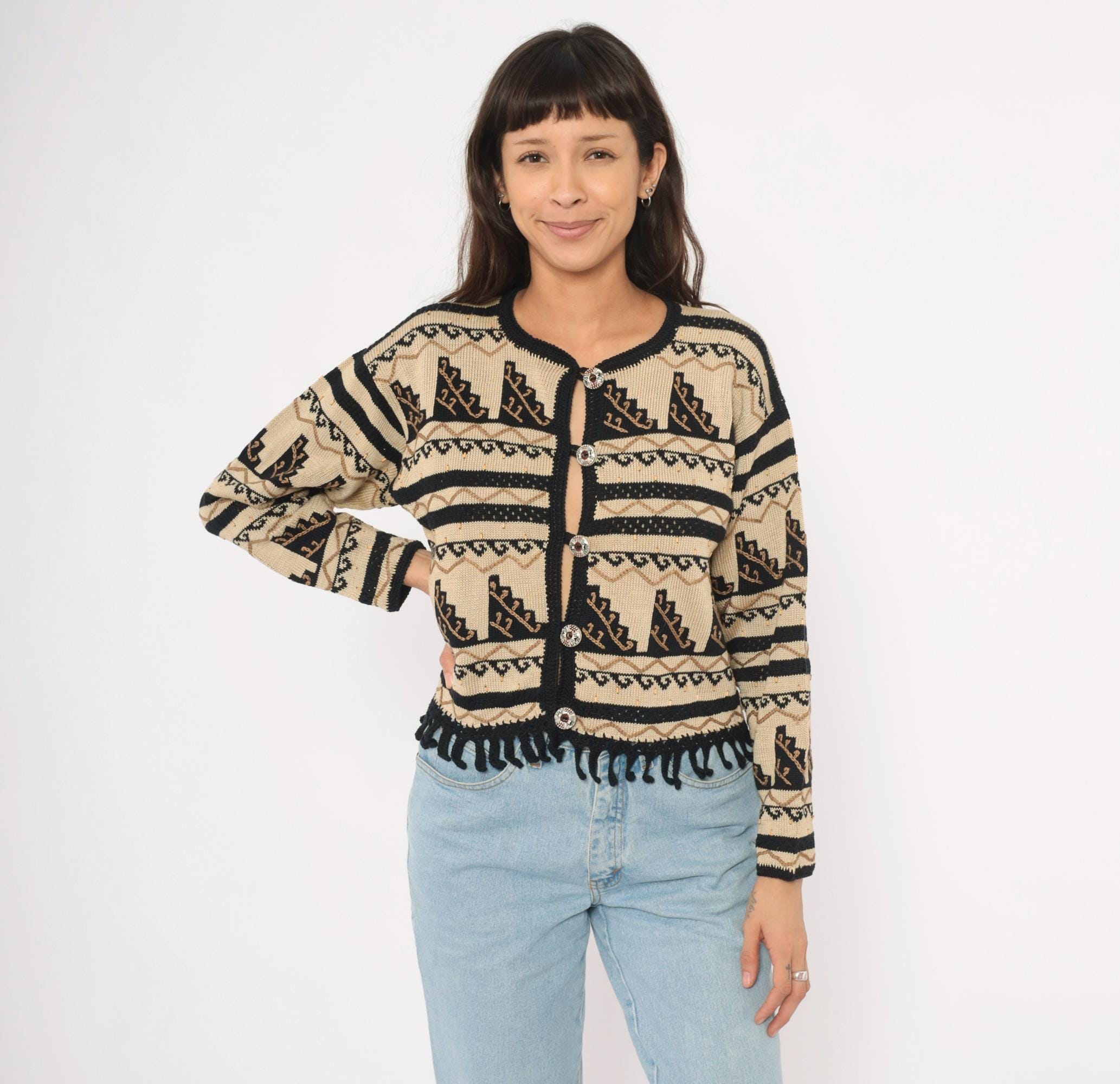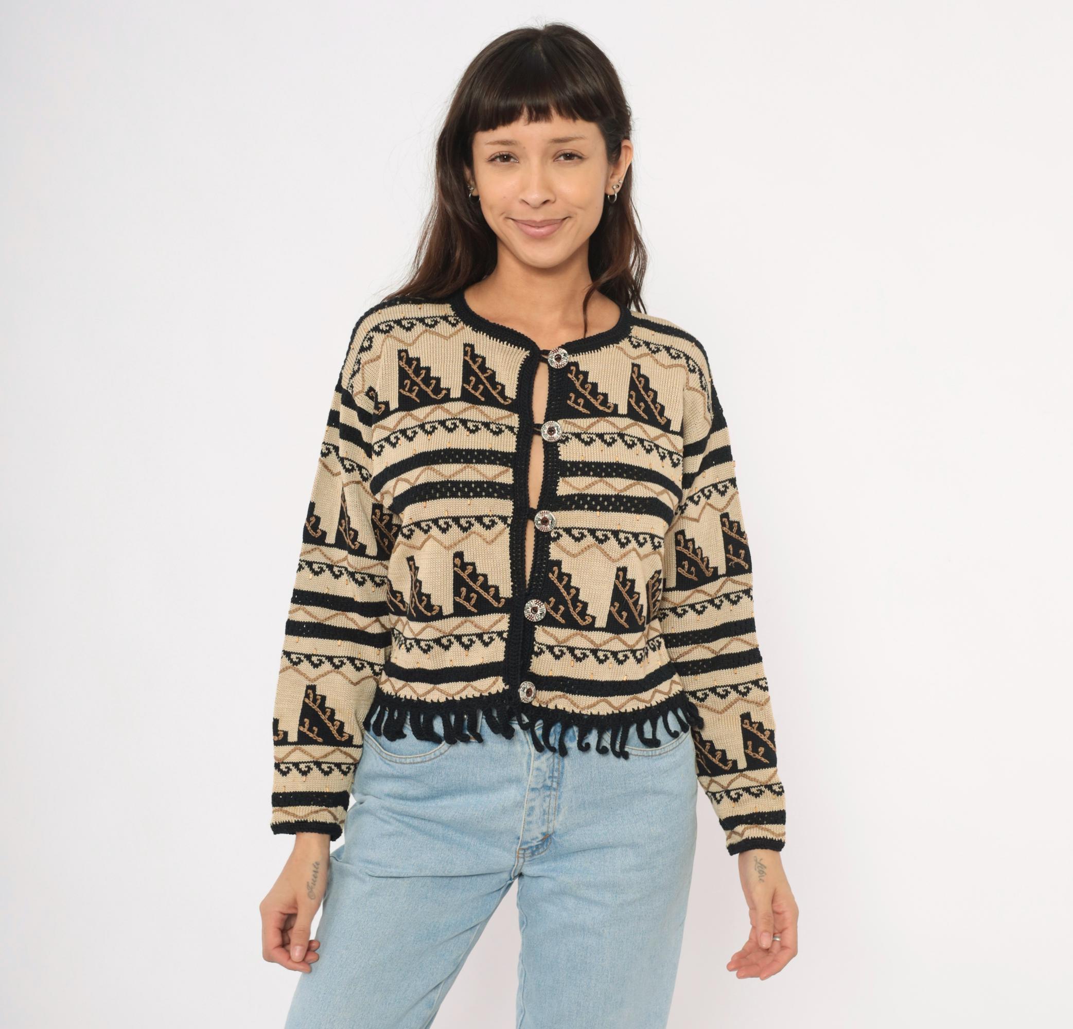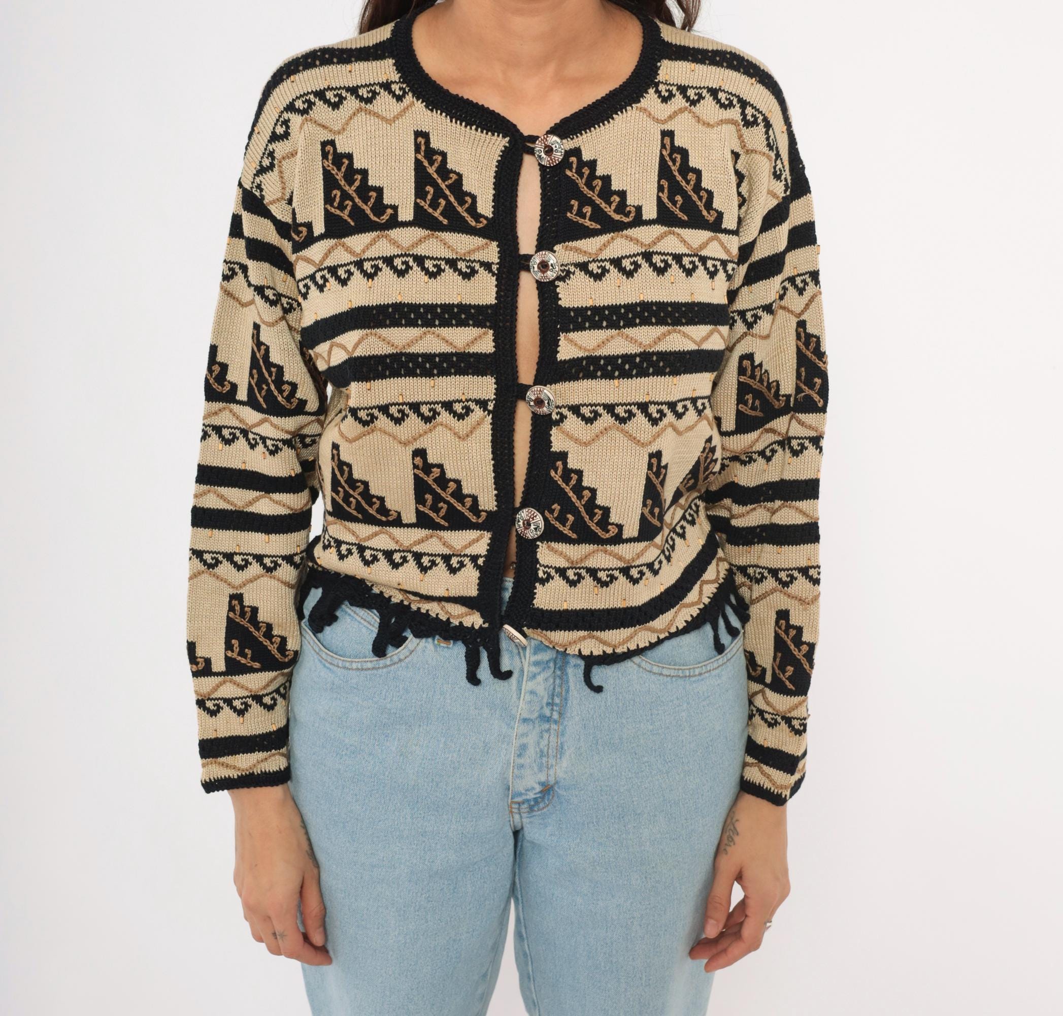 2000s Peruvian Connection cardigan in cream and black with an allover geometric Southwestern-inspired knit pattern and brown accent stitching. Scoop neckline with black crocheted trim, four decorative silver-tone concho buttons down the front, and black fringe along the hem.