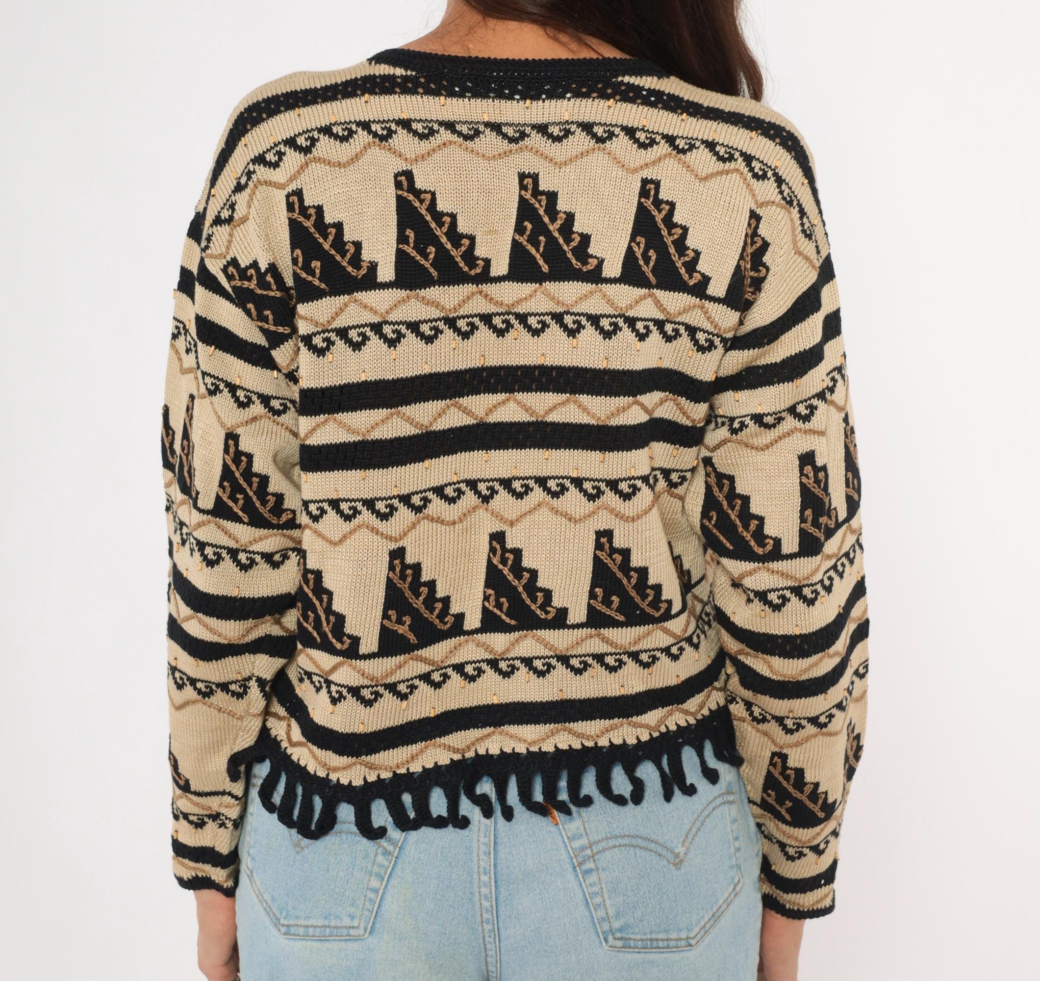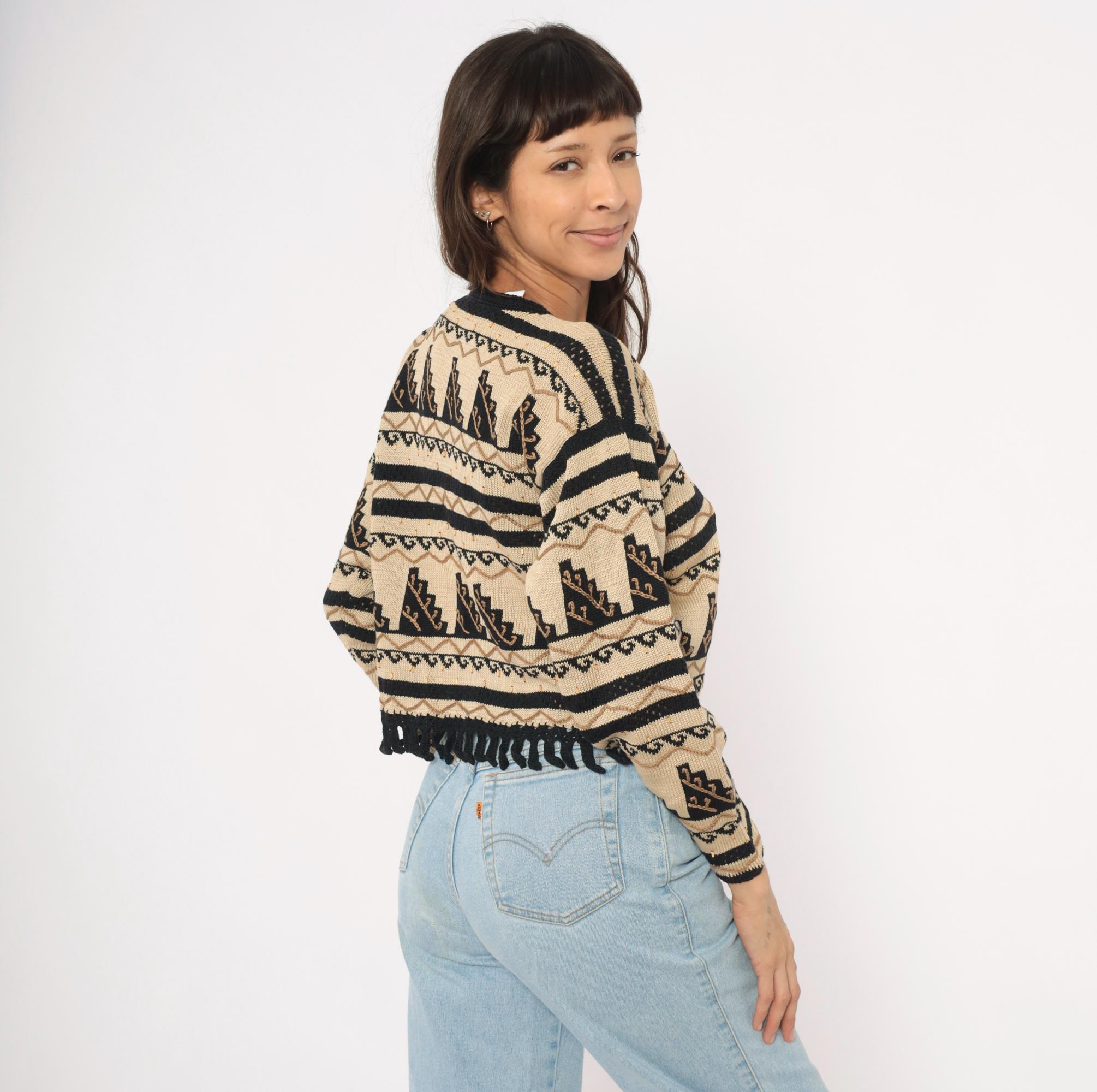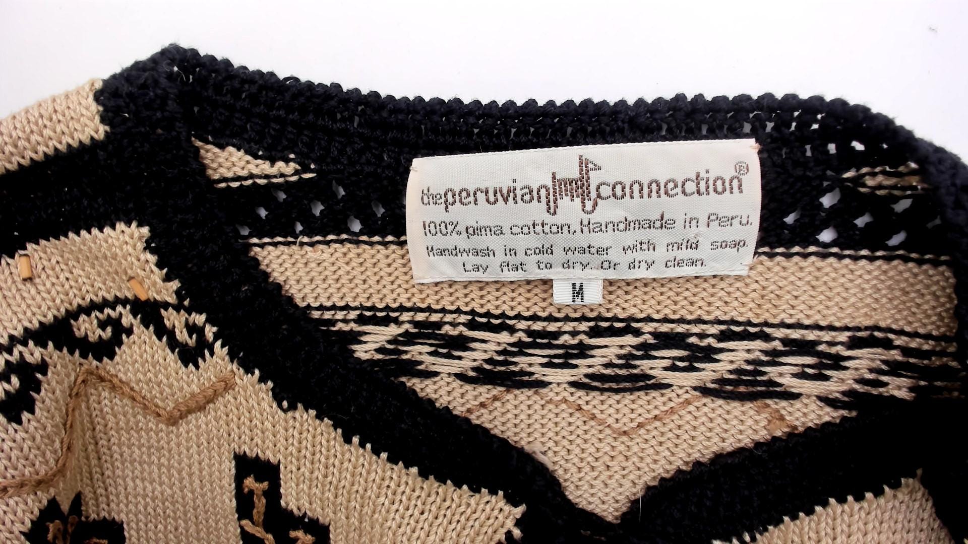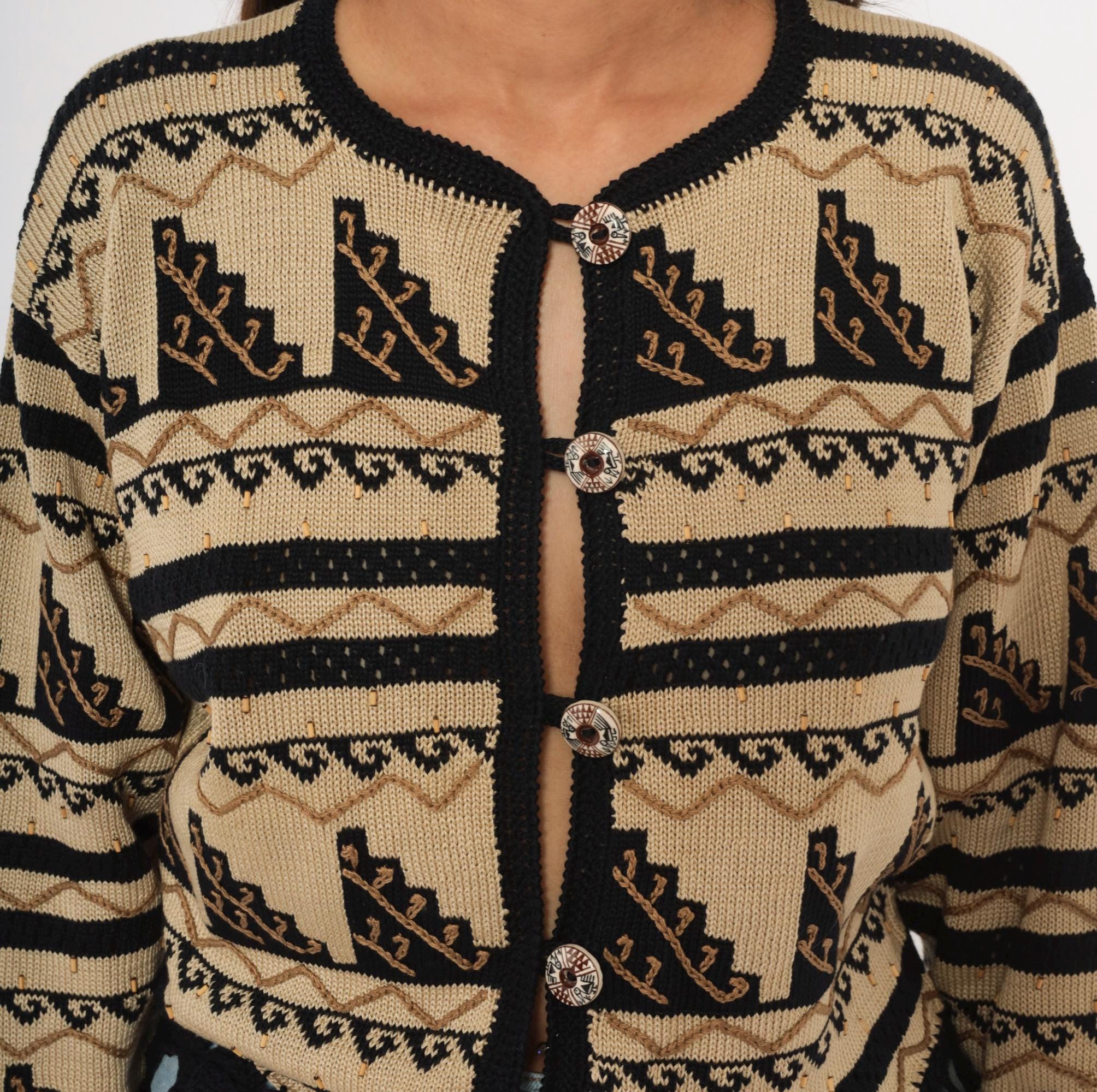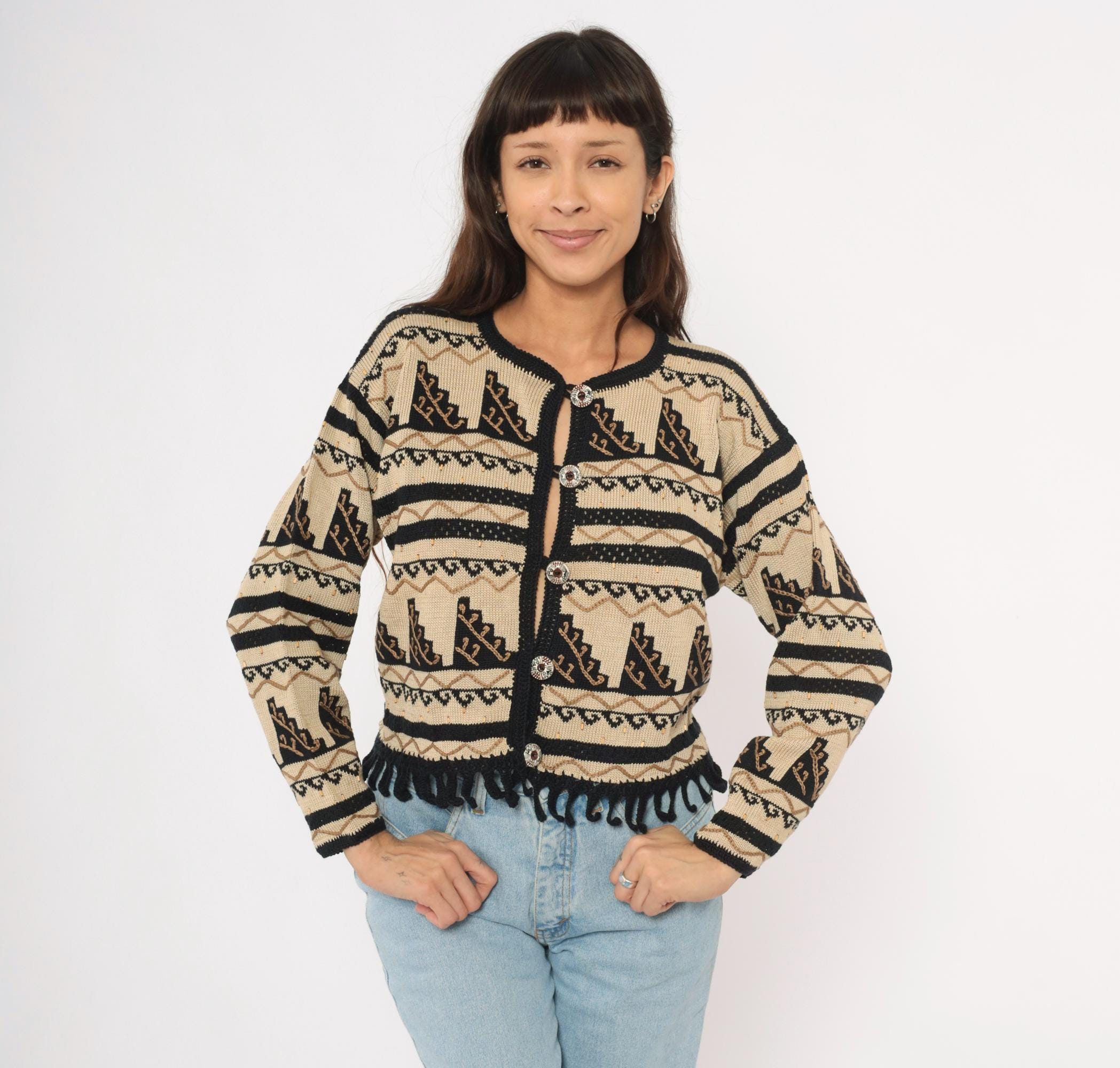 2000s Peruvian Connection cardigan in cream and black with an allover geometric Southwestern-inspired knit pattern and brown accent stitching. Scoop neckline with black crocheted trim, four decorative silver-tone concho buttons down the front, and black fringe along the hem.