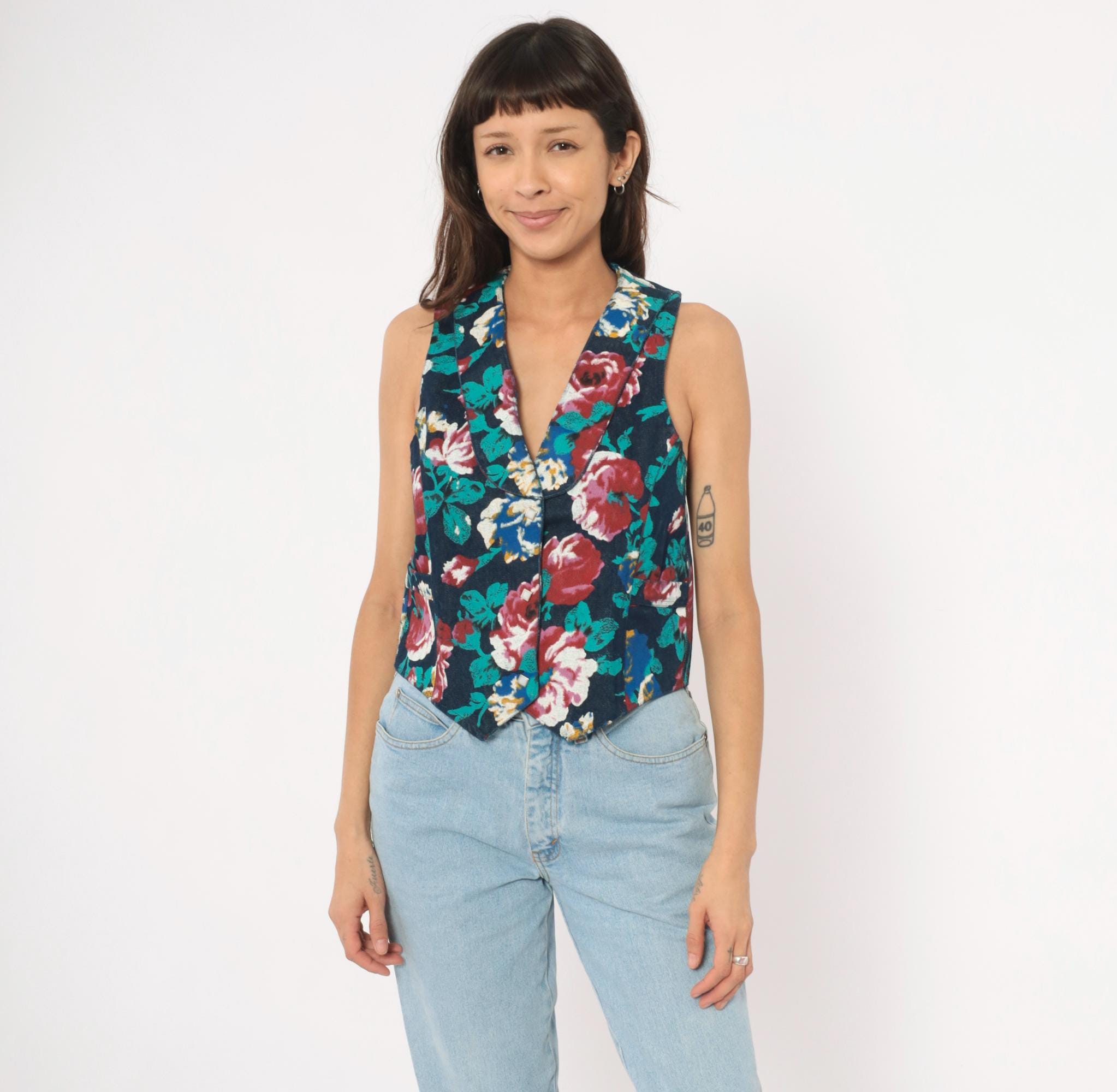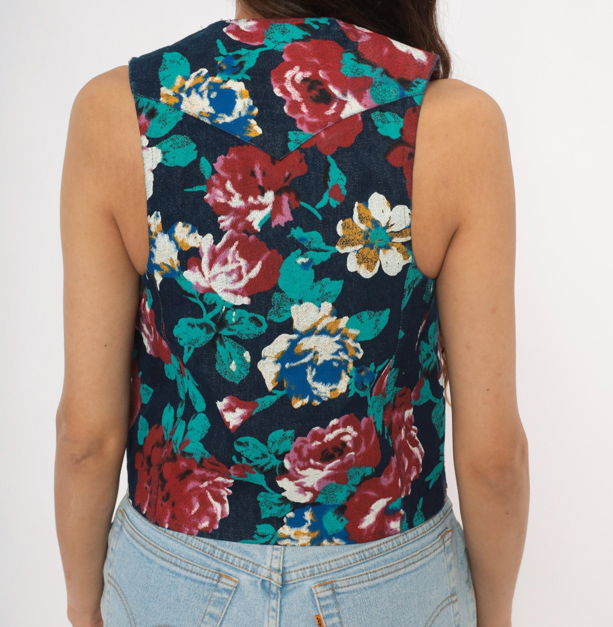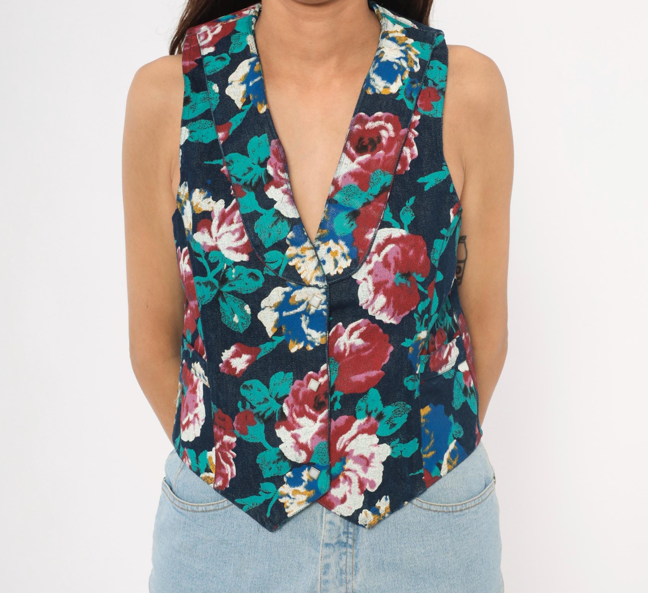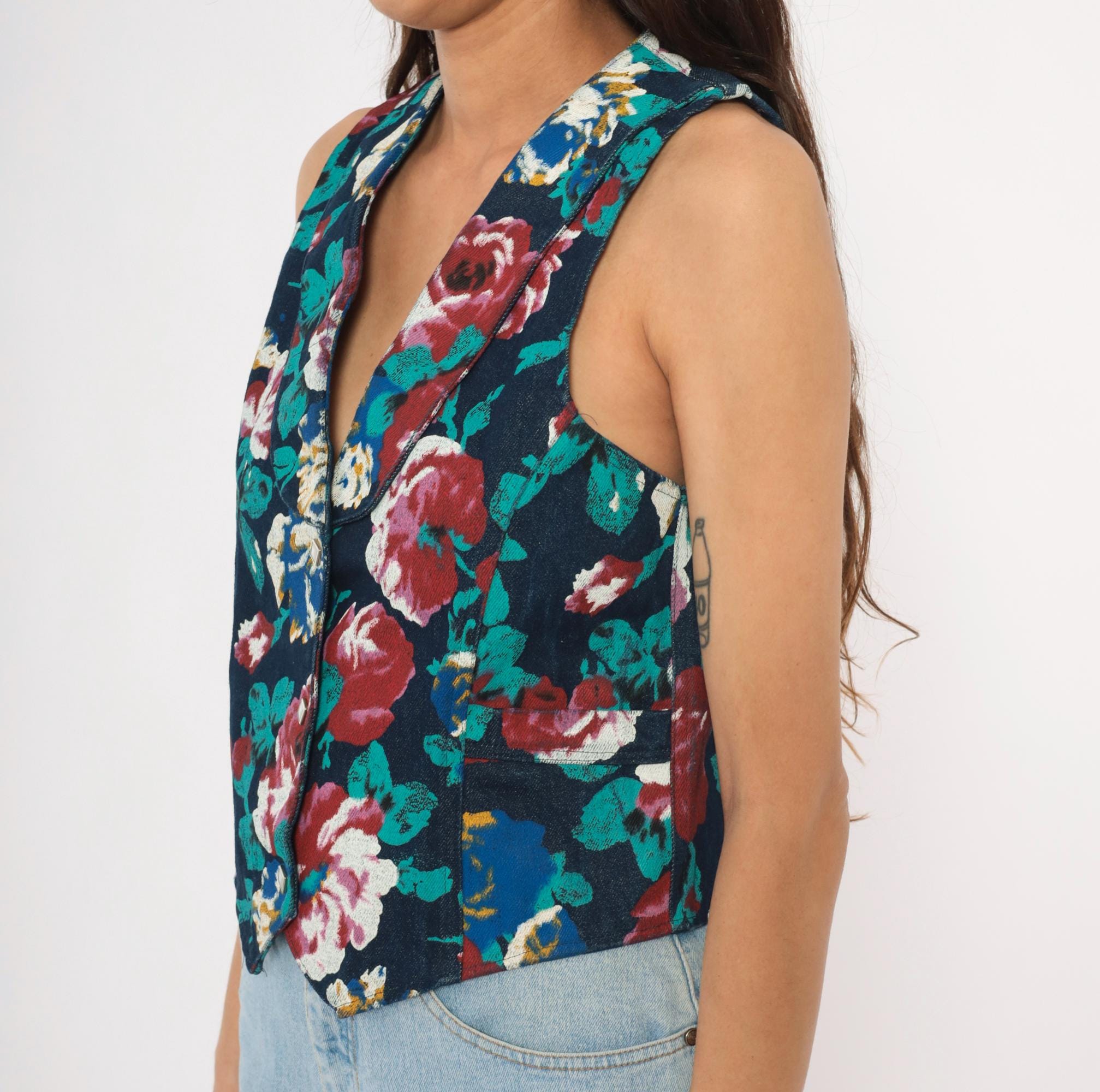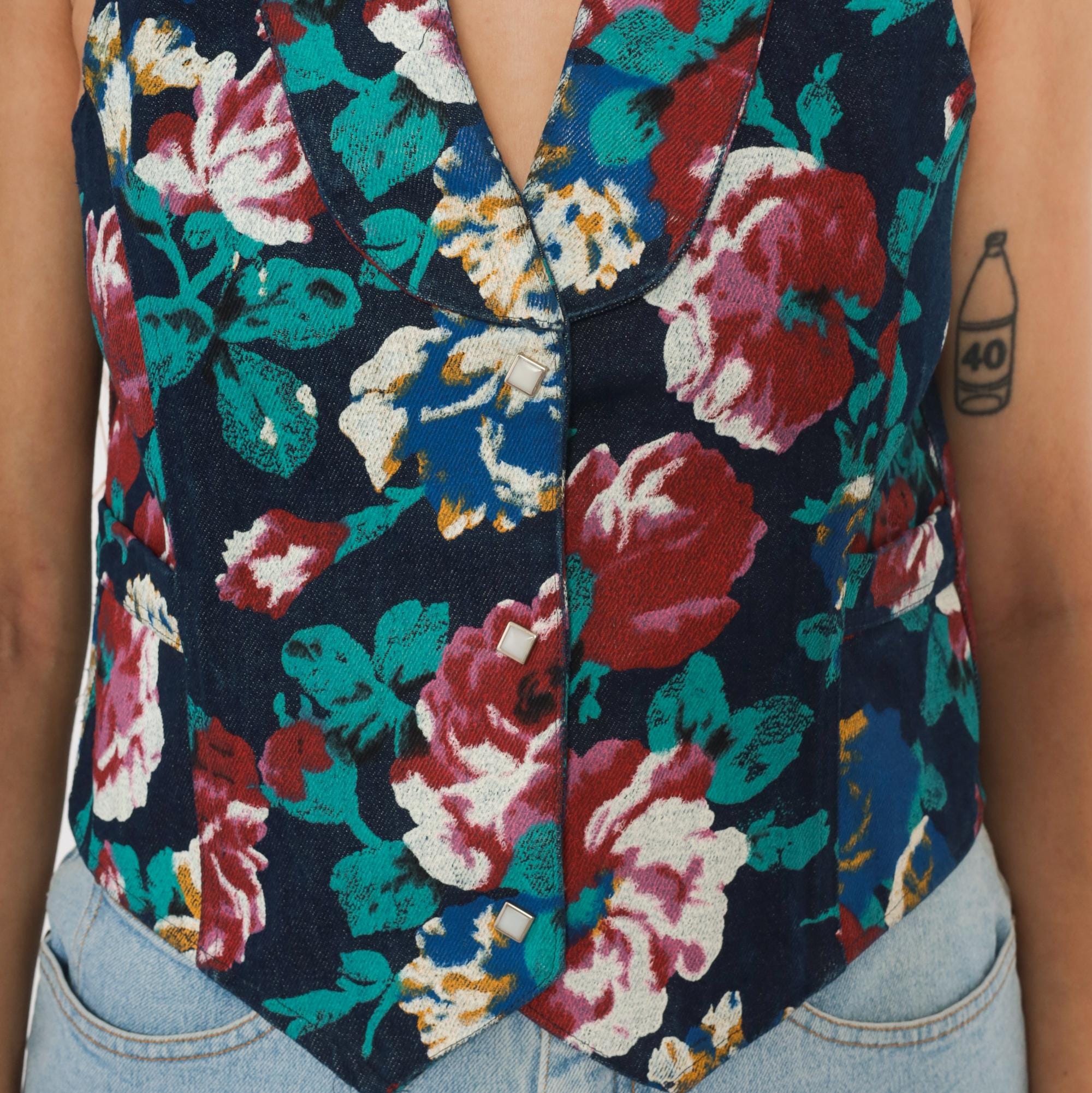 90s floral denim vest from Tru-West with a dark navy base covered in large-scale roses and leaves in teal, burgundy, pink, blue, and gold. V-neckline with notched lapel collar, pointed hemline, and small square silver-toned button front closure. Waist-level pockets on each side, with the same allover floral print continuing across the back panel.