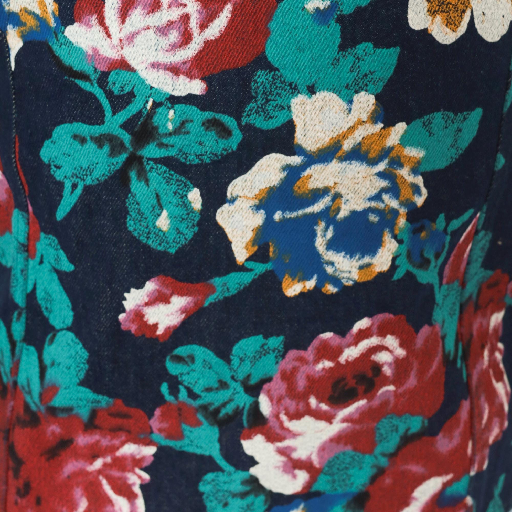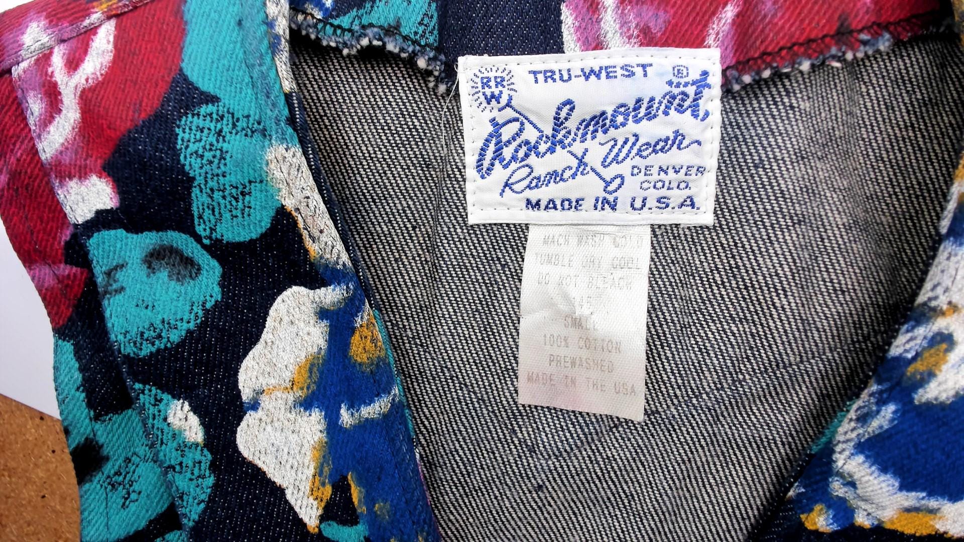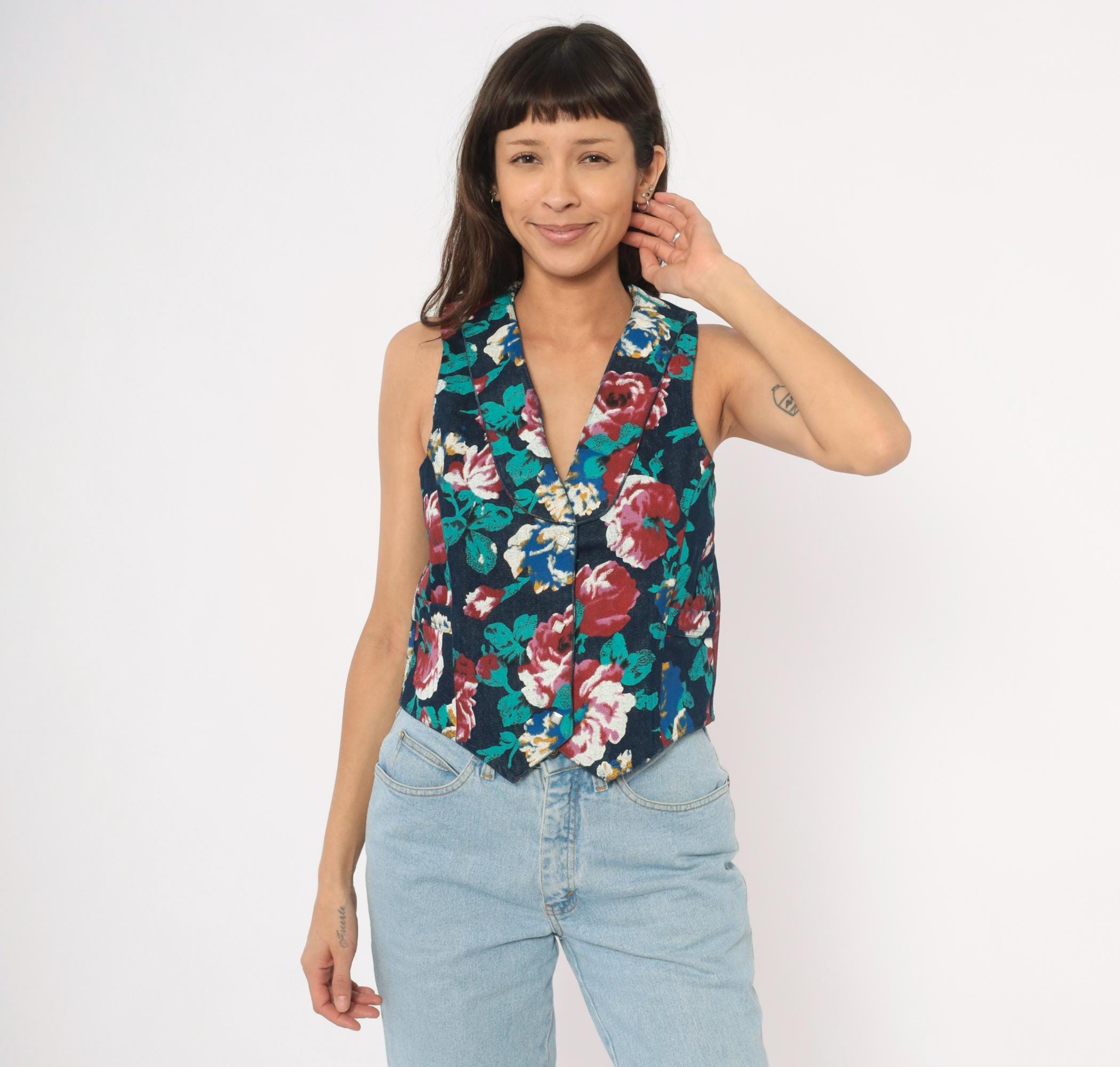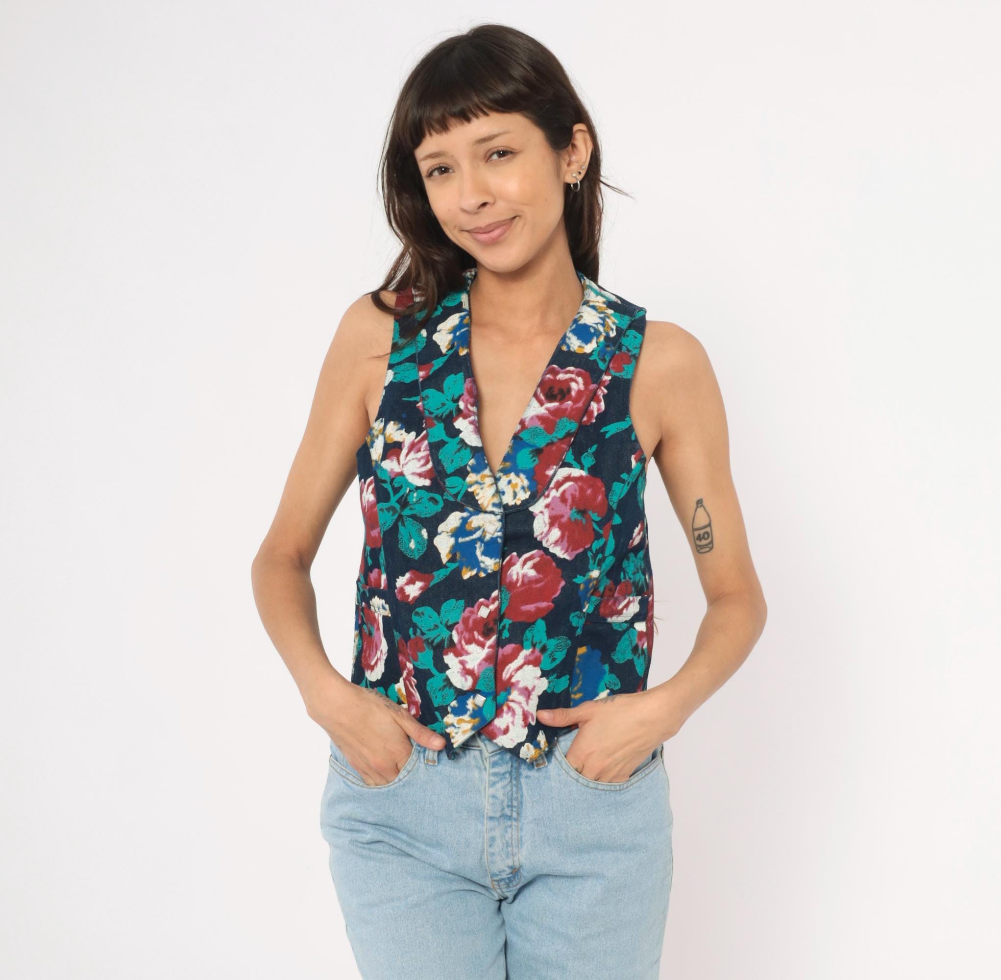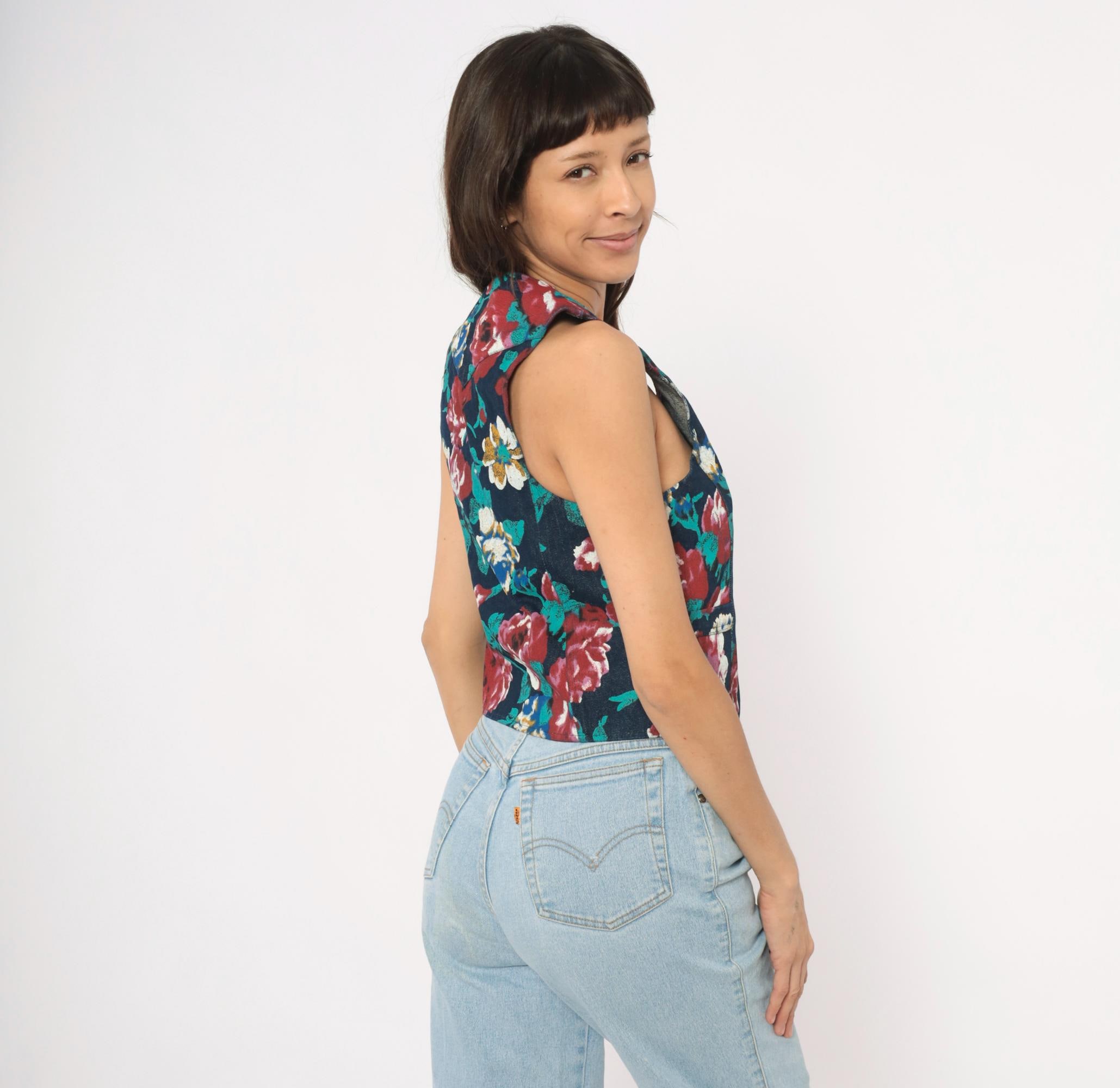 90s floral denim vest from Tru-West with a dark navy base covered in large-scale roses and leaves in teal, burgundy, pink, blue, and gold. V-neckline with notched lapel collar, pointed hemline, and small square silver-toned button front closure. Waist-level pockets on each side, with the same allover floral print continuing across the back panel.