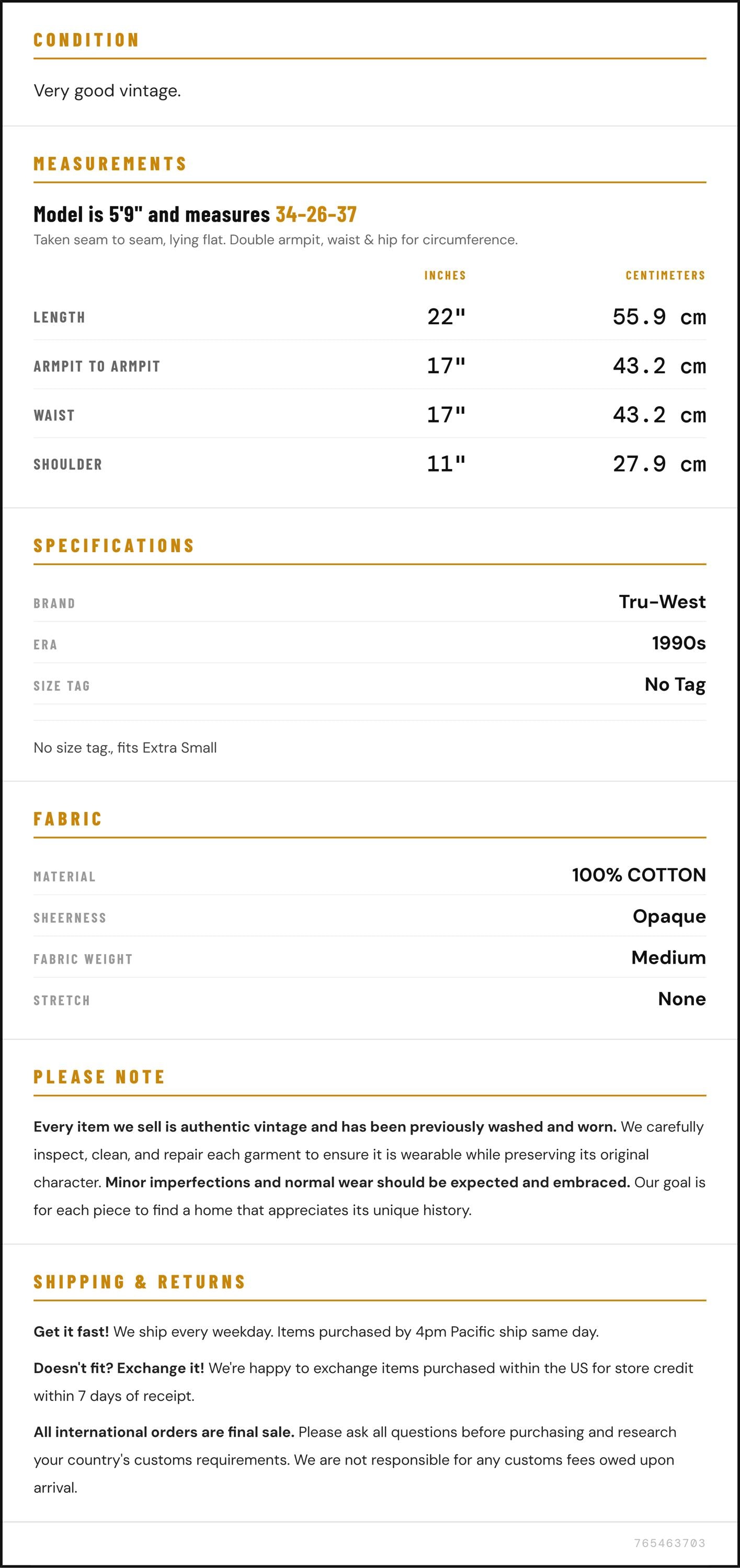 Vintage denim was usually made without any stretch, unlike modern jeans. Check the measurements to ensure proper fit, and remember to give yourself a little wiggle room in the waist and hips, depending on your preferred fit.