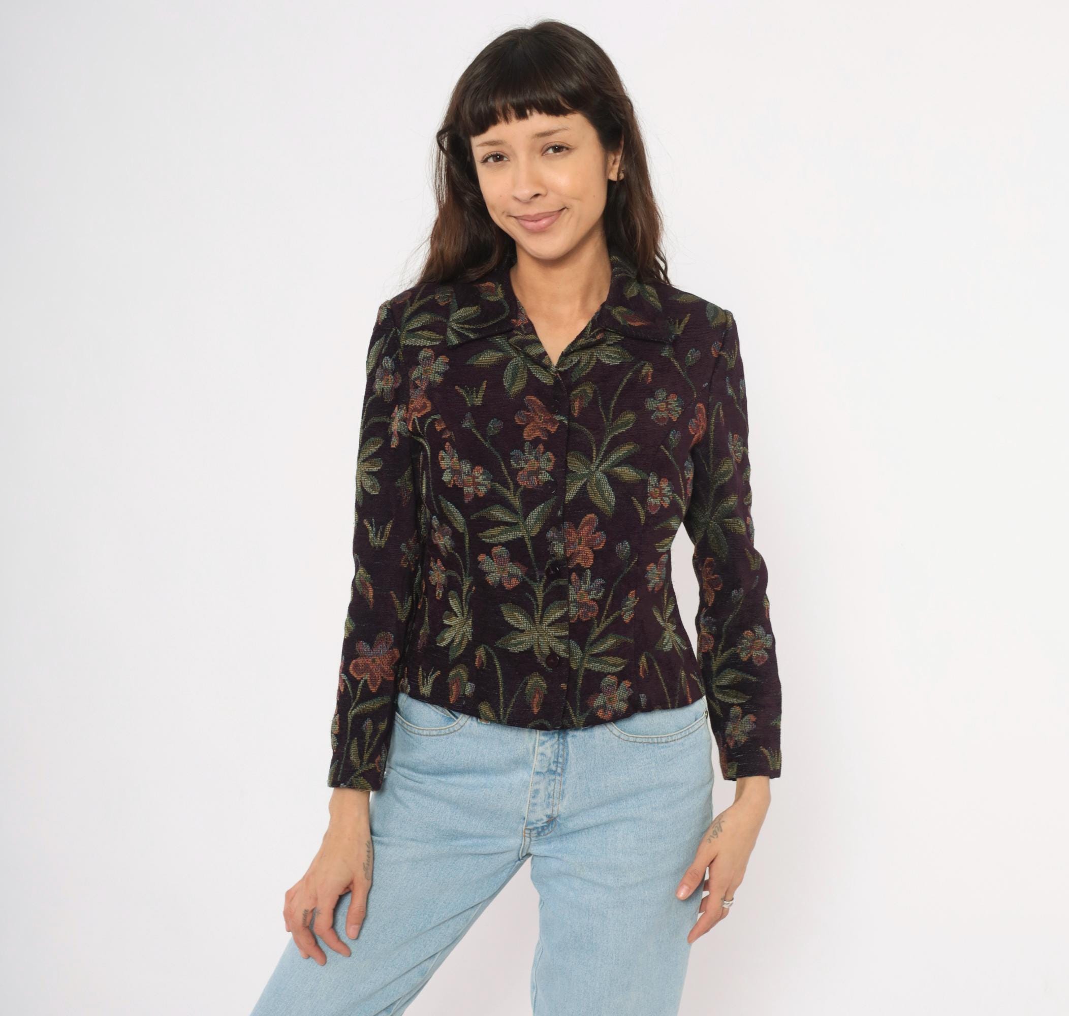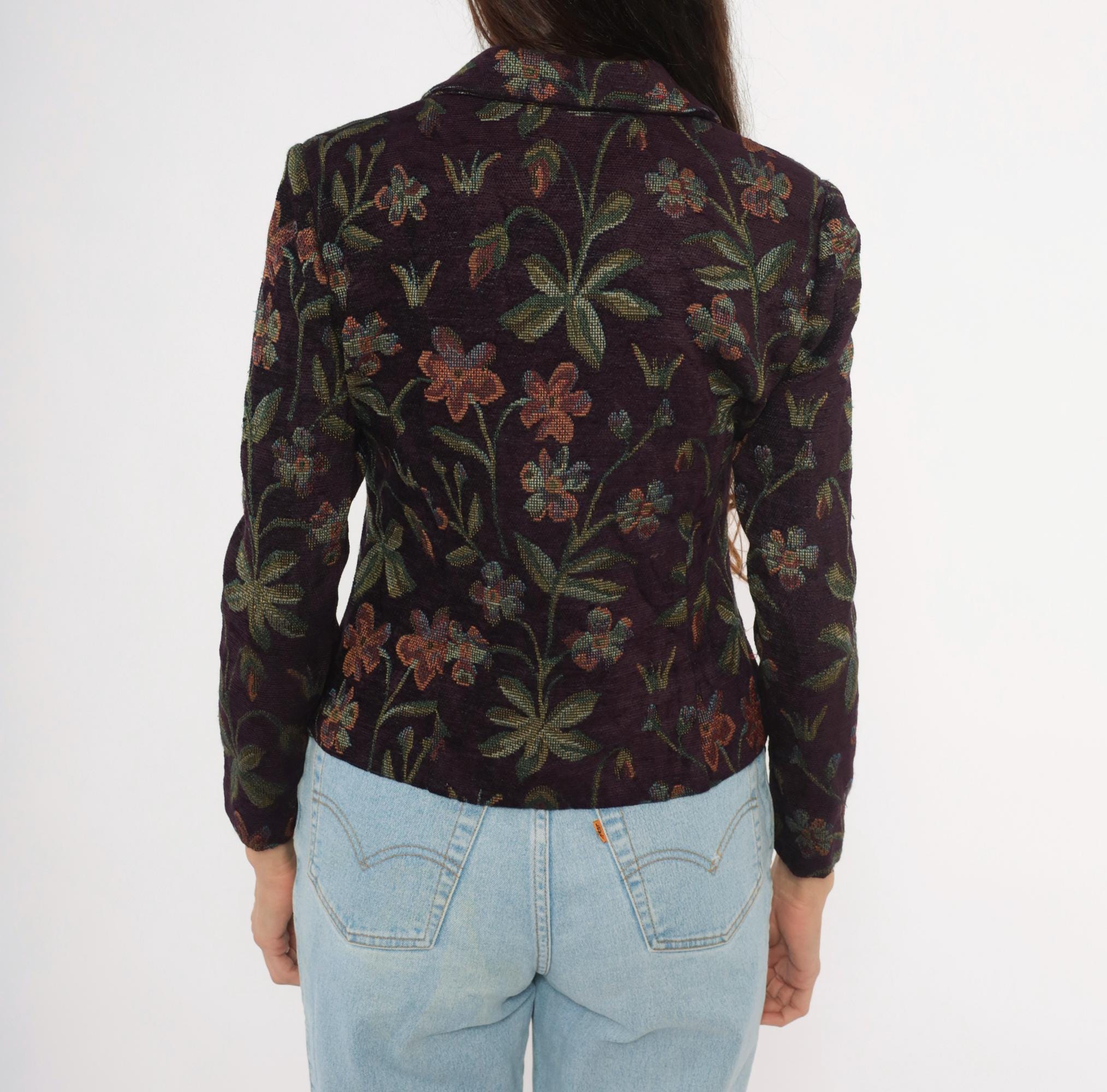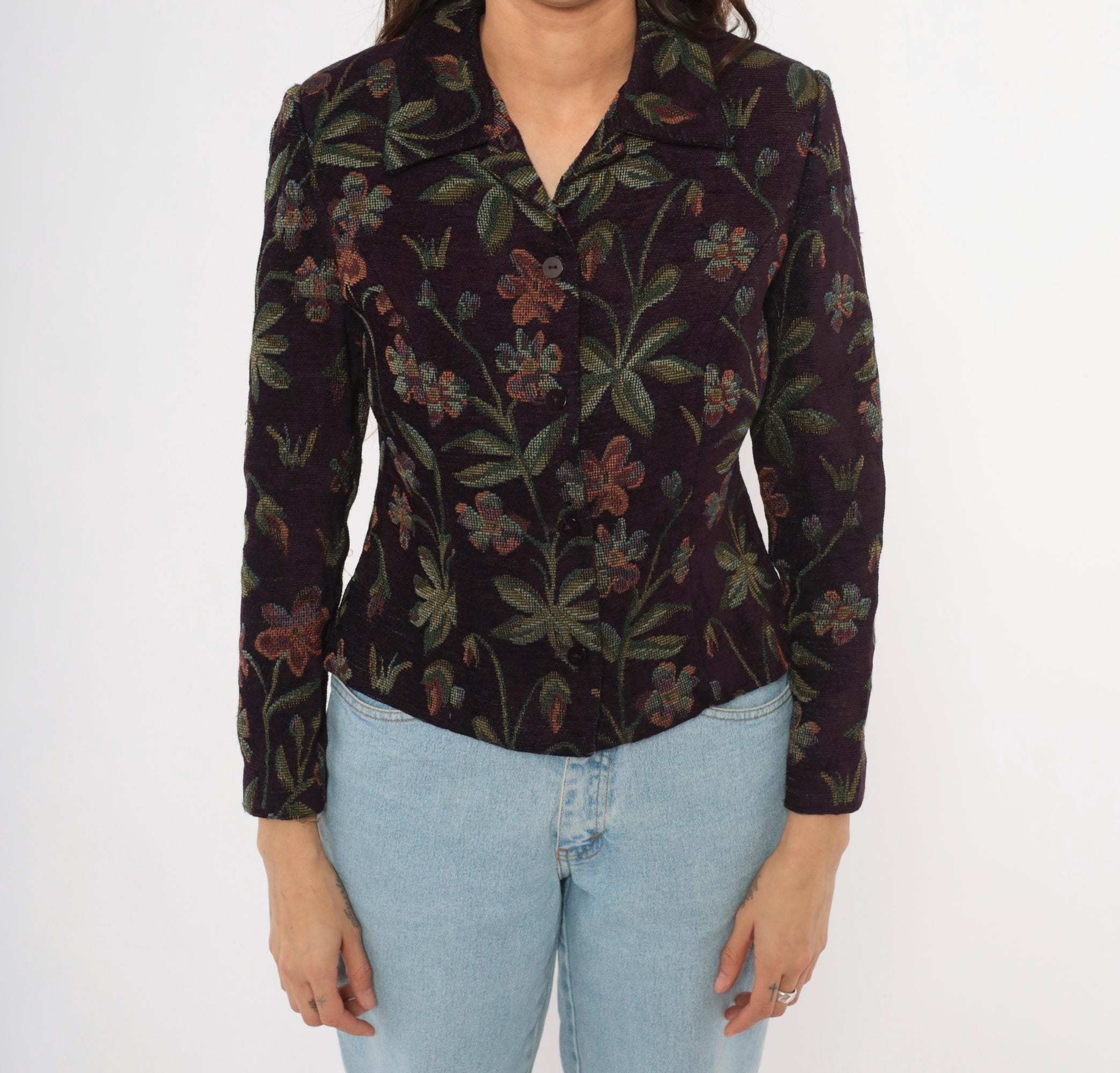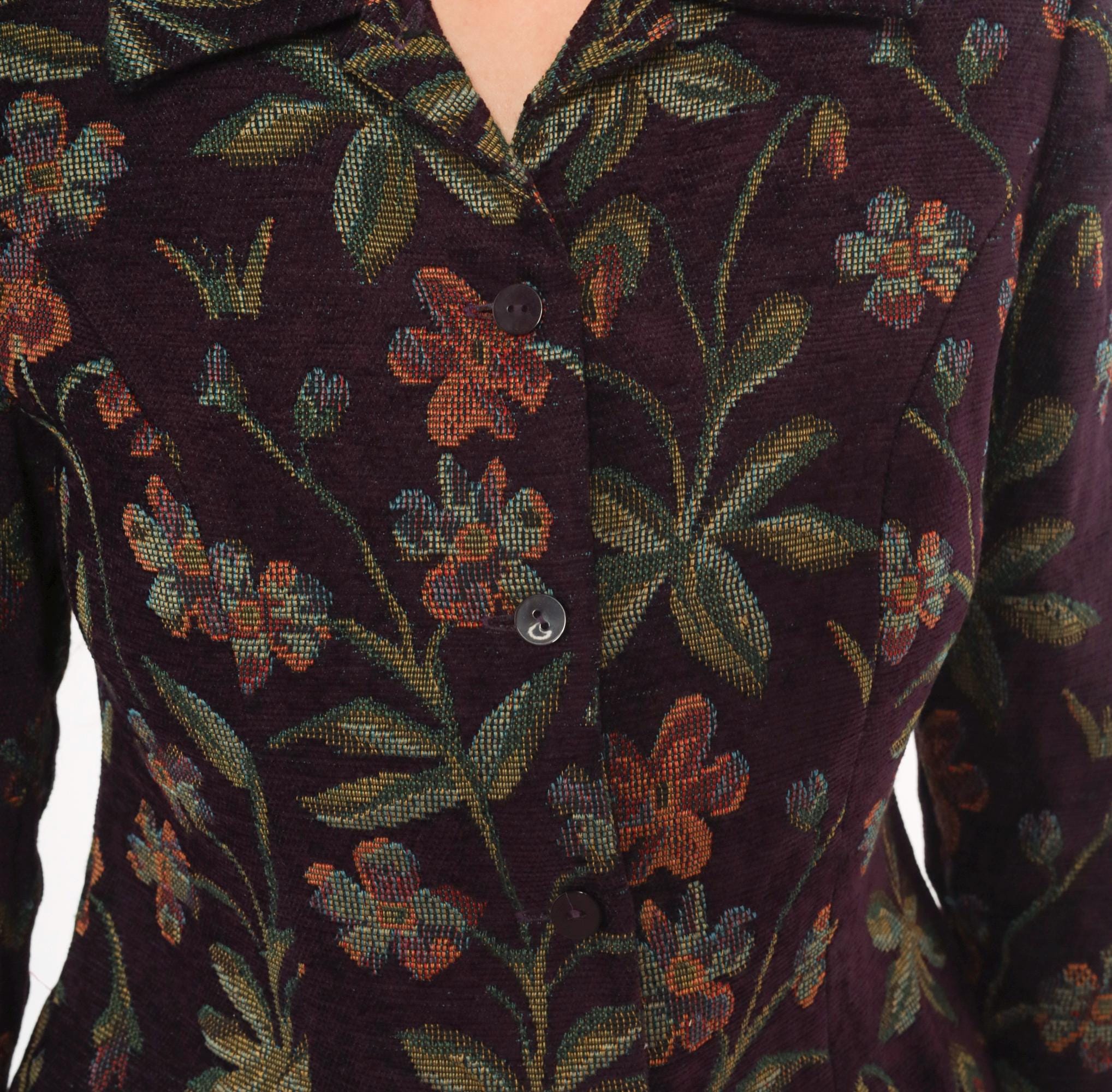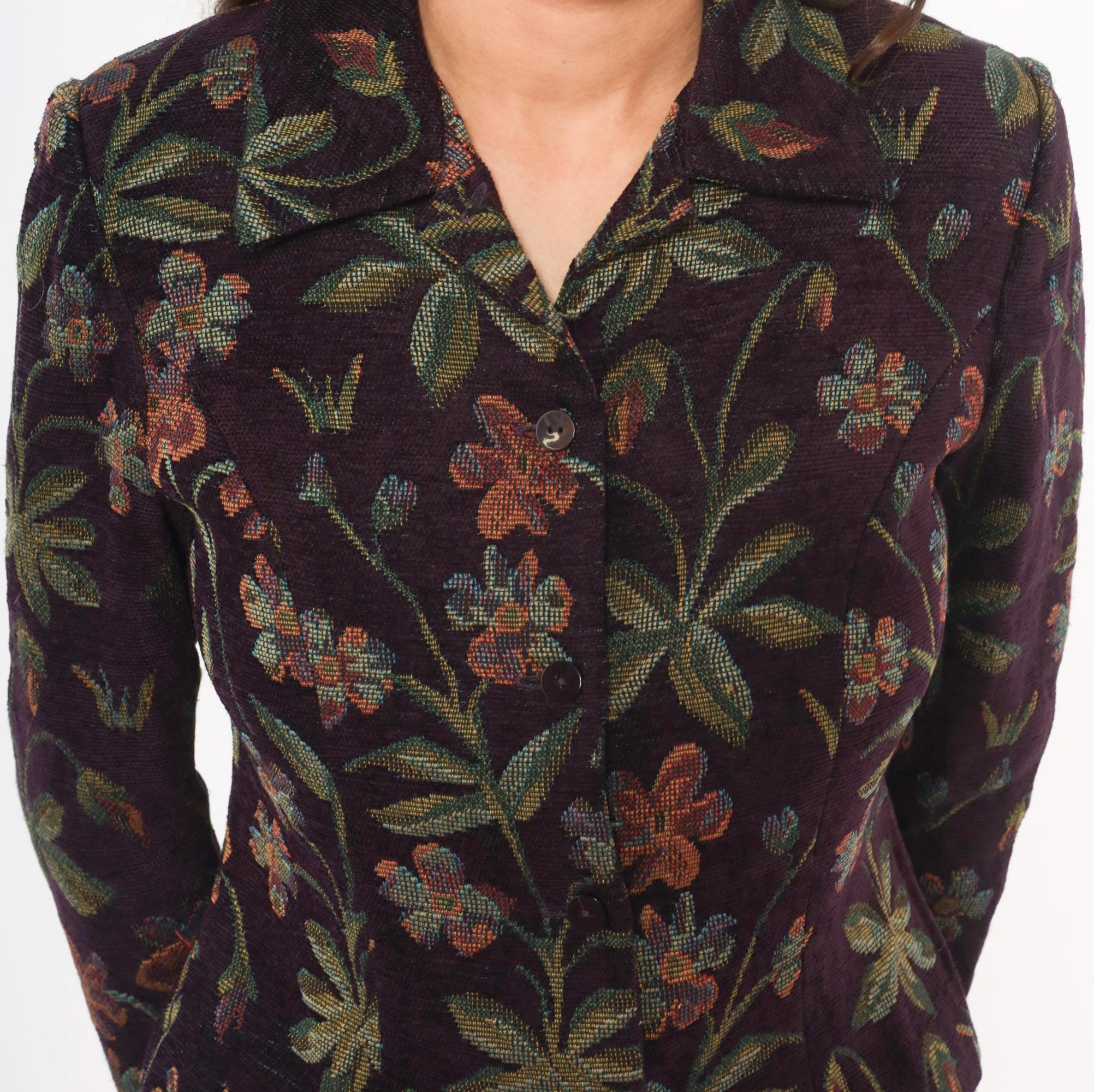 90s floral tapestry jacket from Jessica Howard in a deep plum base with green, rust, and blue botanical flowers and leaves woven throughout. Notched collar, button front closure, and fitted silhouette with a slightly cropped hem. Long sleeves with a subtle puff at the shoulder.