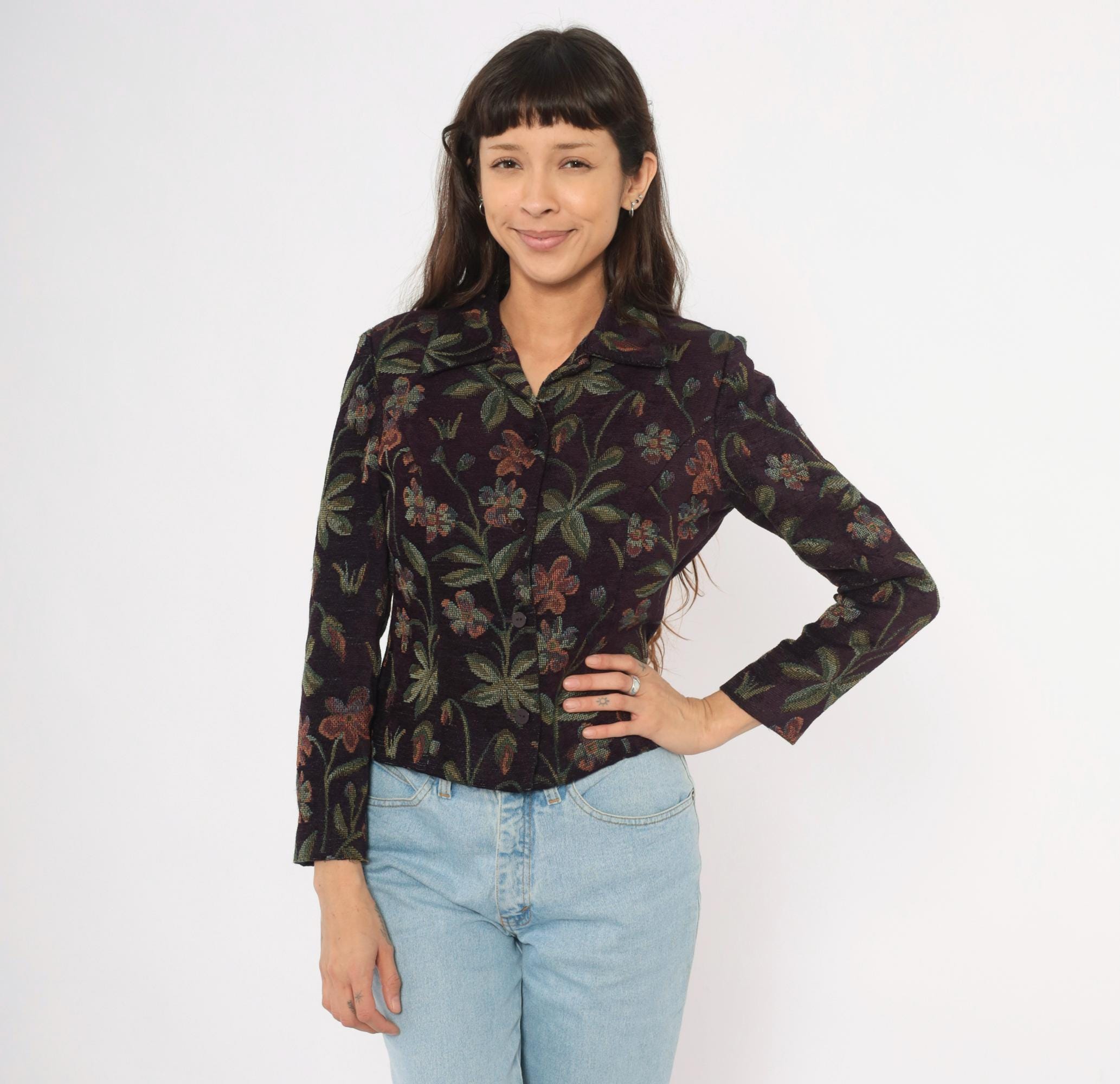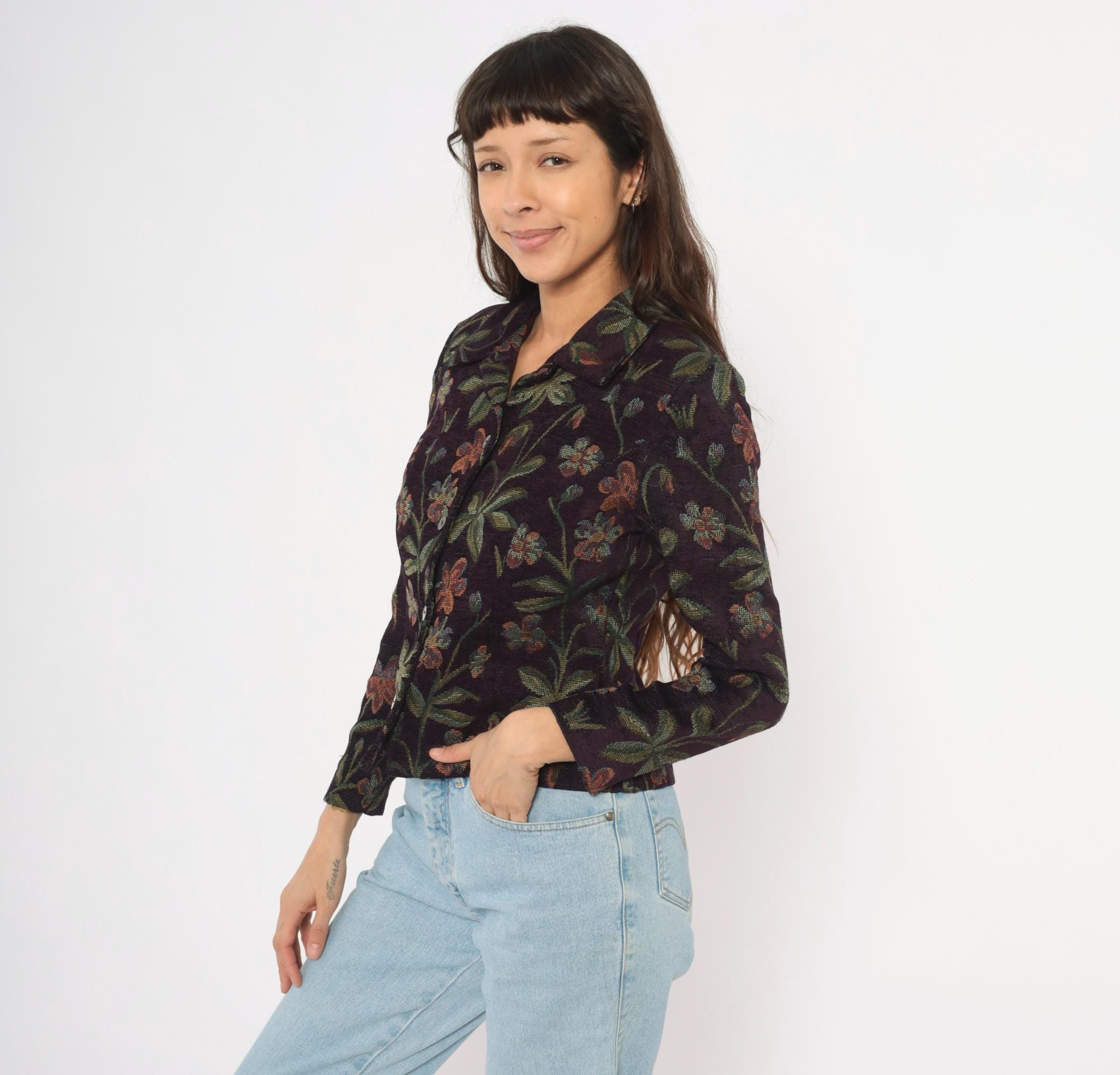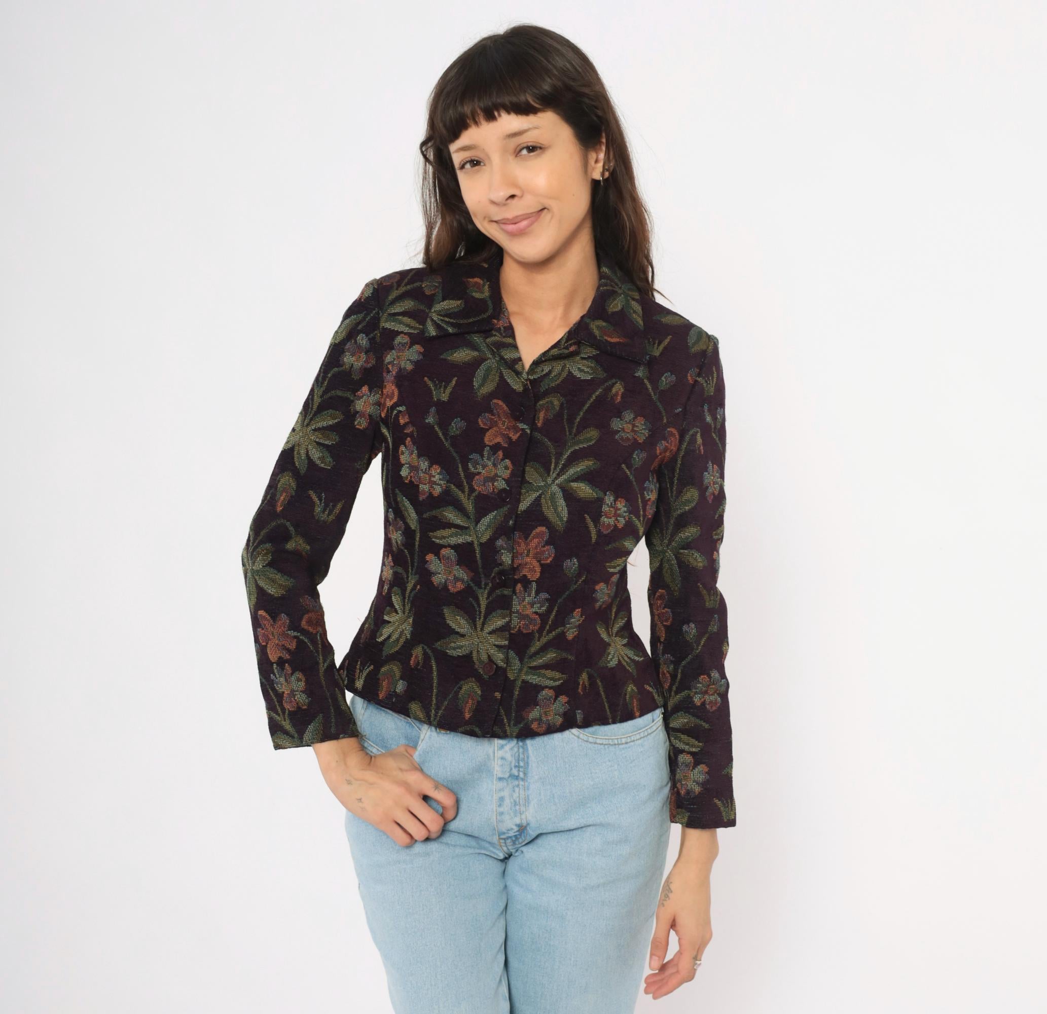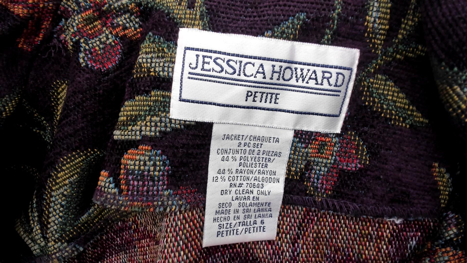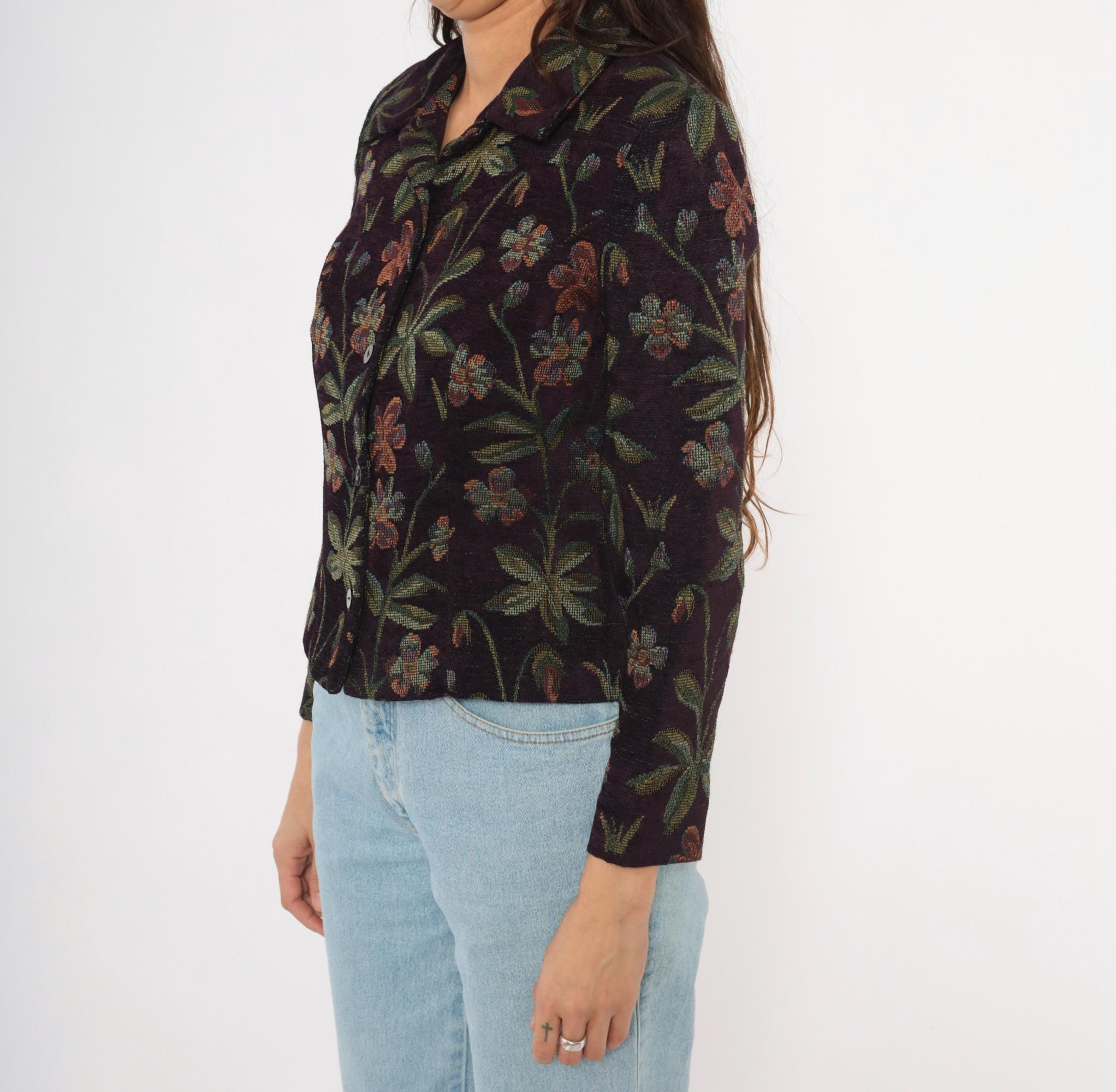 90s floral tapestry jacket from Jessica Howard in a deep plum base with green, rust, and blue botanical flowers and leaves woven throughout. Notched collar, button front closure, and fitted silhouette with a slightly cropped hem. Long sleeves with a subtle puff at the shoulder.