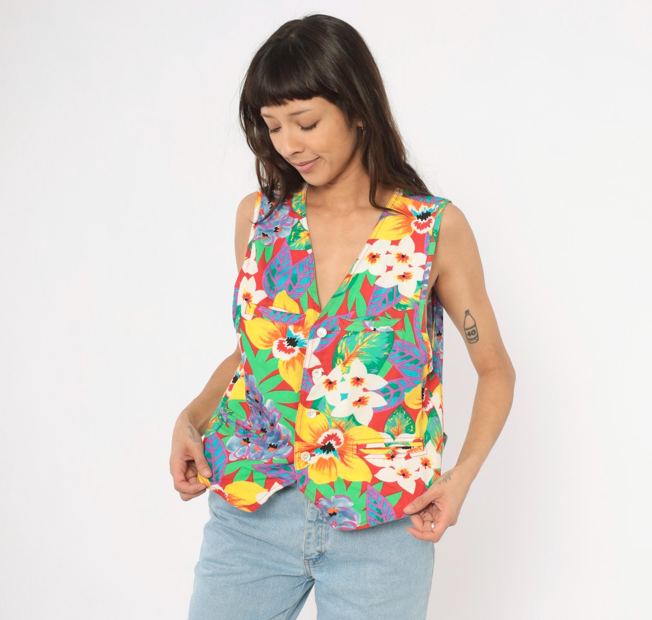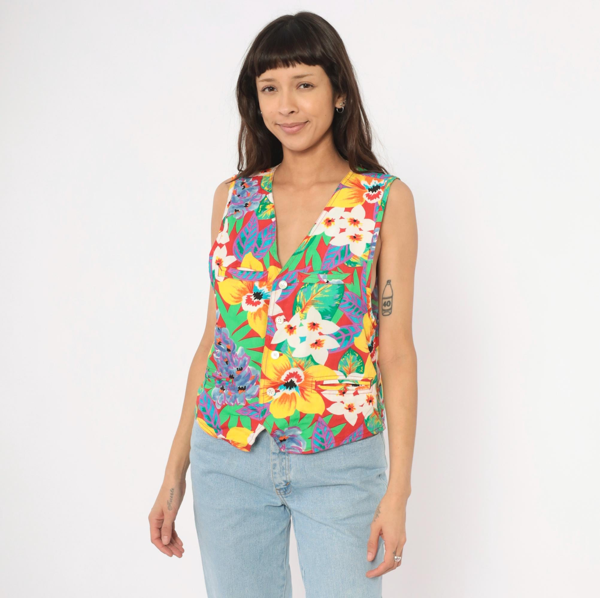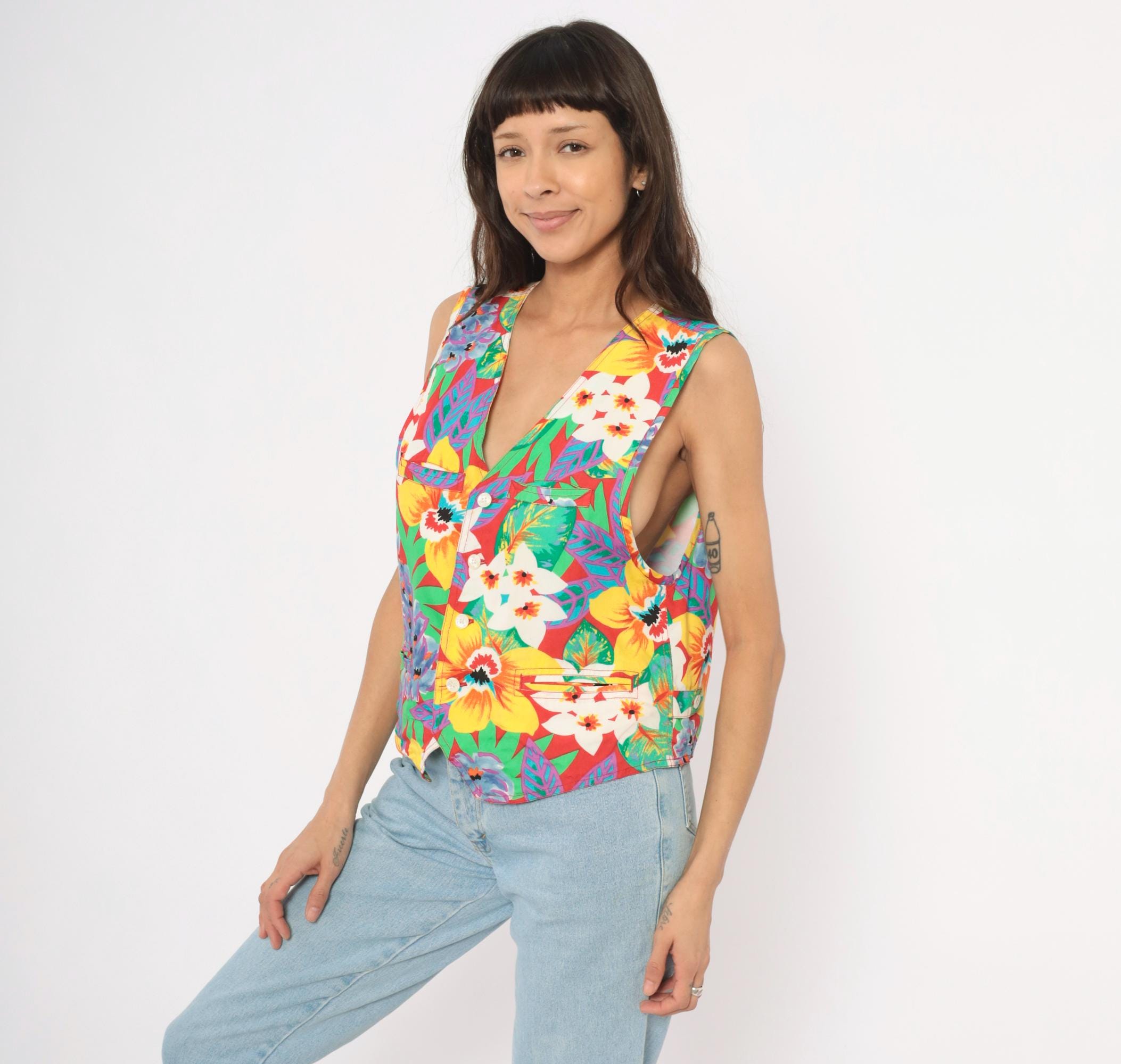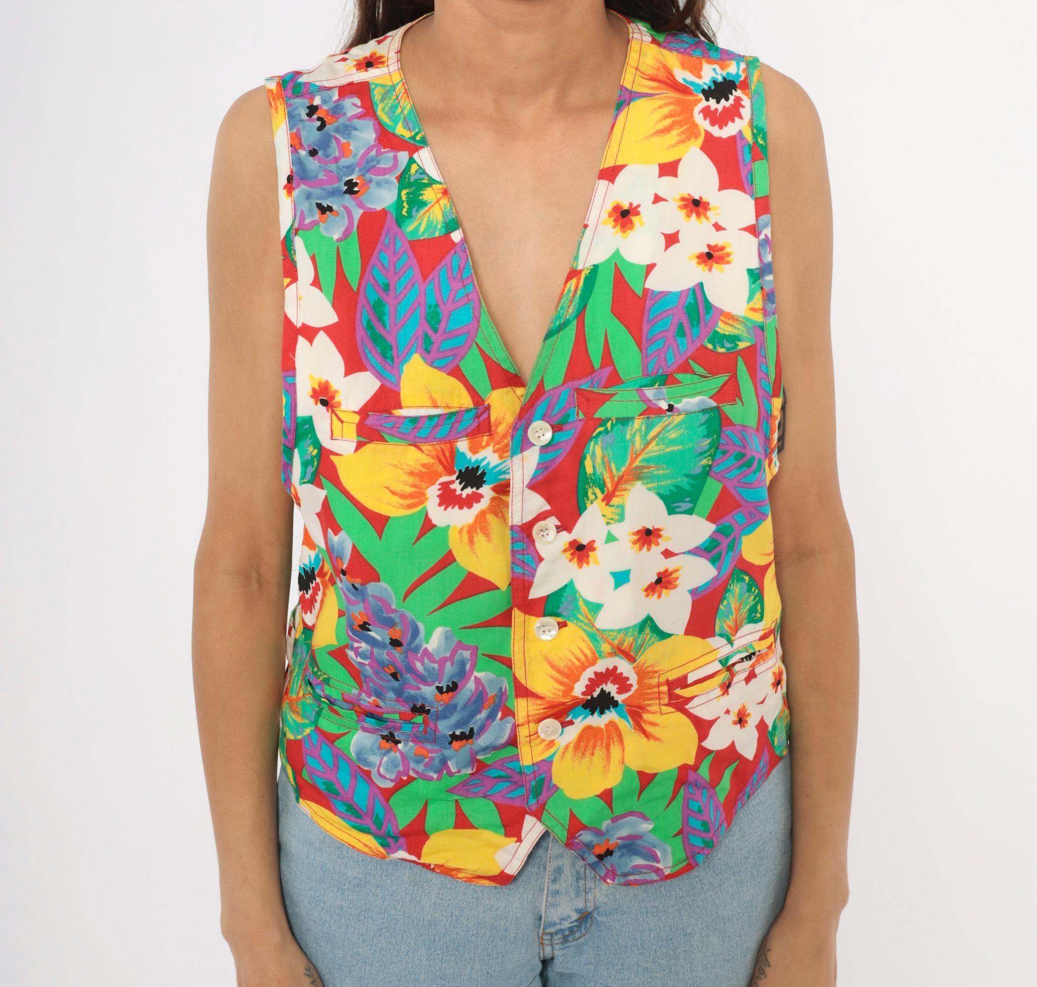 90s tropical floral vest from Lizwear with a V-neckline and four white button front closure. Red background covered in large-scale hibiscus, plumeria, and leaf print in green, yellow, orange, purple, blue, and white. Two welt chest pockets and two lower welt pockets at the waist, with a pointed hem.