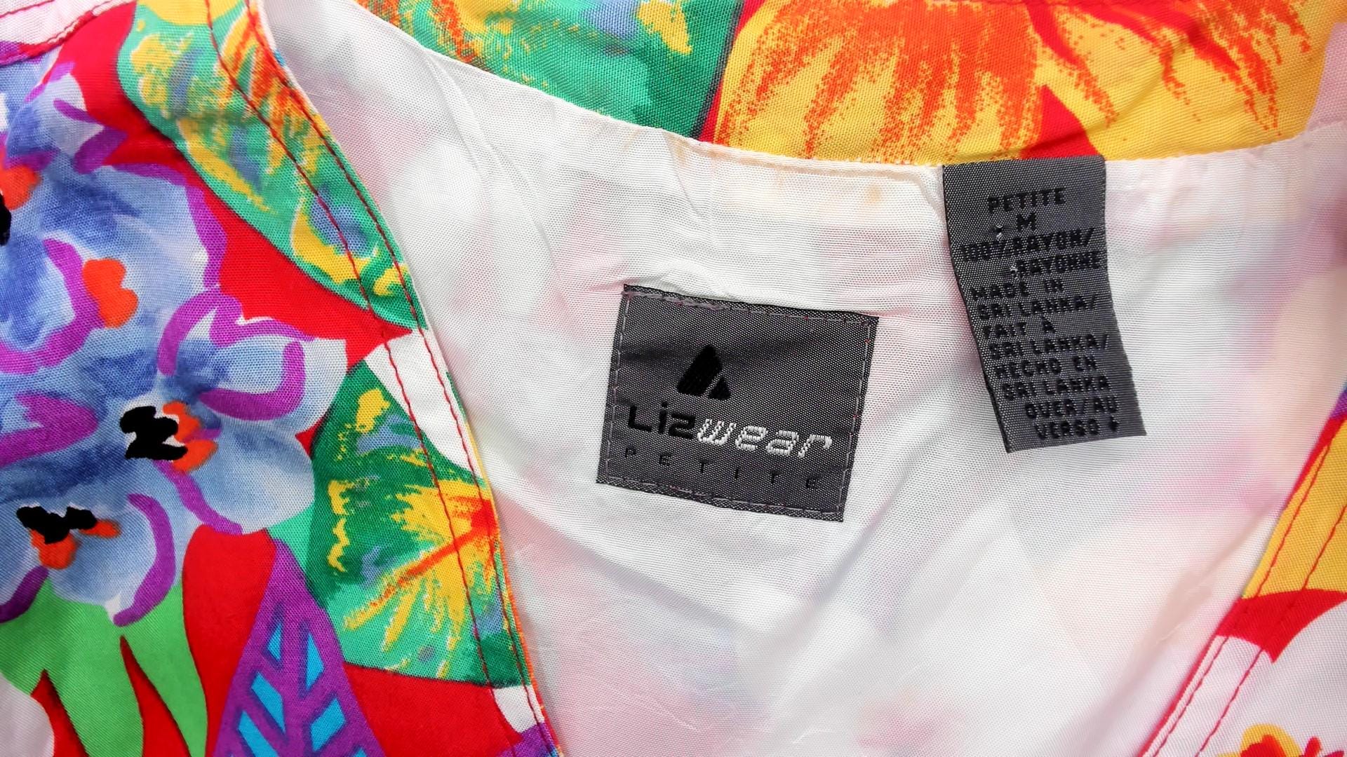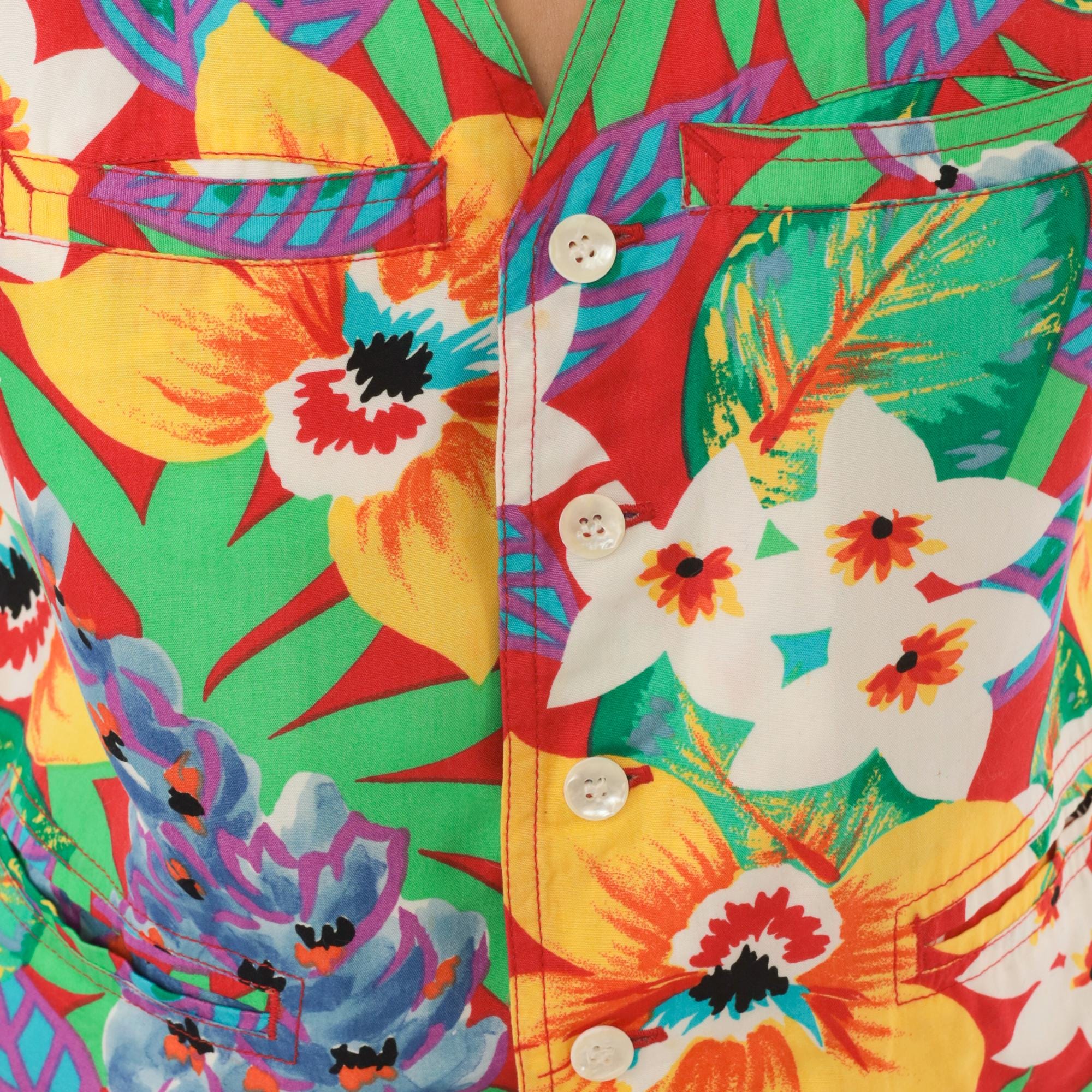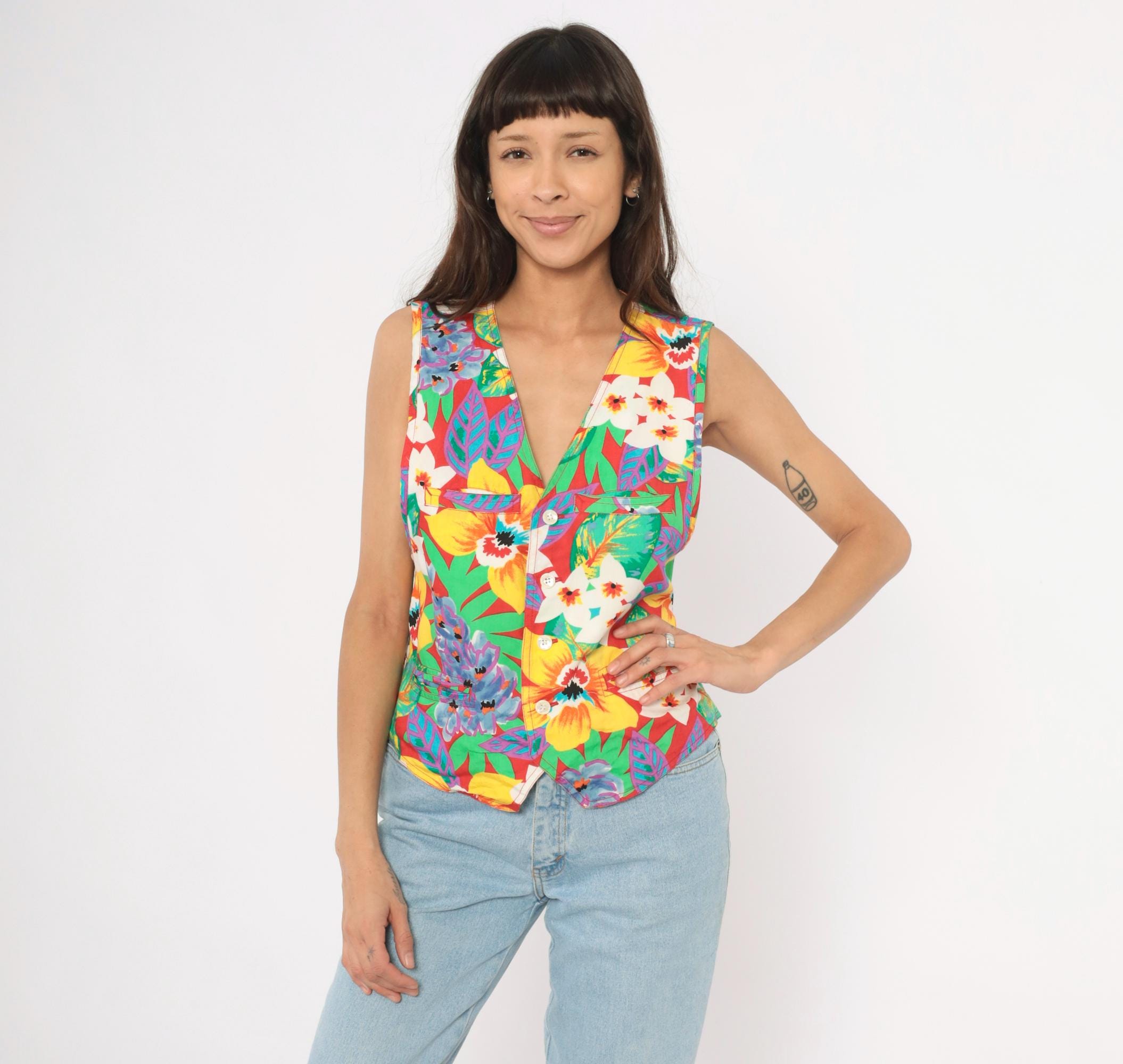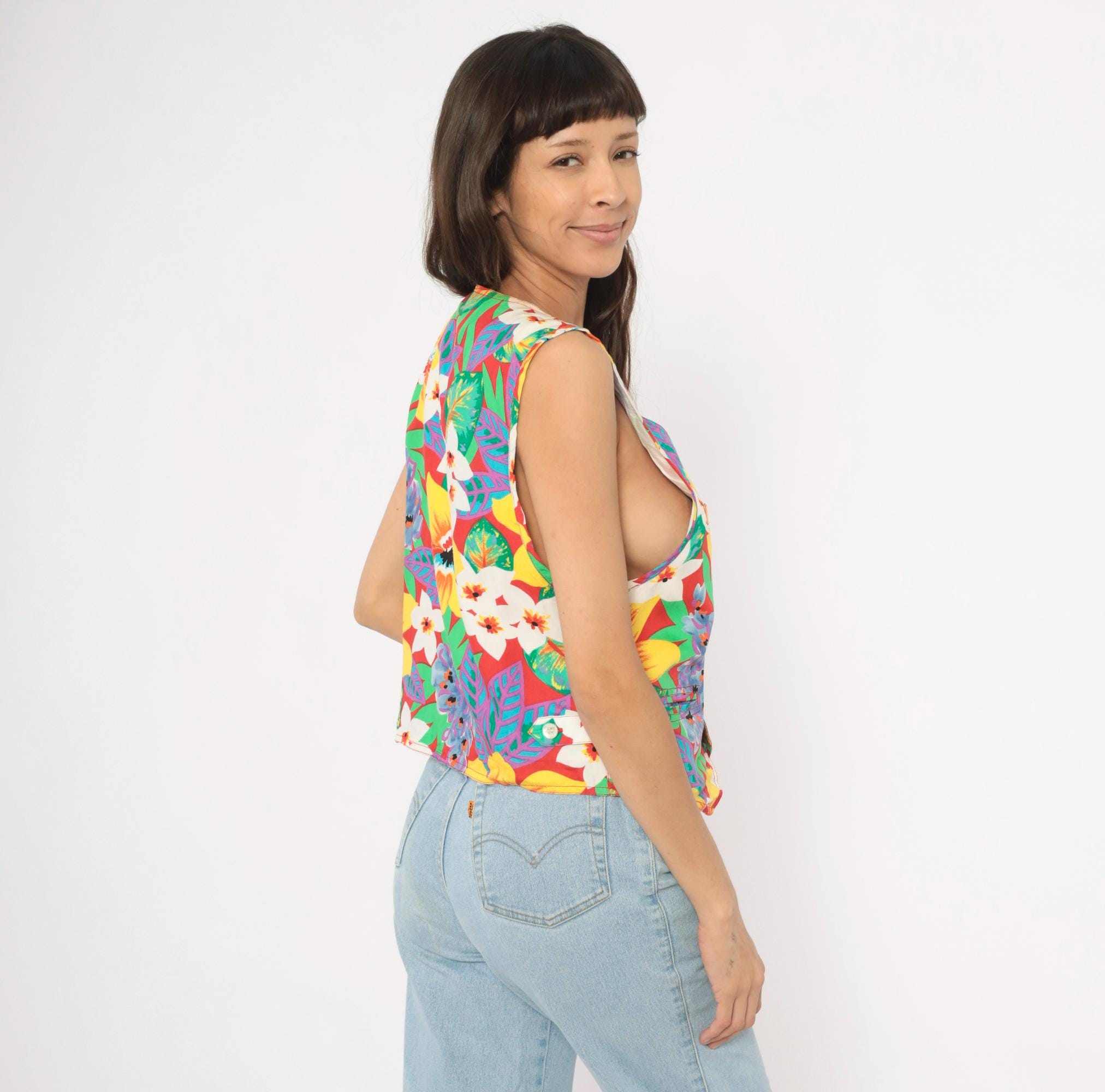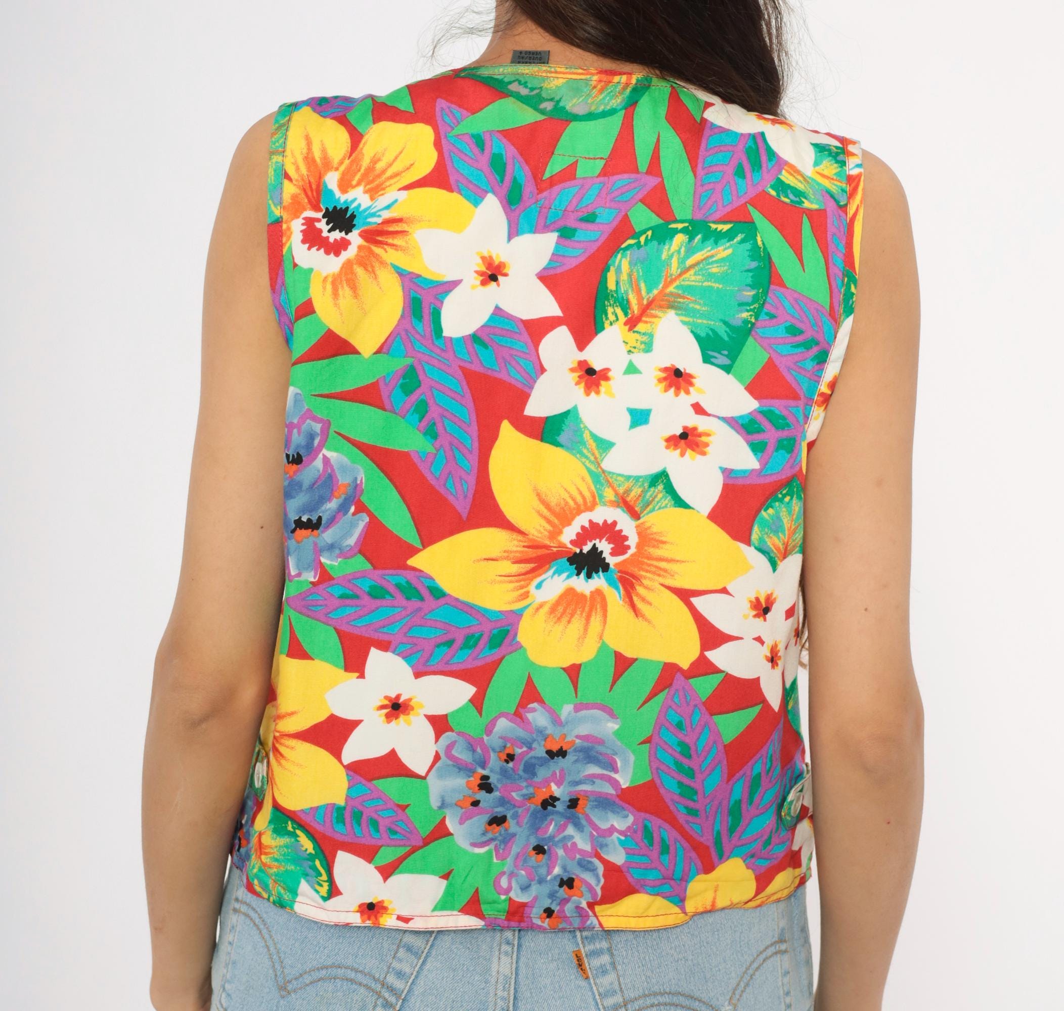 90s tropical floral vest from Lizwear with a V-neckline and four white button front closure. Red background covered in large-scale hibiscus, plumeria, and leaf print in green, yellow, orange, purple, blue, and white. Two welt chest pockets and two lower welt pockets at the waist, with a pointed hem.