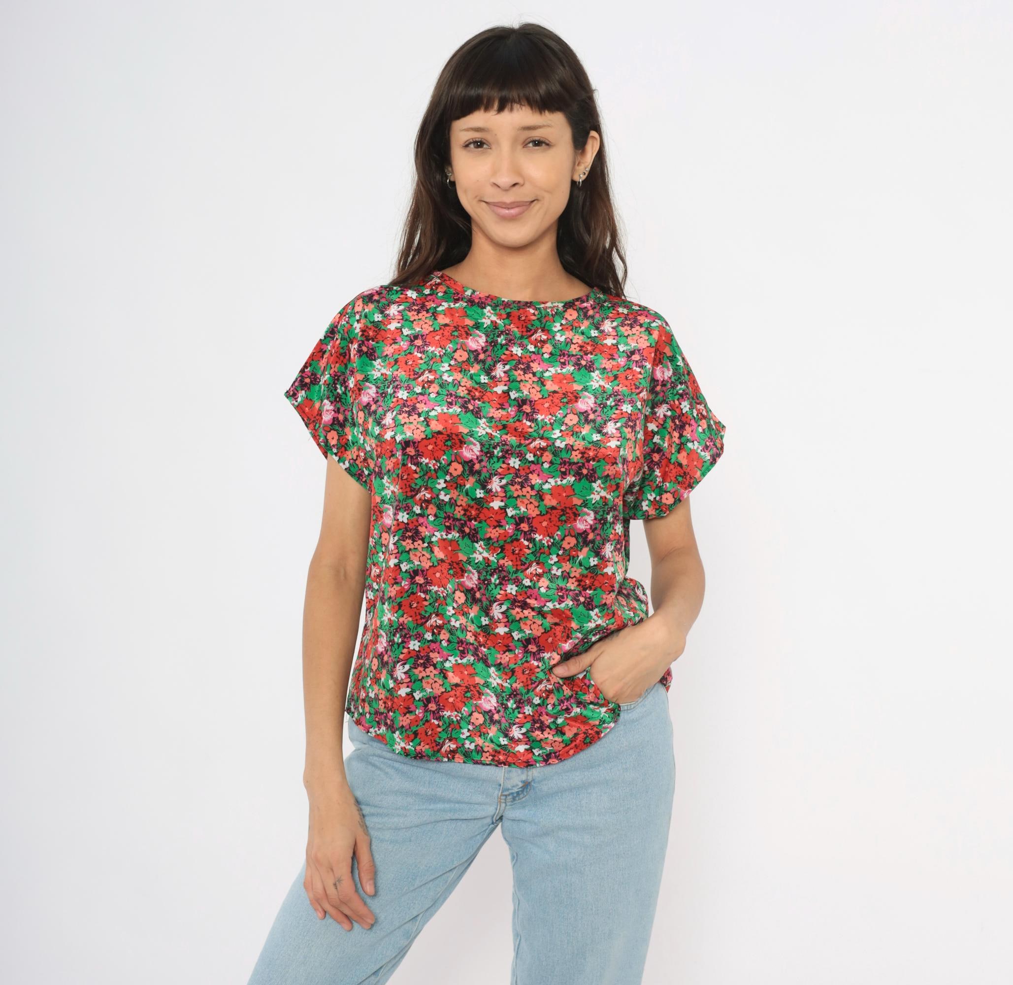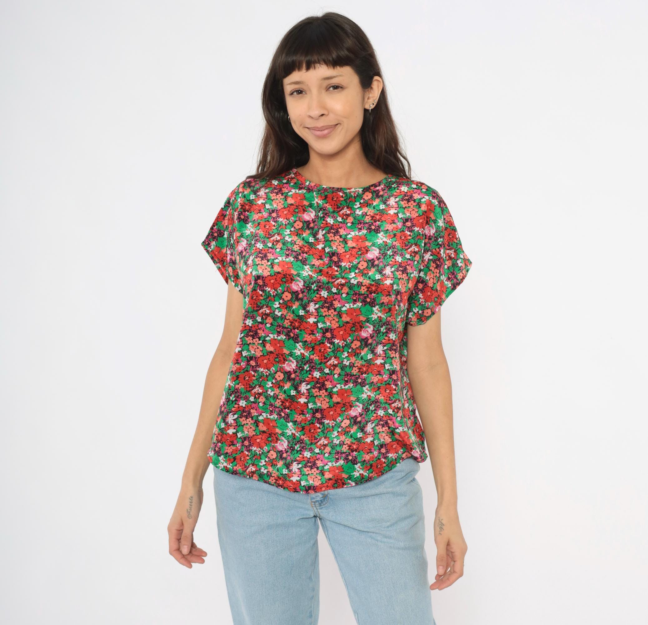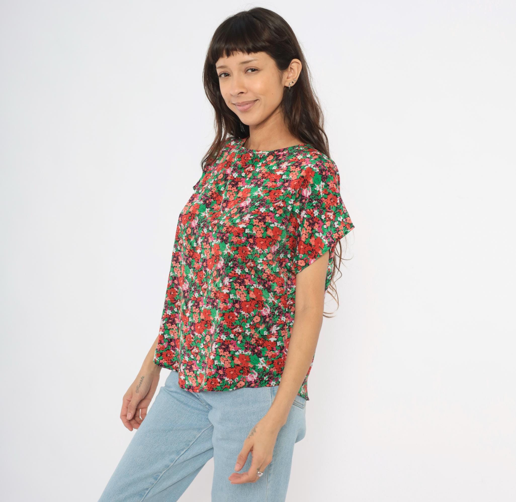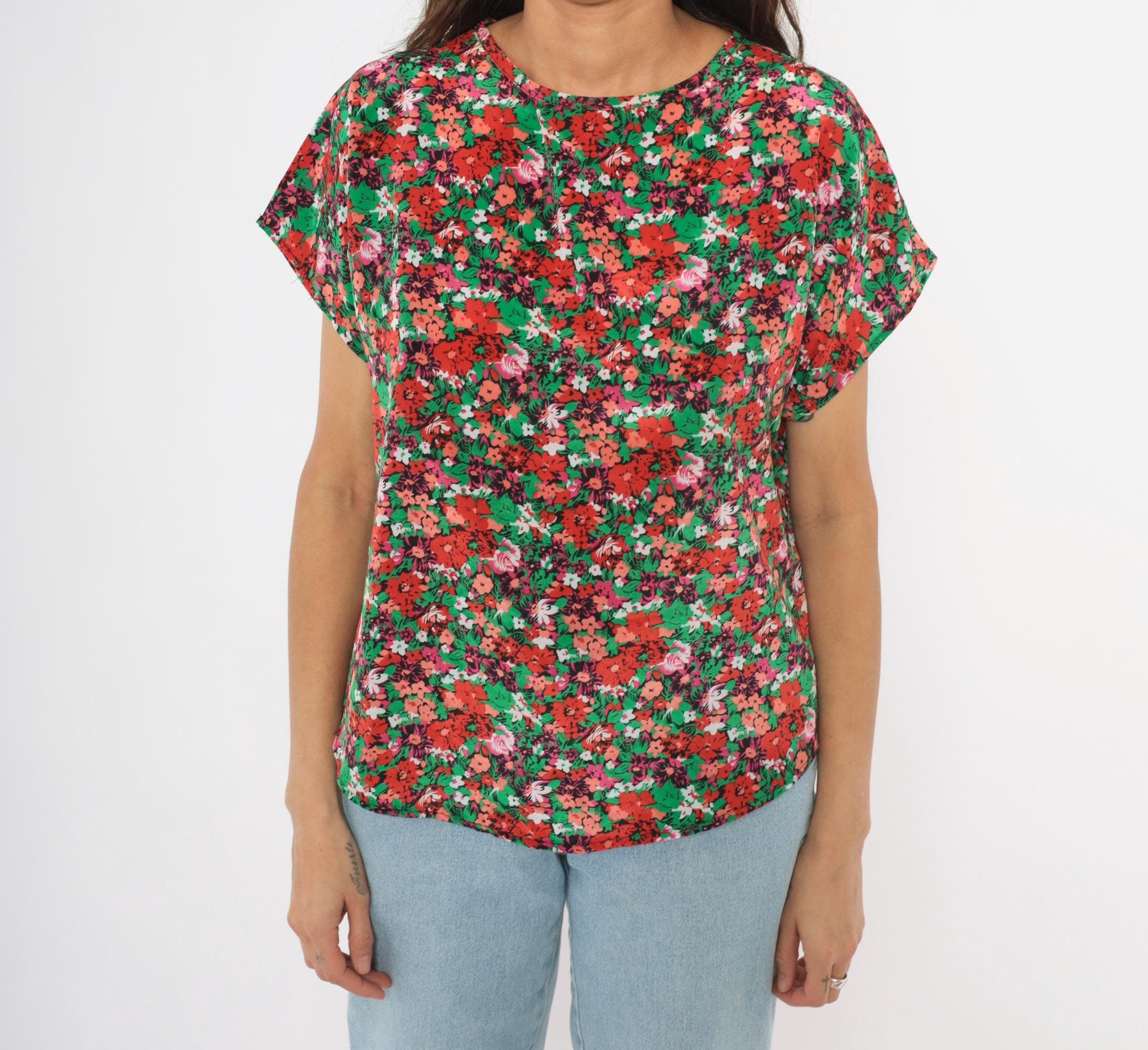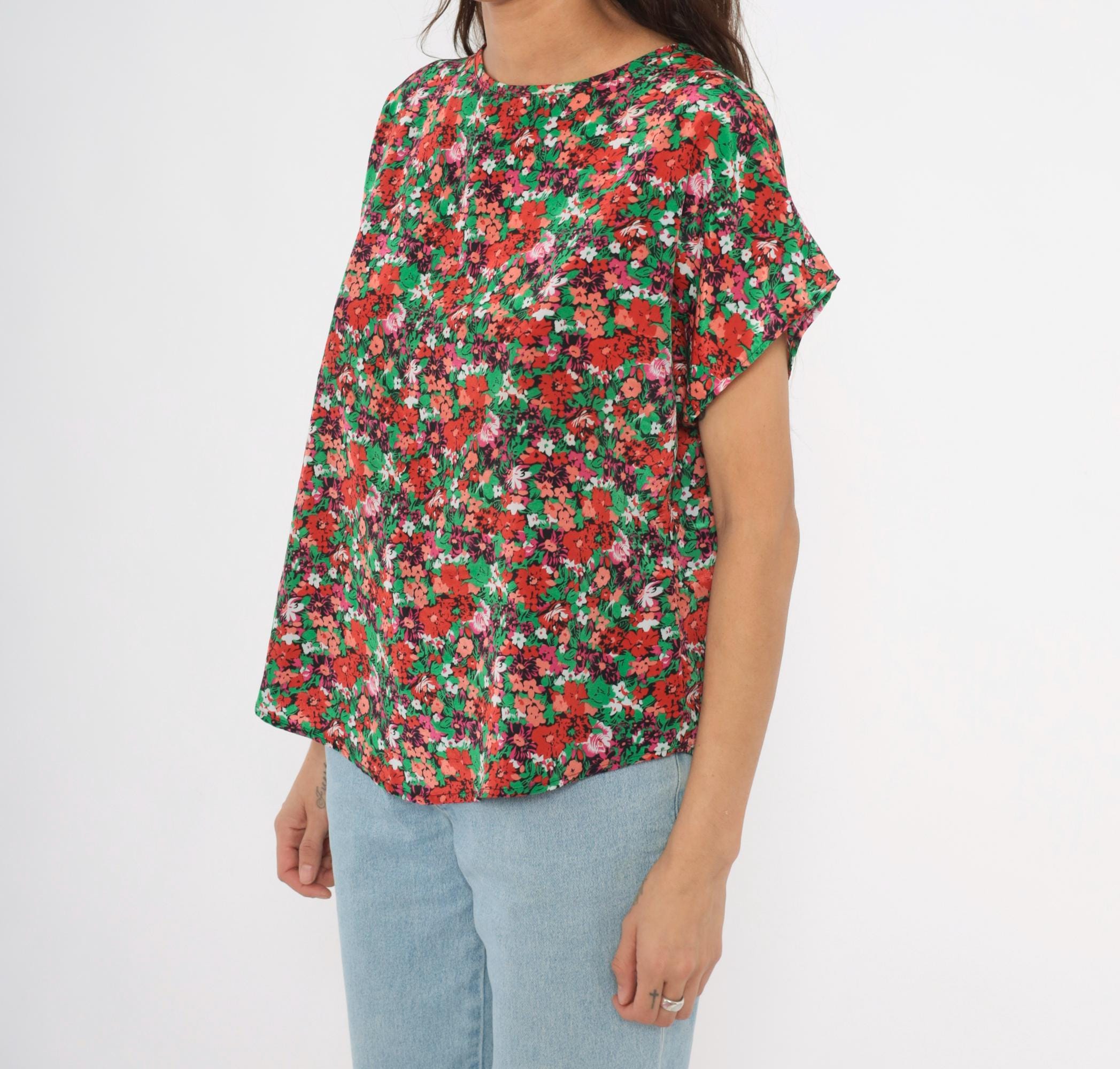 90s ditsy floral blouse from Jennifer Lloyd with an allover garden print in red, coral, pink, green, and white. Round crew neckline, cap sleeves, and a relaxed boxy silhouette with a curved hem. Pullover construction with no closures or pockets.