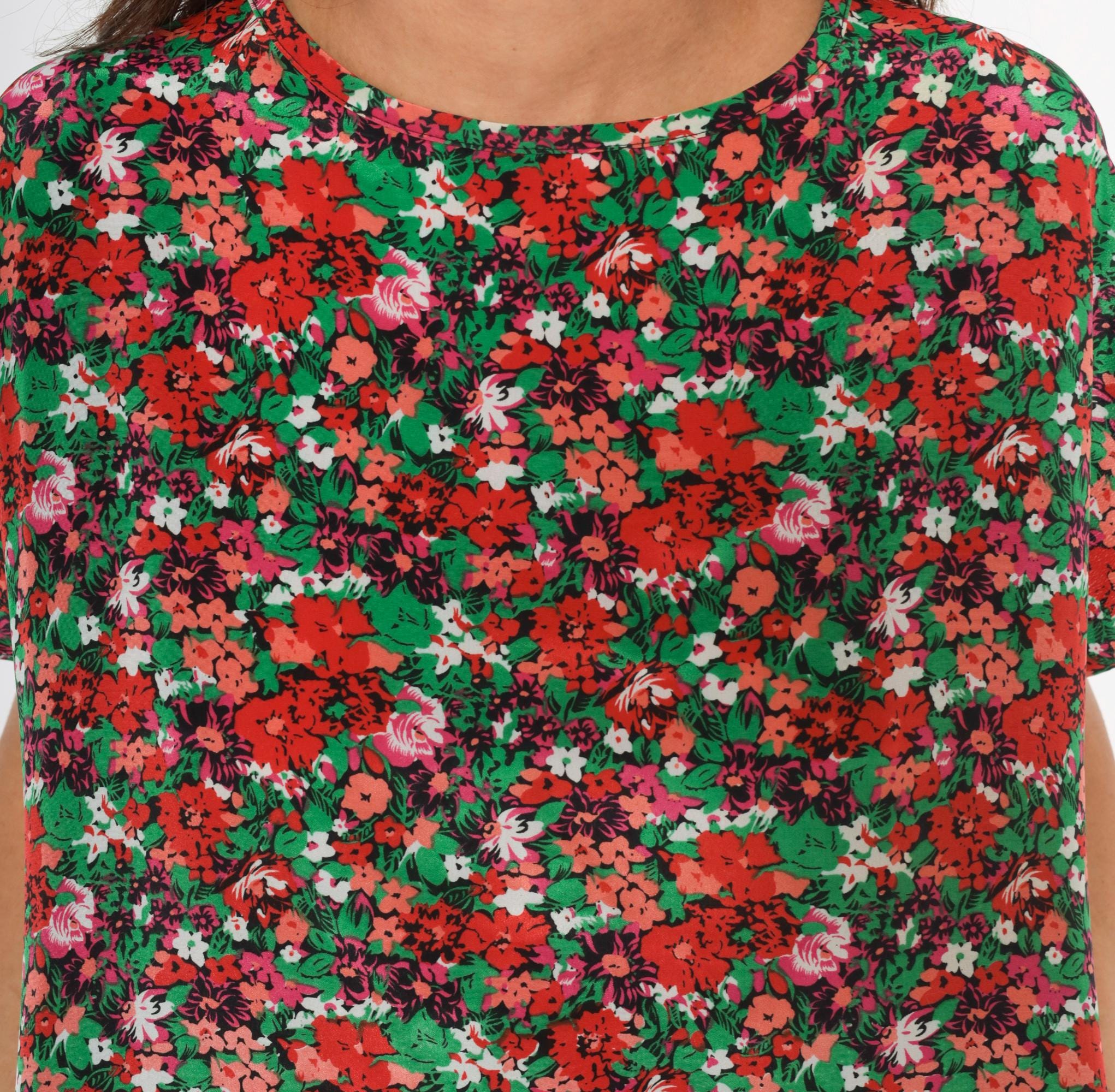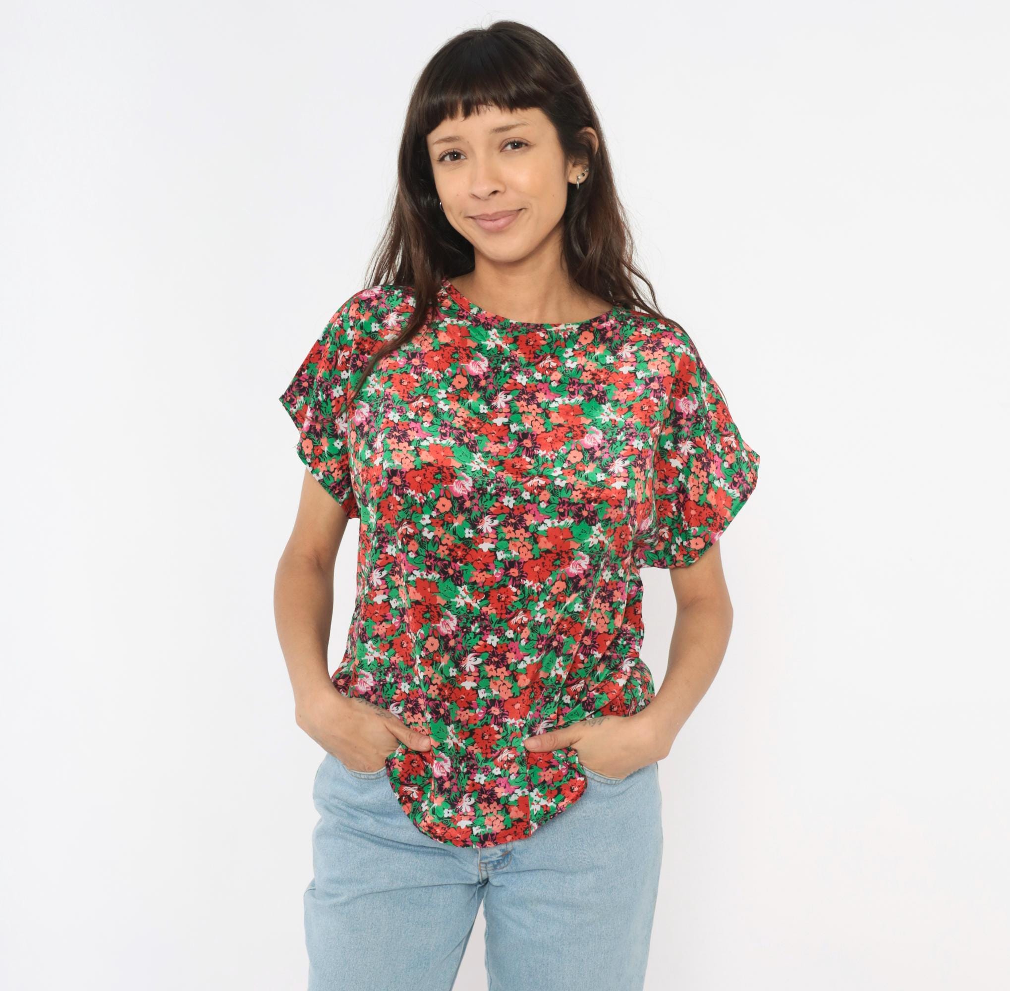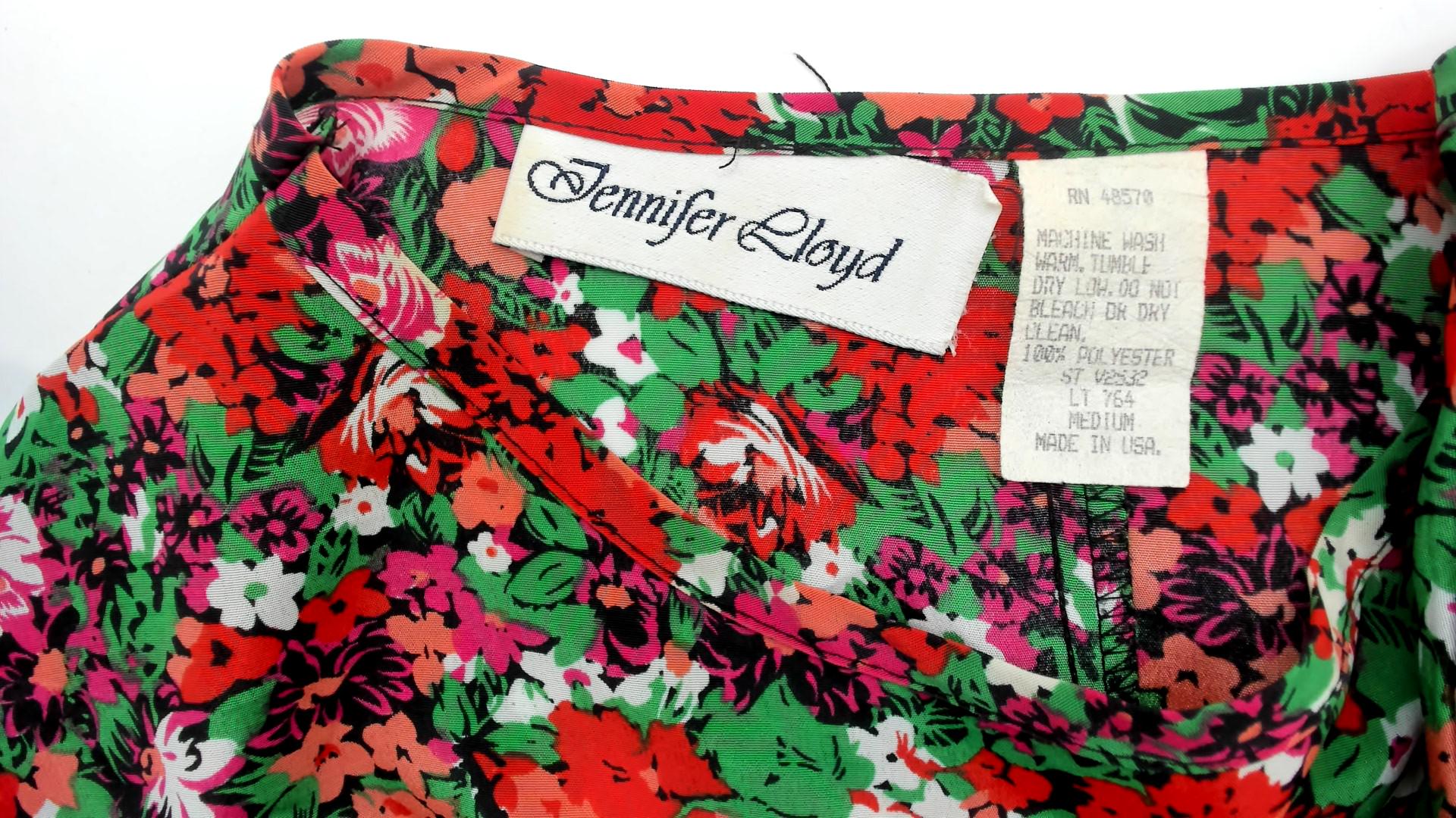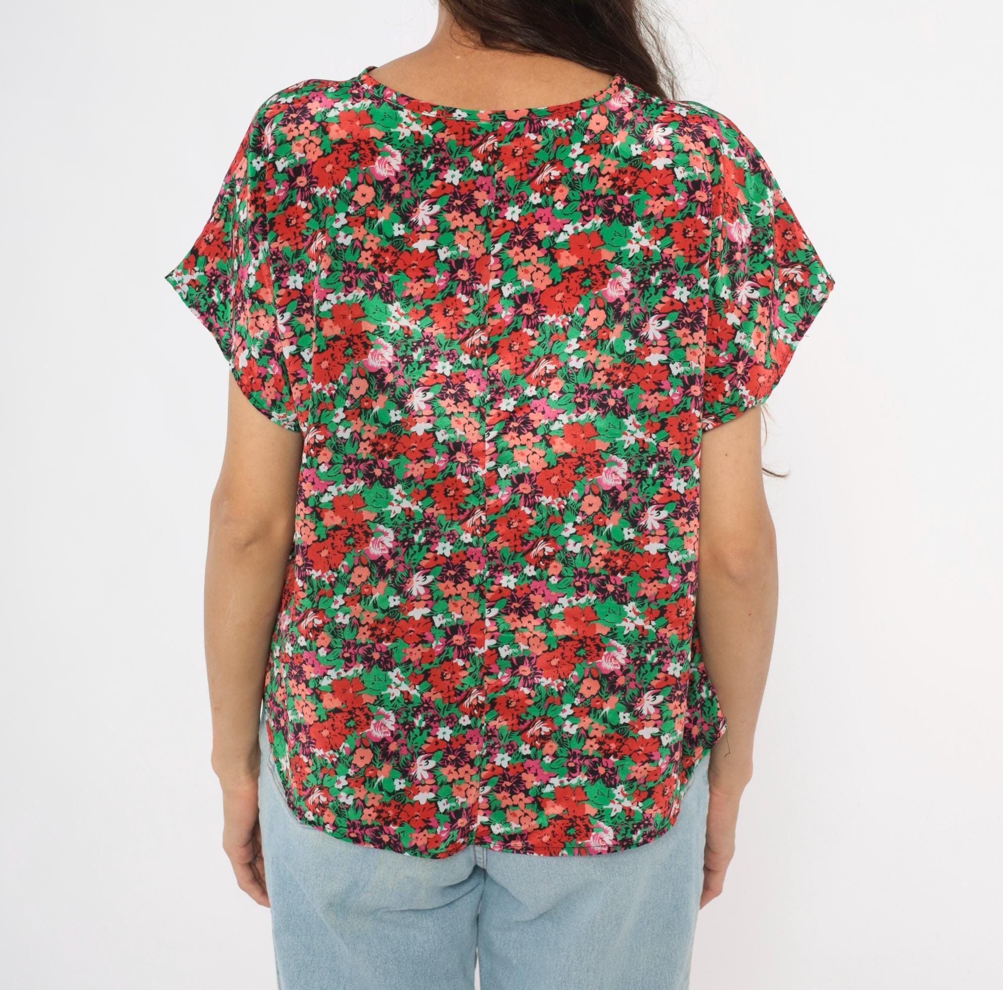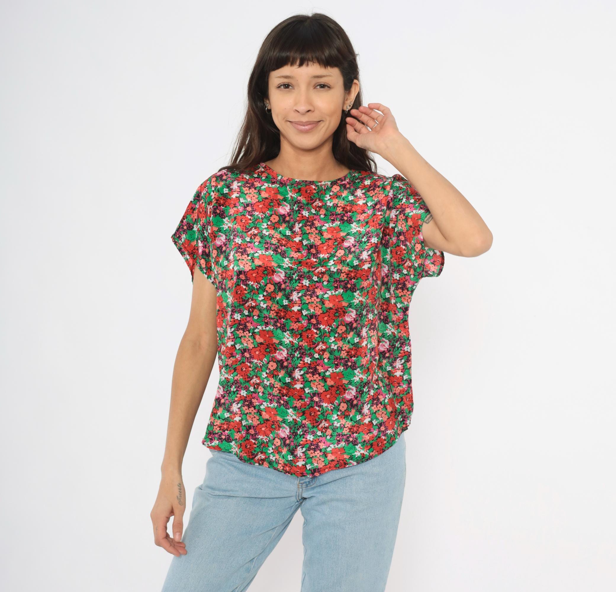 90s ditsy floral blouse from Jennifer Lloyd with an allover garden print in red, coral, pink, green, and white. Round crew neckline, cap sleeves, and a relaxed boxy silhouette with a curved hem. Pullover construction with no closures or pockets.