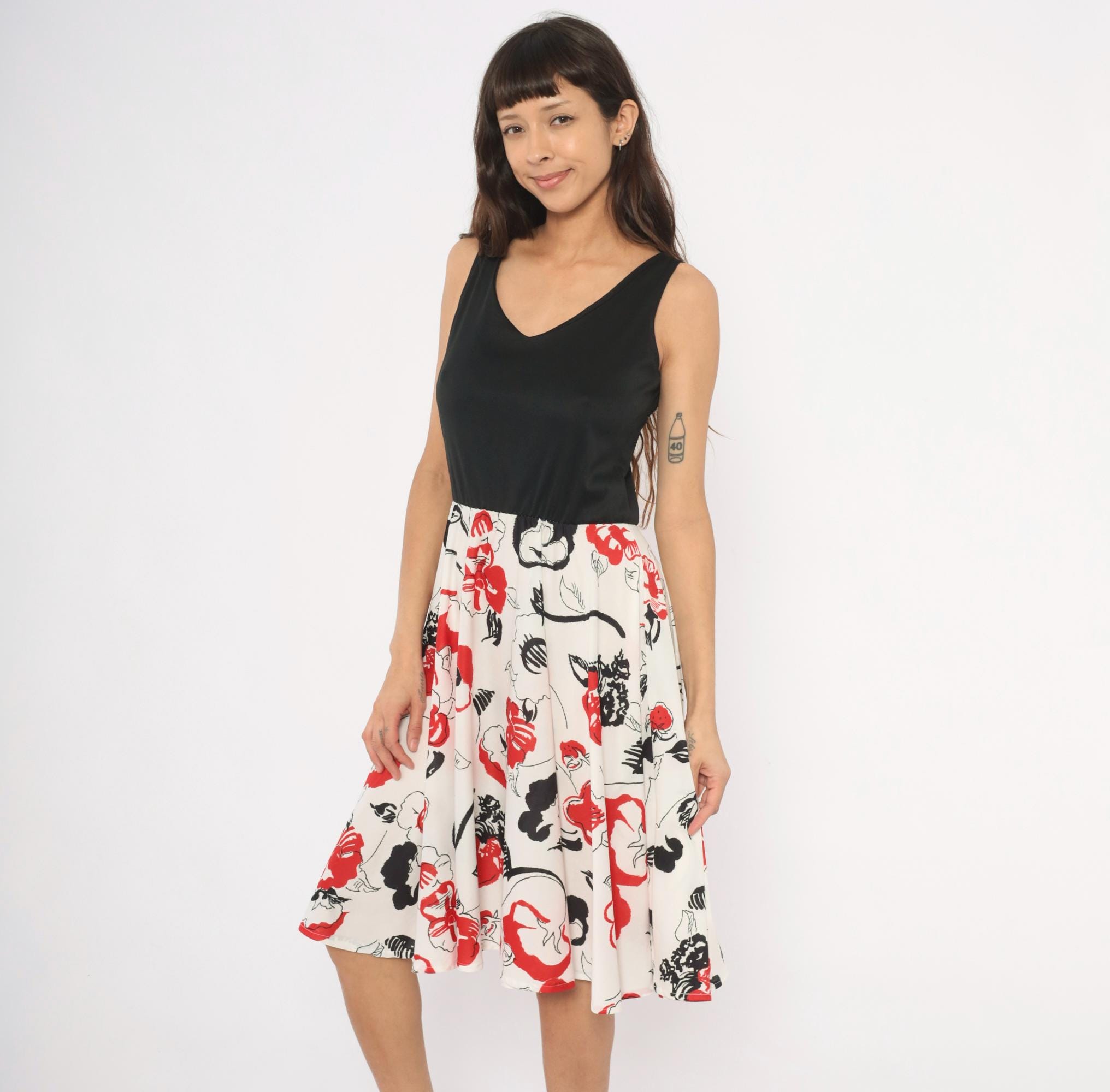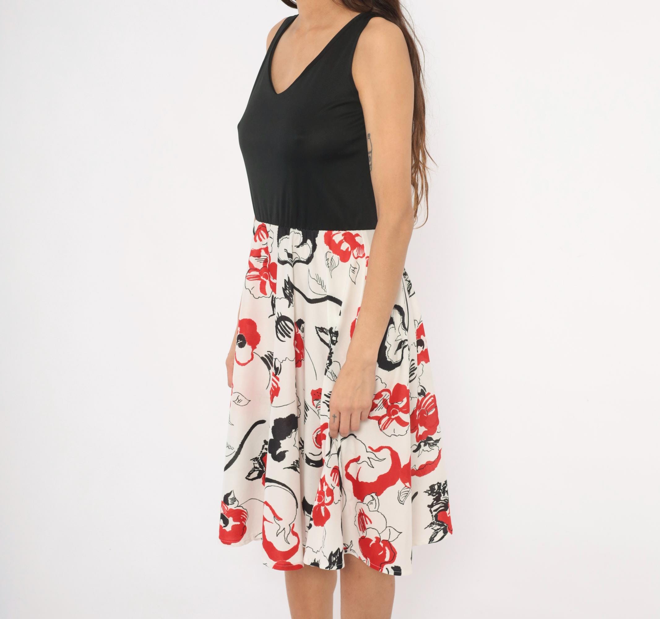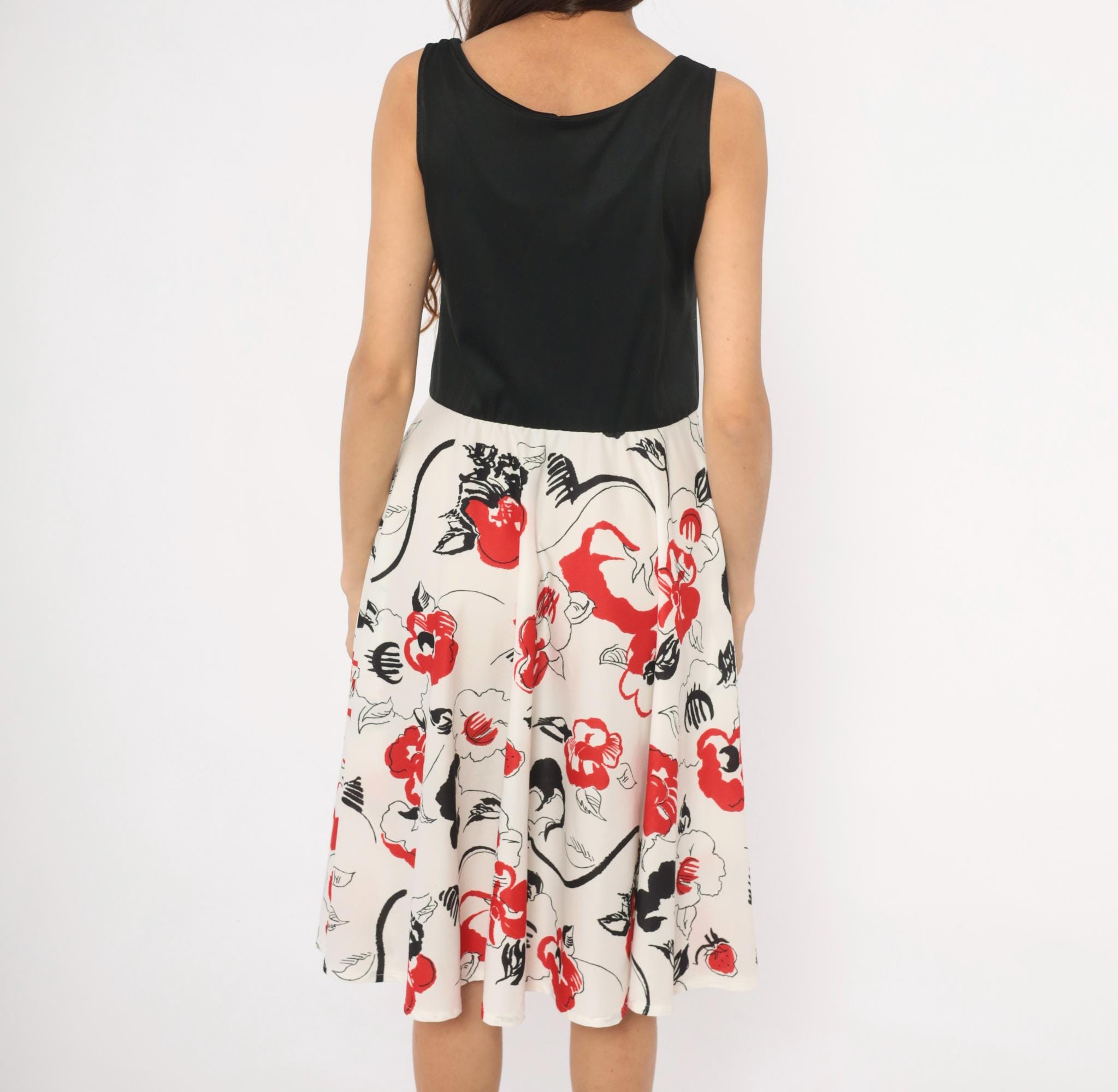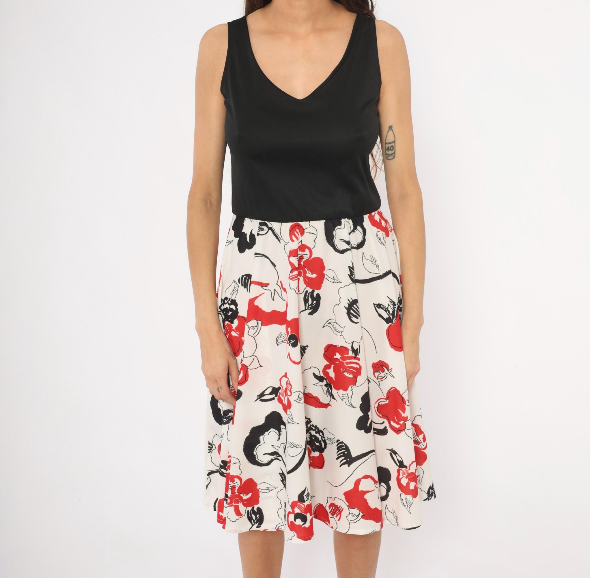 70s sleeveless dress with a solid black V-neck bodice and a white floral print skirt in red and black. Pullover style with an elastic or gathered waist, wide tank straps, and an A-line skirt that falls to knee length. The floral pattern has an abstract, brushstroke quality with scattered blooms, leaves, and curving stems across the cream-colored lower half.