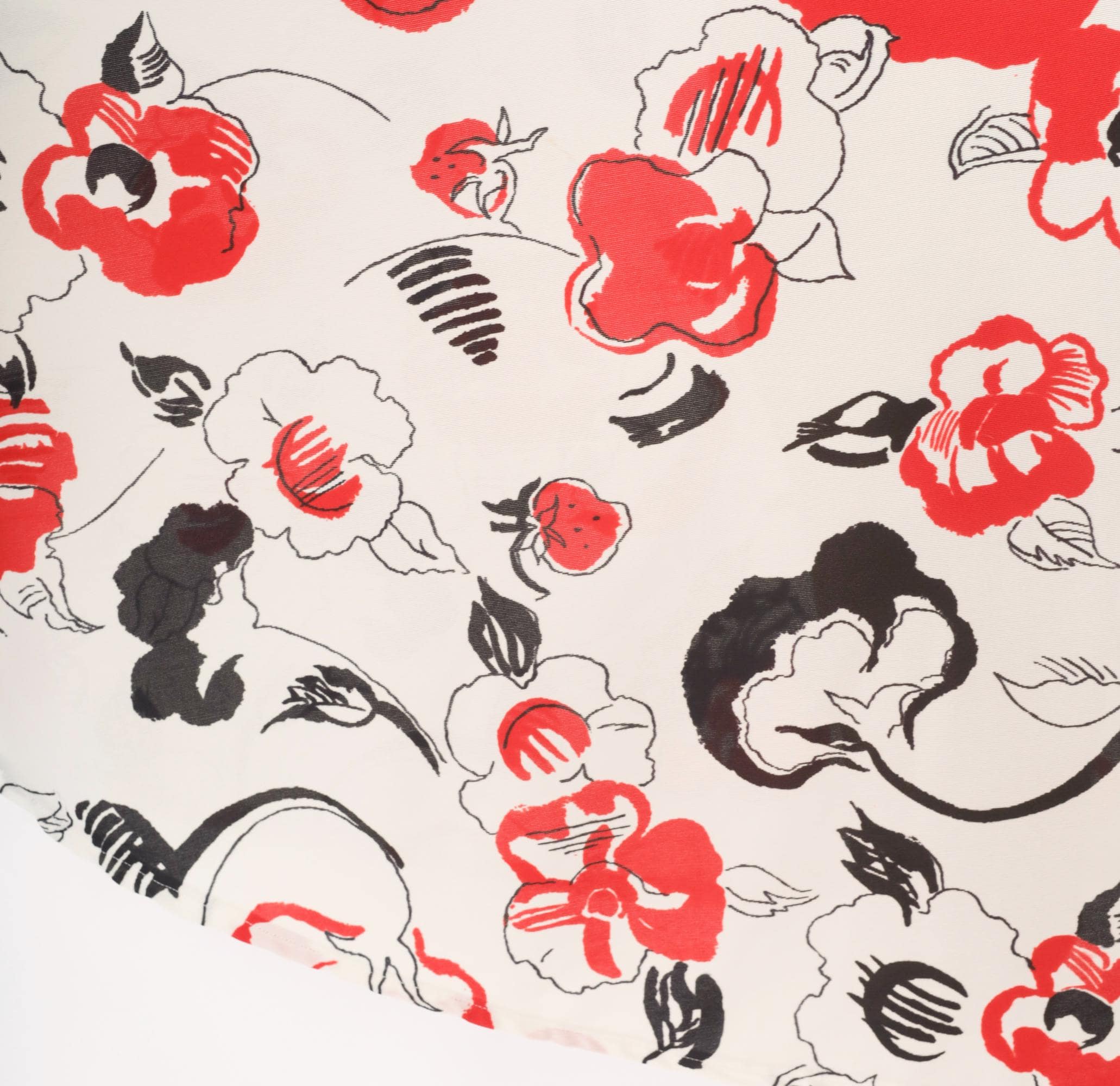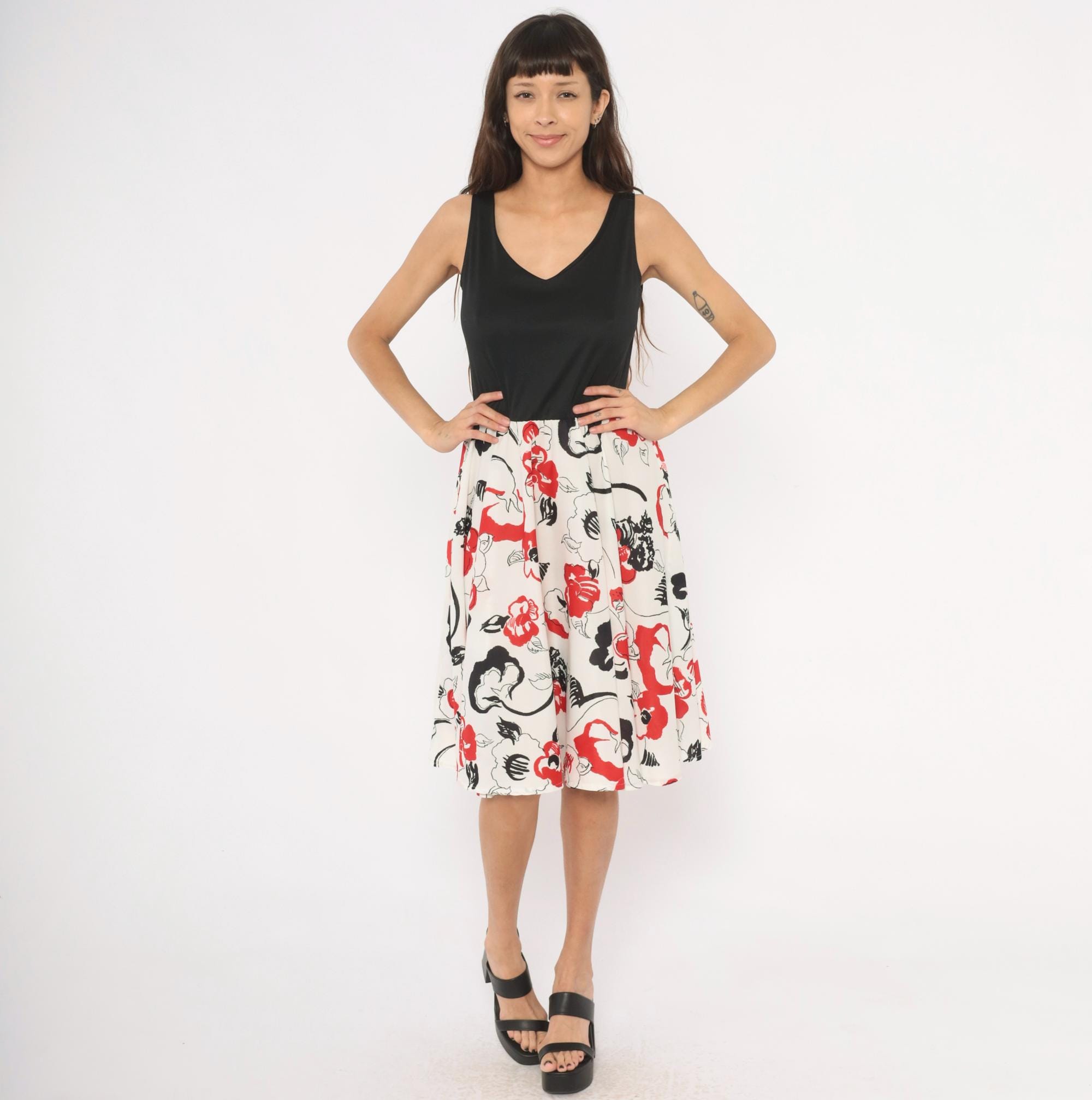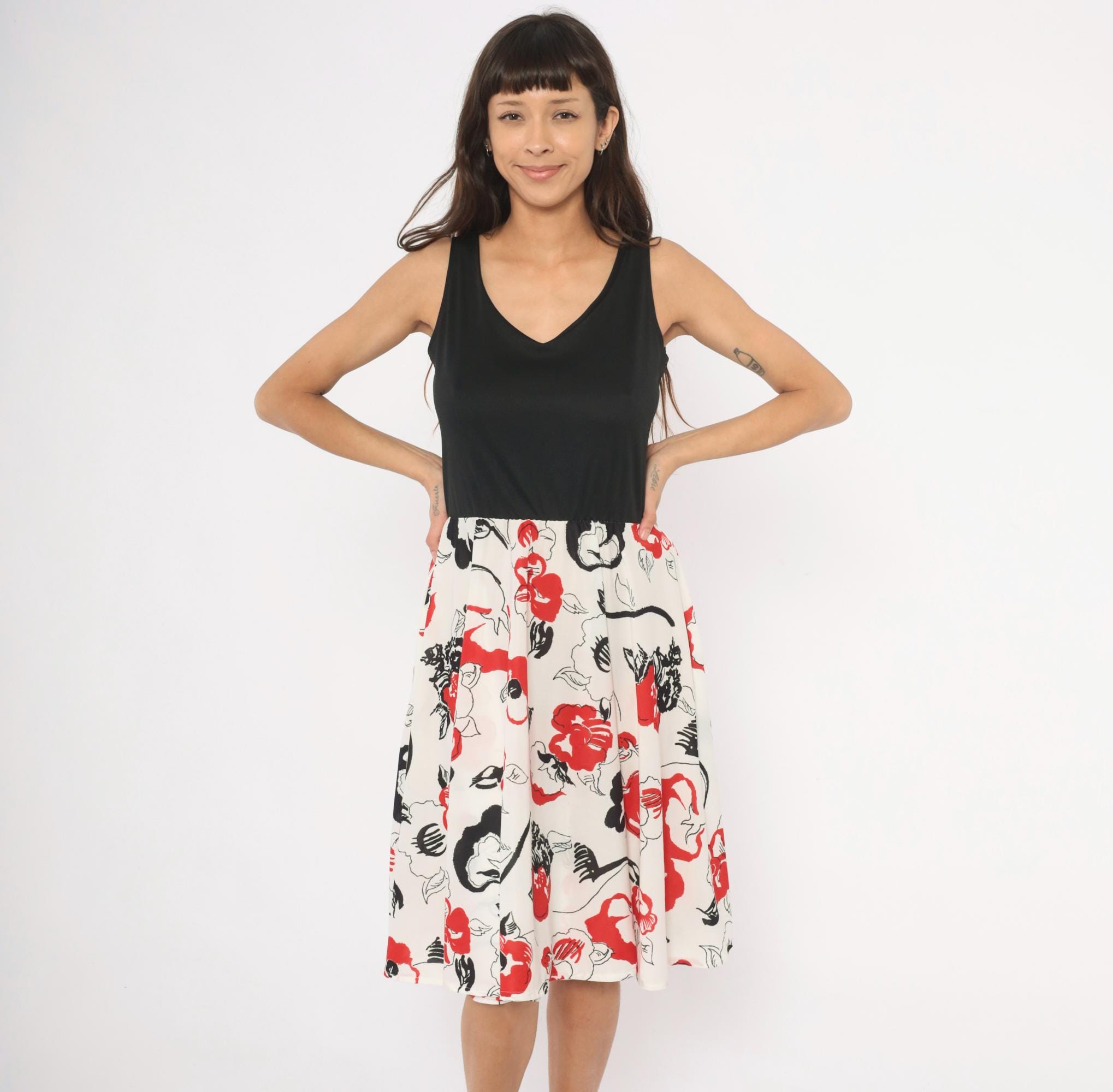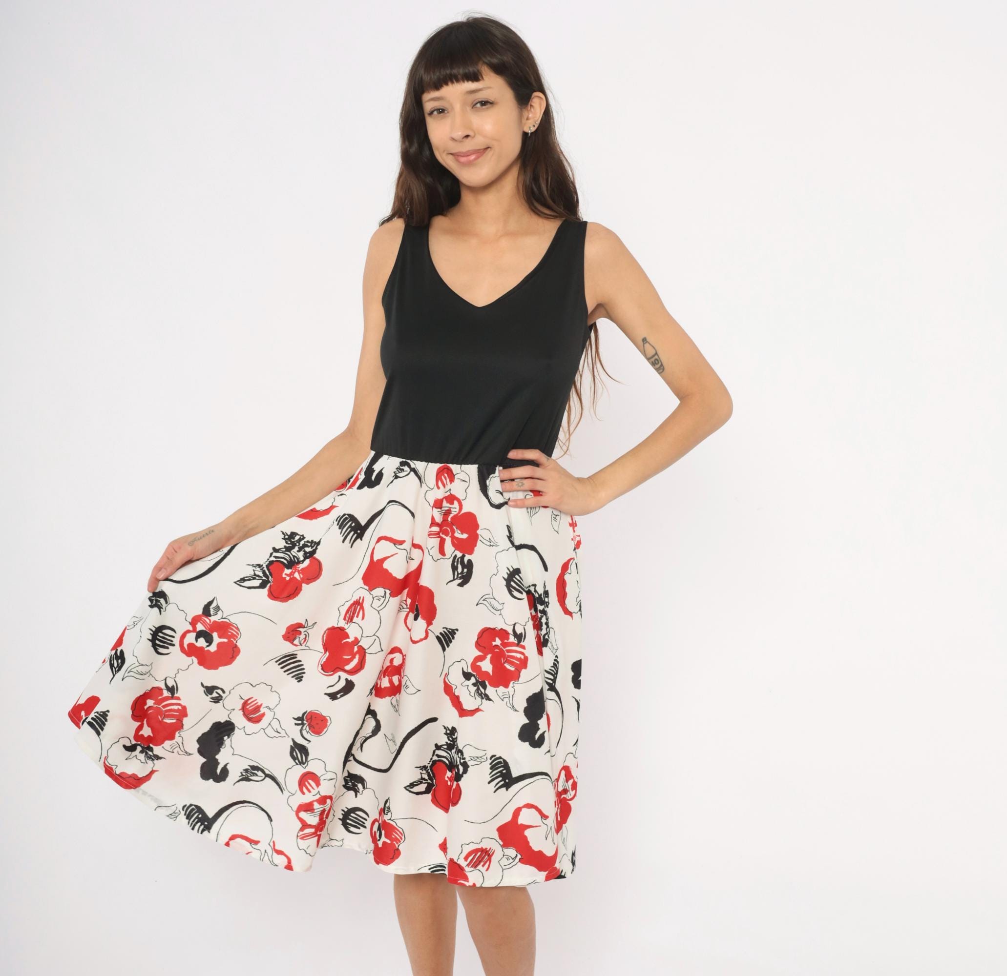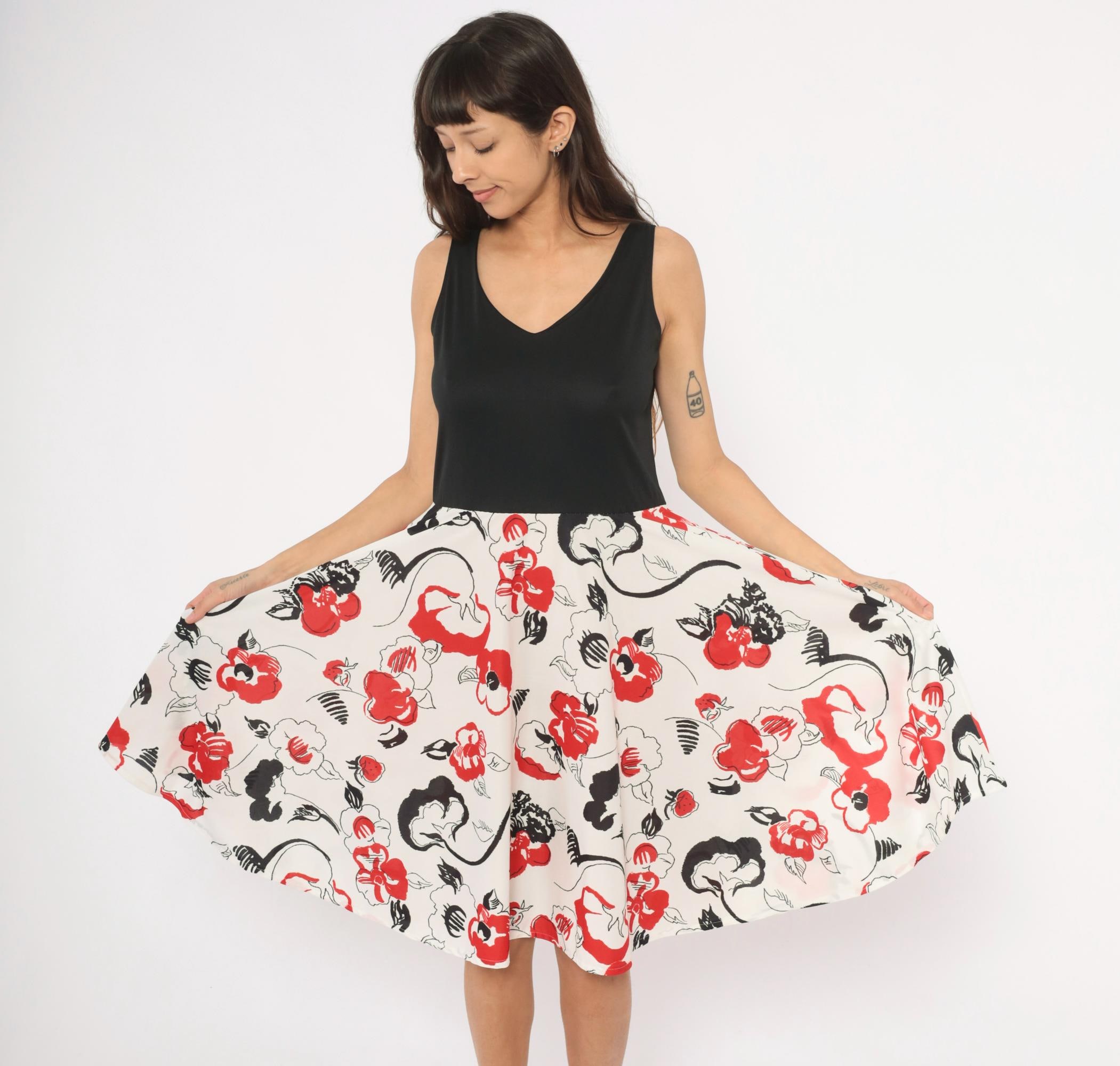 70s sleeveless dress with a solid black V-neck bodice and a white floral print skirt in red and black. Pullover style with an elastic or gathered waist, wide tank straps, and an A-line skirt that falls to knee length. The floral pattern has an abstract, brushstroke quality with scattered blooms, leaves, and curving stems across the cream-colored lower half.
