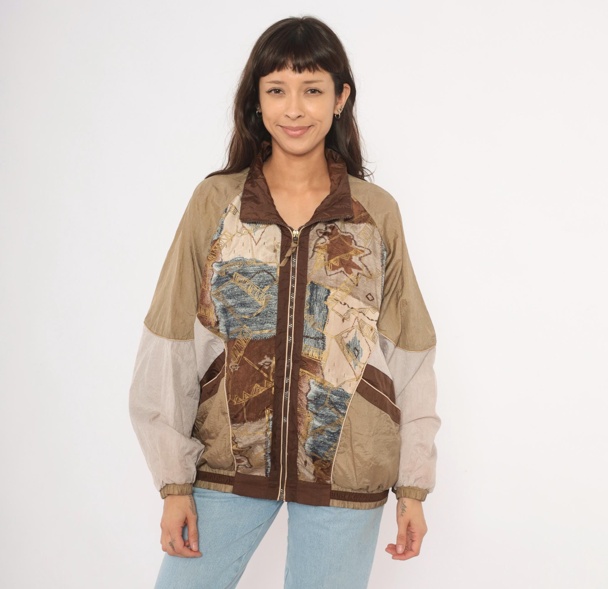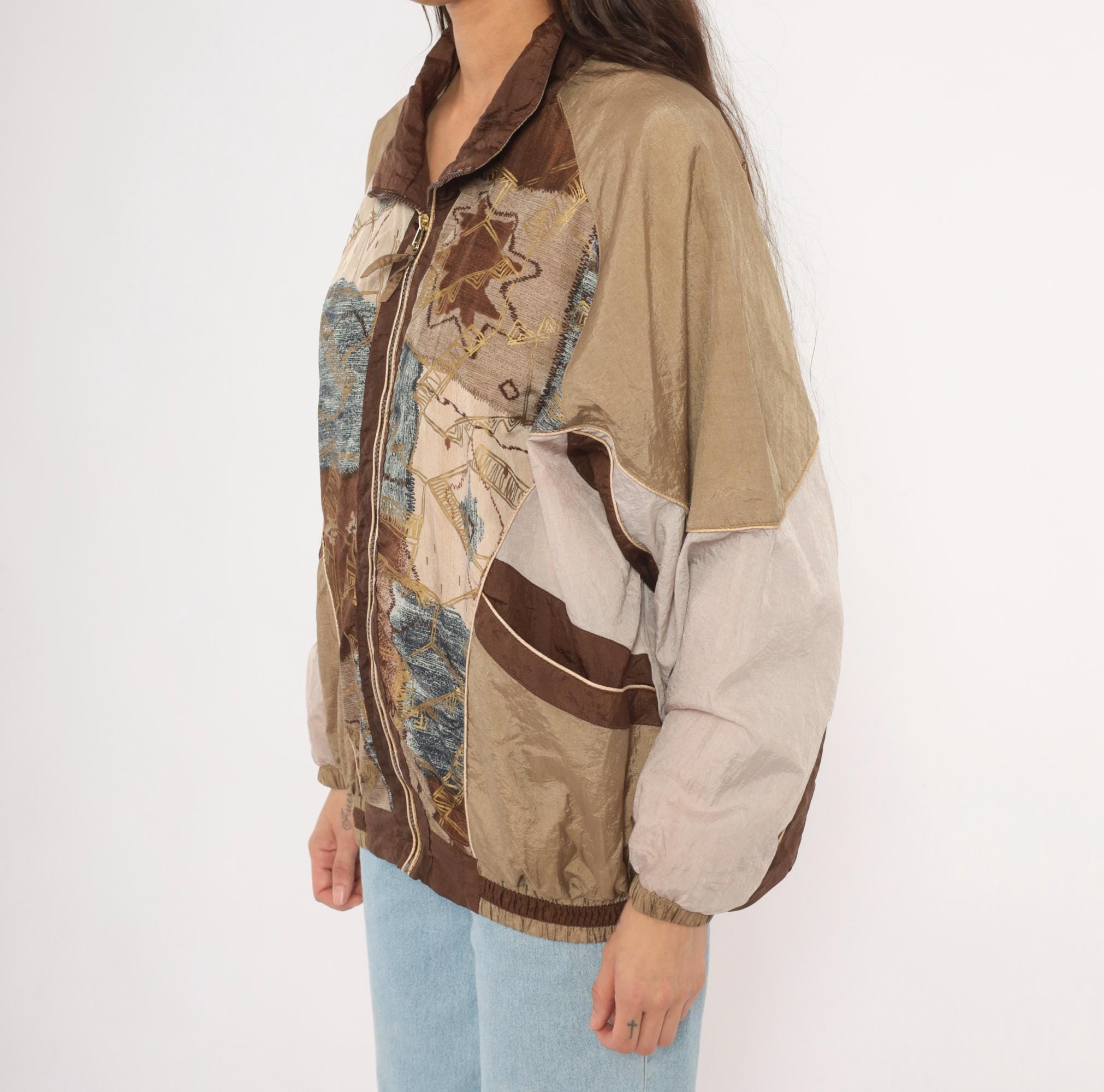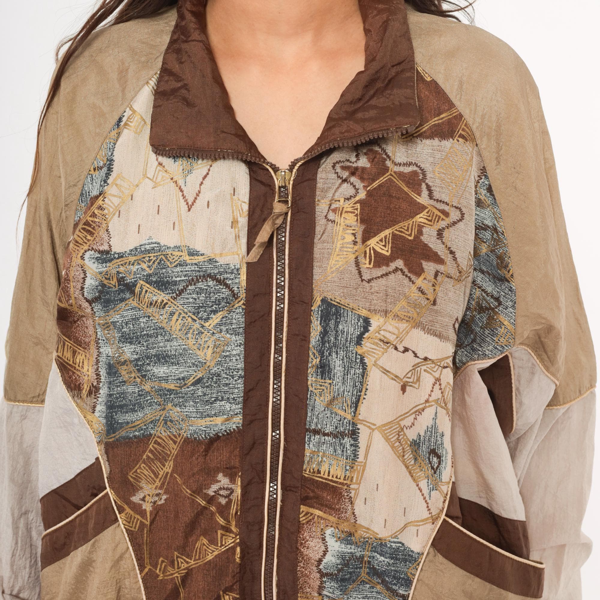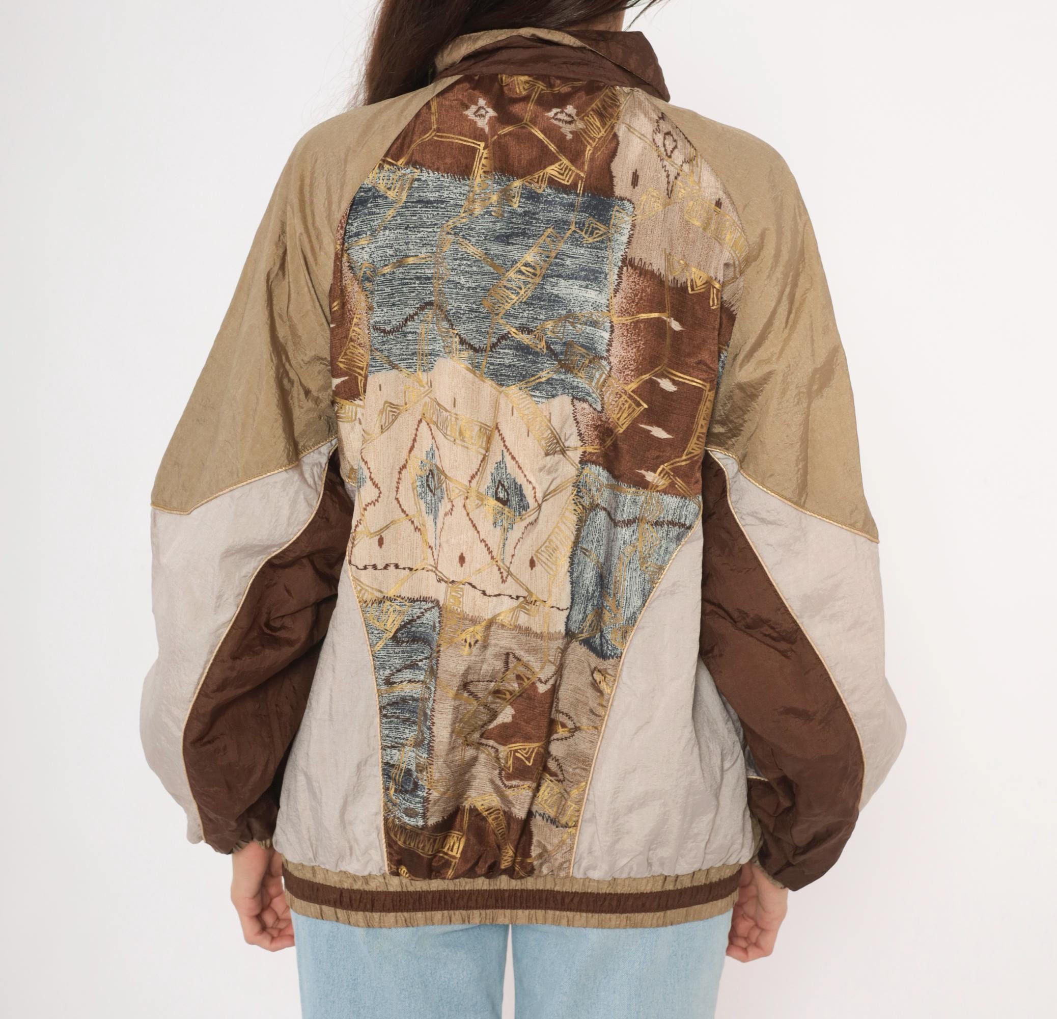 90s zip front windbreaker from Active Horizon with abstract tapestry panels across the chest, back, and collar in brown, slate blue, cream, and gold tones. Colorblocked shell in tan, chocolate, and light grey with dropped shoulders and balloon sleeves. Geometric and star-shaped embroidered motifs throughout the woven tapestry sections.