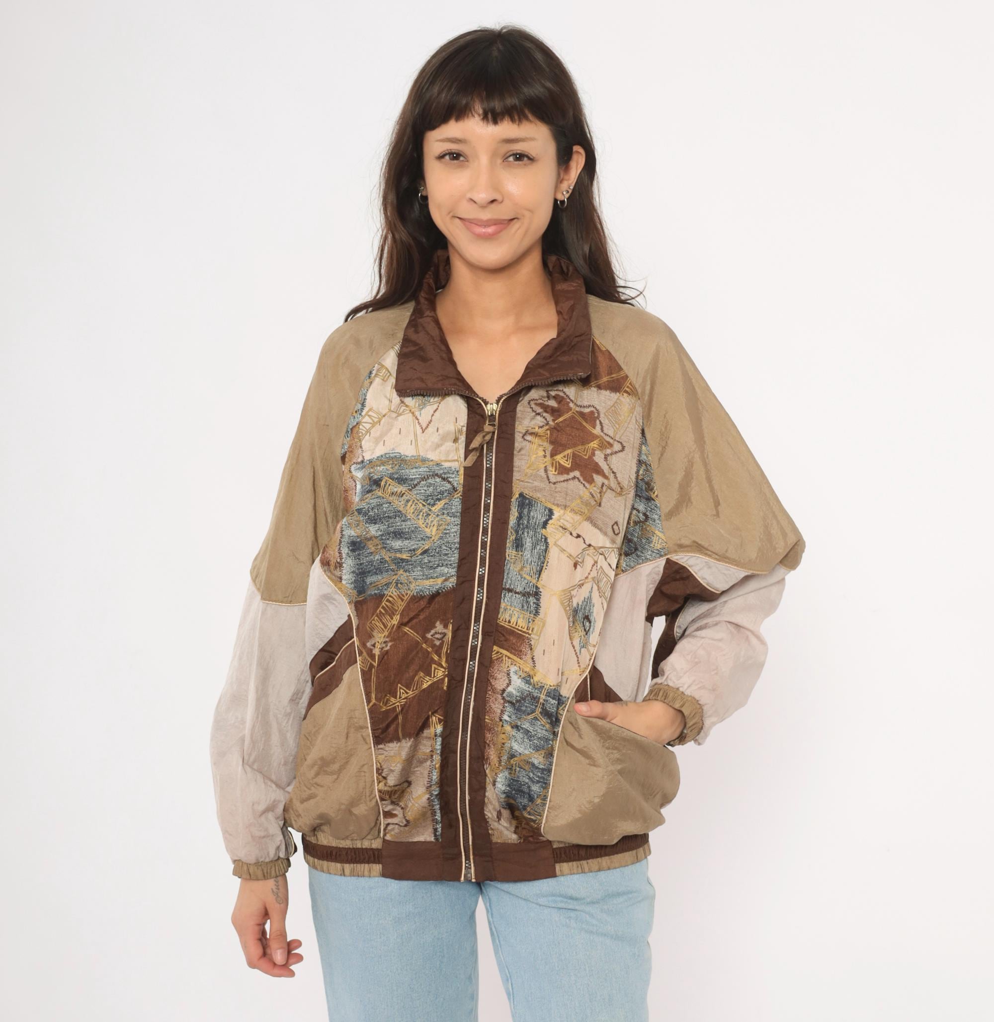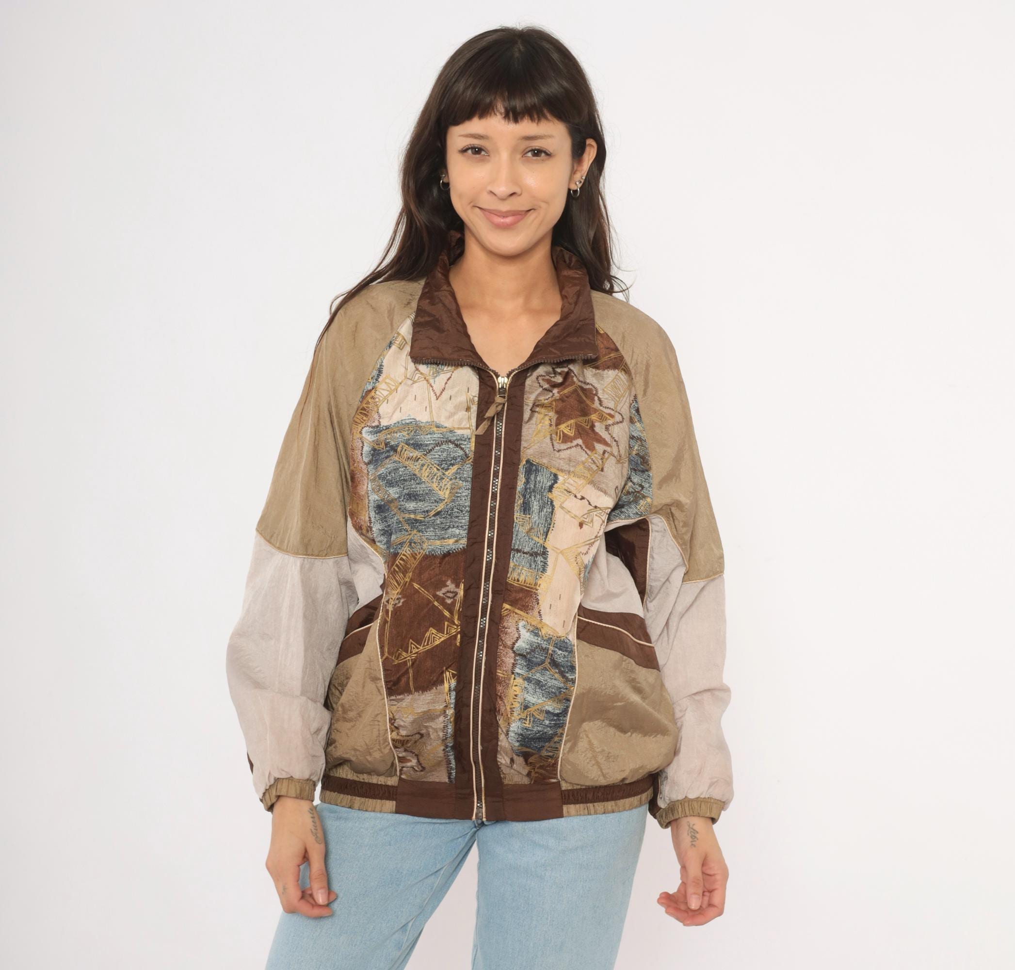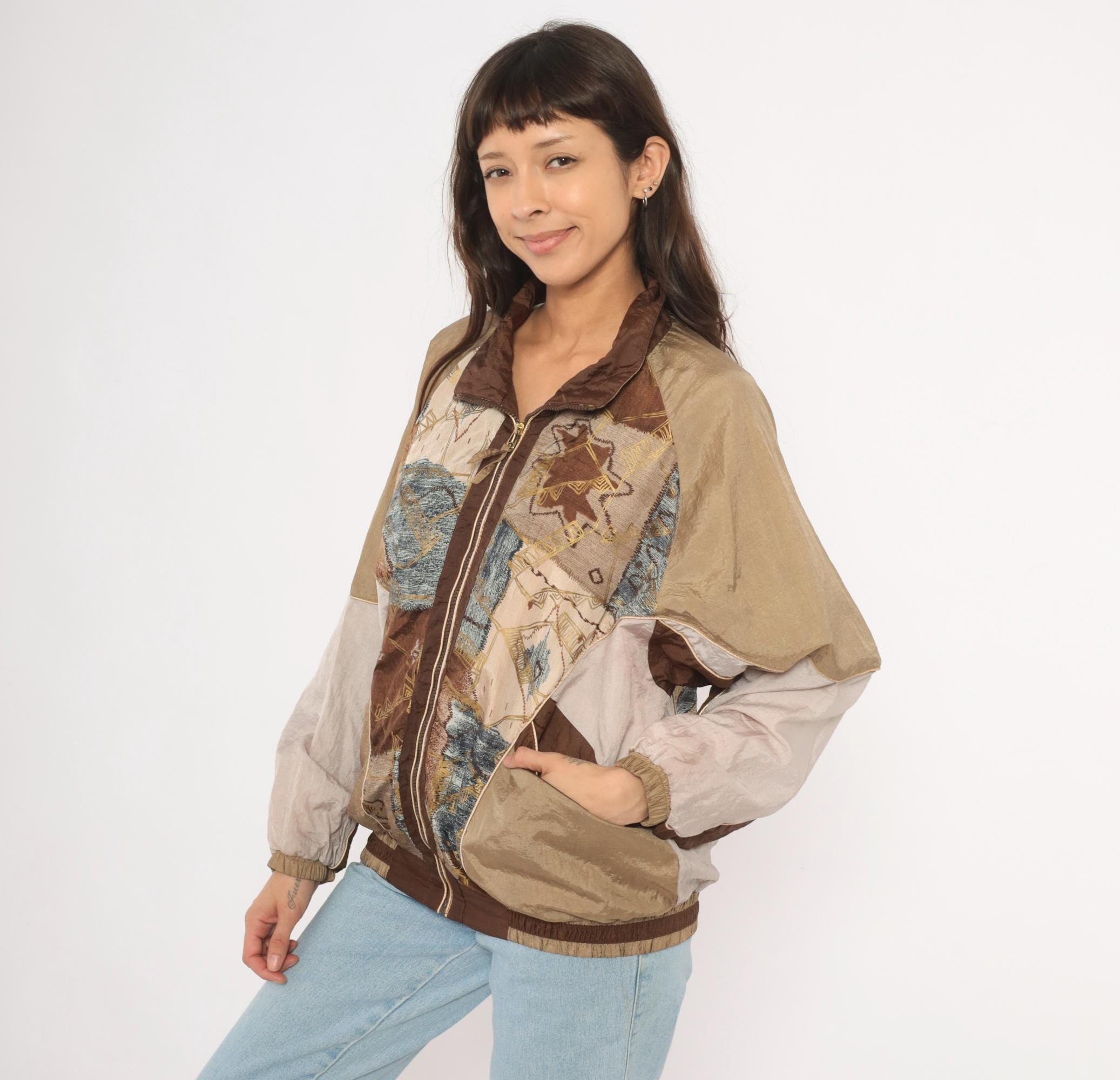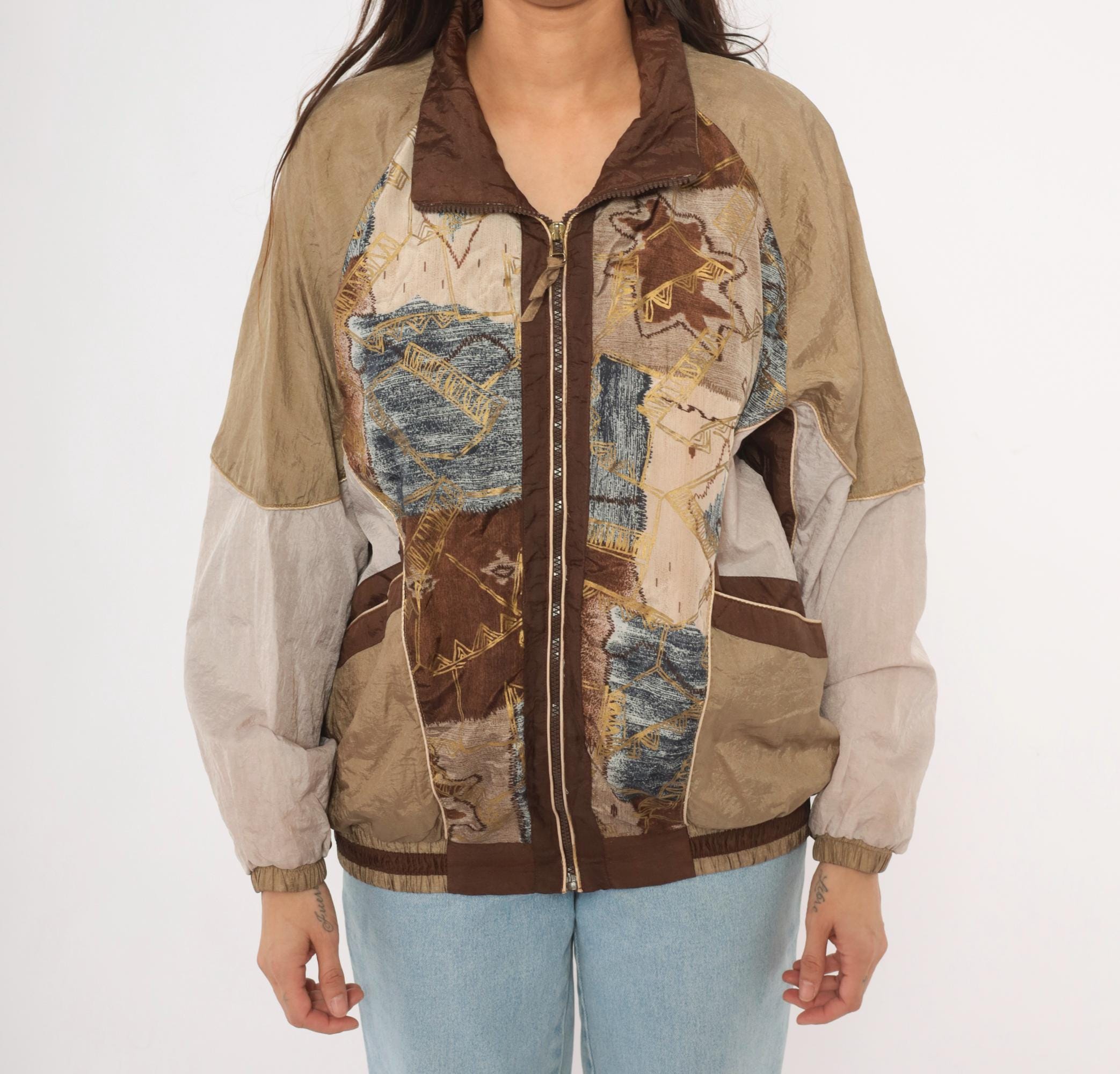 90s zip front windbreaker from Active Horizon with abstract tapestry panels across the chest, back, and collar in brown, slate blue, cream, and gold tones. Colorblocked shell in tan, chocolate, and light grey with dropped shoulders and balloon sleeves. Geometric and star-shaped embroidered motifs throughout the woven tapestry sections.