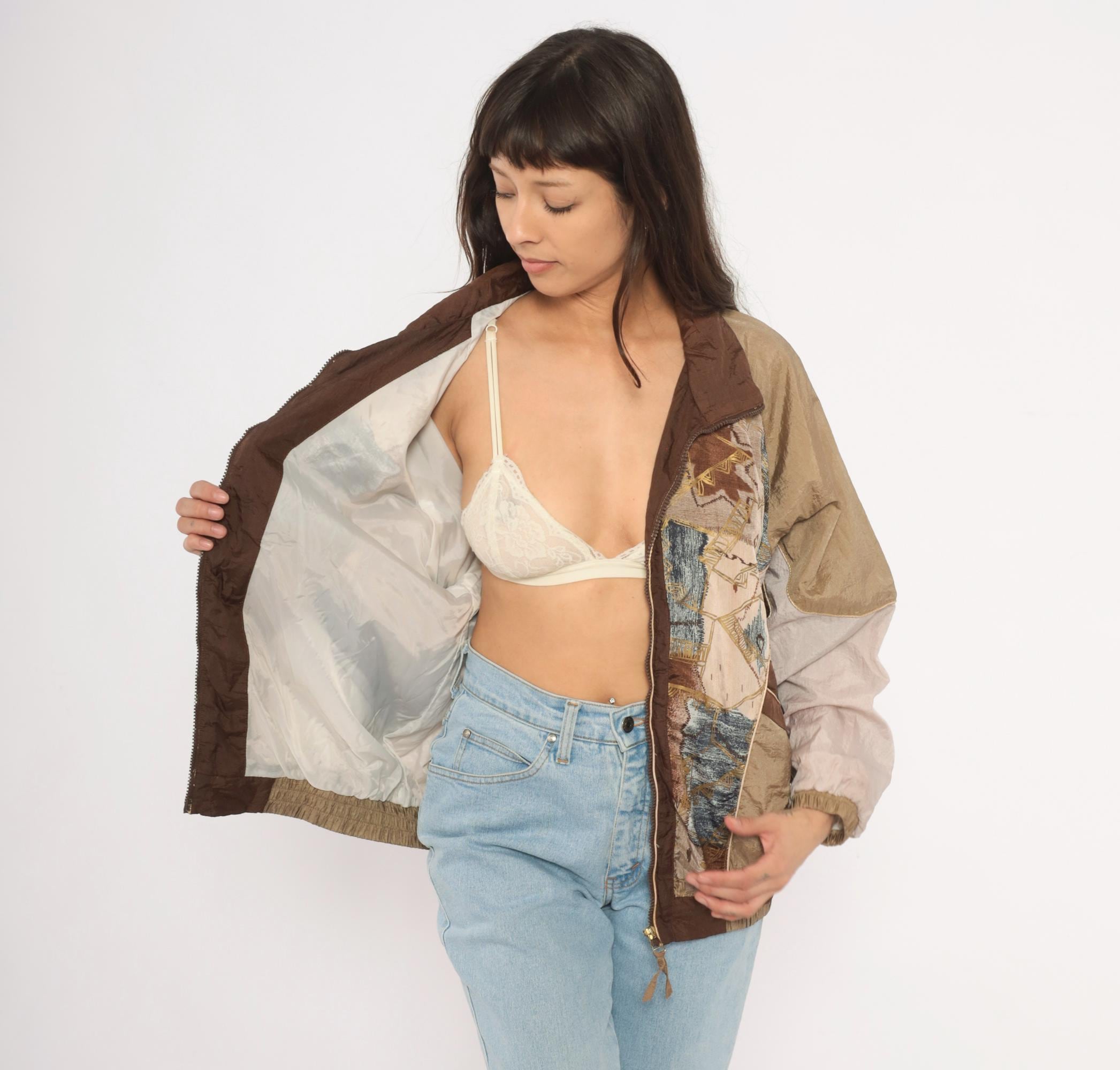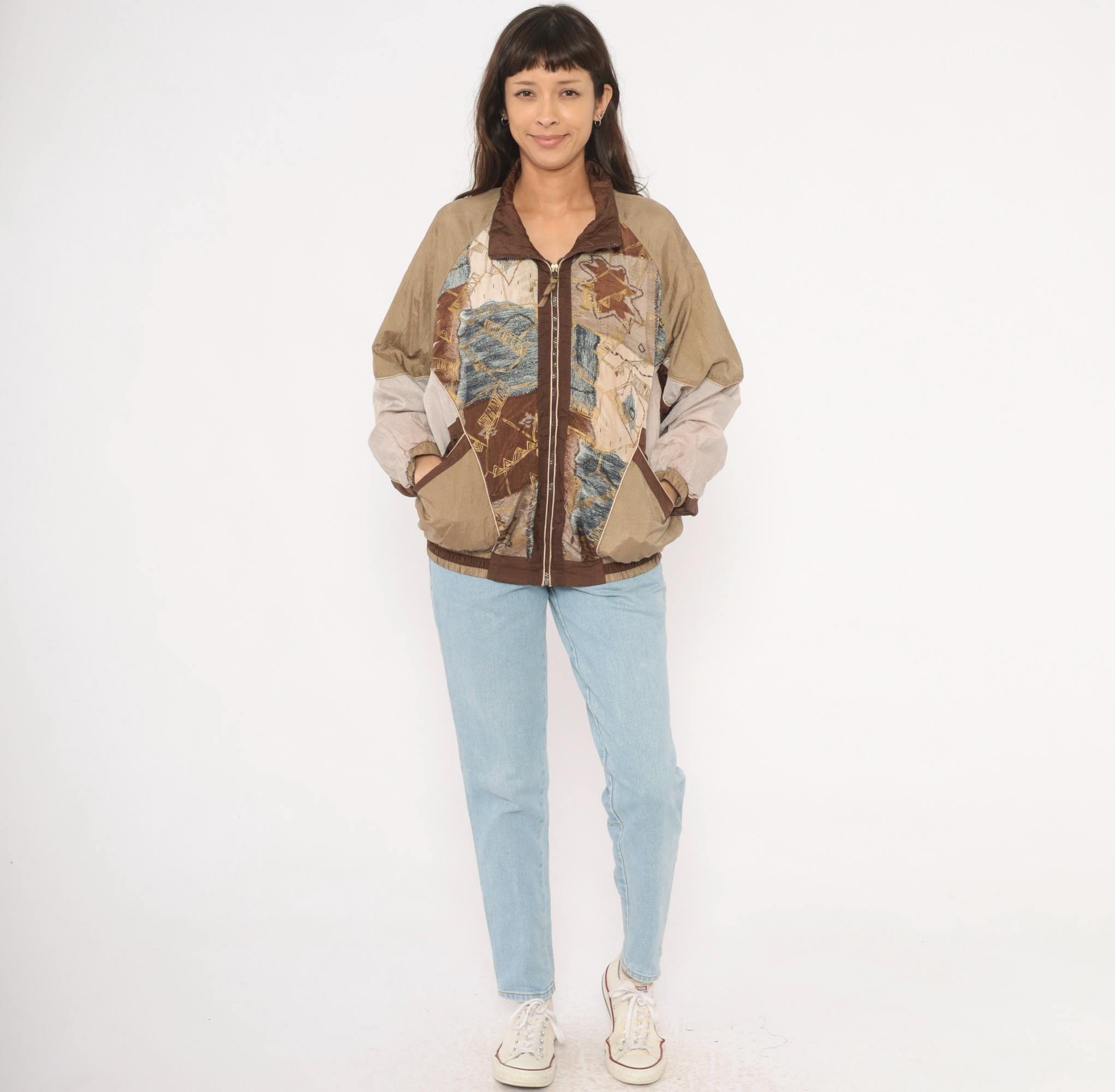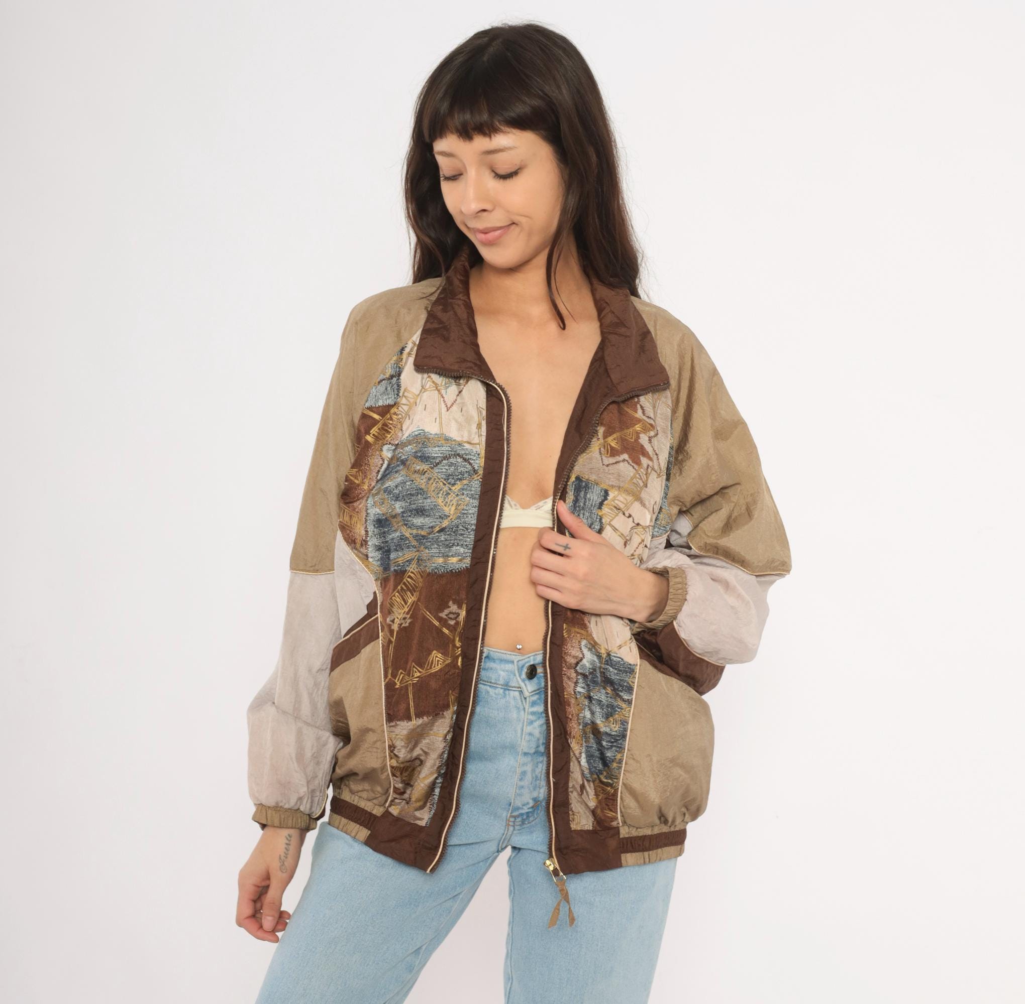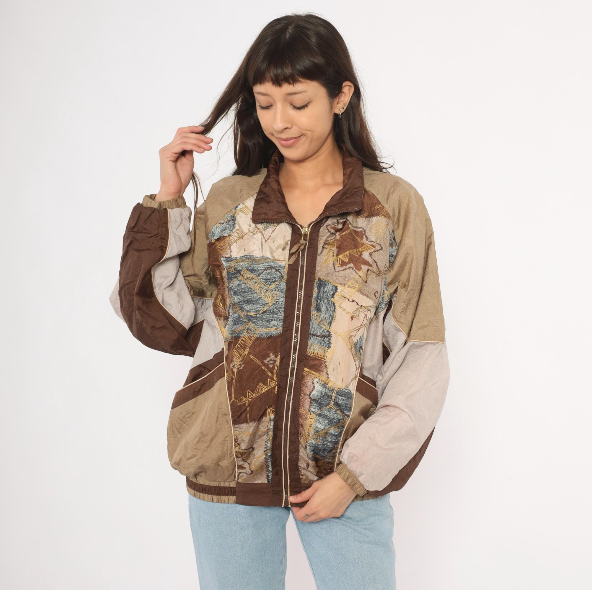 90s zip front windbreaker from Active Horizon with abstract tapestry panels across the chest, back, and collar in brown, slate blue, cream, and gold tones. Colorblocked shell in tan, chocolate, and light grey with dropped shoulders and balloon sleeves. Geometric and star-shaped embroidered motifs throughout the woven tapestry sections.